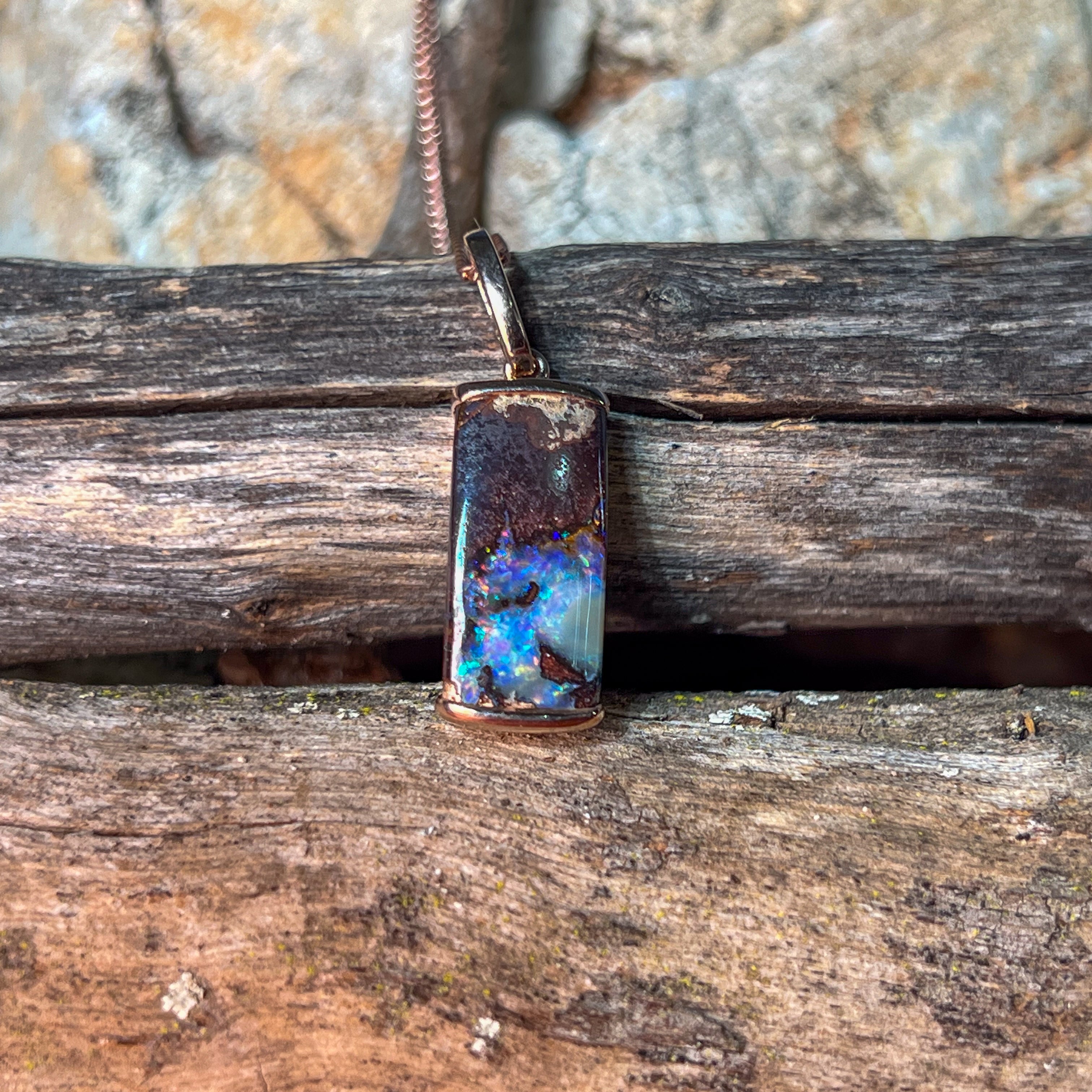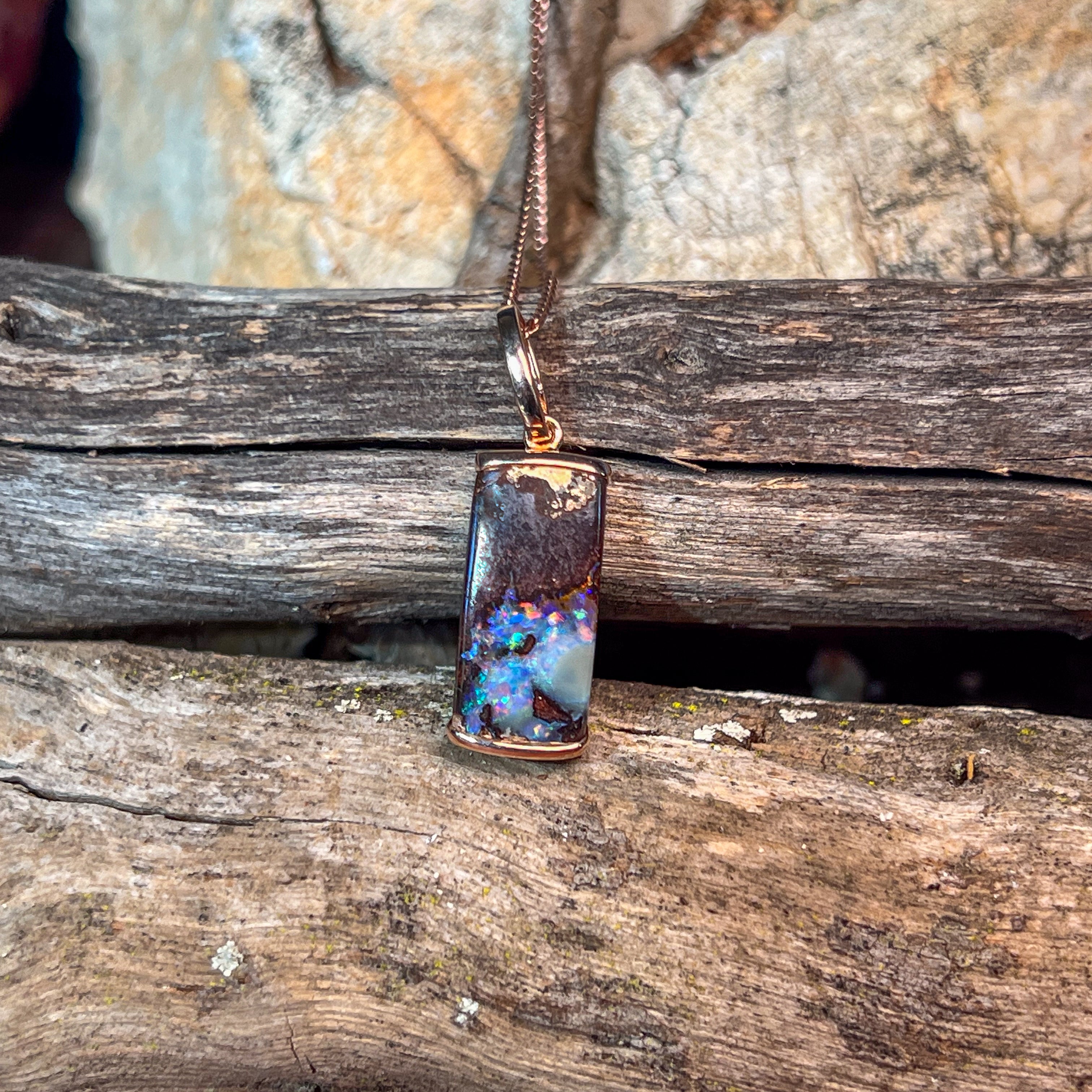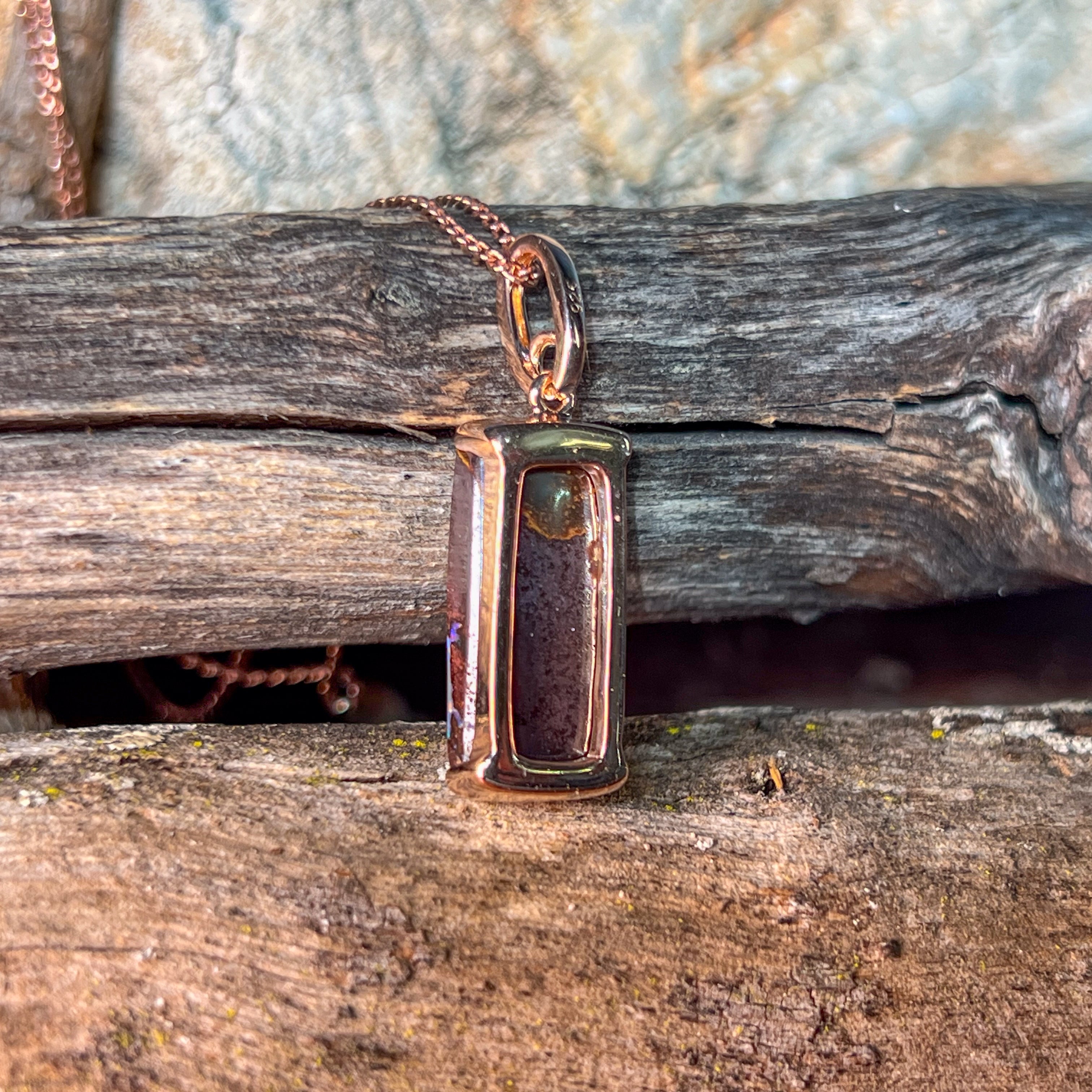 Elevate your style with this stunning rose gold-plated sterling silver pendant, featuring a striking rectangular boulder opal. The modern half bezel setting beautifully showcases the opal’s vibrant colors while providing a sleek, contemporary look. Perfect for adding a touch of elegance and uniqueness to any outfit, this pendant blends timeless craftsmanship with bold design. A versatile accessory that effortlessly brightens your everyday wear or special occasions.