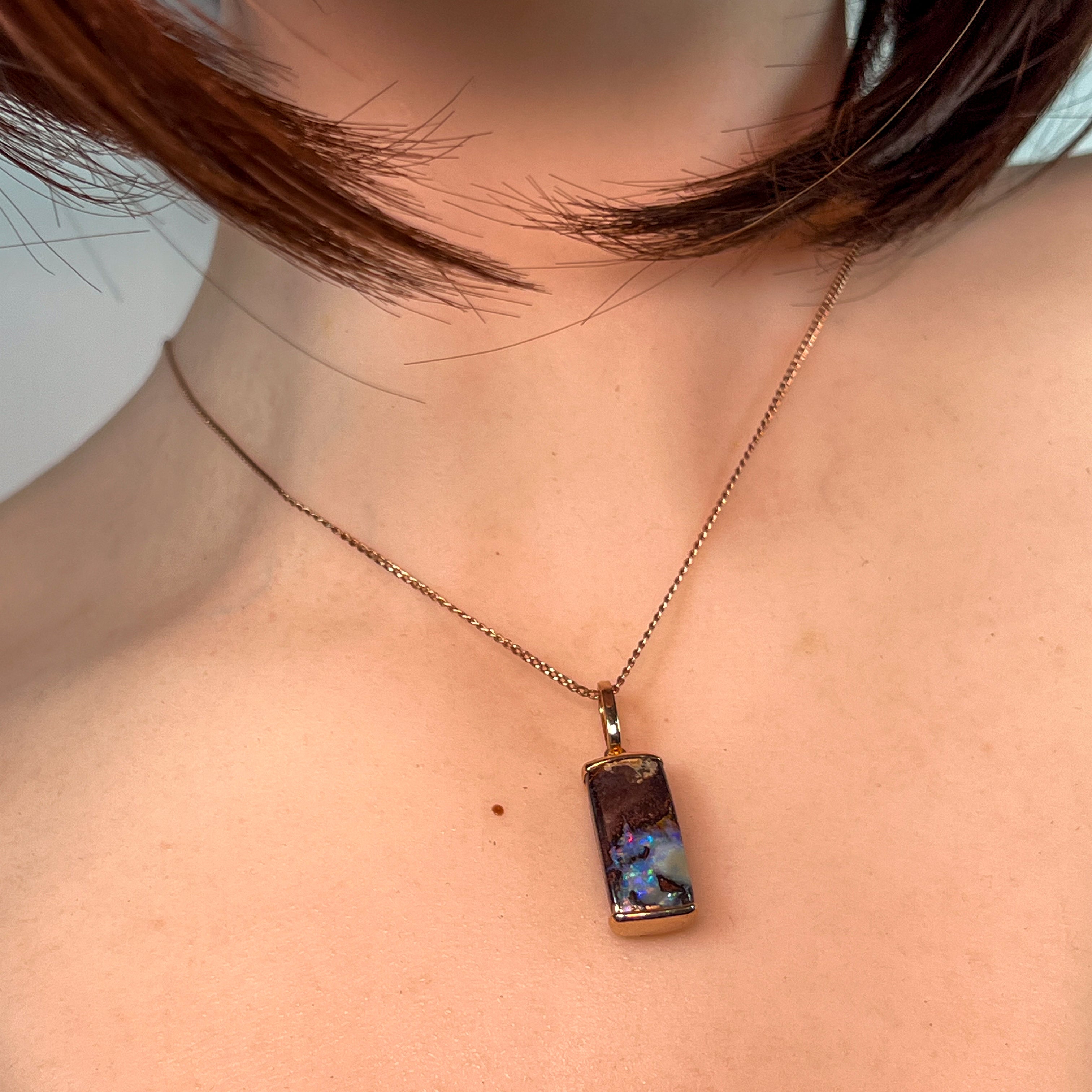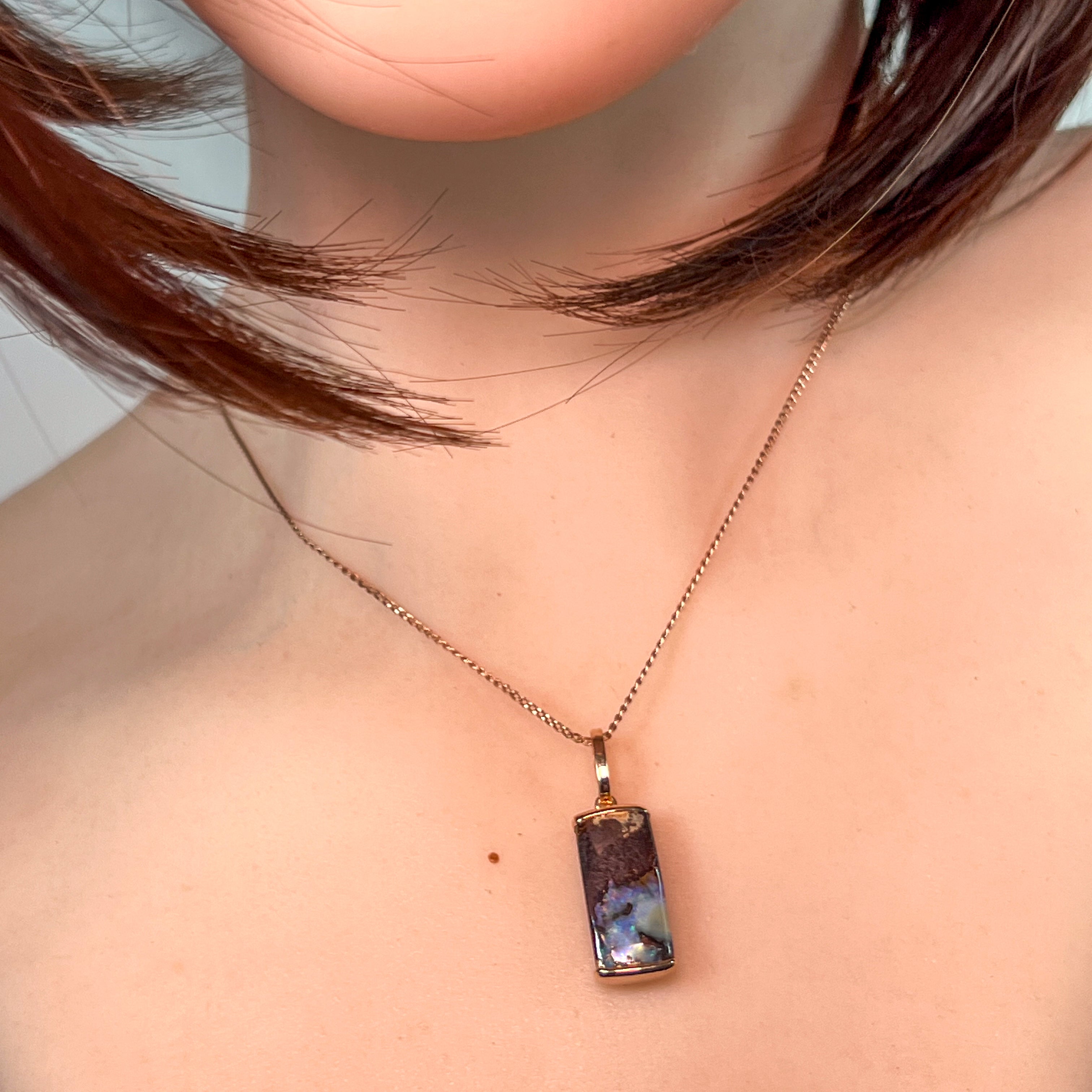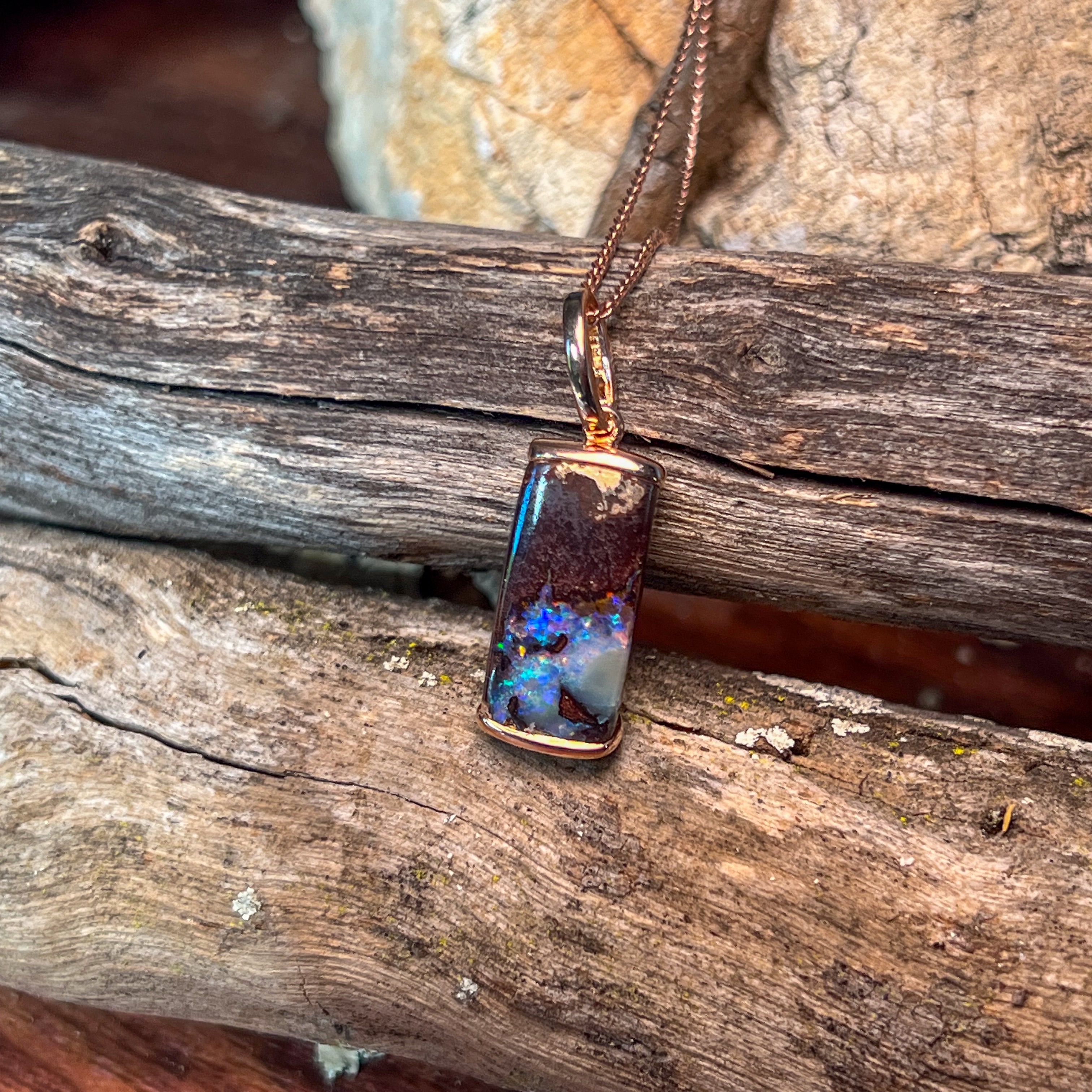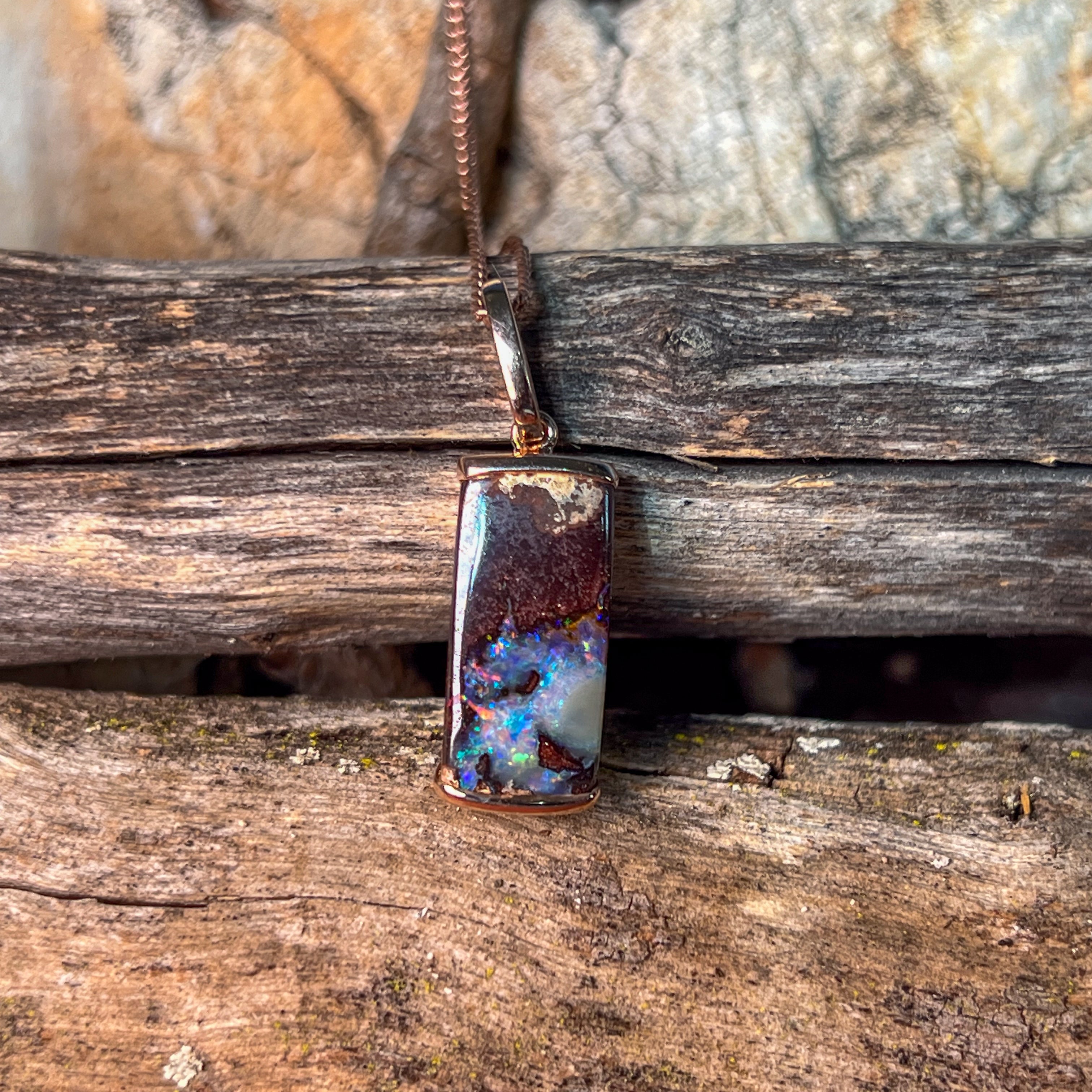 Elevate your style with this stunning rose gold-plated sterling silver pendant, featuring a striking rectangular boulder opal. The modern half bezel setting beautifully showcases the opal’s vibrant colors while providing a sleek, contemporary look. Perfect for adding a touch of elegance and uniqueness to any outfit, this pendant blends timeless craftsmanship with bold design. A versatile accessory that effortlessly brightens your everyday wear or special occasions.