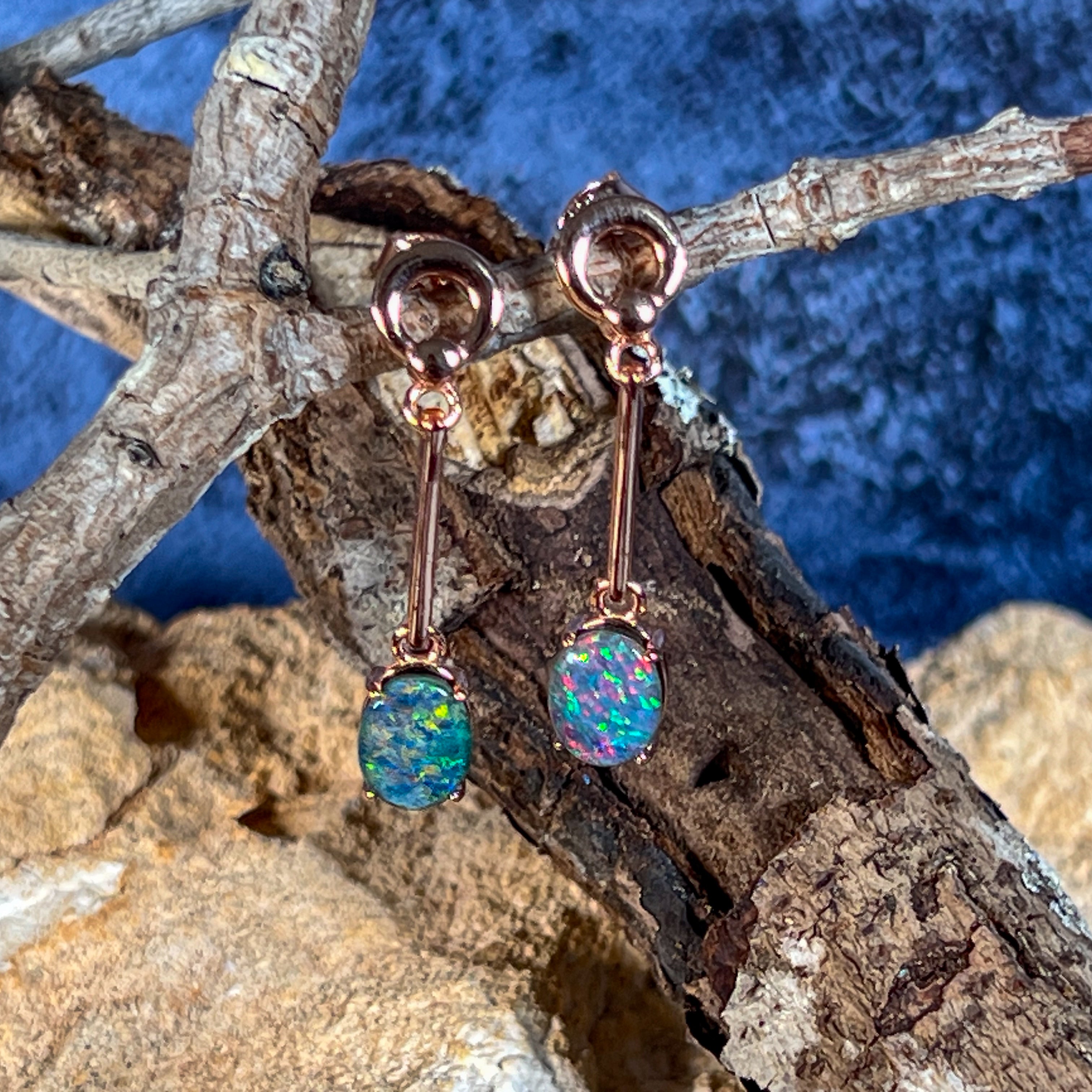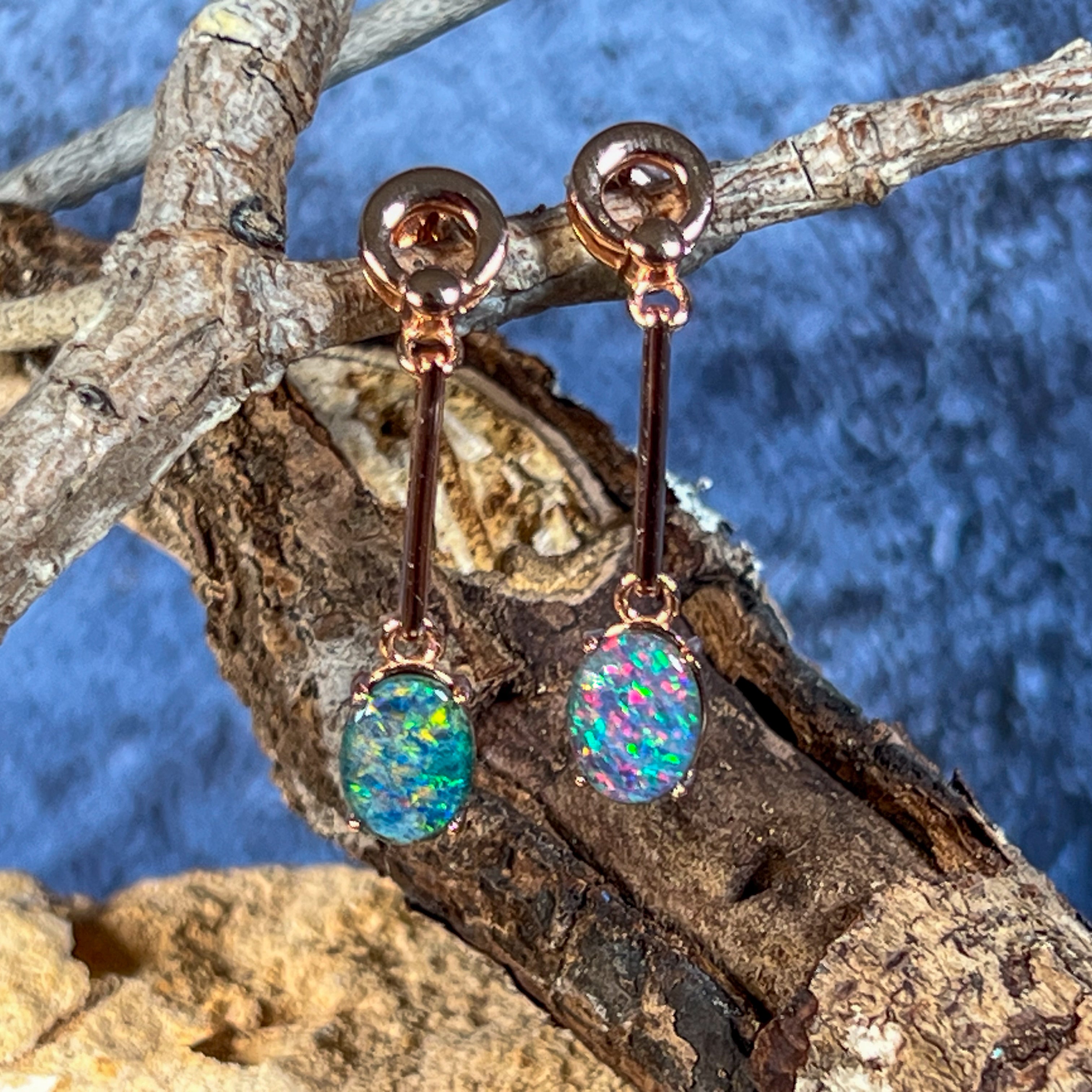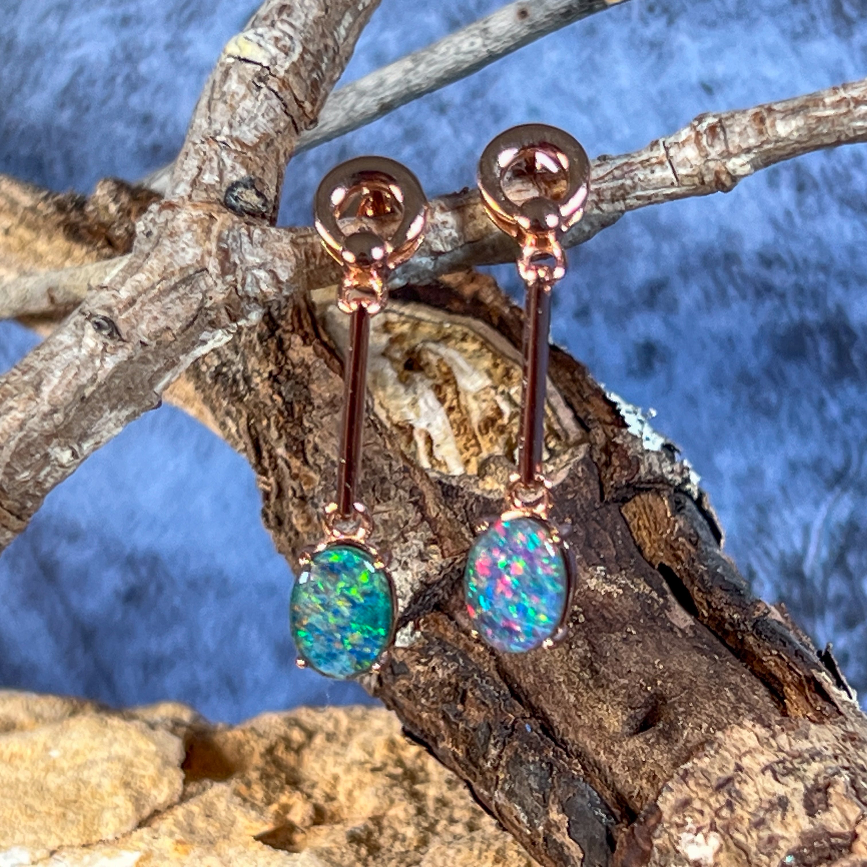 Elevate your style with our Rose Gold plated Opal triplet earrings. Featuring 8x6mm dangling claw set Opal triplets on long bar earrings, these earrings bring a touch of elegance to any outfit. Add a pop of color and a touch of sophistication to your look with these stunning earrings.