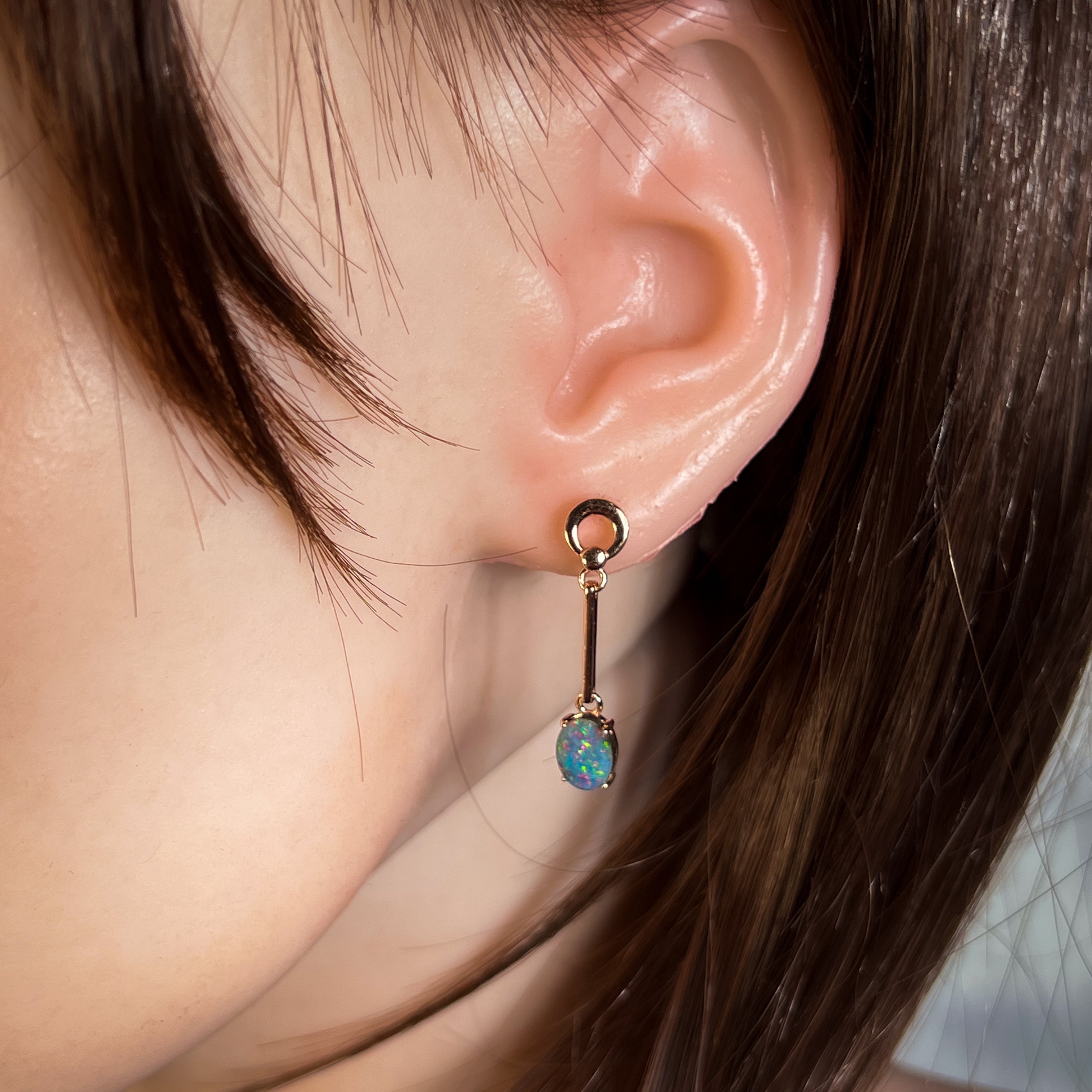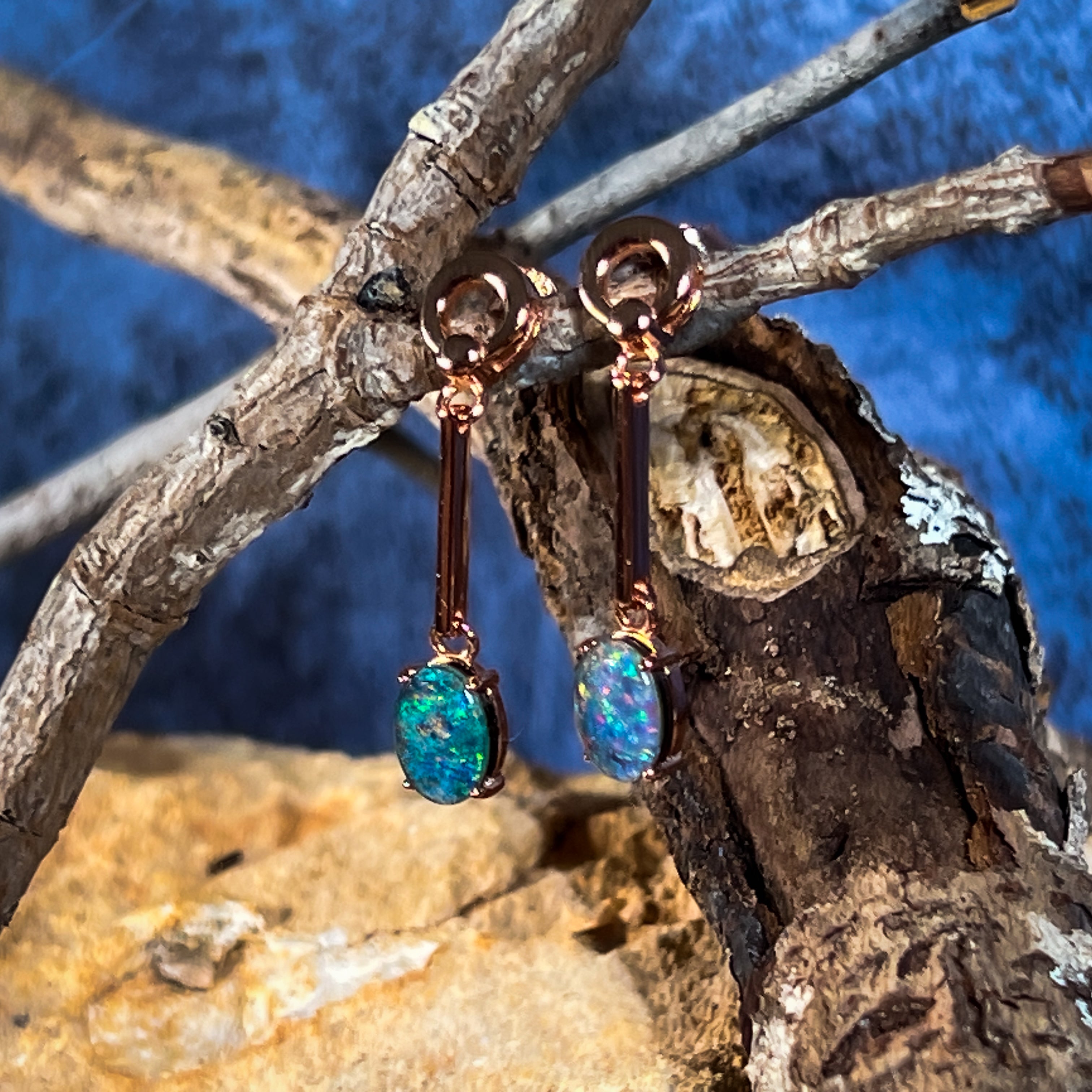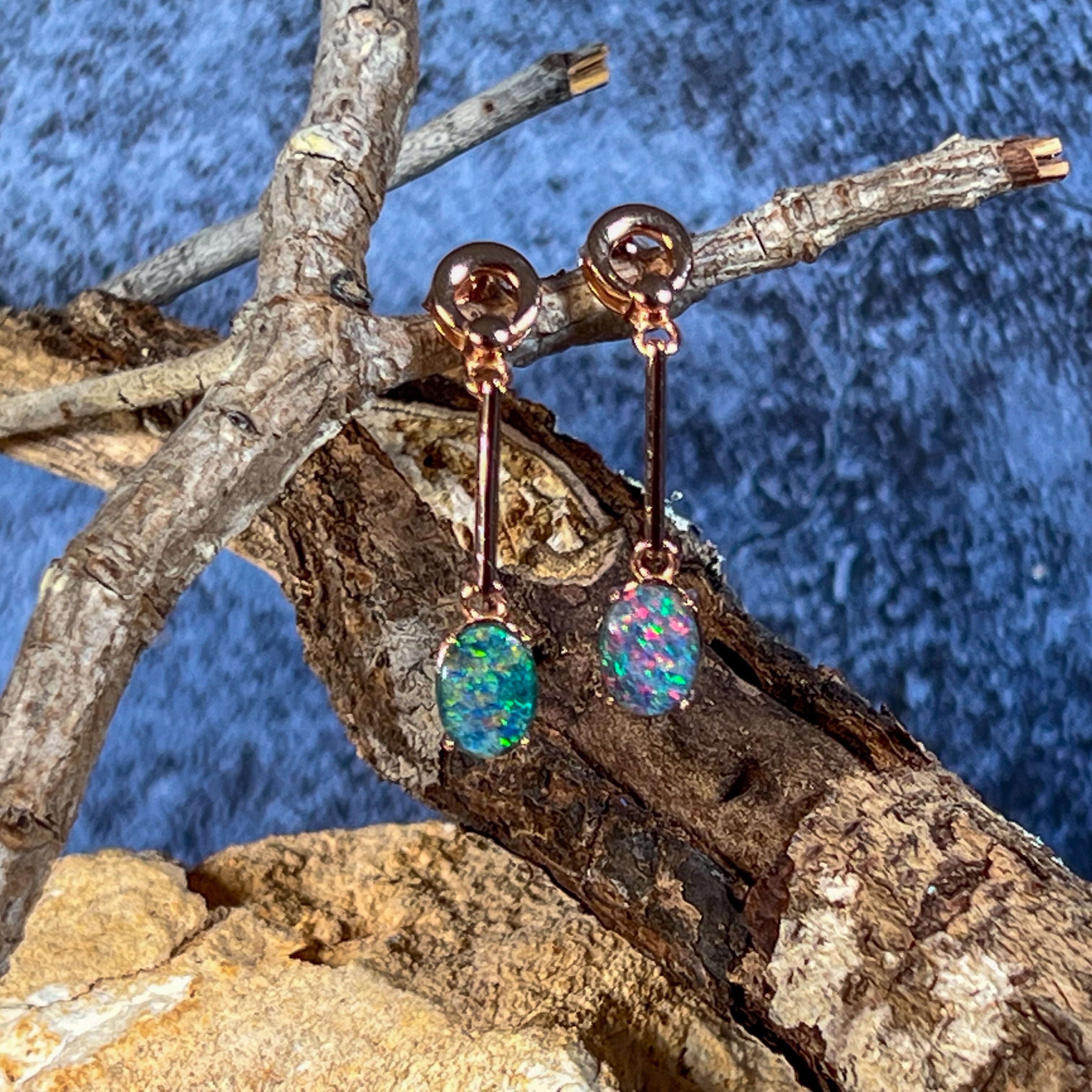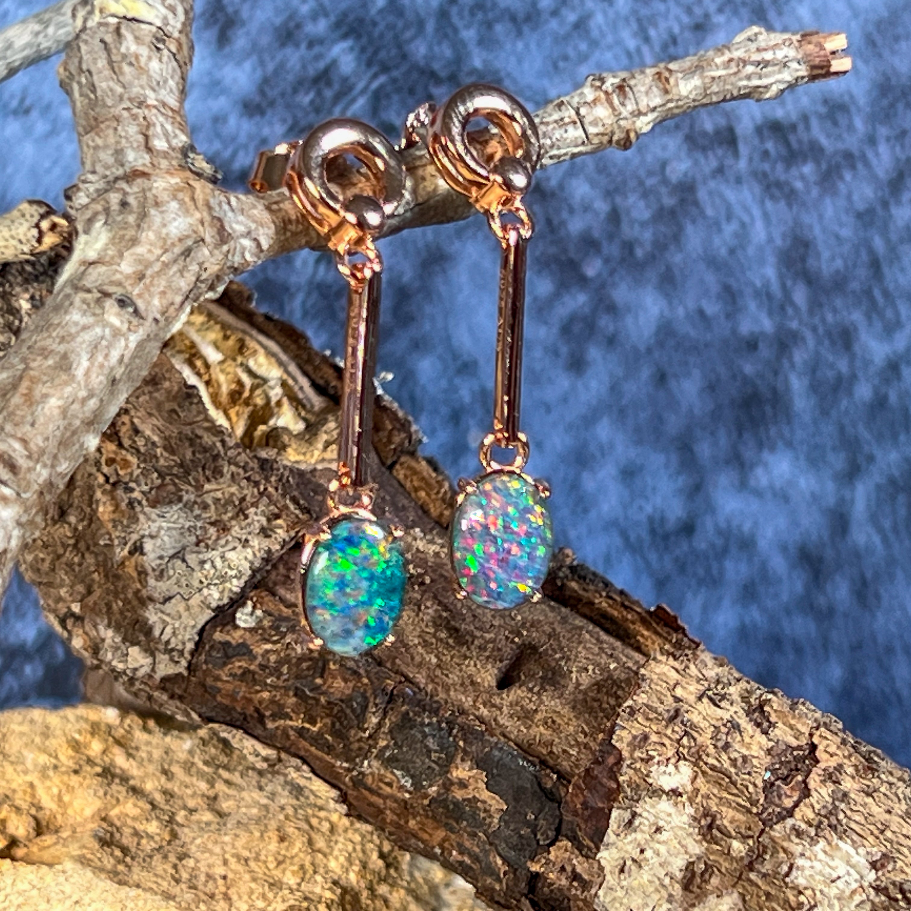 Elevate your style with our Rose Gold plated Opal triplet earrings. Featuring 8x6mm dangling claw set Opal triplets on long bar earrings, these earrings bring a touch of elegance to any outfit. Add a pop of color and a touch of sophistication to your look with these stunning earrings.