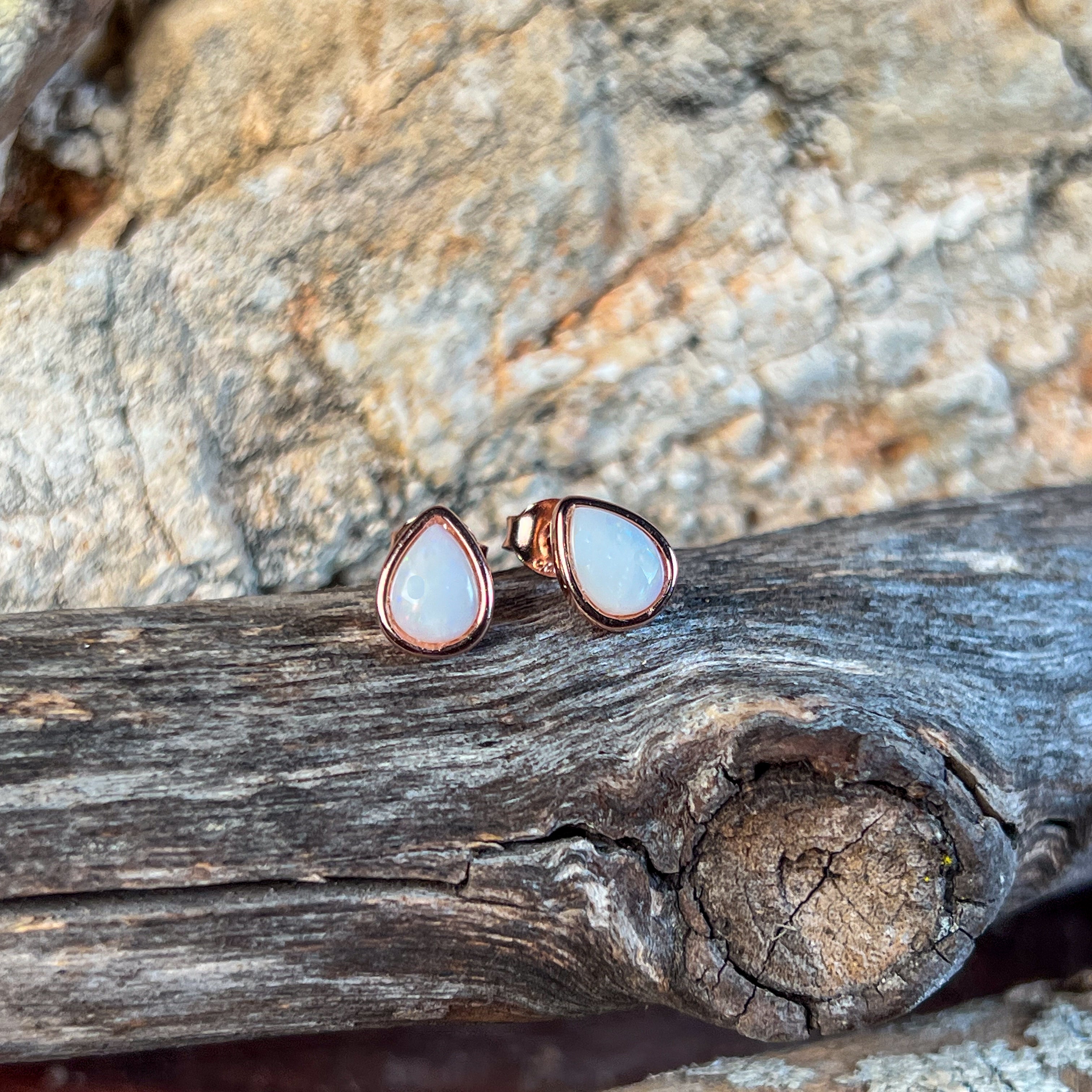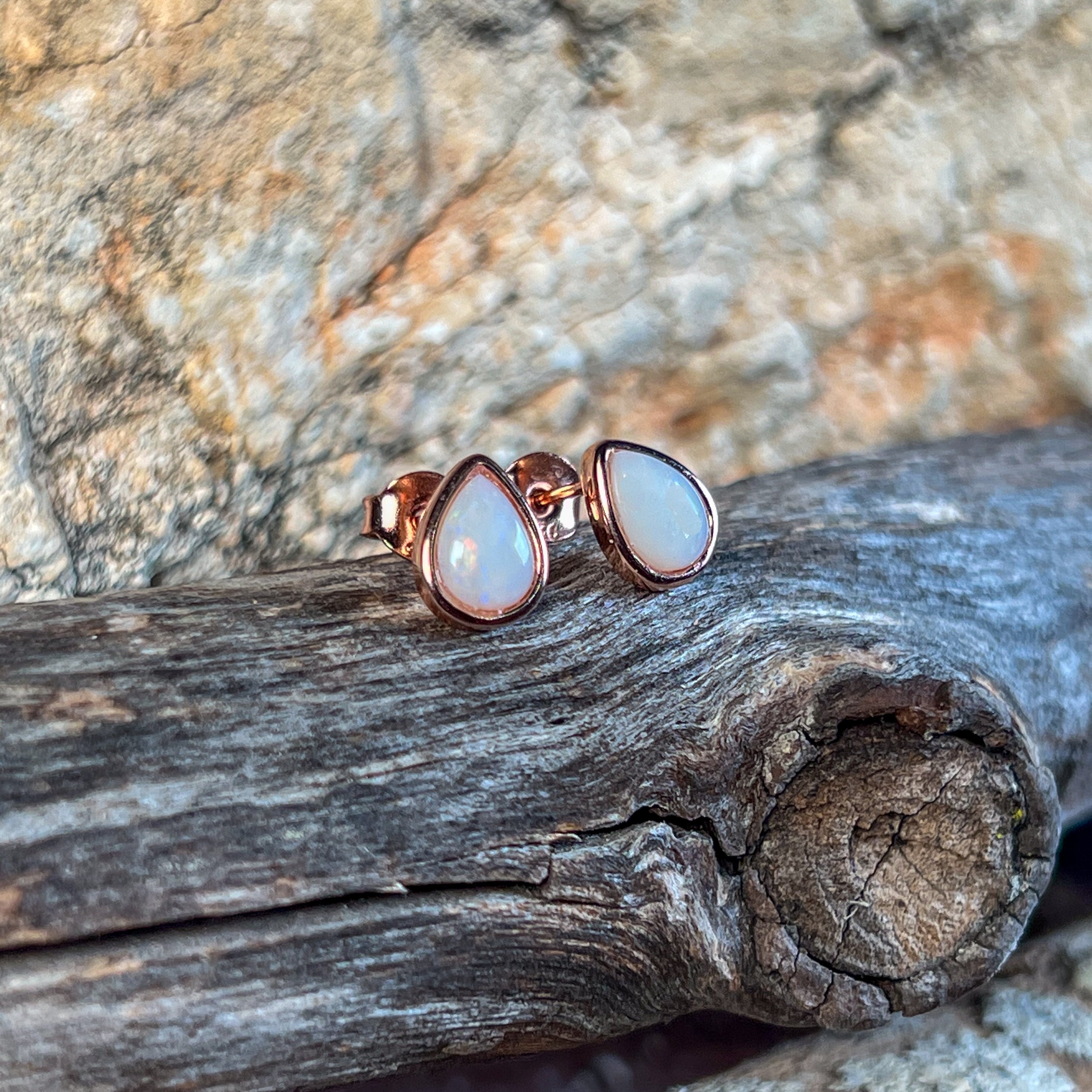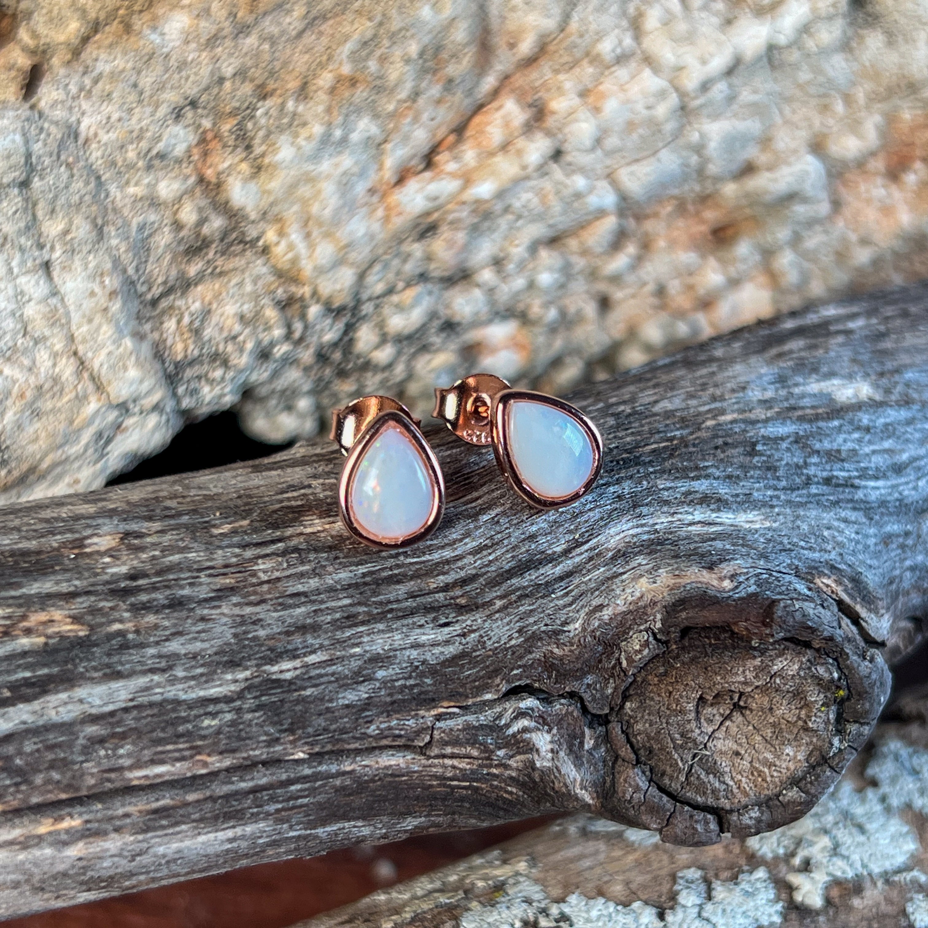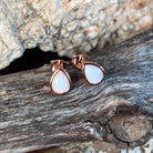 Rose Gold plated Silver 8x5mm White Opal bezel set studs