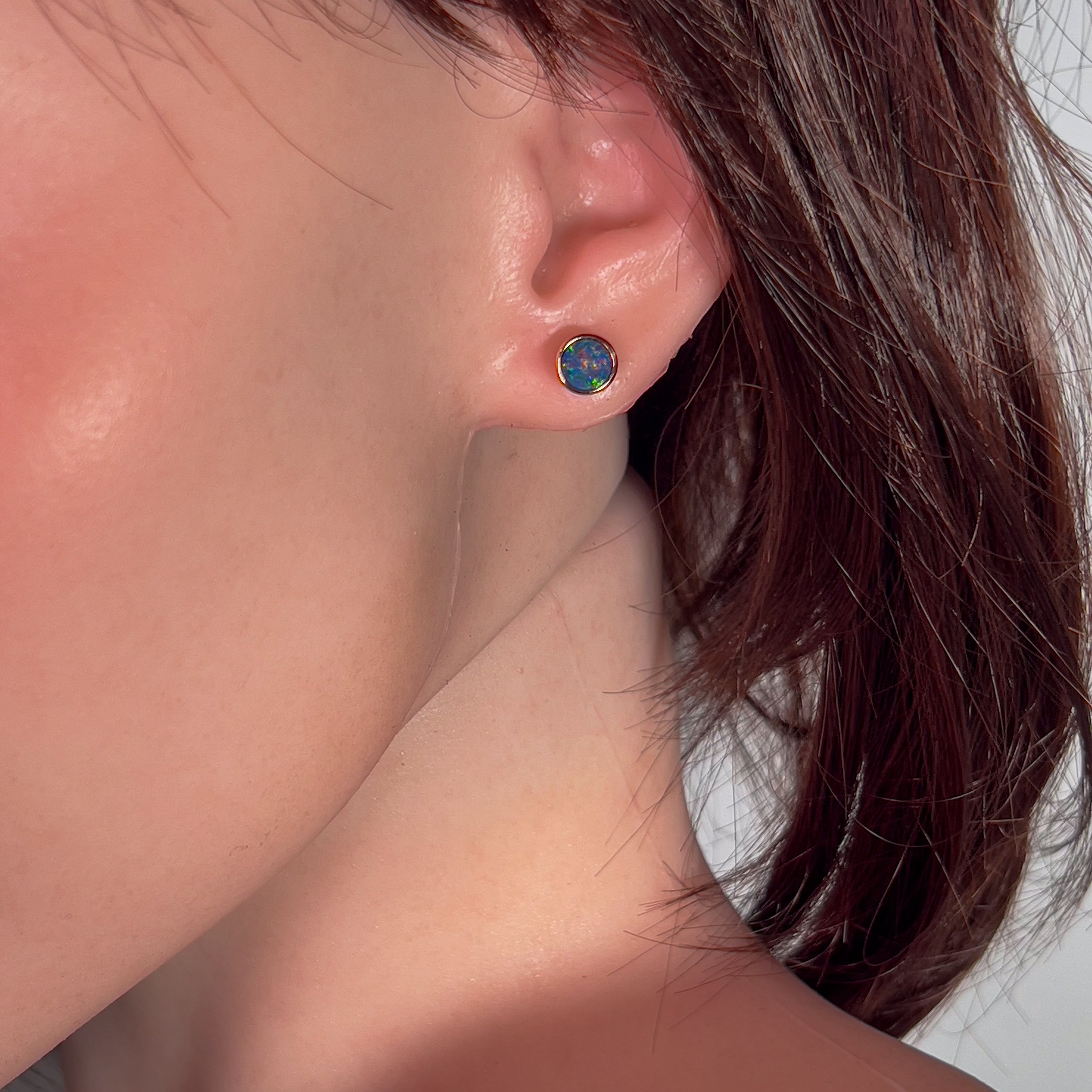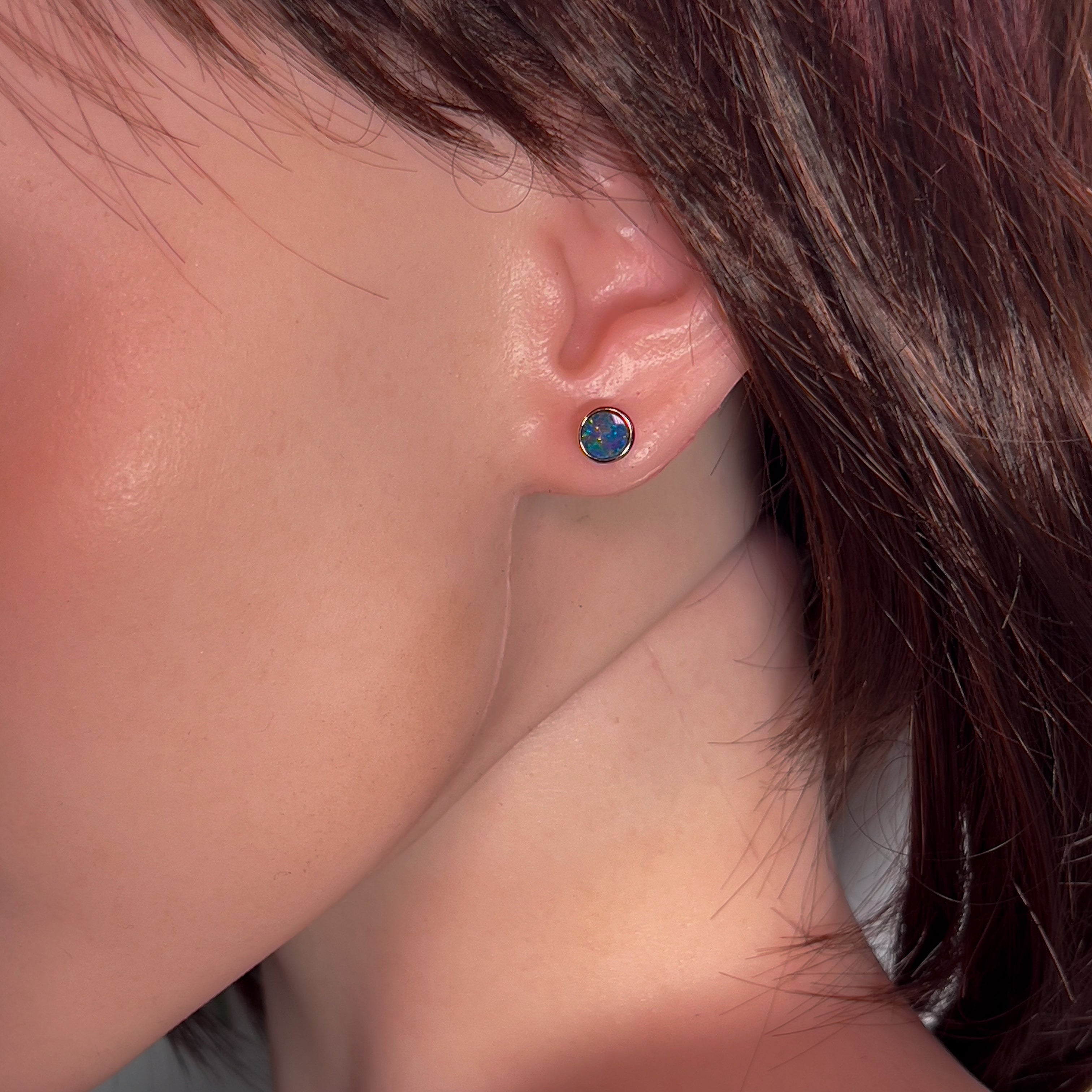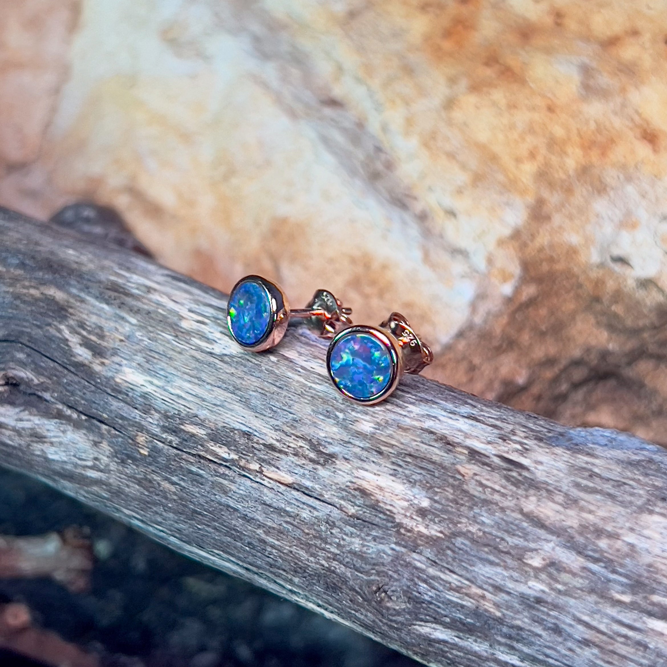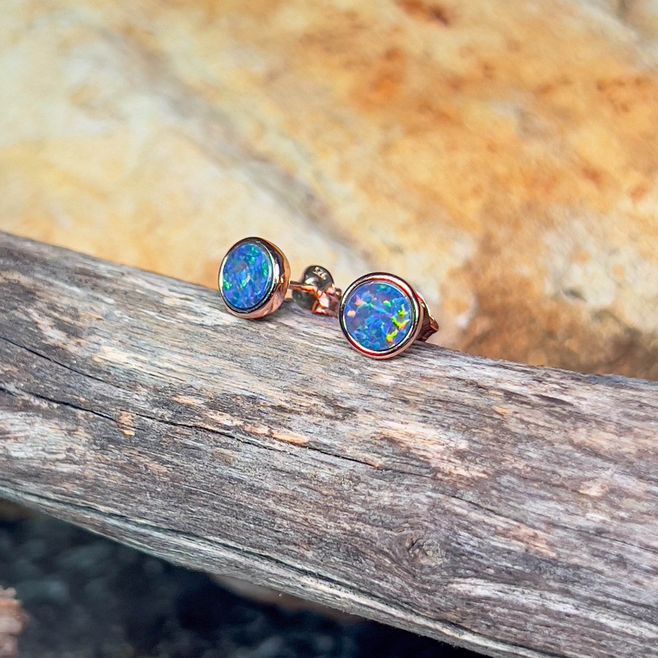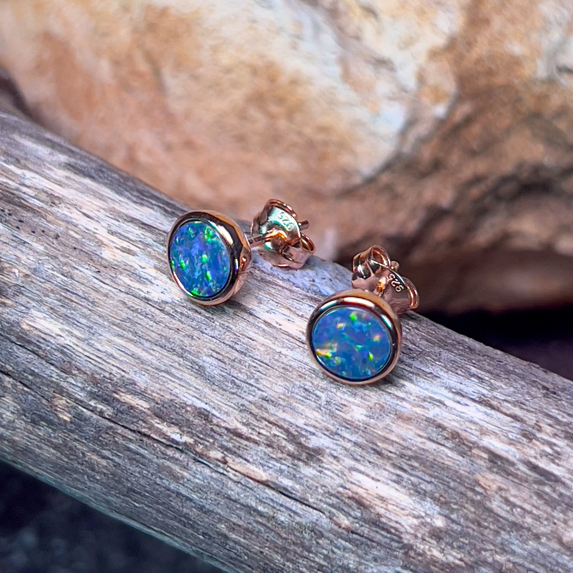 Indulge in elegant luxury with our Rose Gold plated Silver Round Opal doublet studs. These classic earrings feature a stunning round design that adds a touch of timeless sophistication to any outfit. Let the opal doublet stones sparkle and shine, making you feel like a true gem.