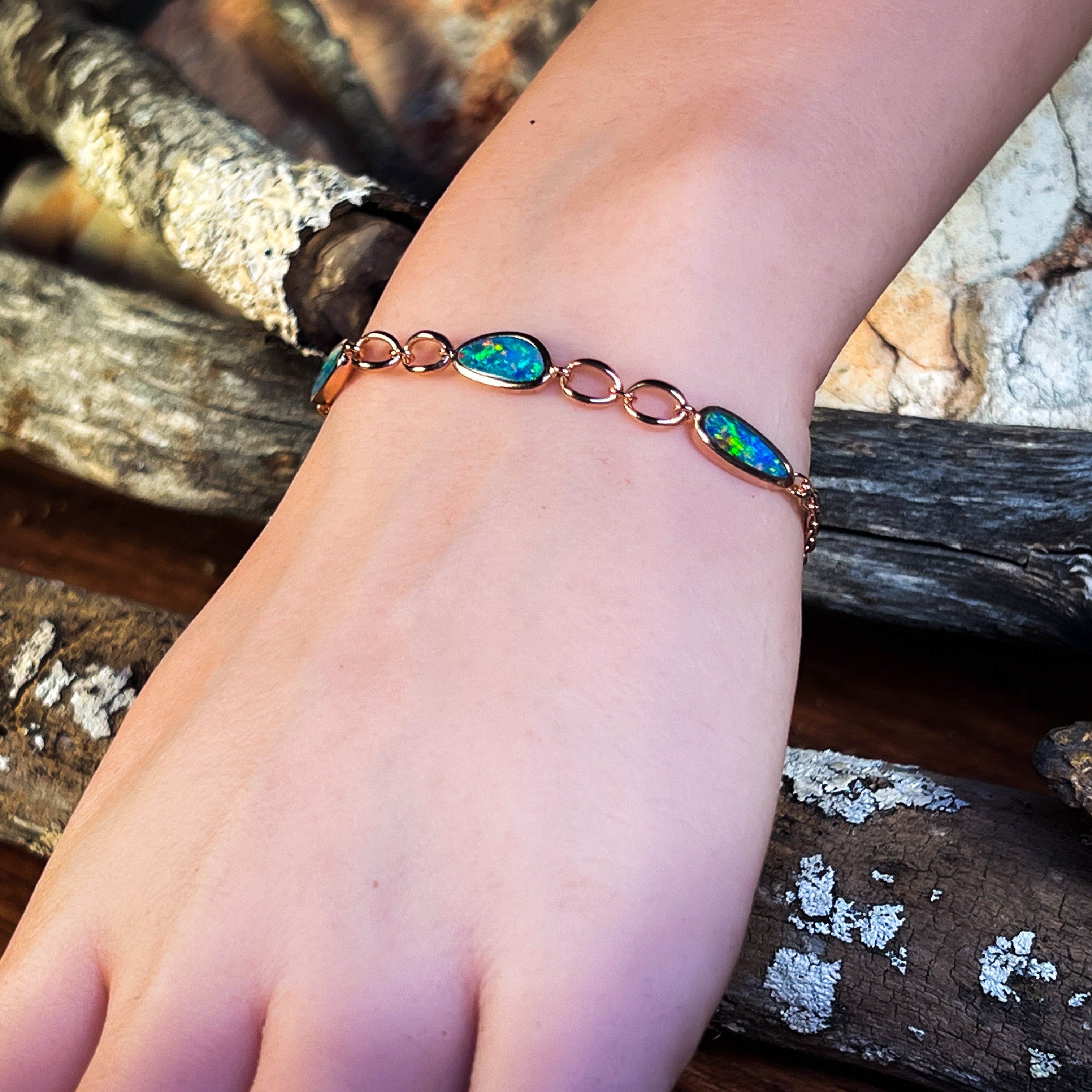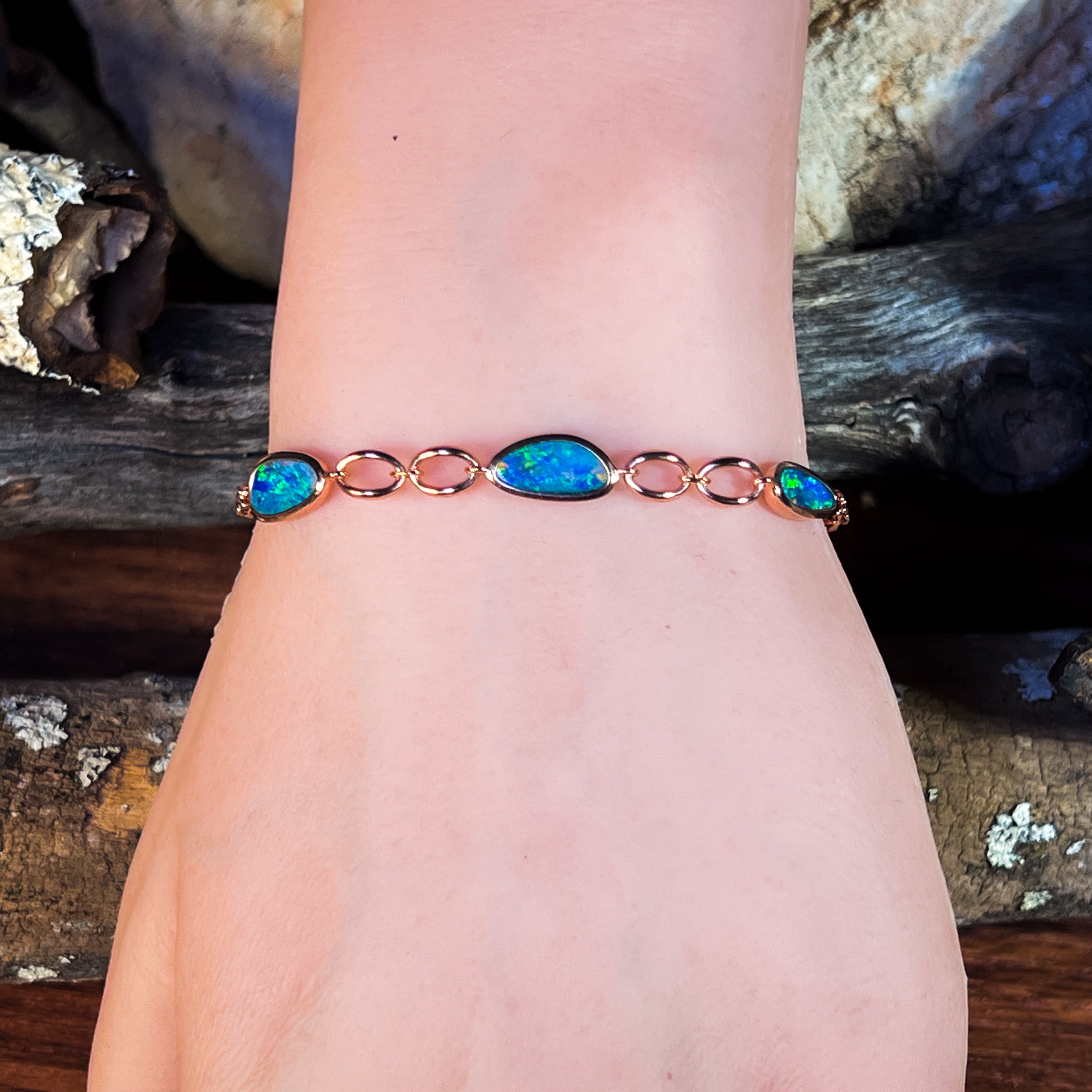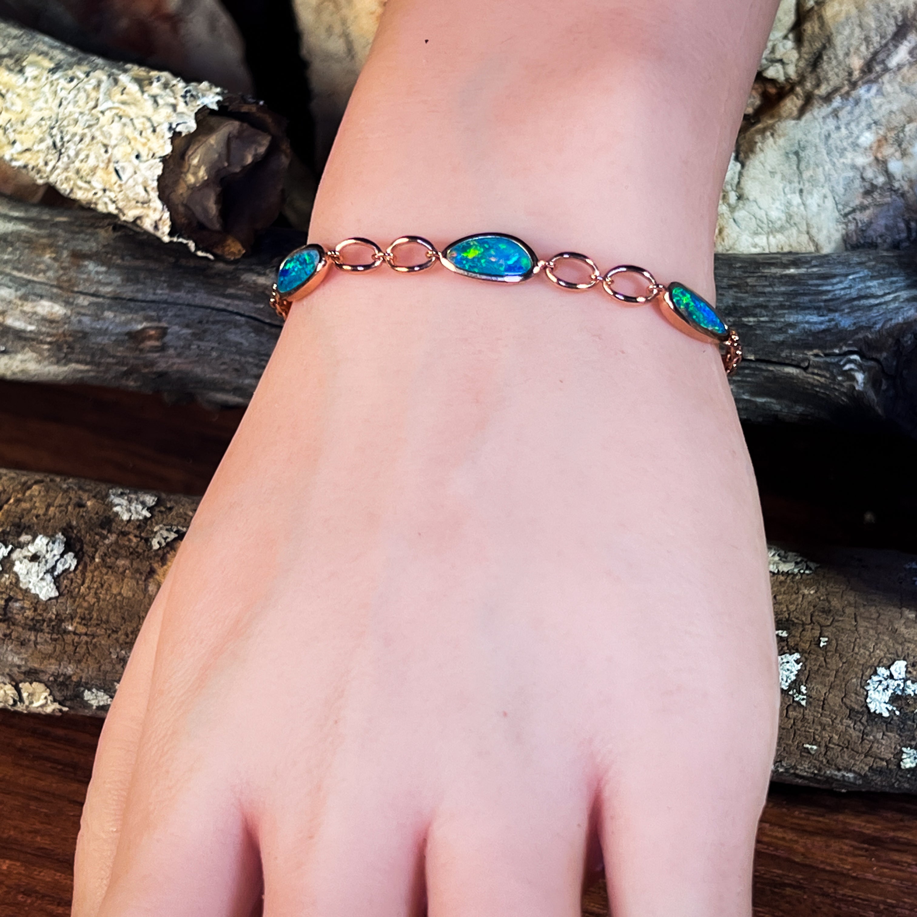 Sparkle and shine with our beautiful Rose Gold Silver plated Opal doublet bracelet! The freeform green blue stones add a pop of color and uniqueness to any outfit. Stand out and make a statement with our stunning and eye-catching bracelet.