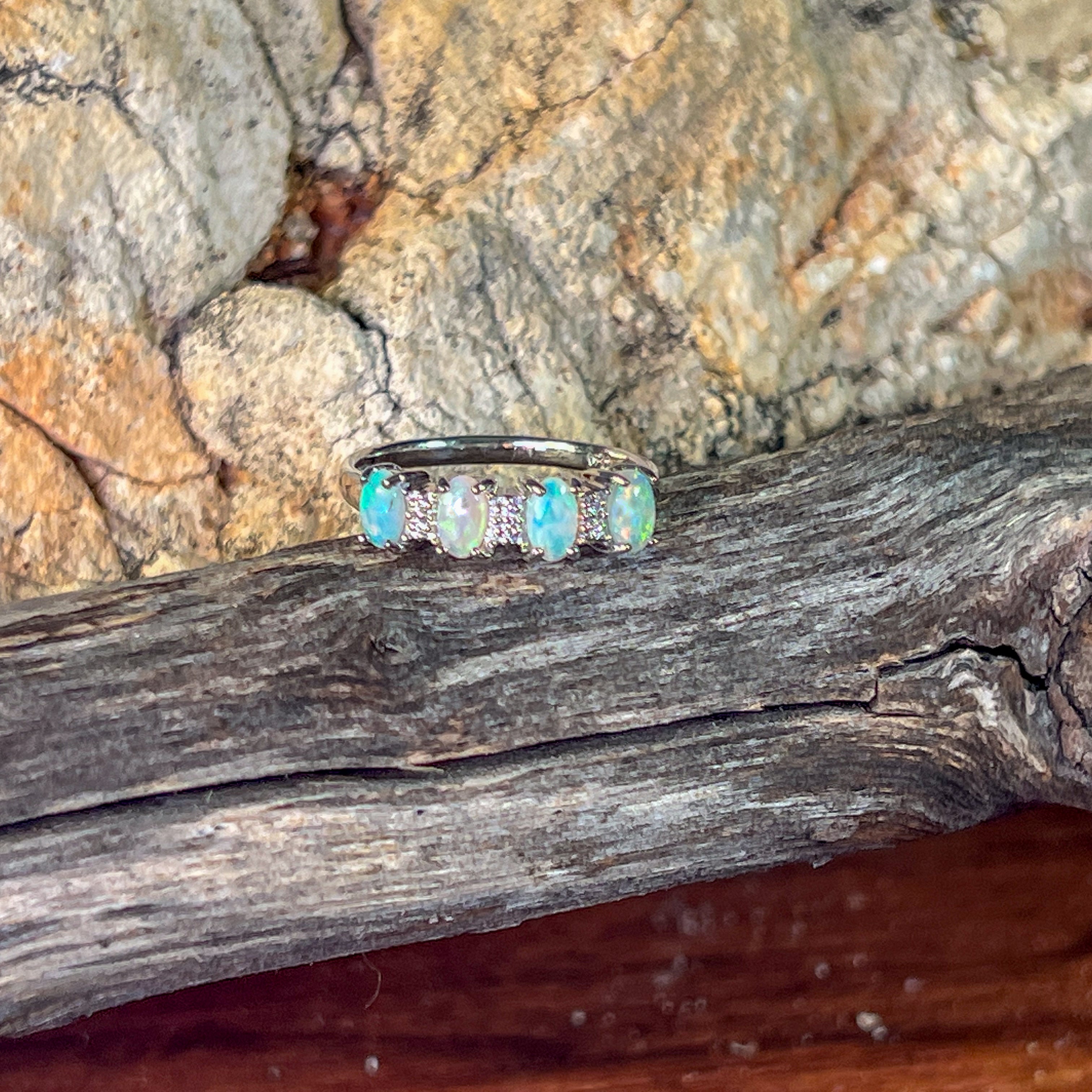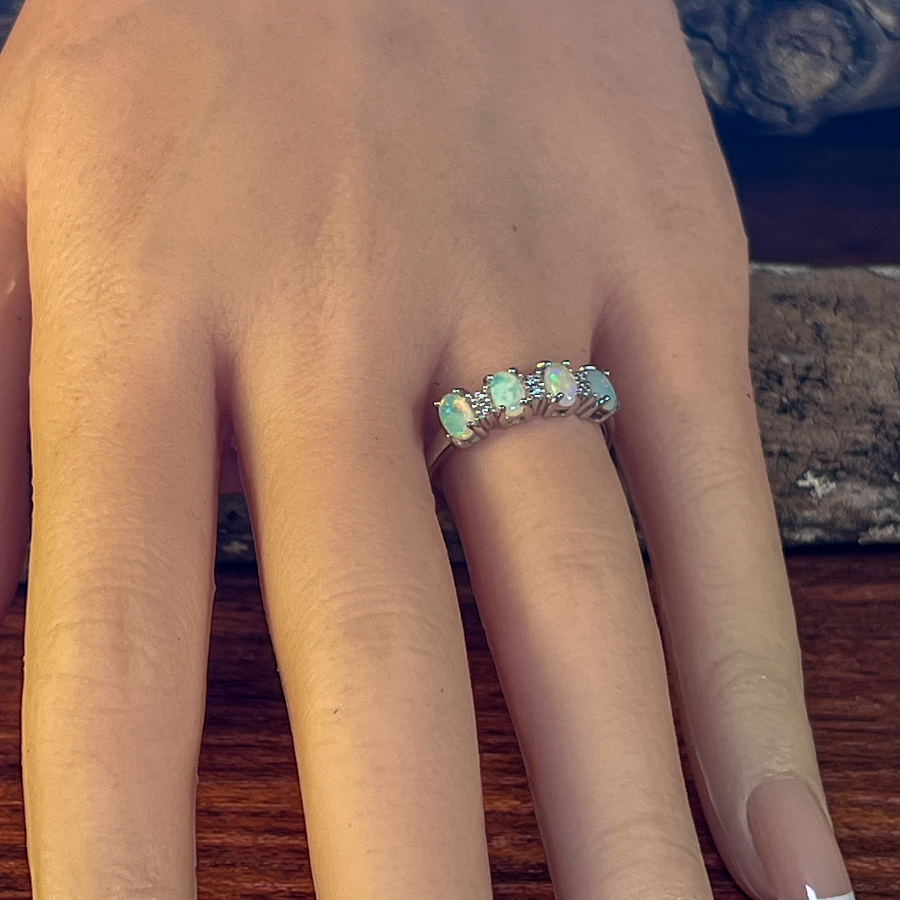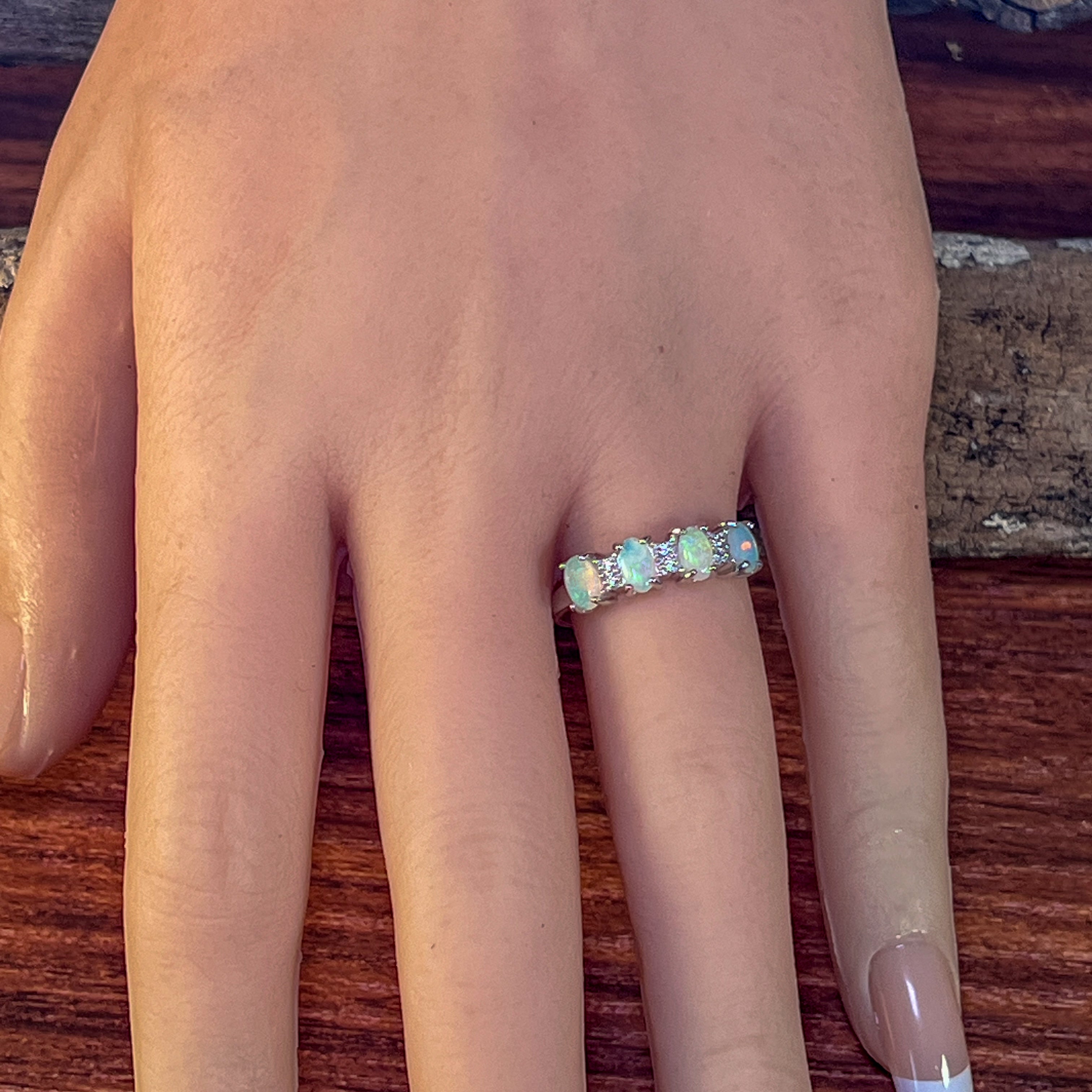 Add a touch of elegance to any outfit with our Sterling Silver 5x3mm Opal half eternity band. This stunning ring features a half eternity design, perfect for symbolizing everlasting love and commitment. Crafted in high-quality sterling silver, it is both beautiful and durable.