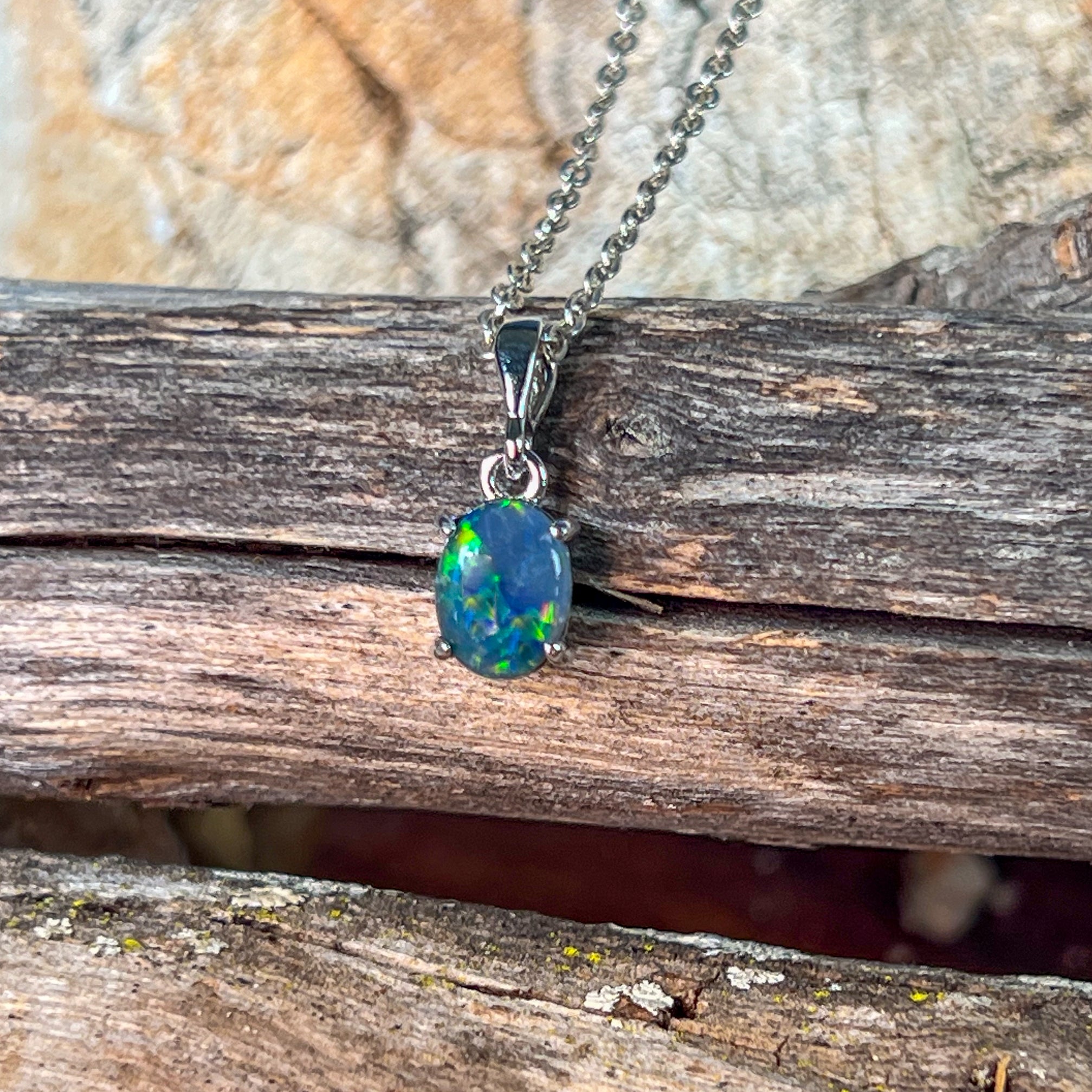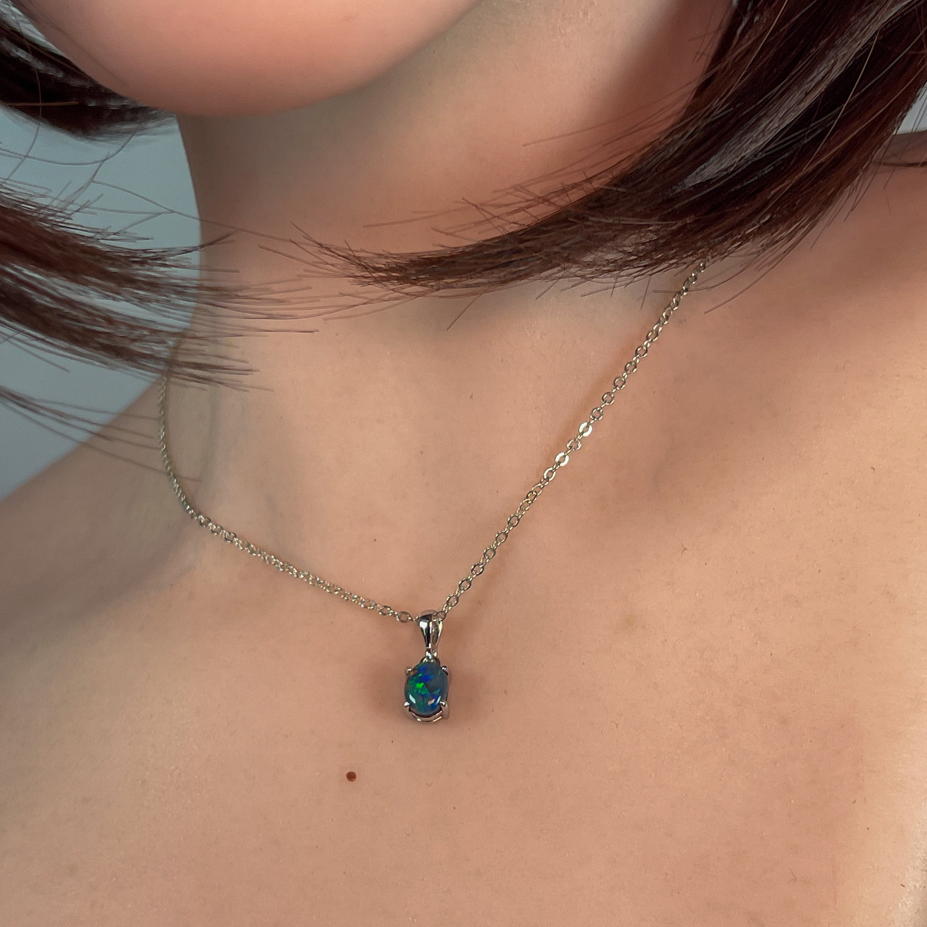 This elegant pendant features a dazzling 8x6mm opal triplet set in sterling silver with secure four-claw settings. Its timeless design highlights the opal’s vibrant colors, making it a perfect accessory to add subtle sophistication to any outfit. Crafted for lasting beauty and everyday wear, it’s an ideal piece to cherish or gift.