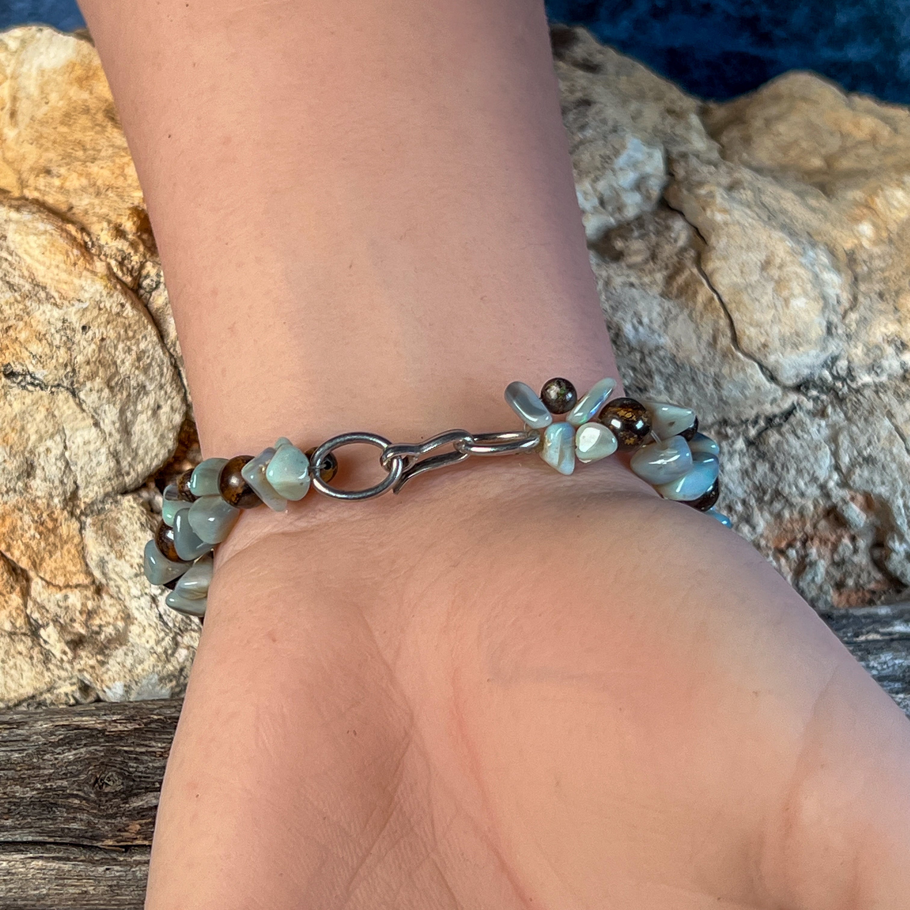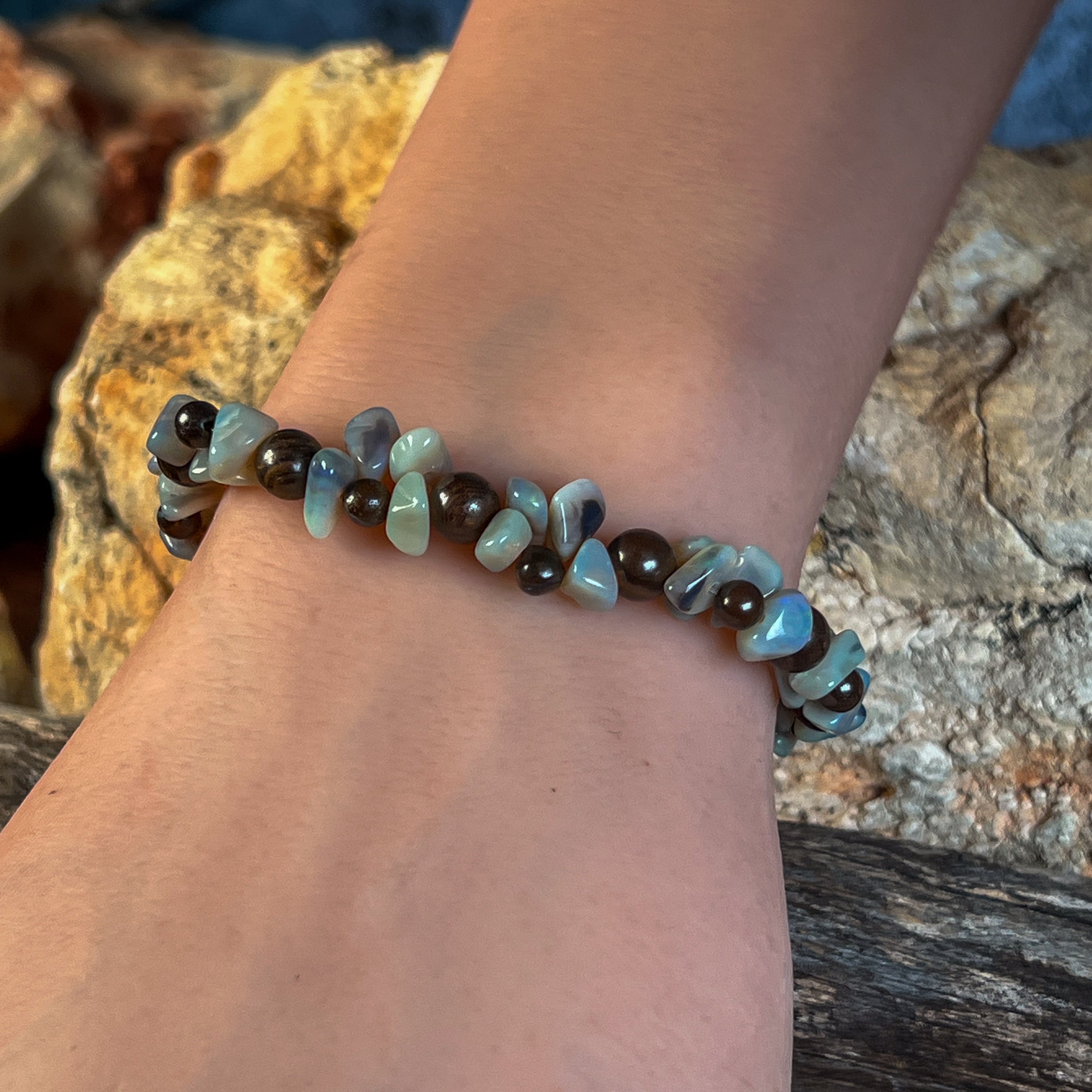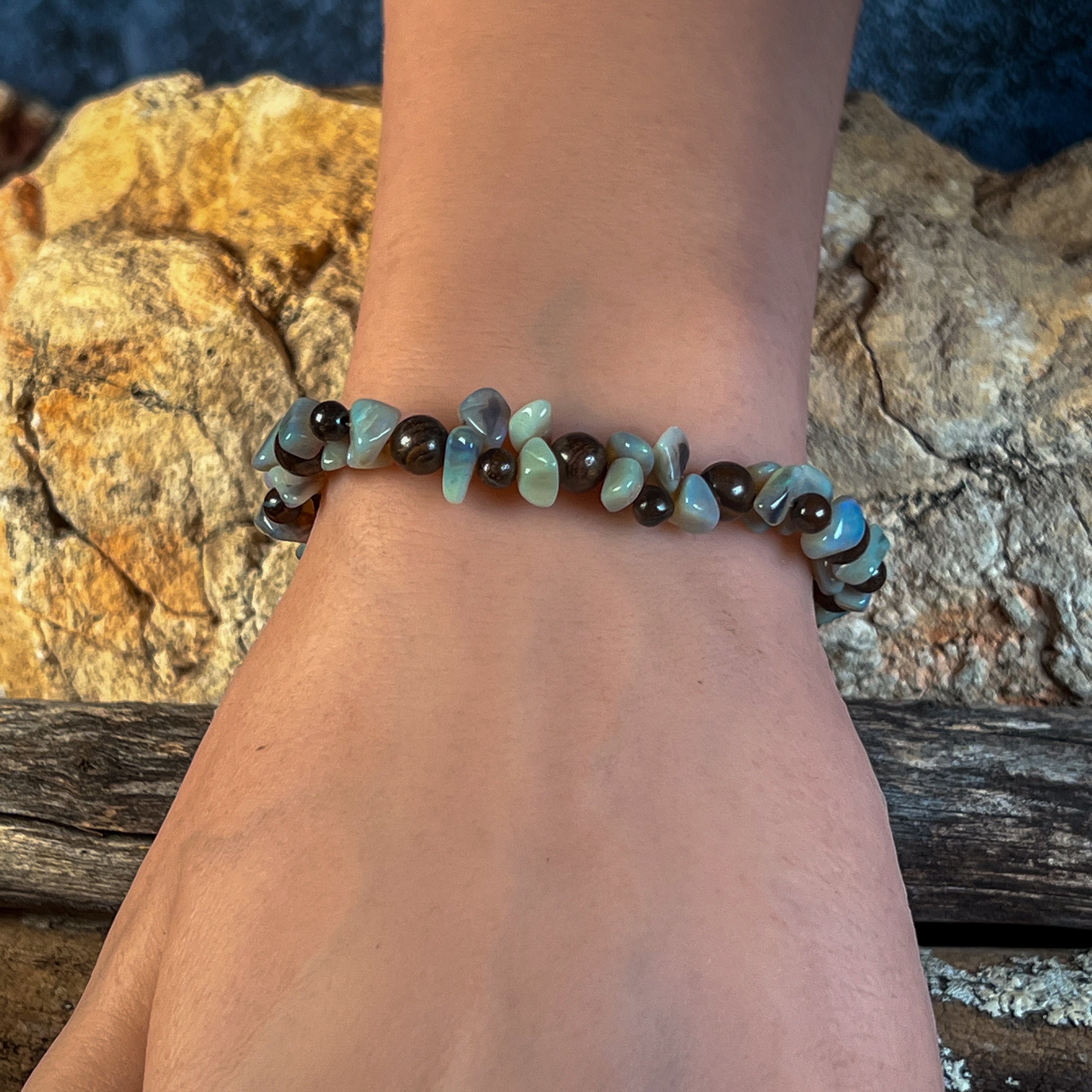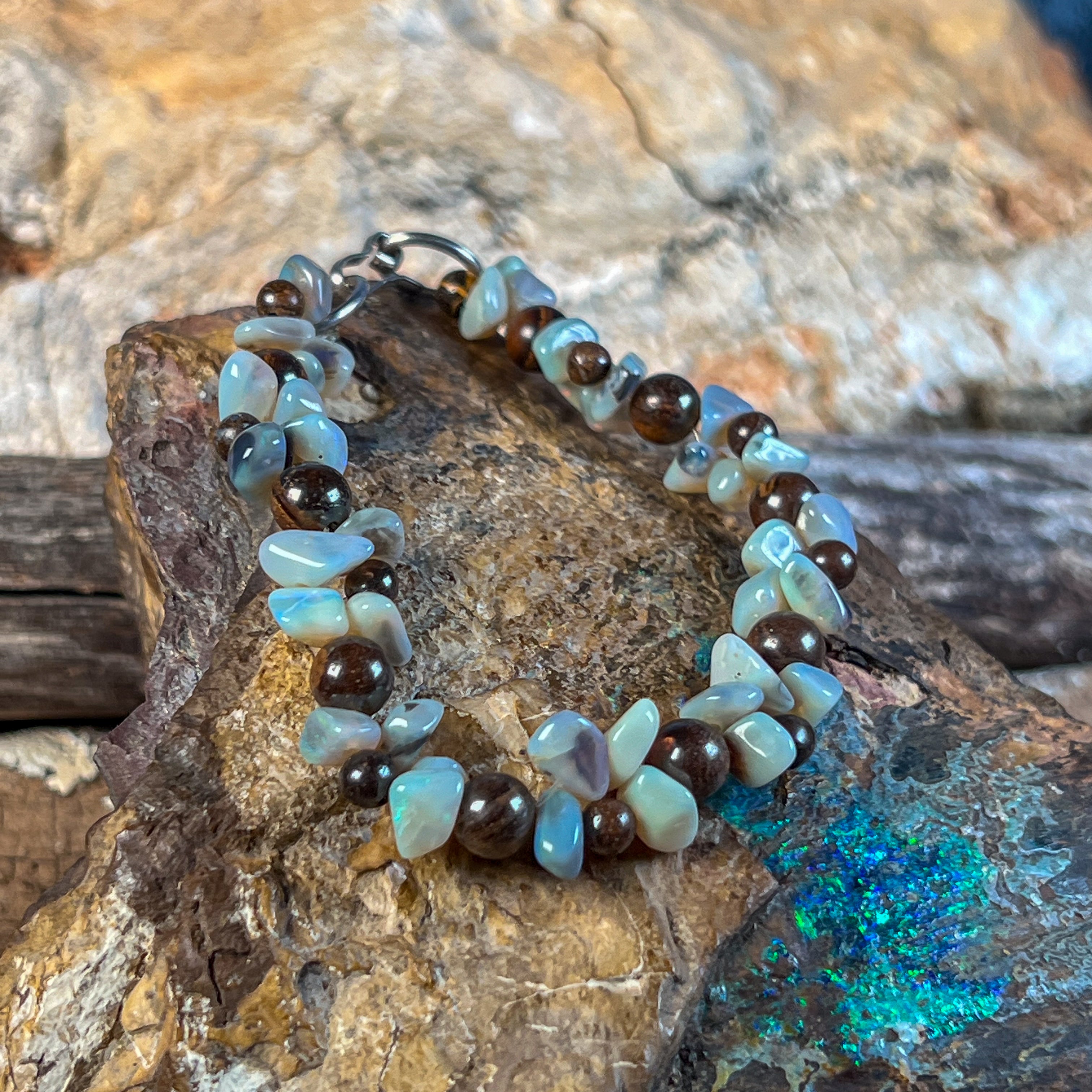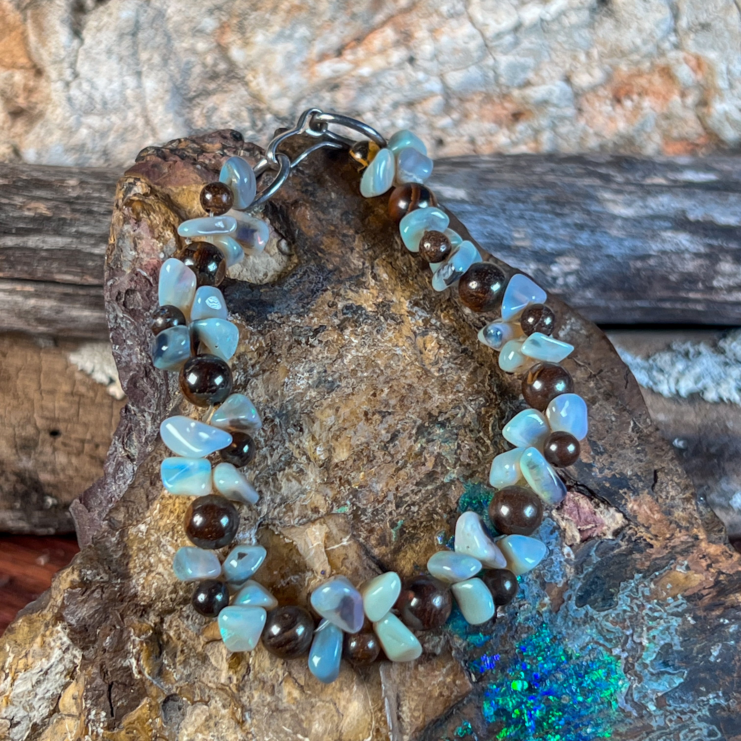 Slip on a little piece of Australian magic with this sterling silver beaded Boulder Opal bracelet. Each bead showcases the natural beauty of genuine boulder opal, with its mesmerizing play of colour dancing across the stone. The delicate sterling silver setting lets the opal take centre stage while adding a touch of timeless elegance. Perfect for everyday wear or special occasions, this bracelet brings warmth, wonder, and a splash of colour to your wrist. A true treasure that celebrates nature's artistry.