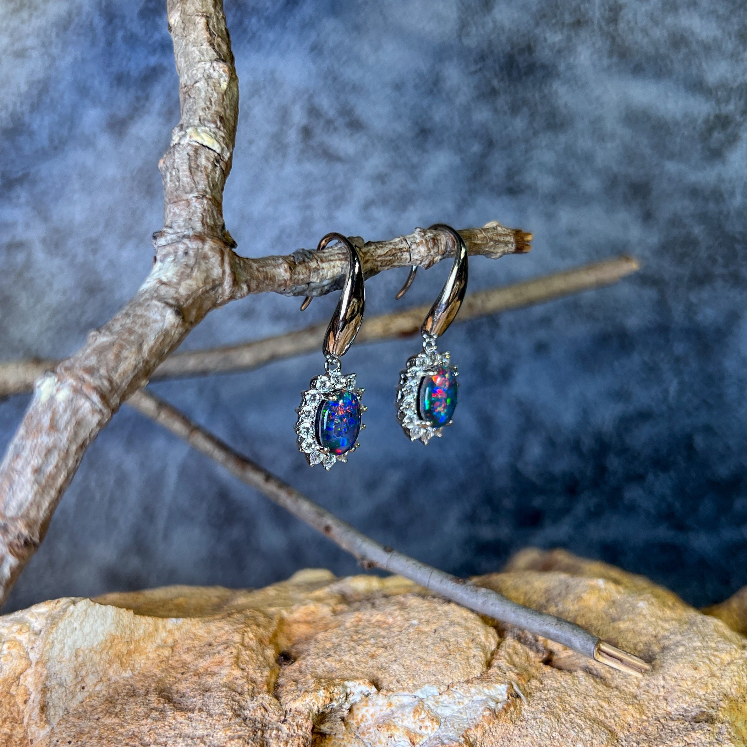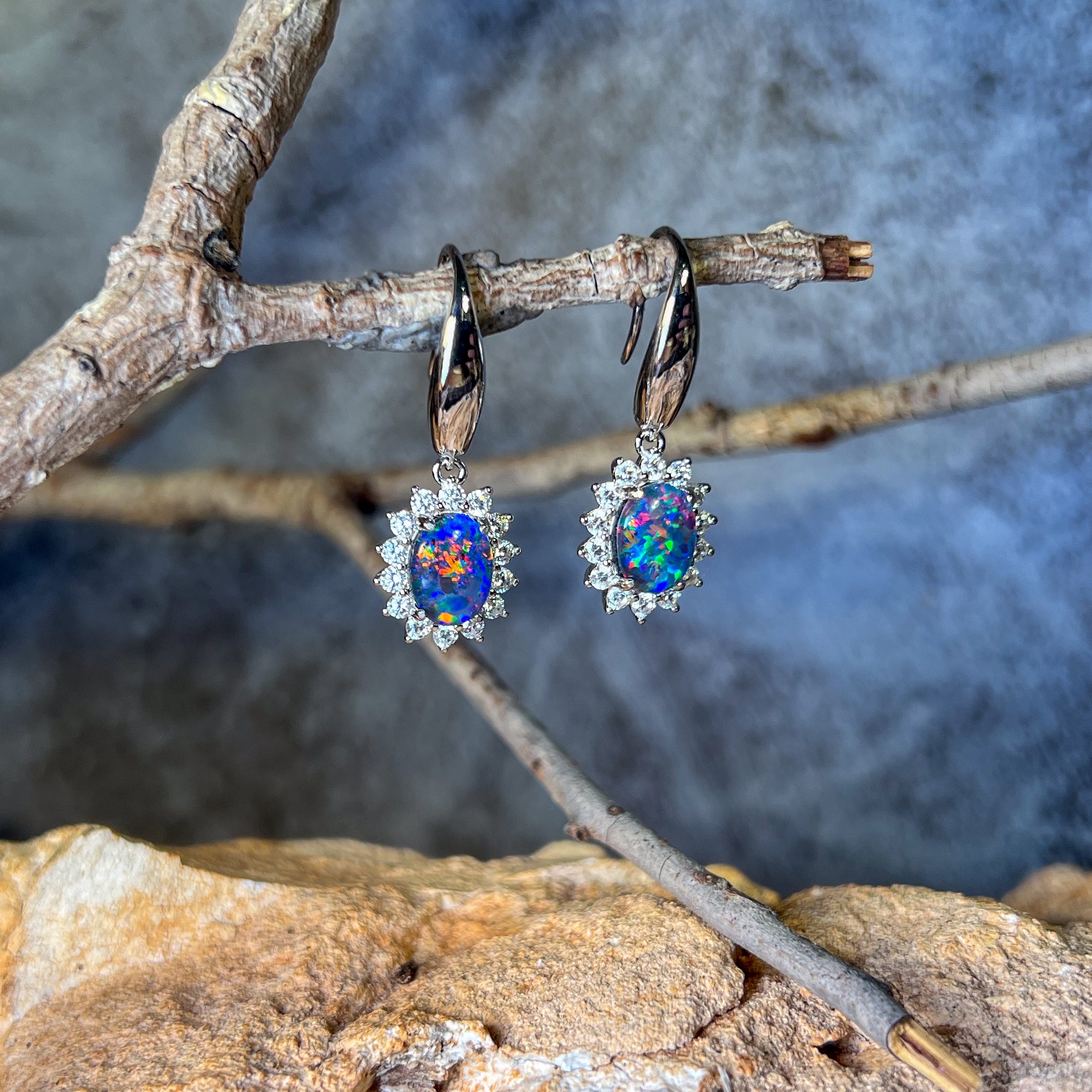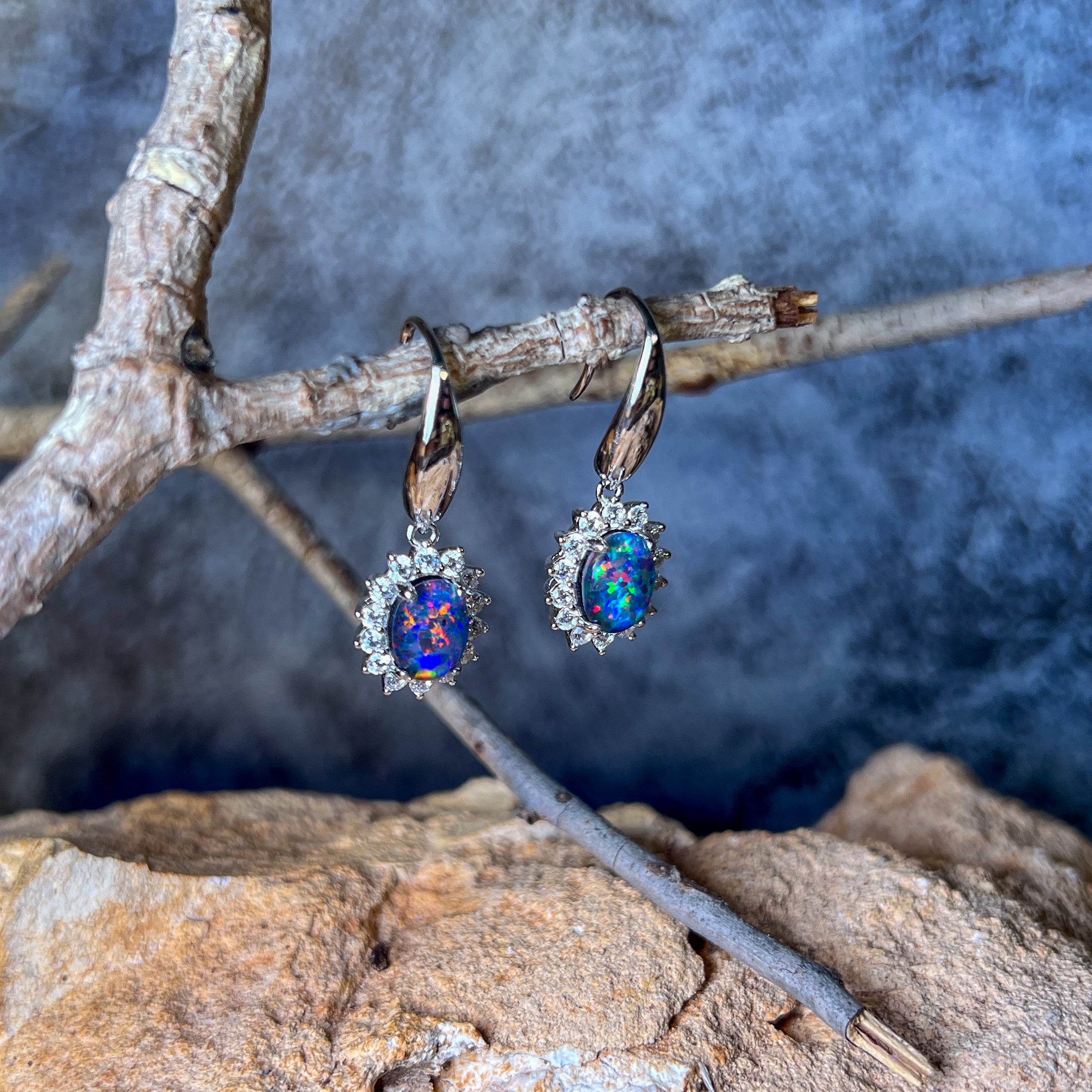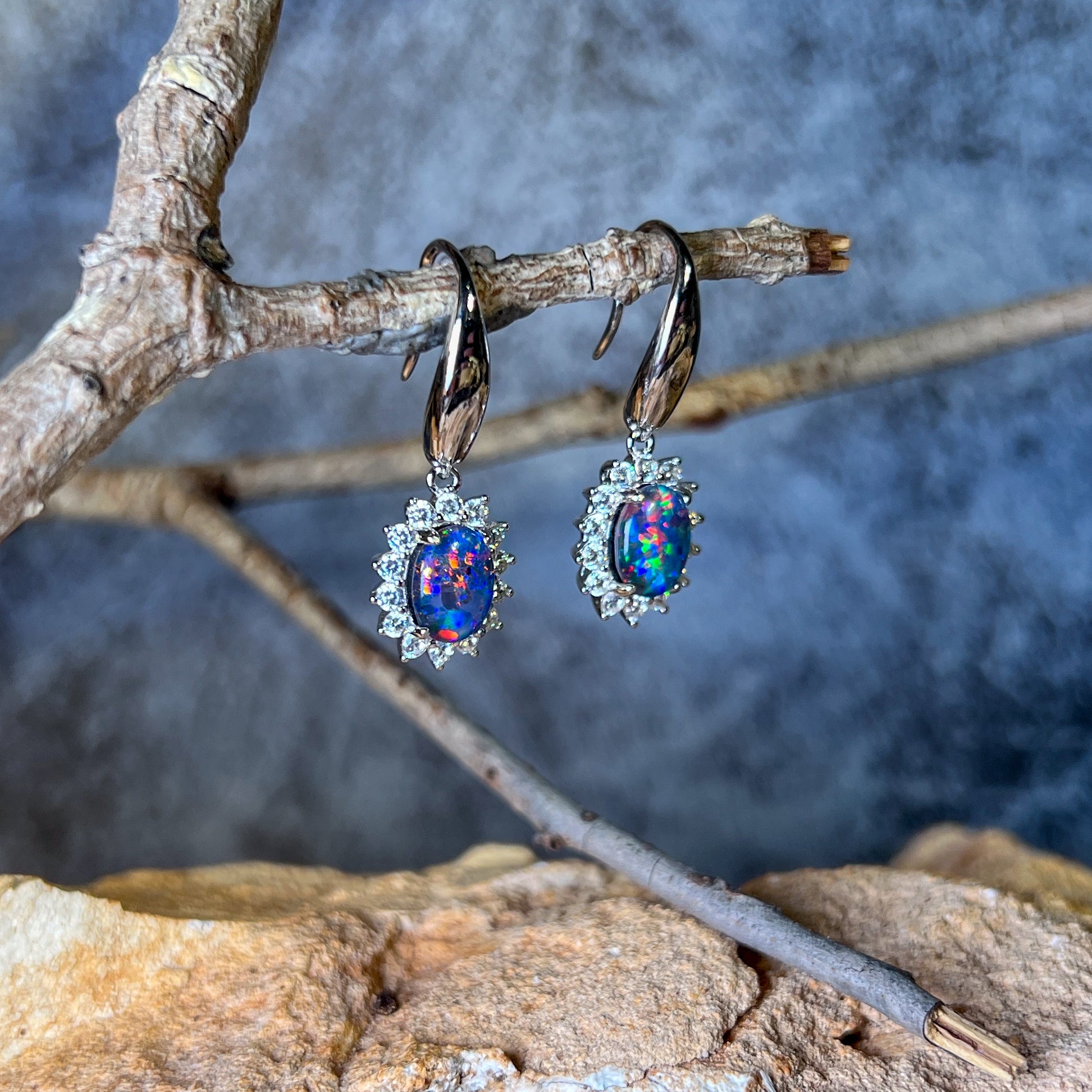 Dazzle with these exquisite Sterling Silver dangling Hook style Opal triplet earrings. The intricate cluster design and elegant dangle hooks make this piece perfect for any occasion. Add a touch of sophistication and style to your look with the shimmering beauty of Opal triplets.