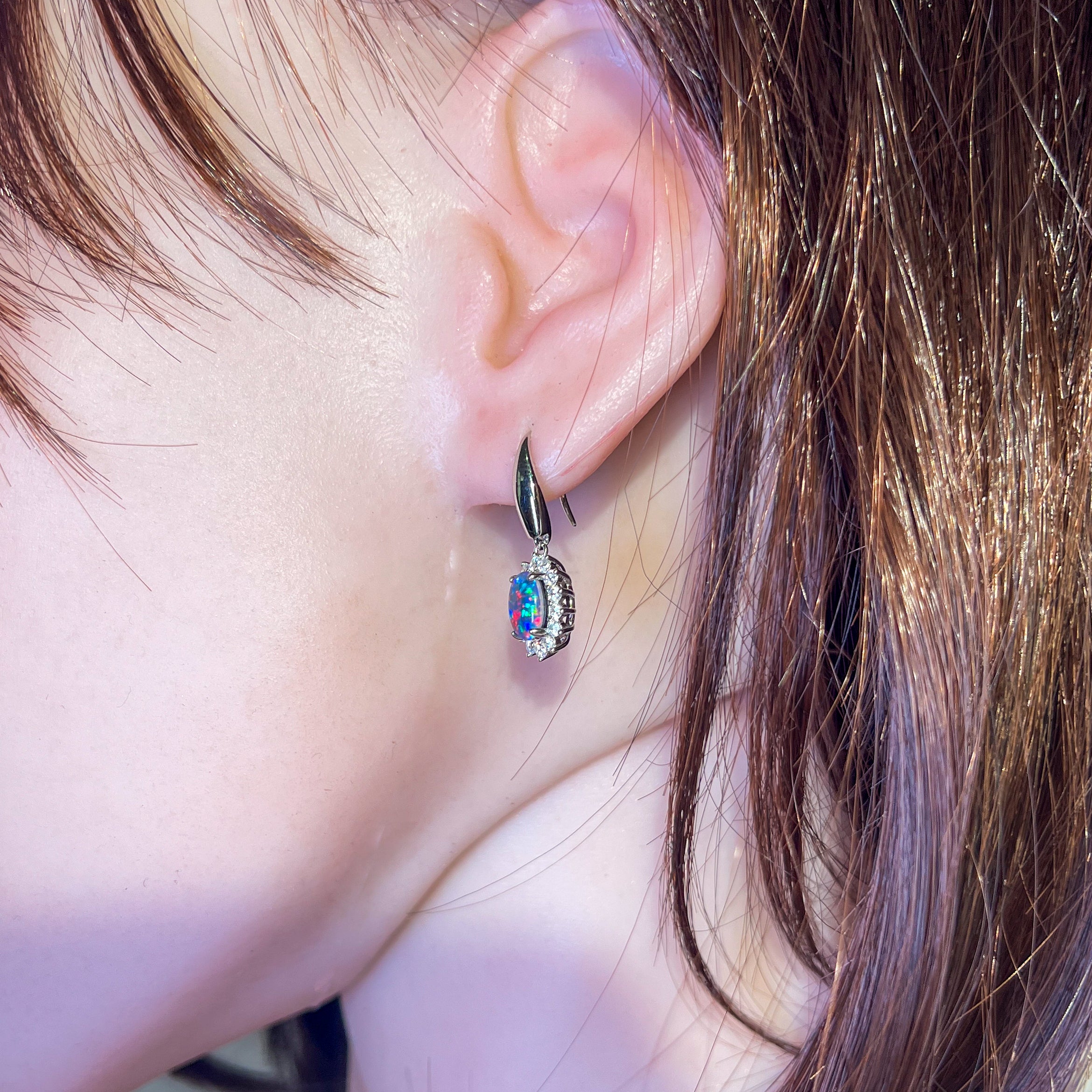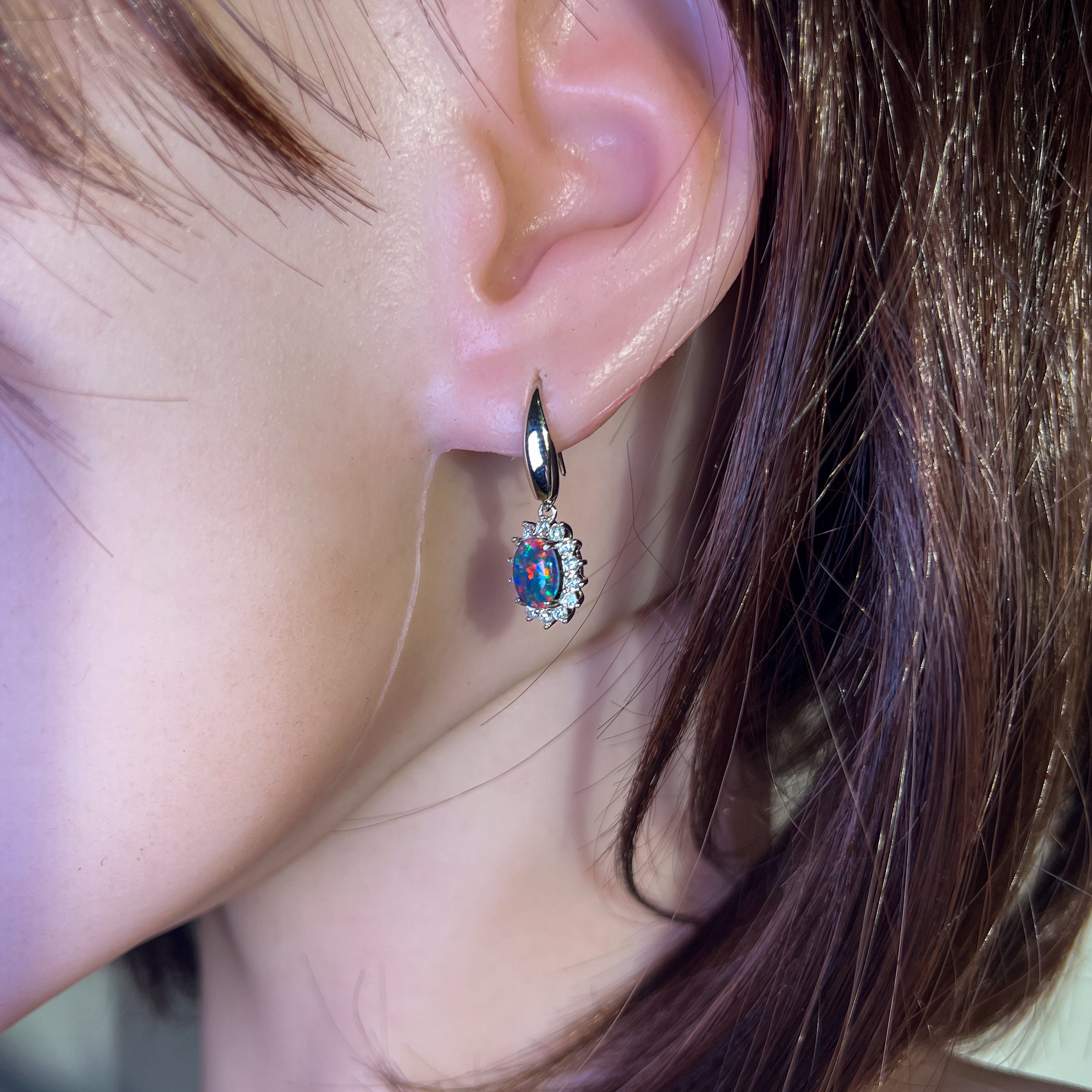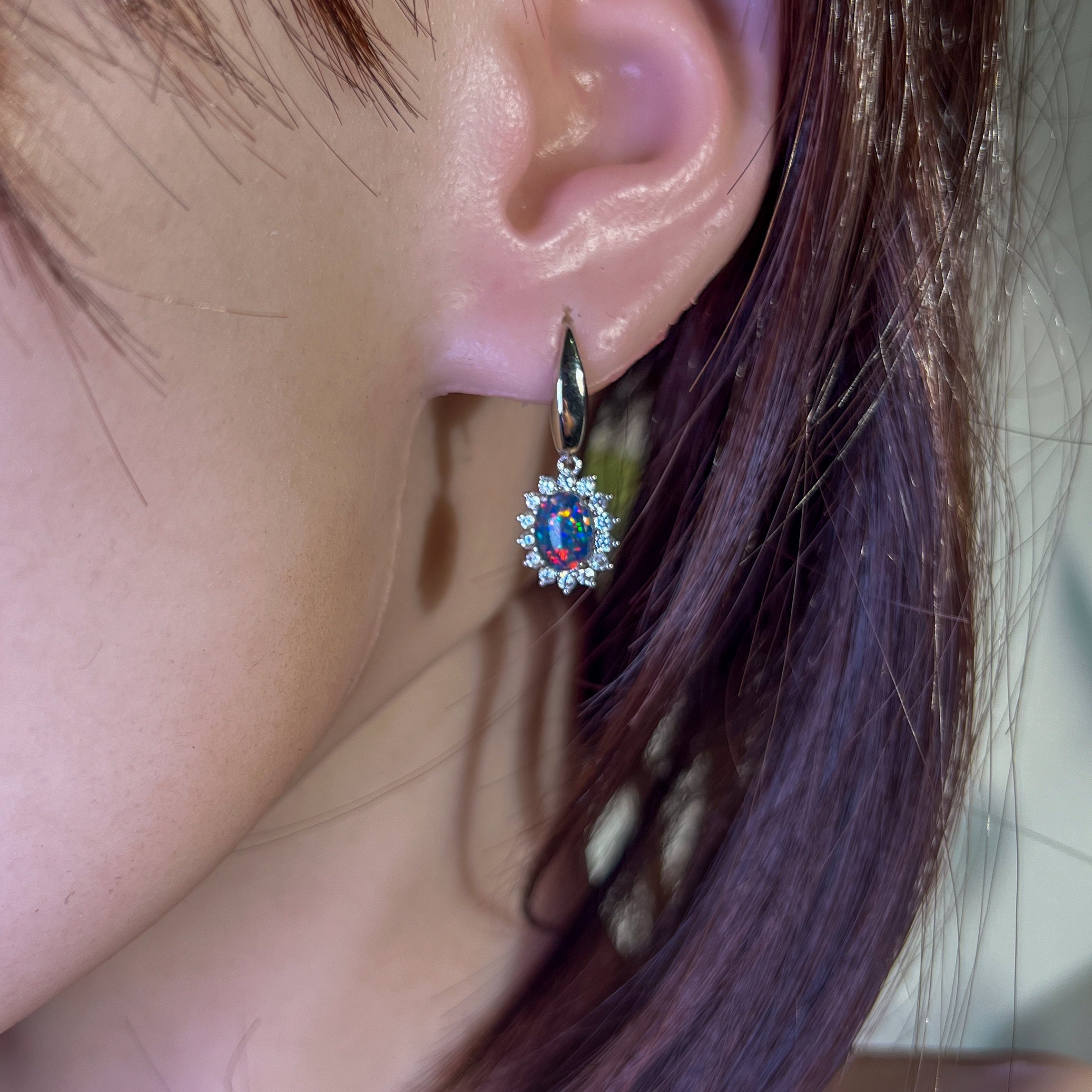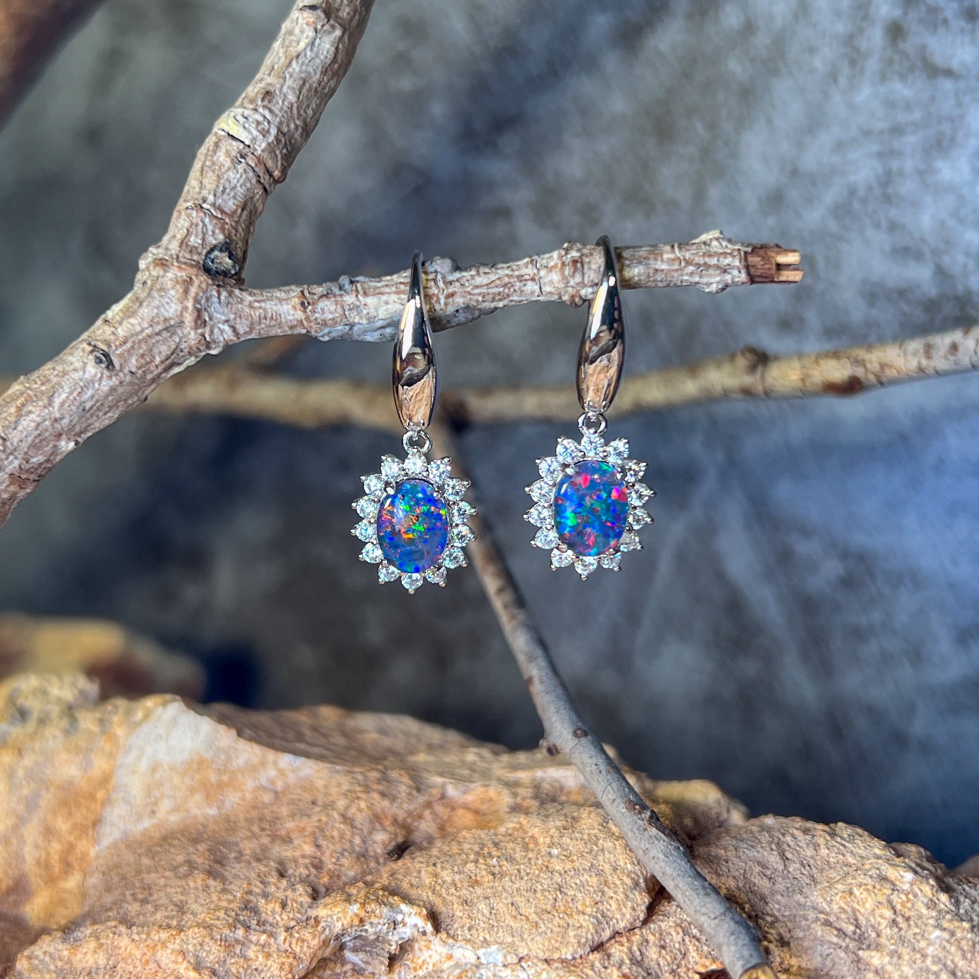 Dazzle with these exquisite Sterling Silver dangling Hook style Opal triplet earrings. The intricate cluster design and elegant dangle hooks make this piece perfect for any occasion. Add a touch of sophistication and style to your look with the shimmering beauty of Opal triplets.