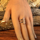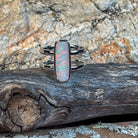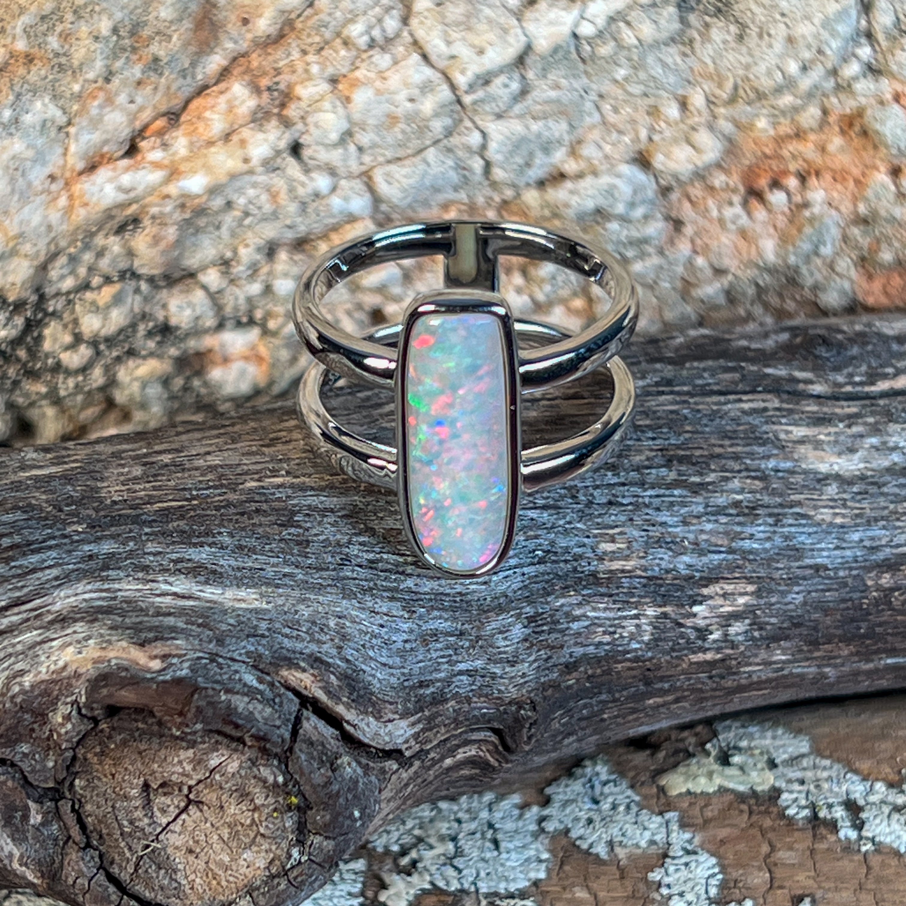 Elevate your everyday elegance with this striking sterling silver ring featuring a long rectangular white opal that catches the light beautifully. The clever double band design adds contemporary flair while providing a comfortable, secure fit. Perfect for those who love a statement piece that's still wearable for any occasion. This modern take on classic opal jewellery brings sophistication with a touch of playful sparkle to your collection.