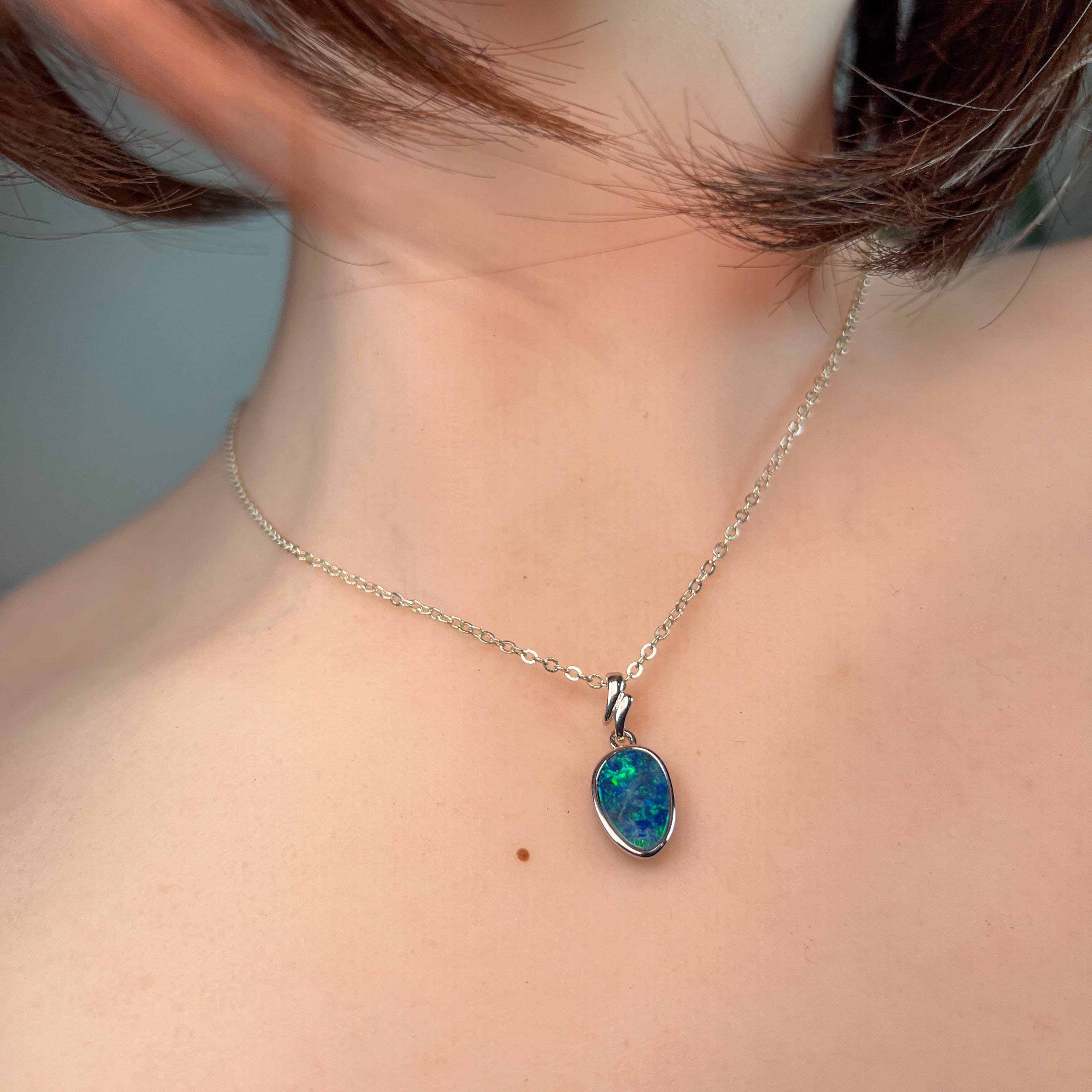 This striking Sterling Silver pendant showcases a freeform Green Blue Opal doublet that captures light with mesmerizing depth and movement. The sharp, vibrant green hues create an eye-catching focal point that draws admiration from every angle. Crafted in quality sterling silver, this piece offers timeless elegance with contemporary flair. Perfect for those seeking a distinctive gemstone pendant that makes a bold statement while maintaining sophisticated appeal. An investment in wearable art that transforms any outfit.