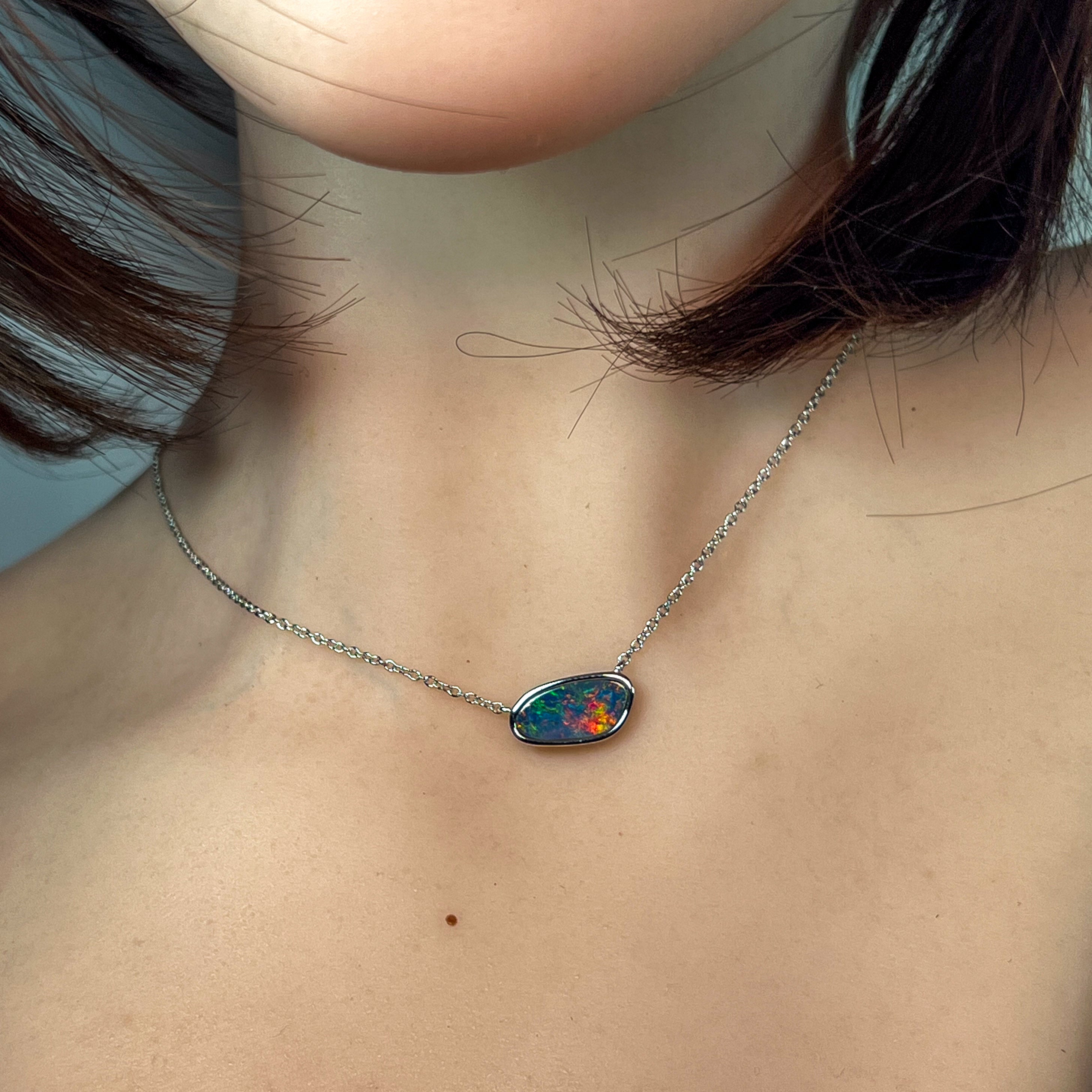 Elevate your elegance with this sterling silver necklace featuring a freeform horizontal bezel-set opal doublet. The unique shape and secure setting highlight the opal’s vibrant play of color, making it a refined statement piece perfect for any sophisticated wardrobe.