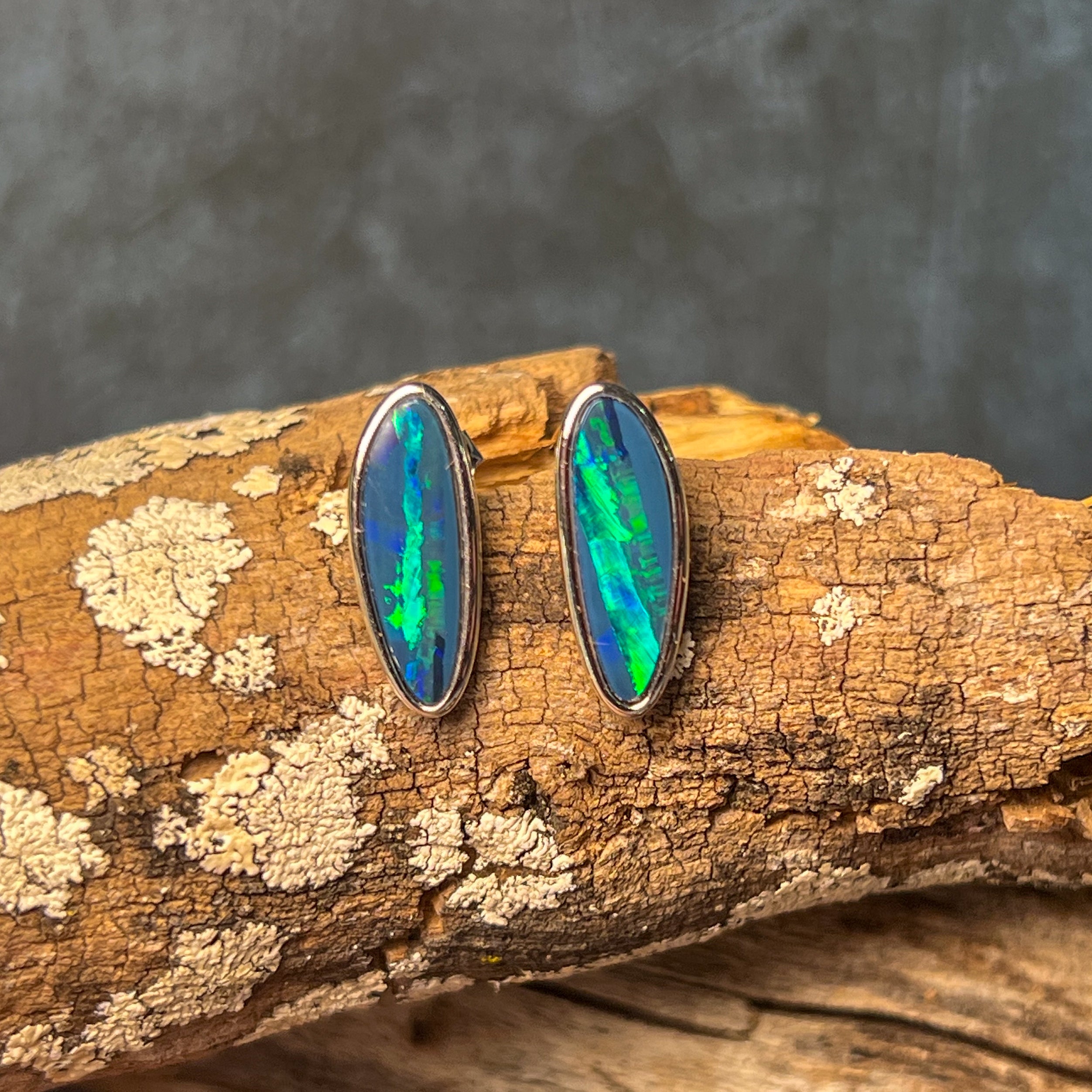 Elevate your elegance with these sterling silver freeform opal doublet earrings, featuring captivating blue-green stripes. Their unique design and rich hues add a refined touch to any ensemble, perfect for those who appreciate subtle sophistication and timeless beauty.