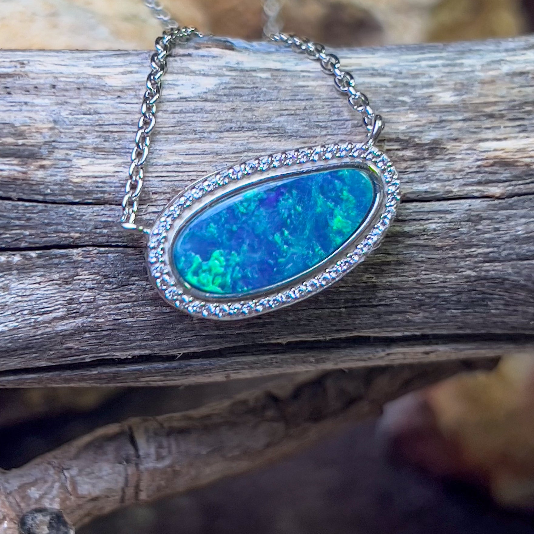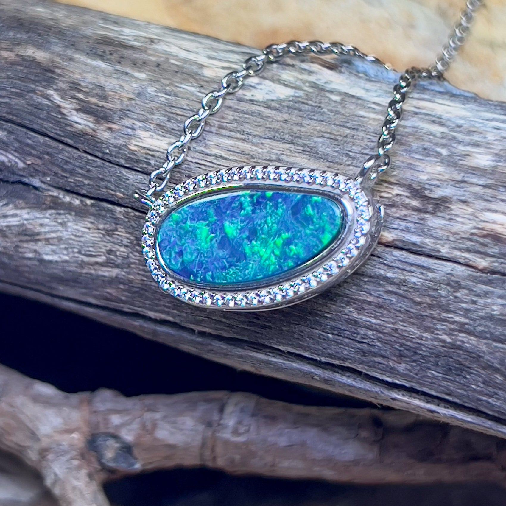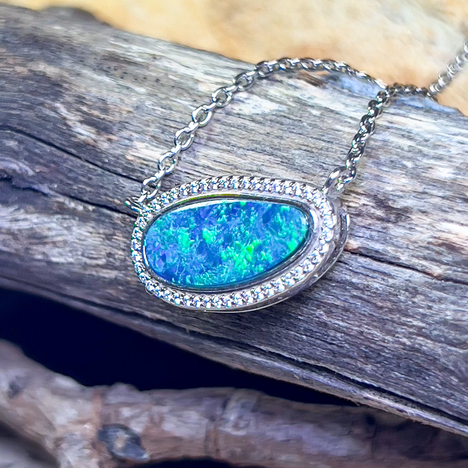 Sterling Silver Halo style Opal doublet necklace Blue Green