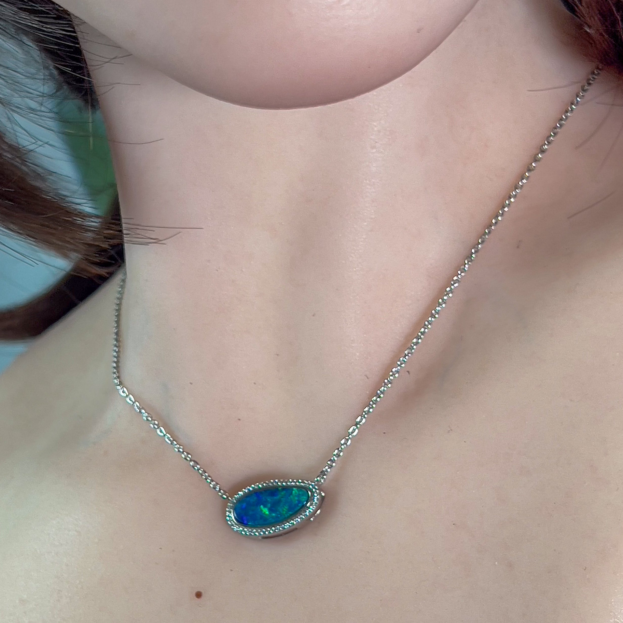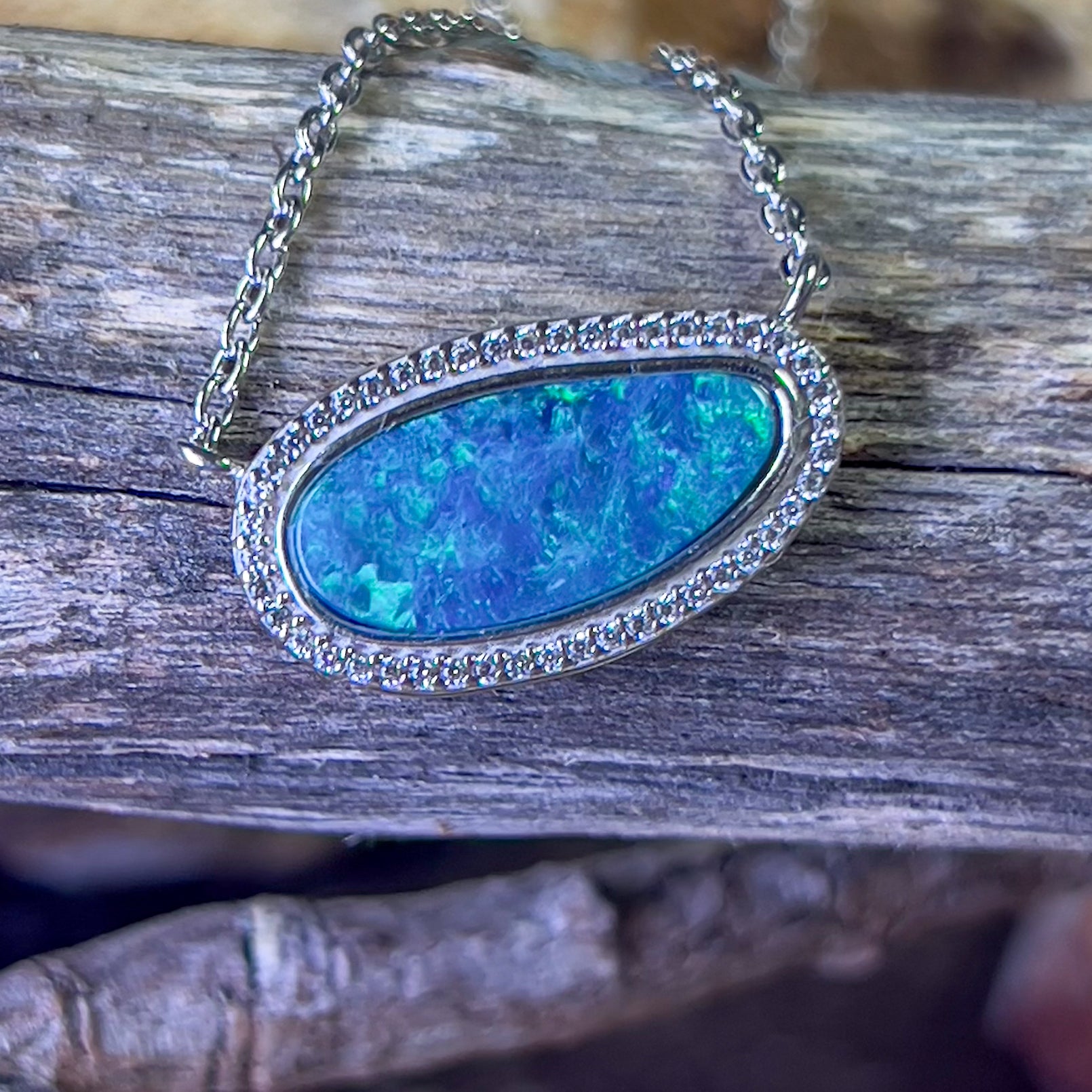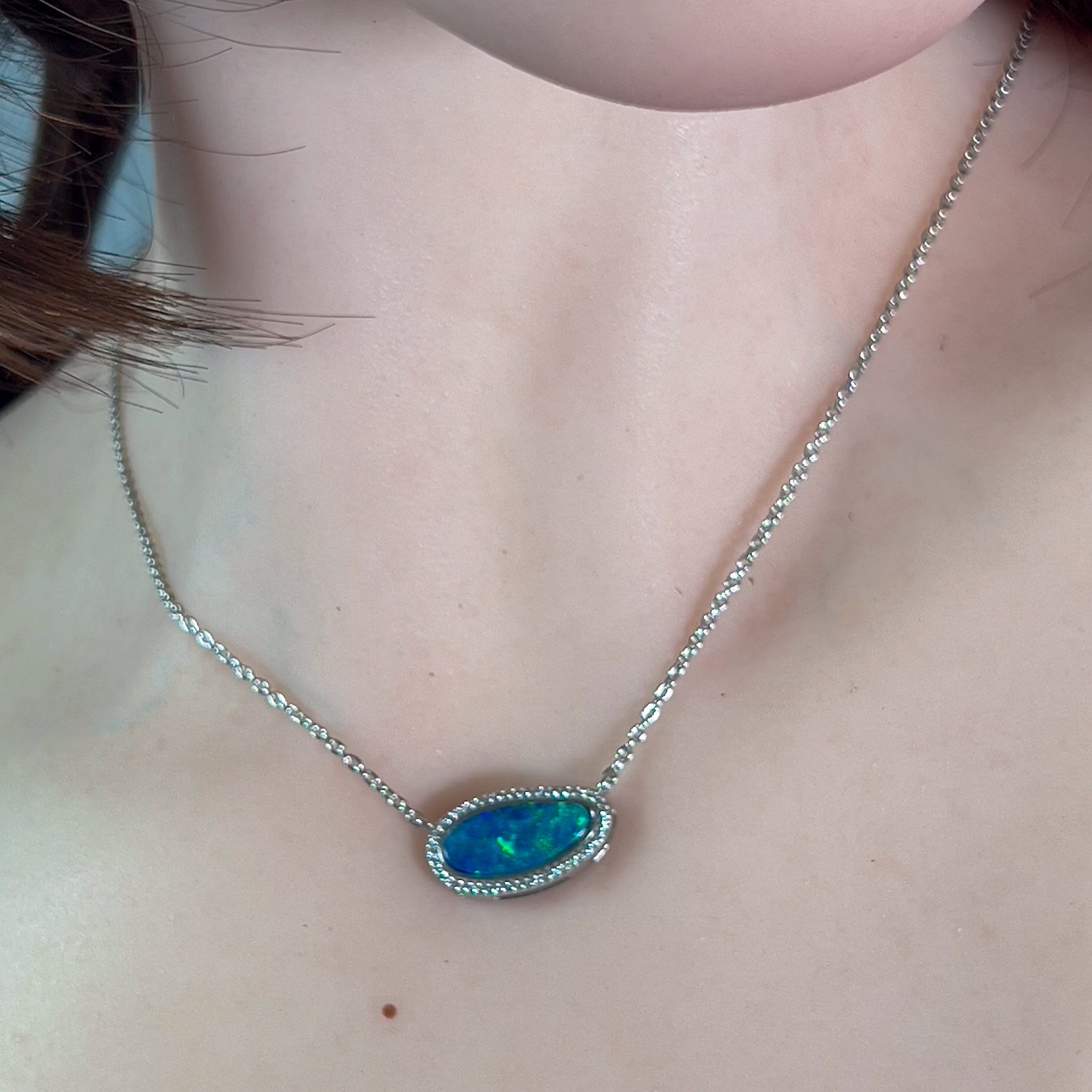 Sterling Silver Halo style Opal doublet necklace Blue Green