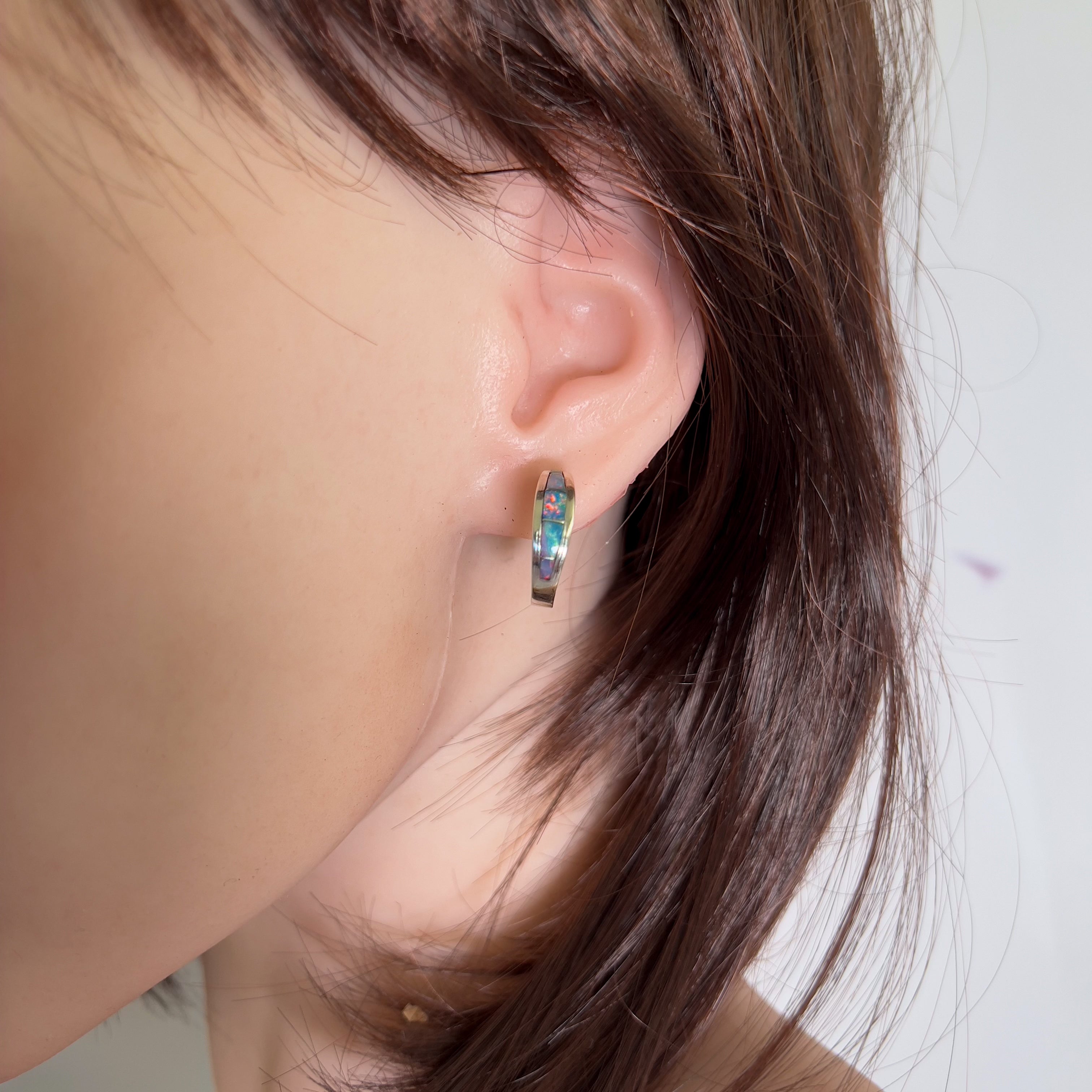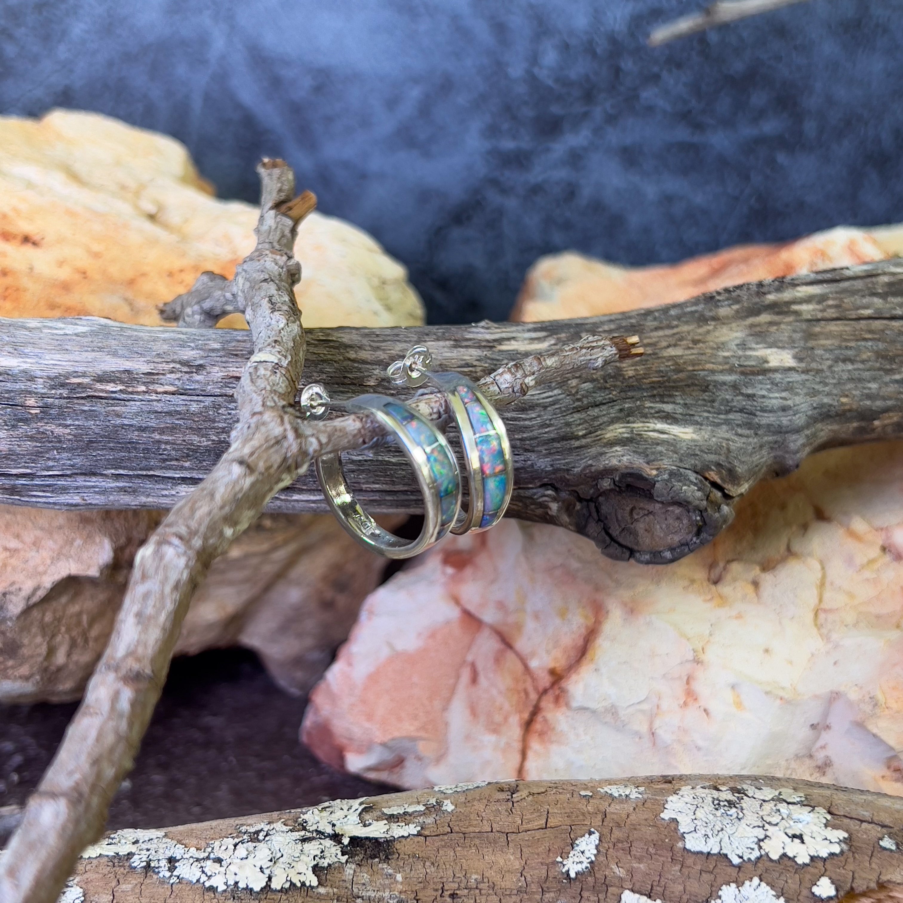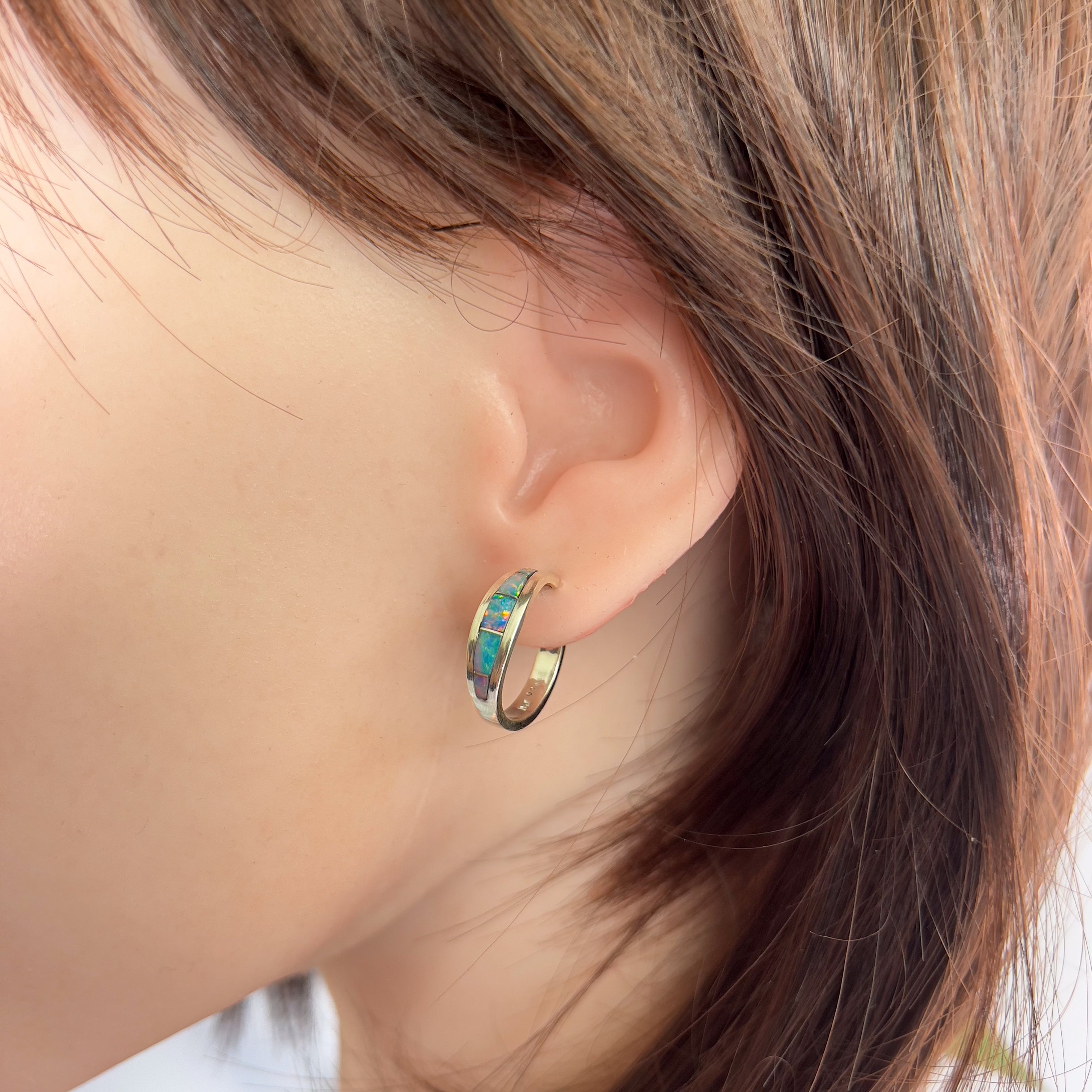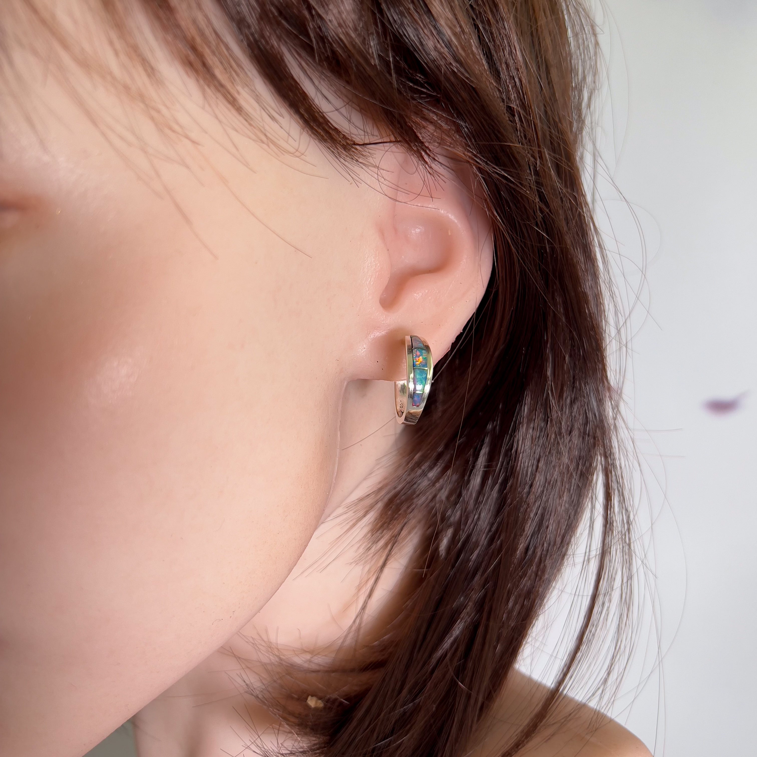 Add some sparkle and elegance to your look with our Sterling Silver Hoop style Opal inlay earrings. These hoop style studs feature shimmering opal inlays, making them the perfect accessory for any occasion. Upgrade your style game with this must-have jewelry piece.