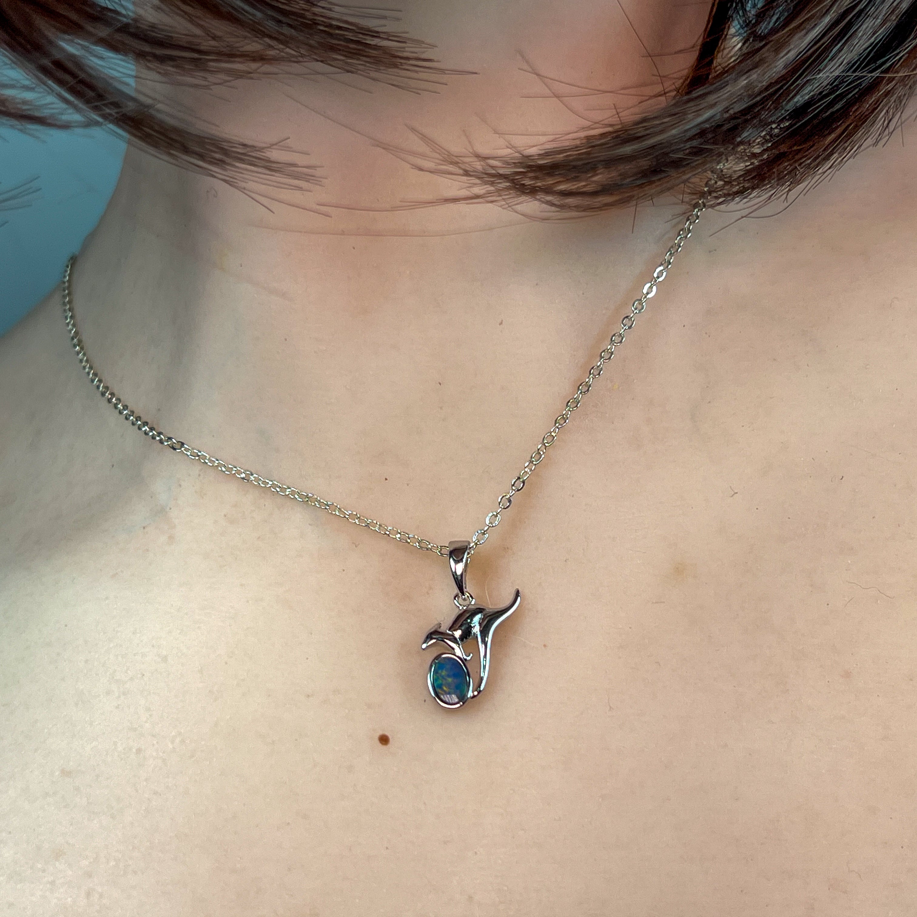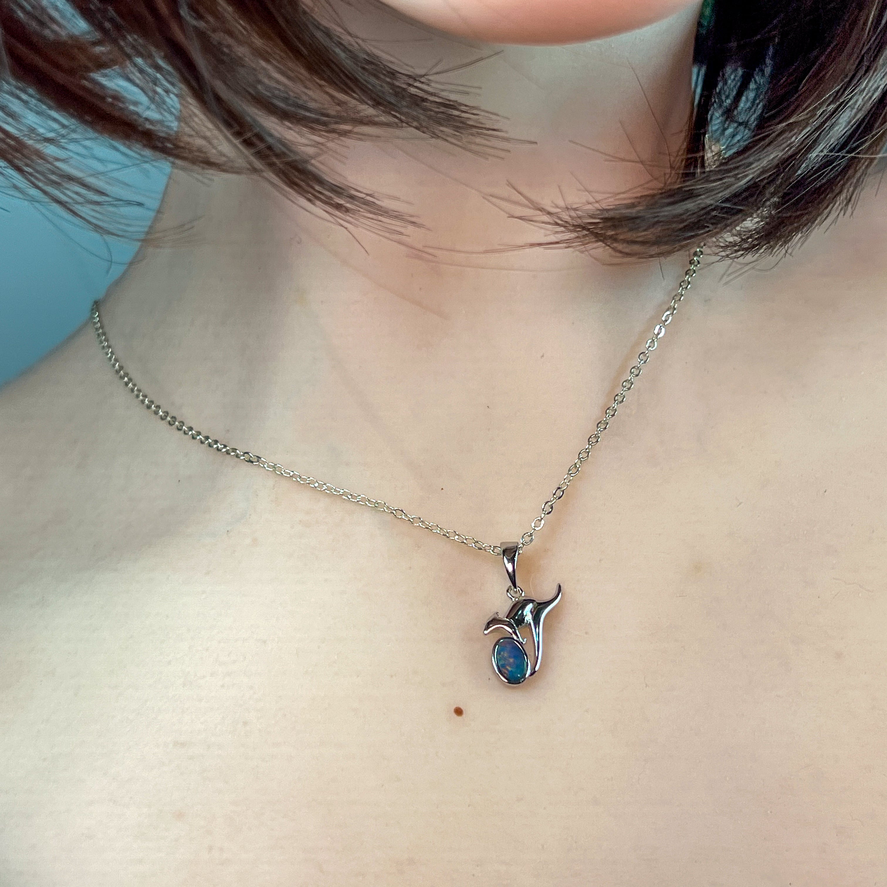 Hop into elegance with this striking Sterling Silver Kangaroo pendant, featuring a captivating 6x4mm oval opal doublet. Perfect for Australian wildlife lovers and opal enthusiasts alike, this piece celebrates the iconic kangaroo with sophisticated charm. The shimmering opal doublet catches light beautifully, creating mesmerising colour play with every movement. Crafted from quality sterling silver, it's durable enough for everyday wear yet refined enough for special occasions. A uniquely Australian treasure that makes a meaningful statement.