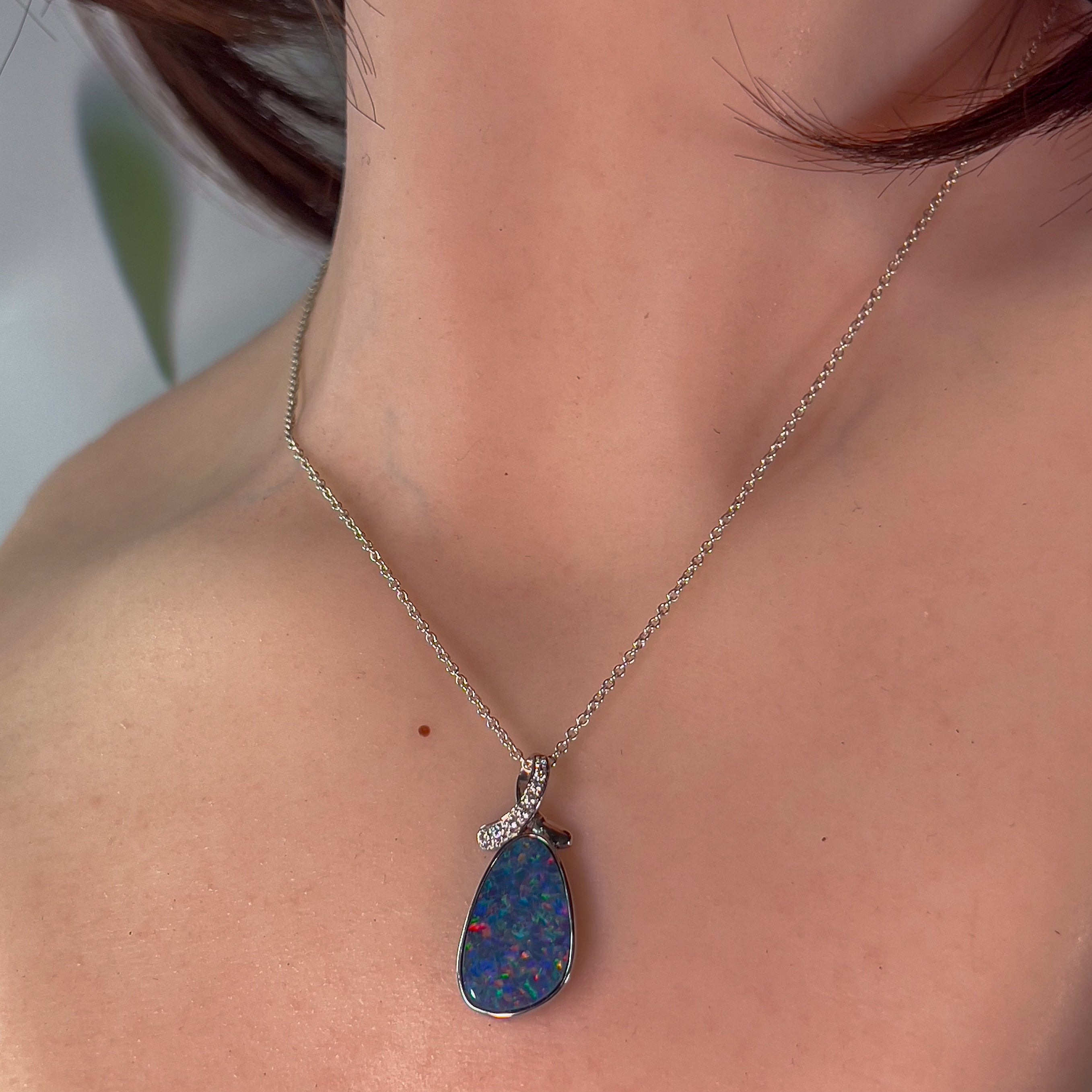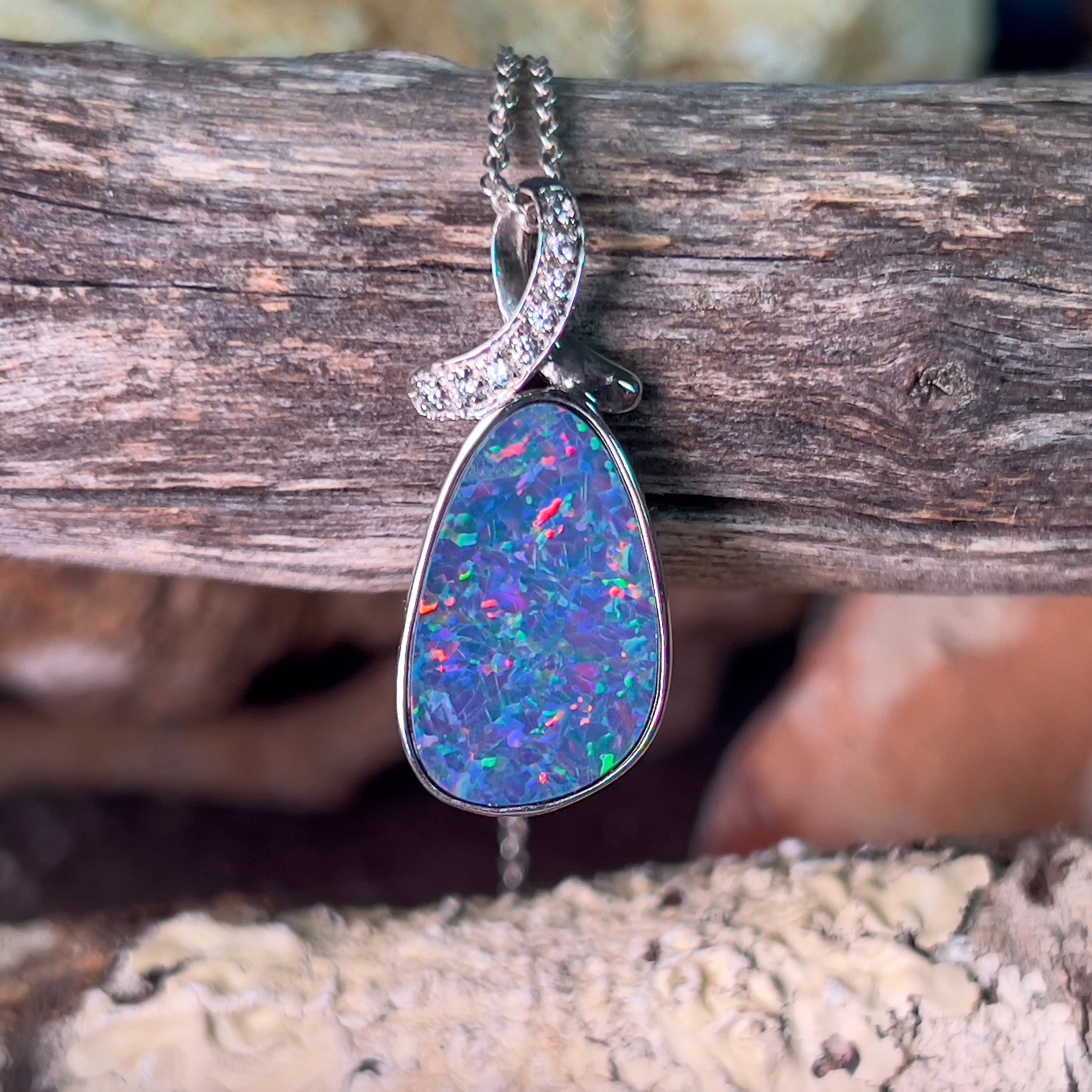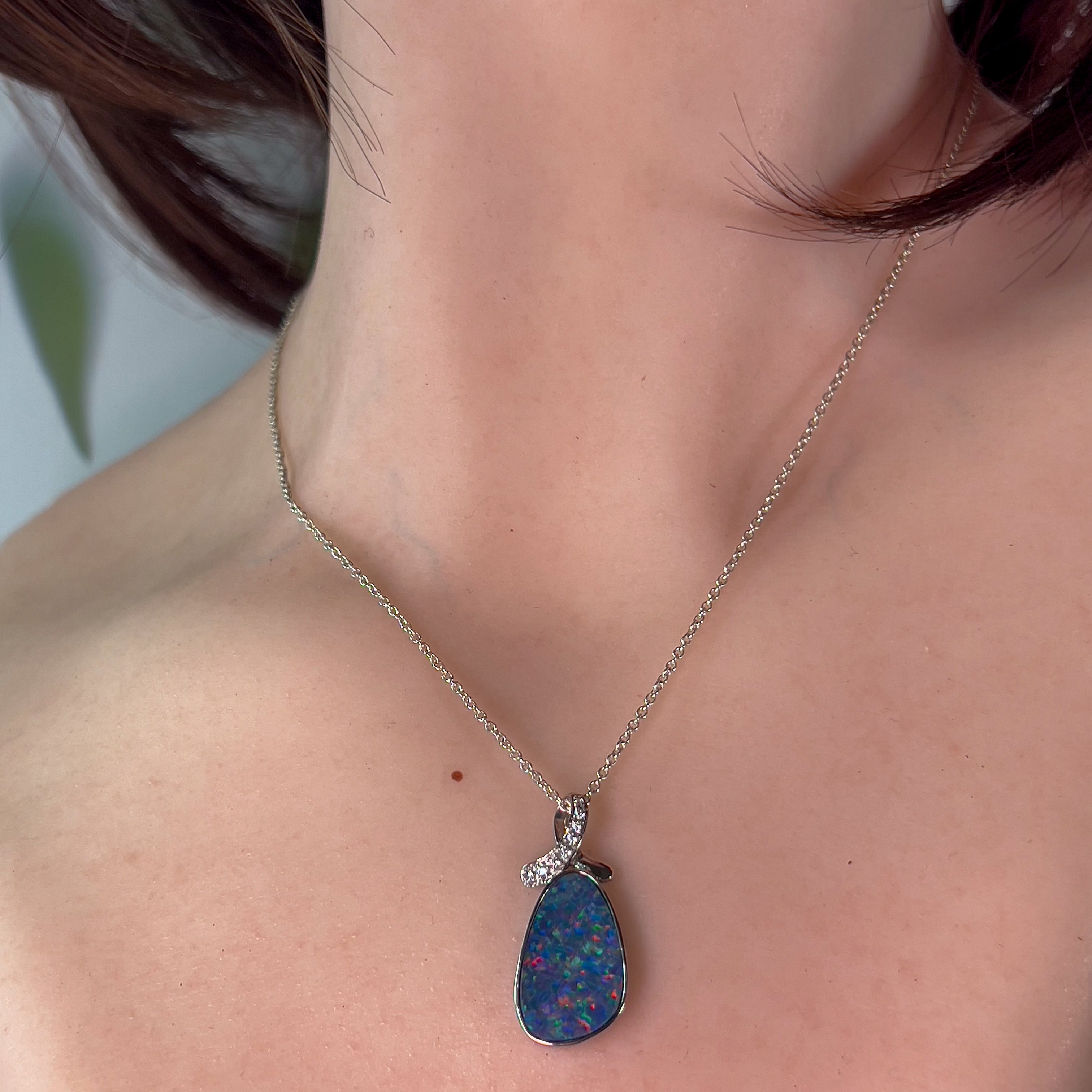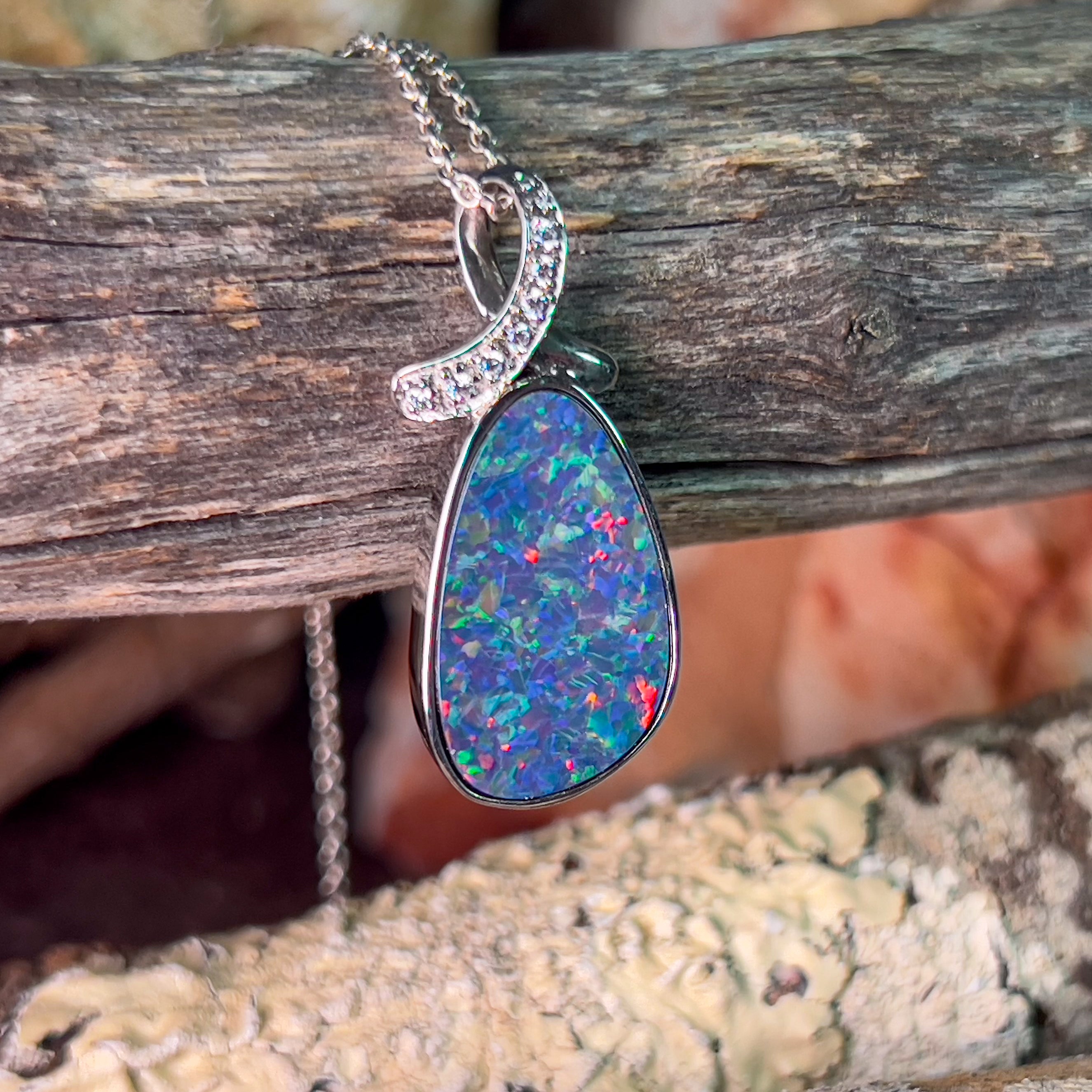 Experience true elegance with our Sterling Silver Opal doublet 4.28ct large drop style pendant! This stunning piece sparkles with a mesmerizing iridescence, adding a touch of luxury and sophistication to any outfit. Elevate your style with this must-have accessory.