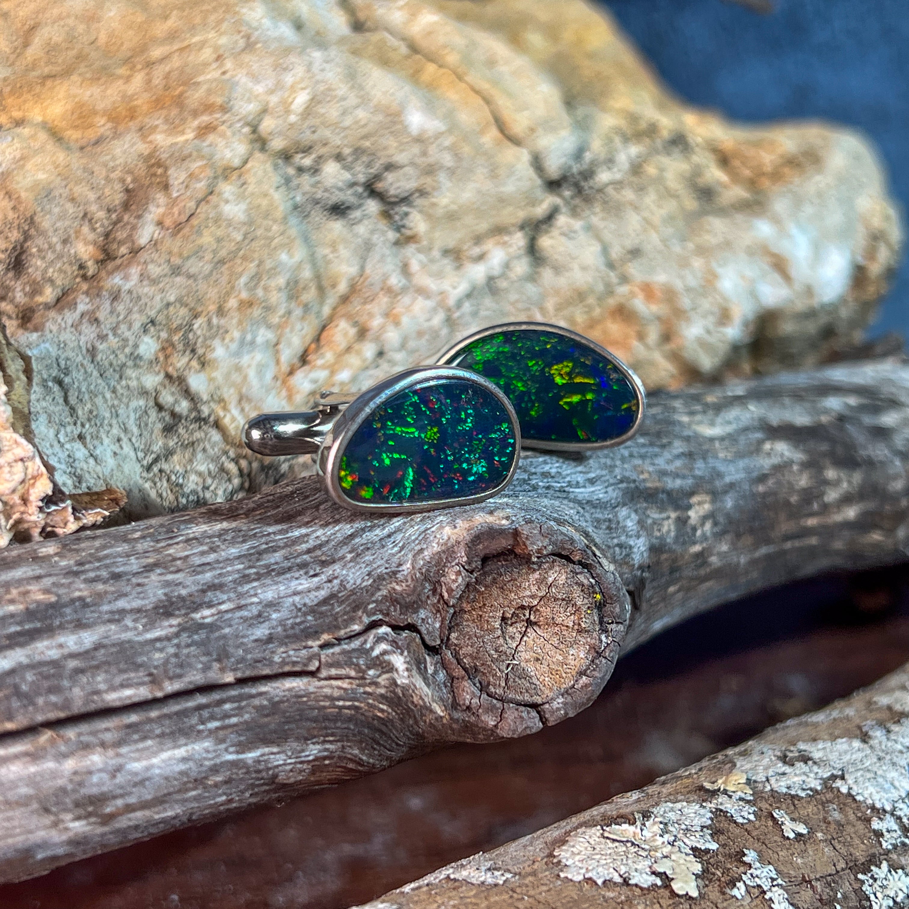 Make a bold statement with these Sterling Silver Opal Doublet Green Red cufflinks. Featuring a unique freeform design, these cufflinks are the perfect touch of color and sophistication to any outfit. The bezel set adds durability and a sleek look. Elevate your style and make a lasting impression with these cufflinks!