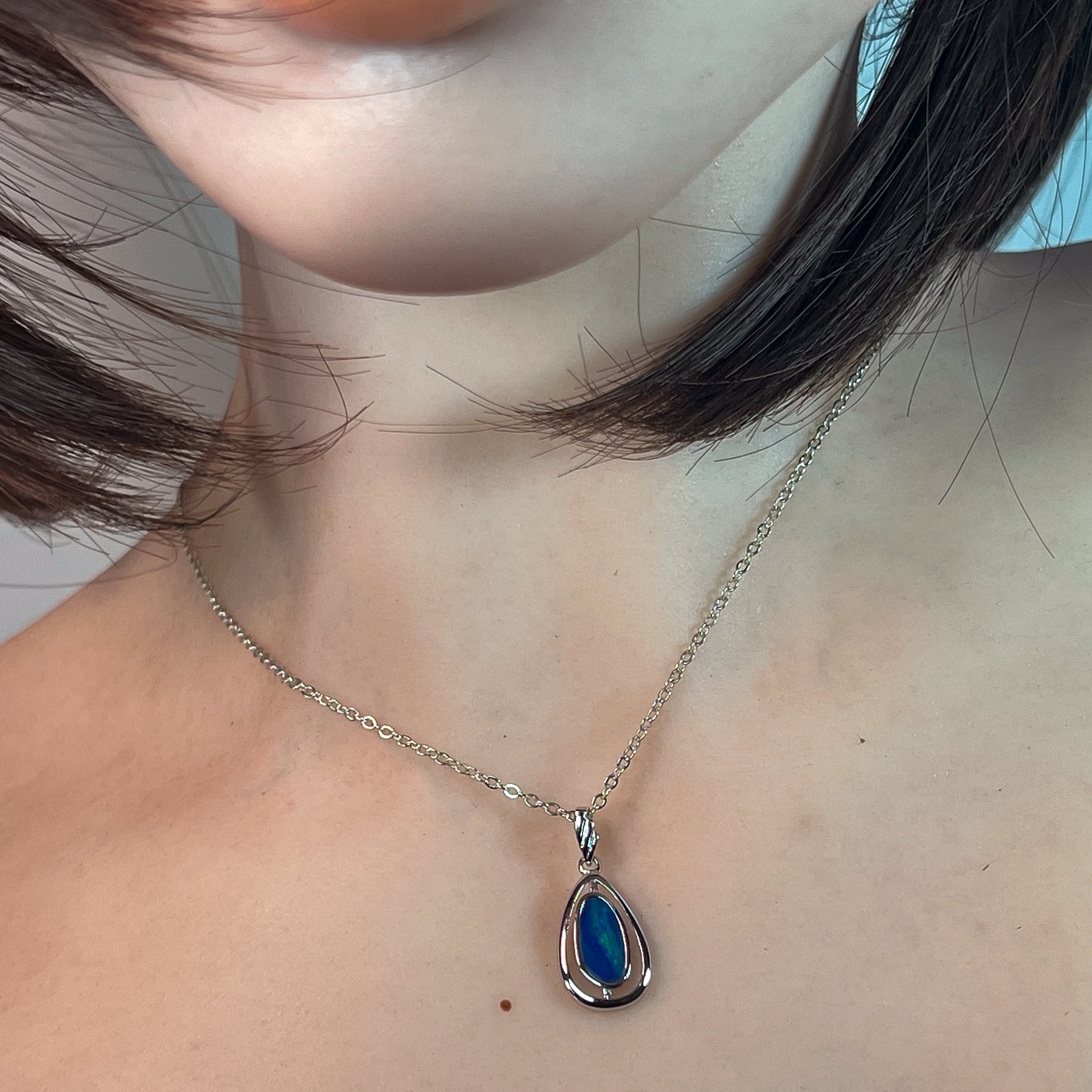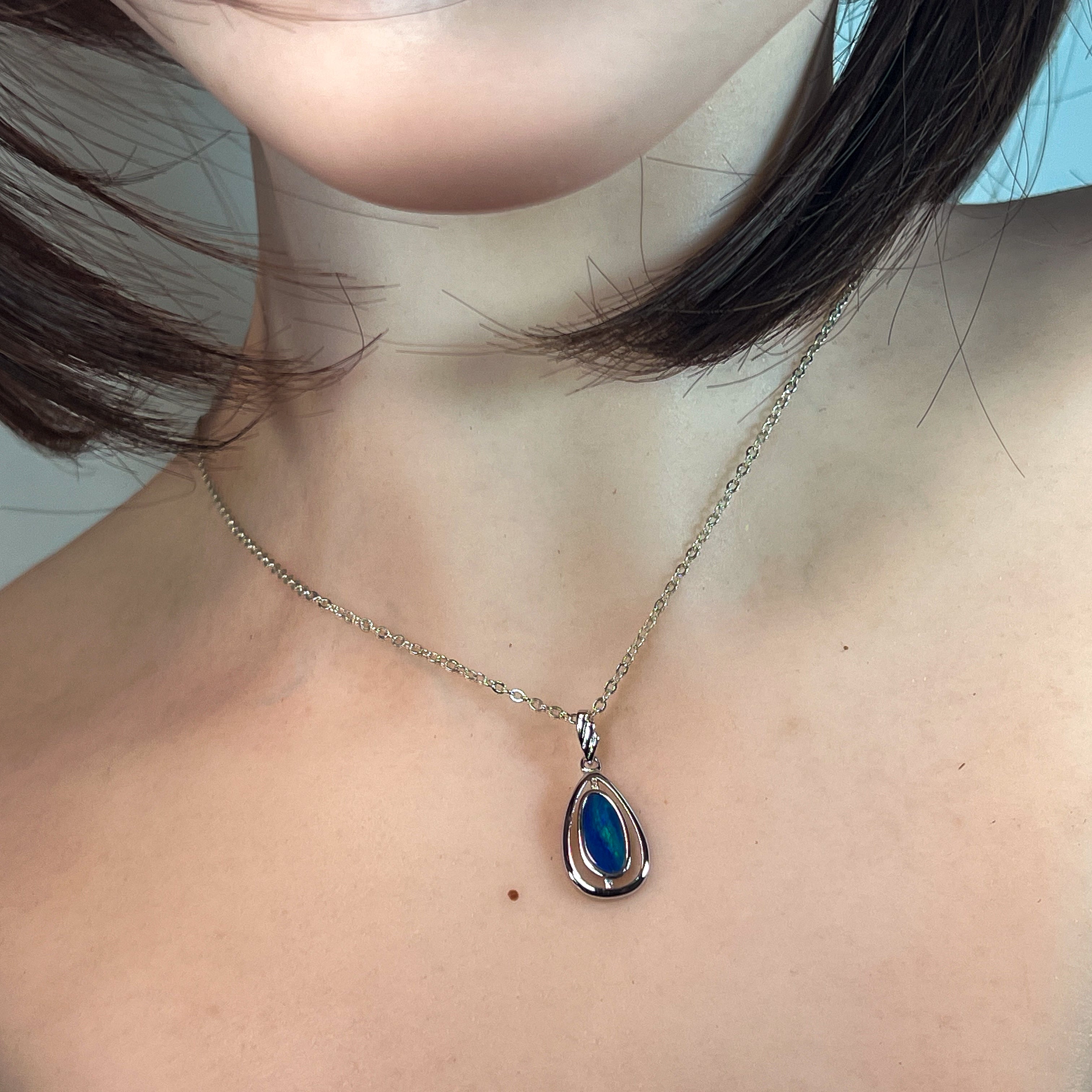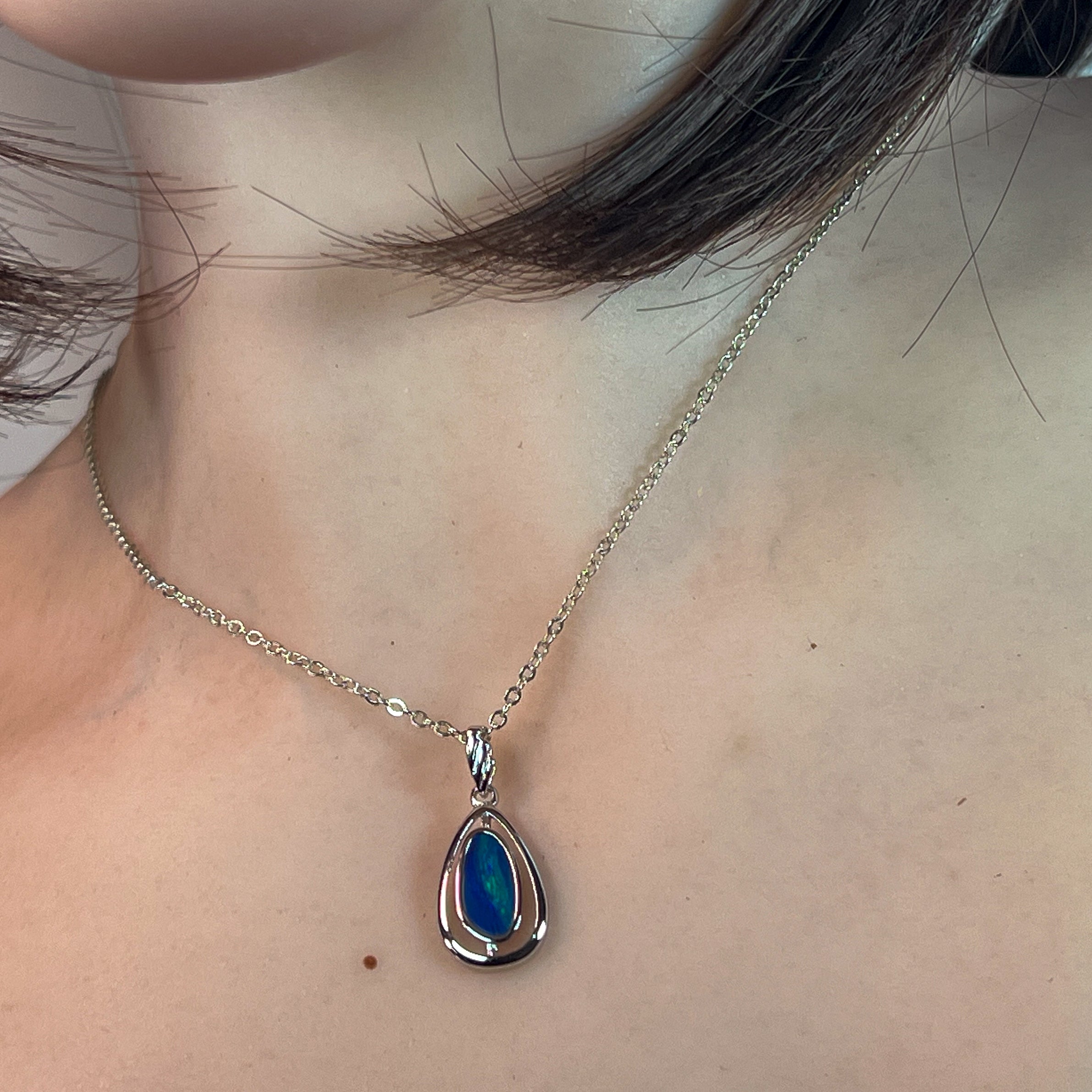 Elevate your style with this sterling silver pendant featuring a pear-shaped opal doublet in a striking teardrop cut-out design. Its modern silhouette enhances the opal’s vibrant hues, making it a captivating centerpiece. Perfect for adding a touch of sophistication and unique elegance to any outfit.