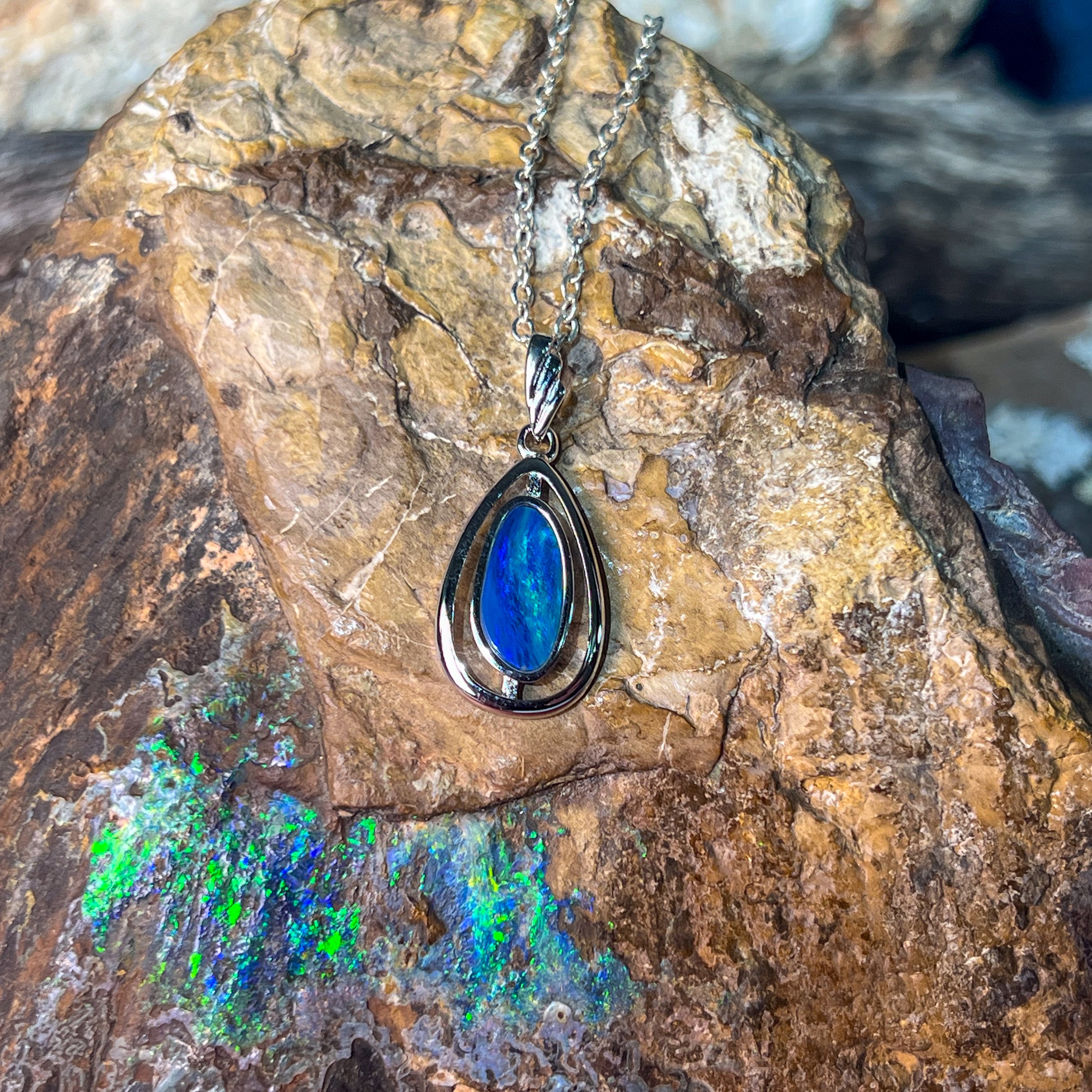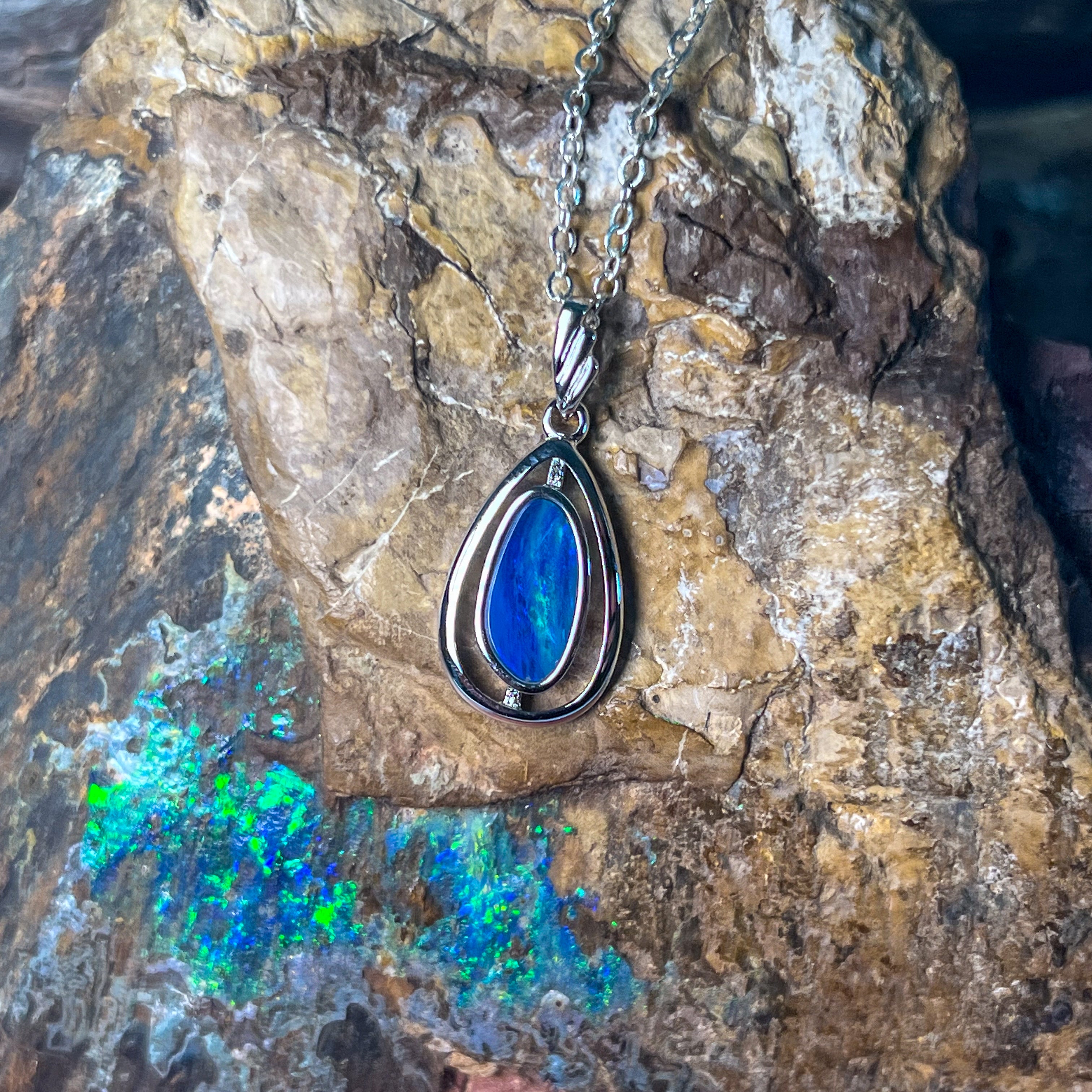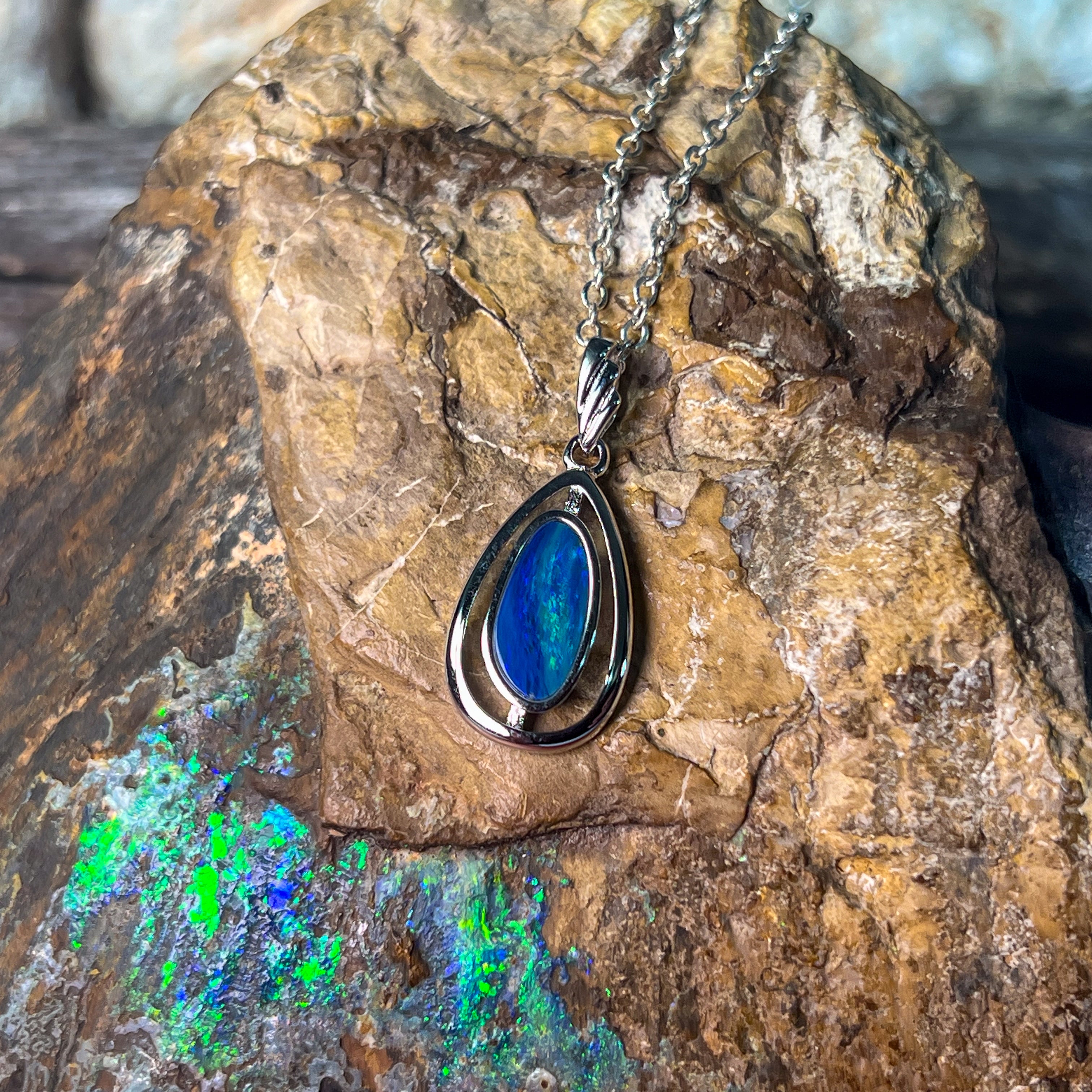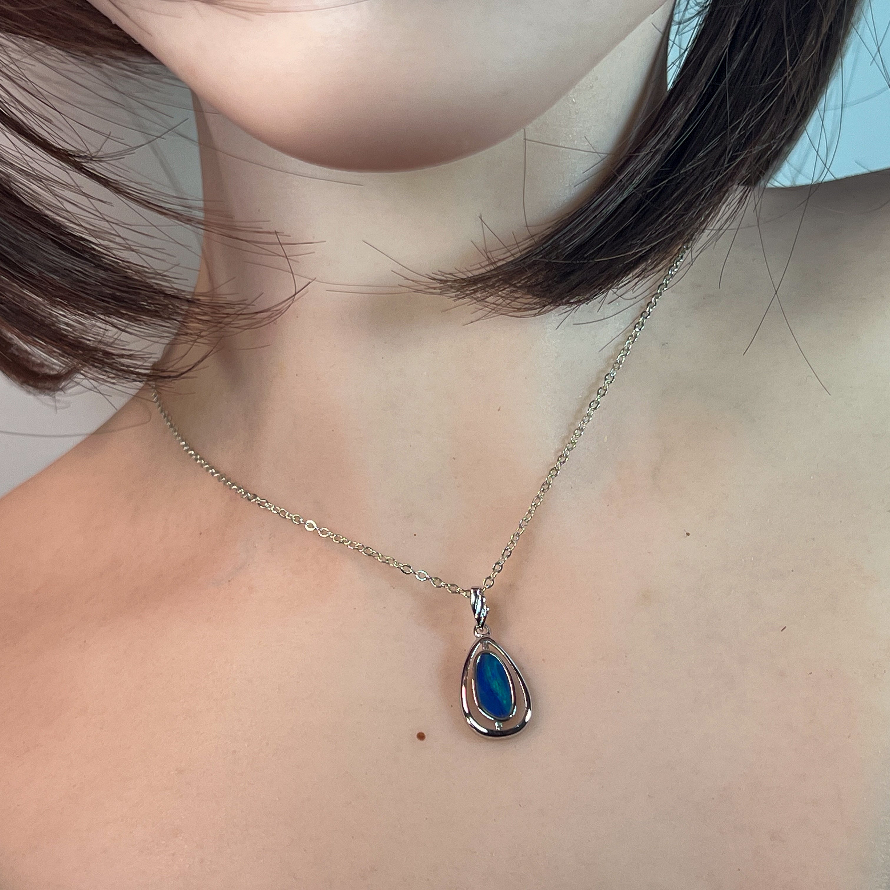 Elevate your style with this sterling silver pendant featuring a pear-shaped opal doublet in a striking teardrop cut-out design. Its modern silhouette enhances the opal’s vibrant hues, making it a captivating centerpiece. Perfect for adding a touch of sophistication and unique elegance to any outfit.