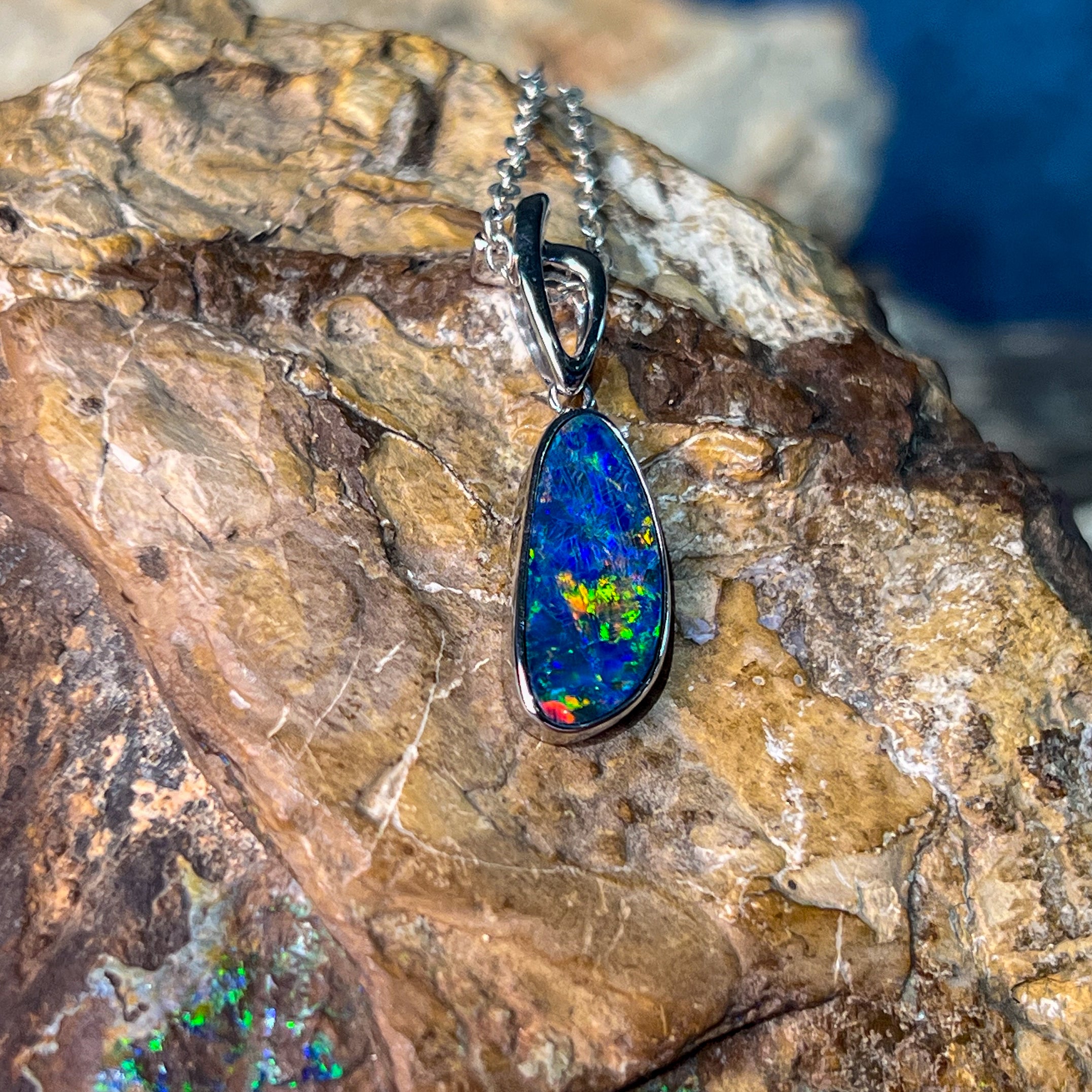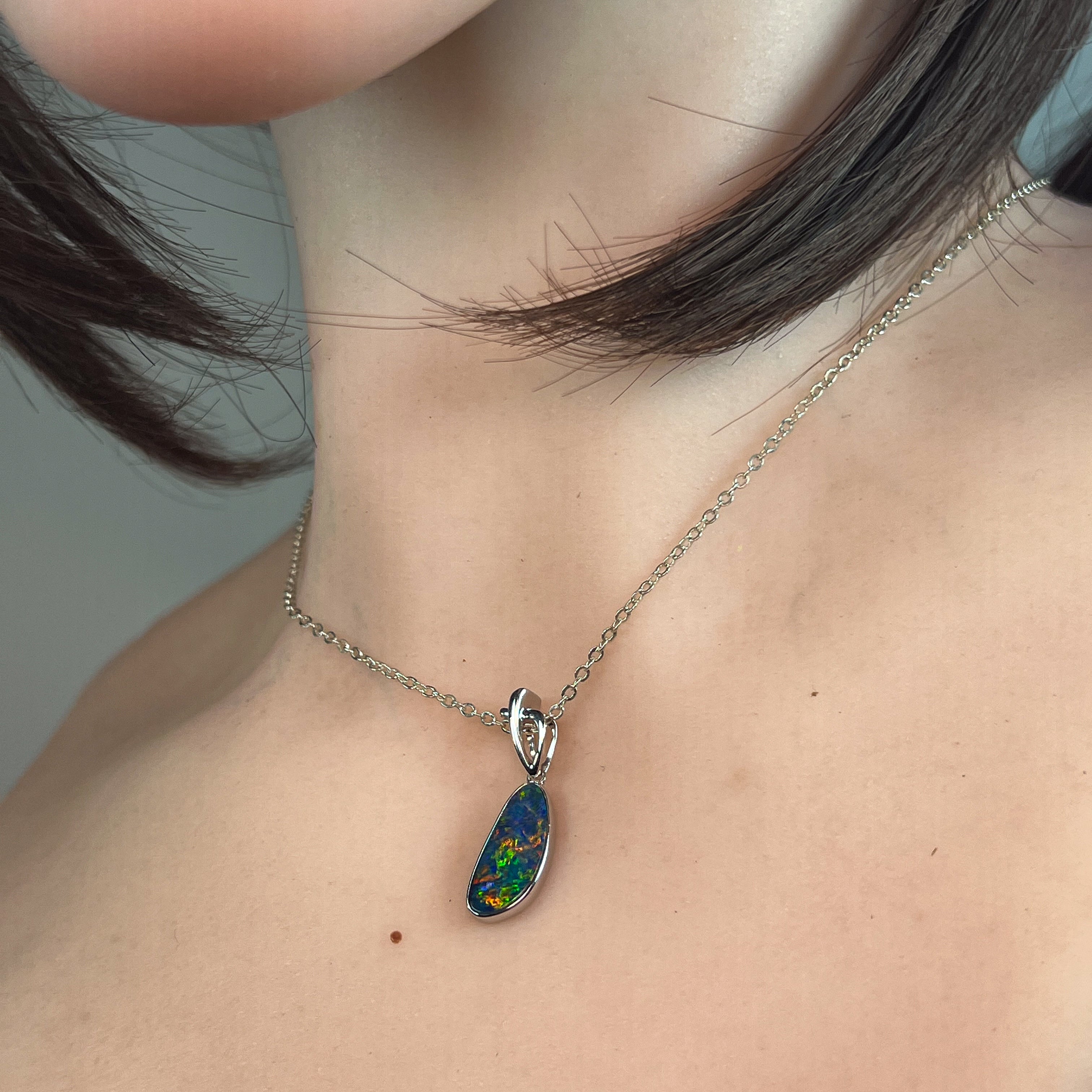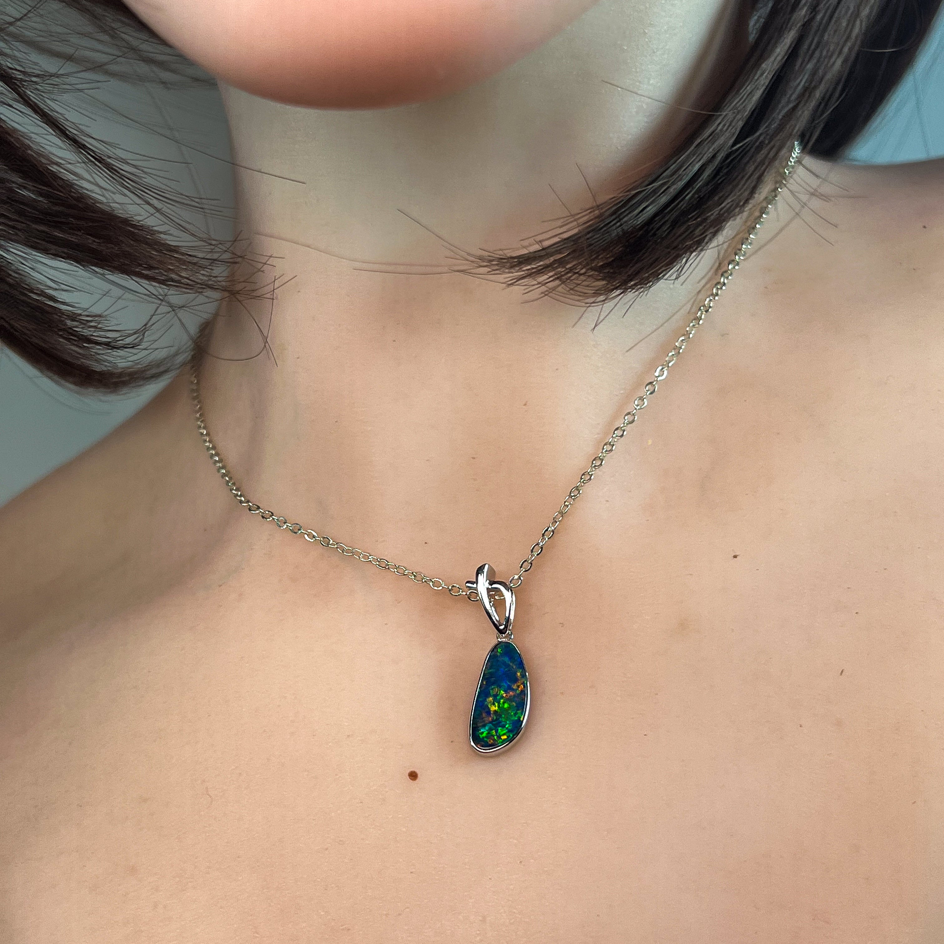 Elevate your style with this sterling silver pendant featuring a stunning freeform doublet opal in vibrant orange, yellow, blue, and green hues. Its unique design captures light beautifully, adding a splash of color to any outfit. Lightweight yet durable, this pendant offers a timeless look that complements both casual and formal wear, making it an essential piece for everyday elegance.