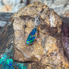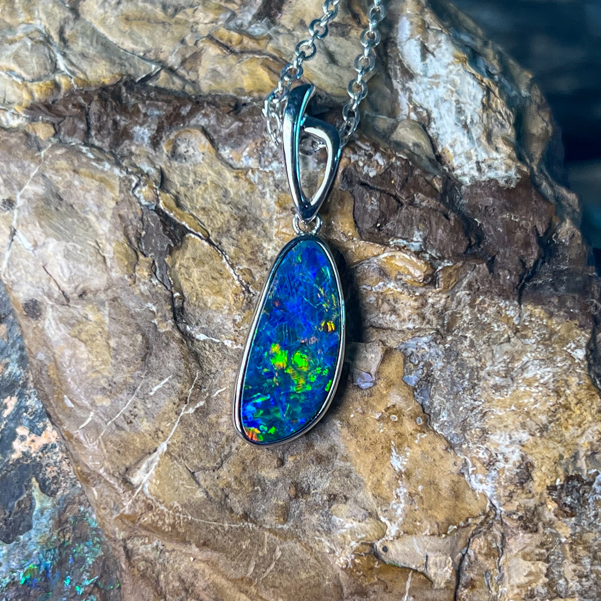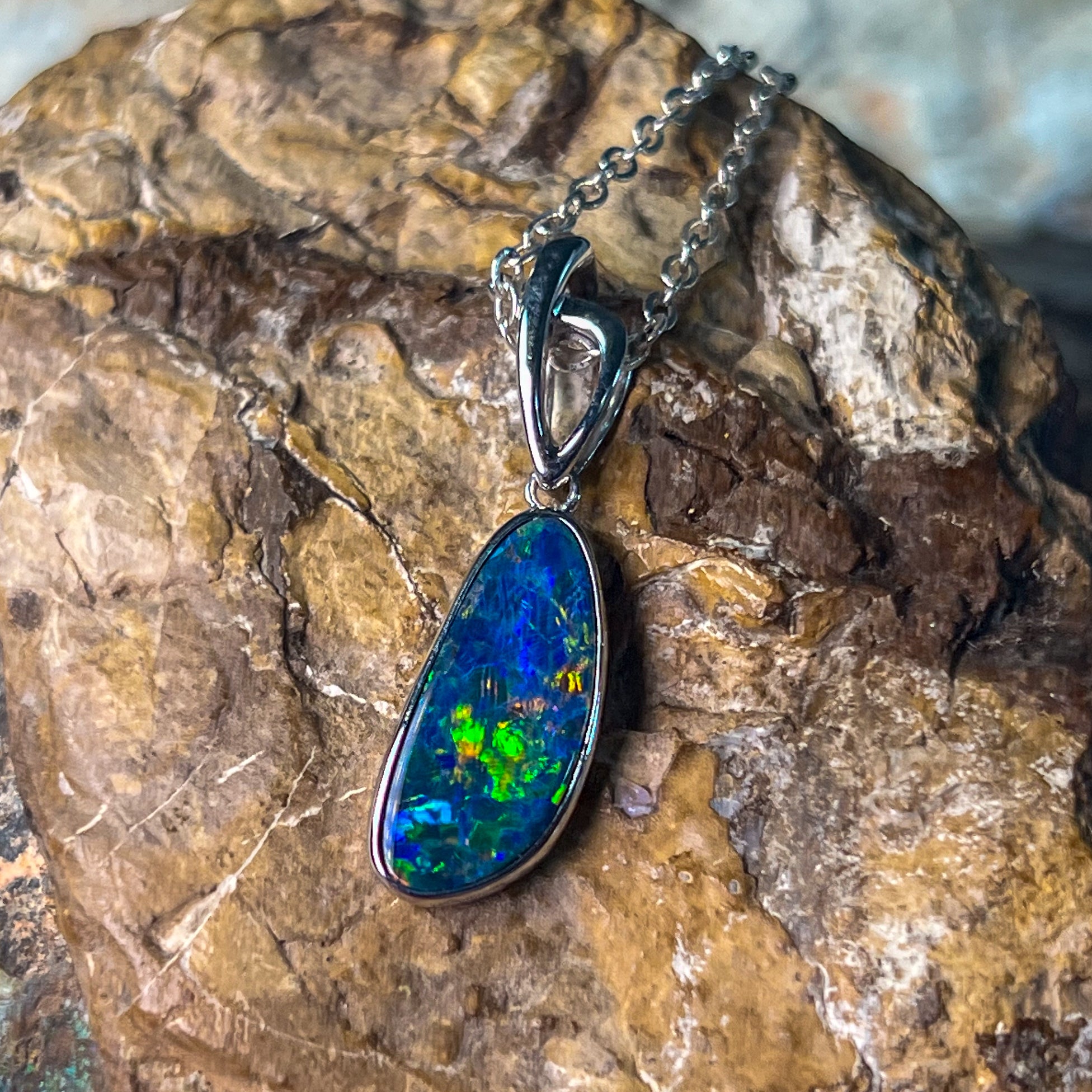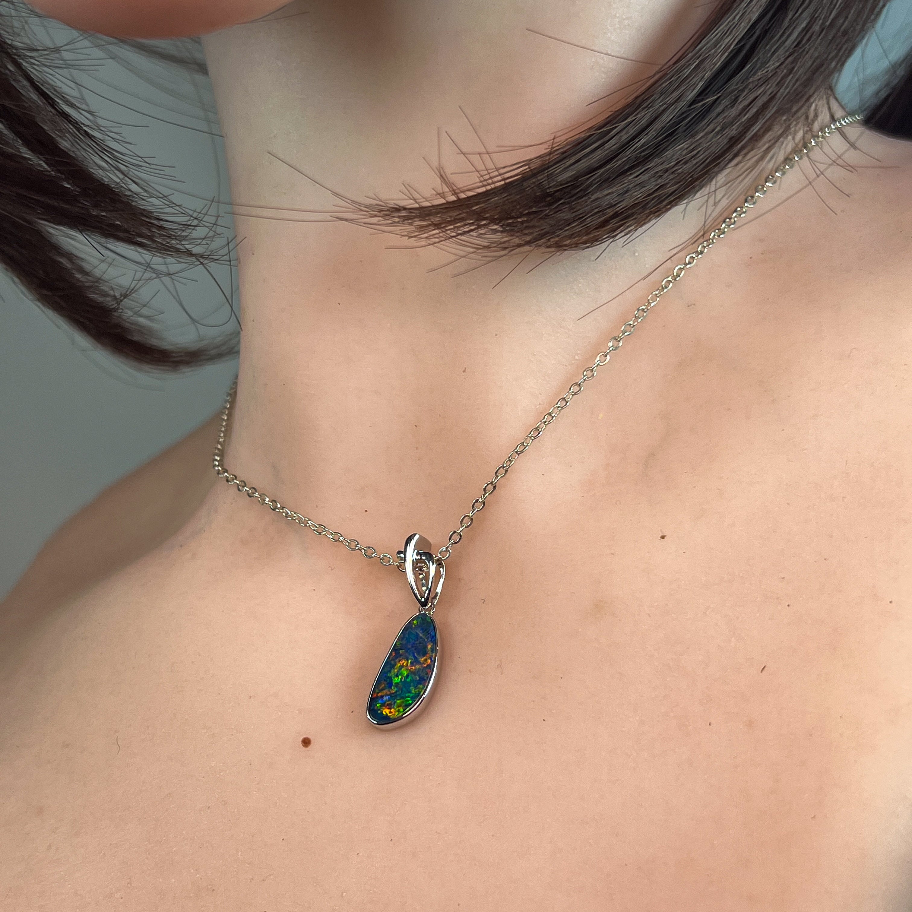 Elevate your style with this sterling silver pendant featuring a stunning freeform doublet opal in vibrant orange, yellow, blue, and green hues. Its unique design captures light beautifully, adding a splash of color to any outfit. Lightweight yet durable, this pendant offers a timeless look that complements both casual and formal wear, making it an essential piece for everyday elegance.