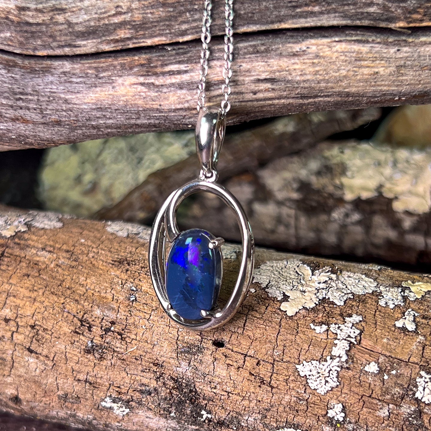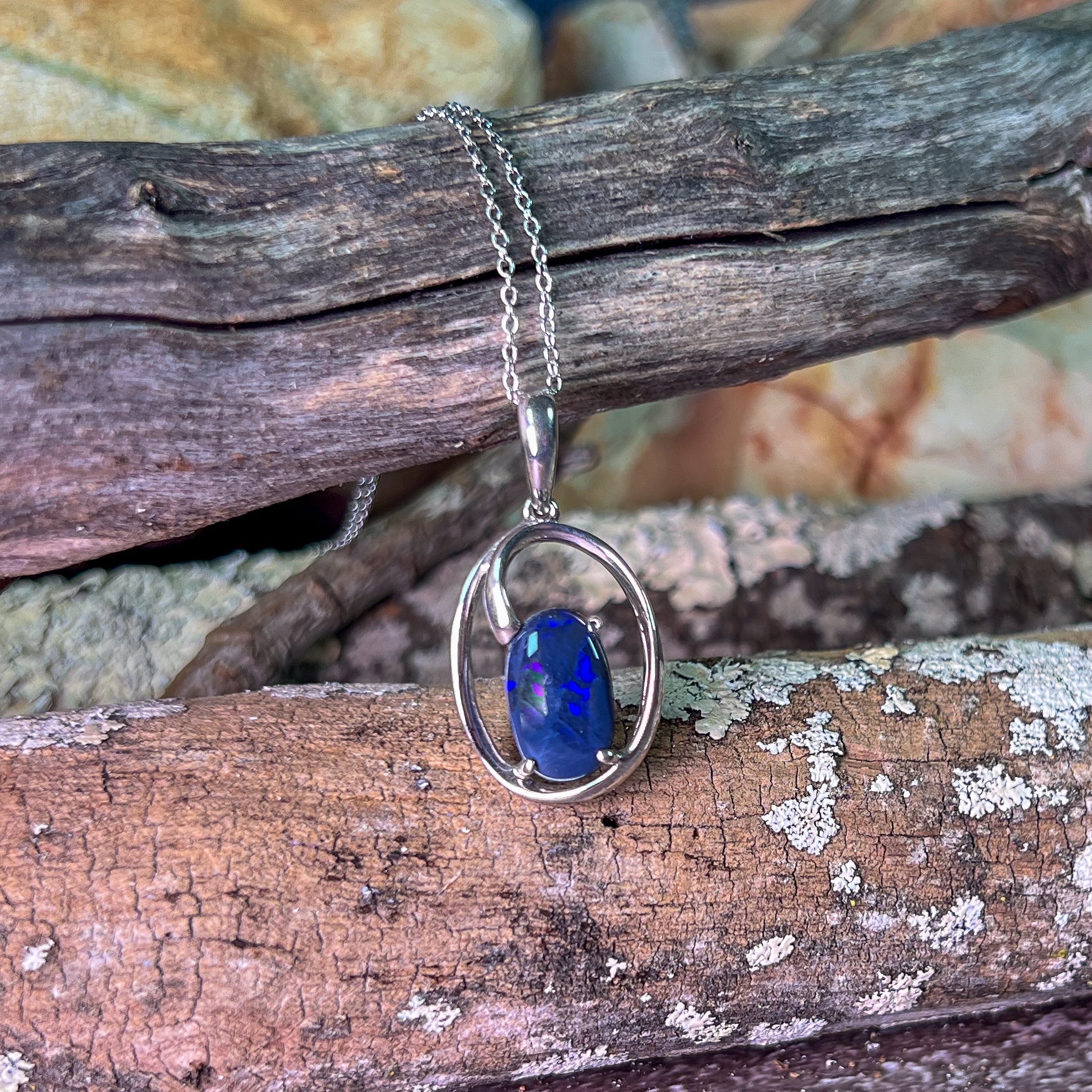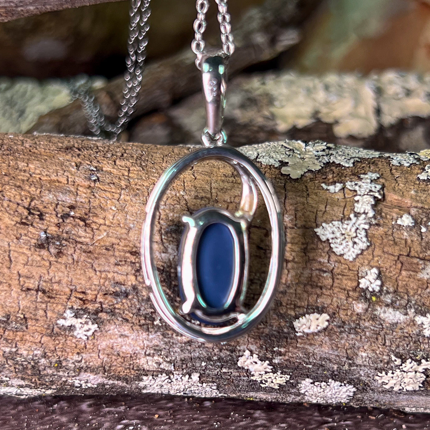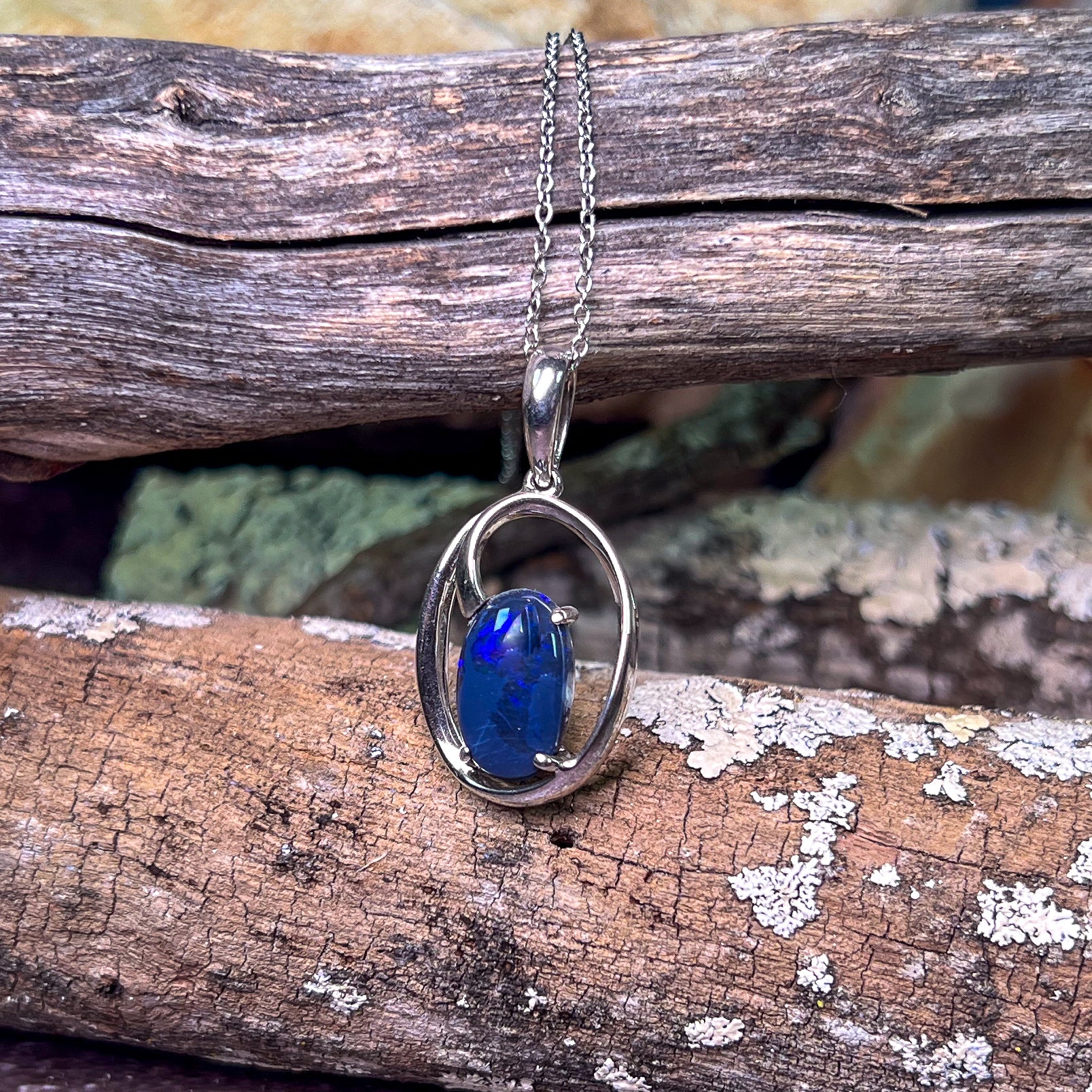 This Sterling Silver Oval Shape Black Opal pendant boasts a bold and sophisticated 15x8mm size, showcasing its exquisite Navy Blue hue. Expertly crafted and beautifully designed, this pendant offers both elegance and versatility, making it a must-have for any jewelry collection. Elevate your style with the stunning and timeless beauty of this opal pendant.