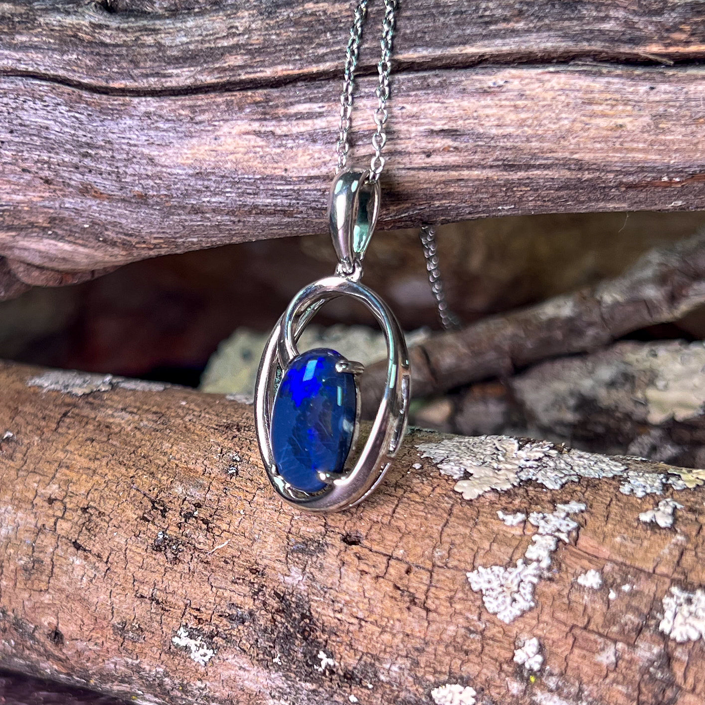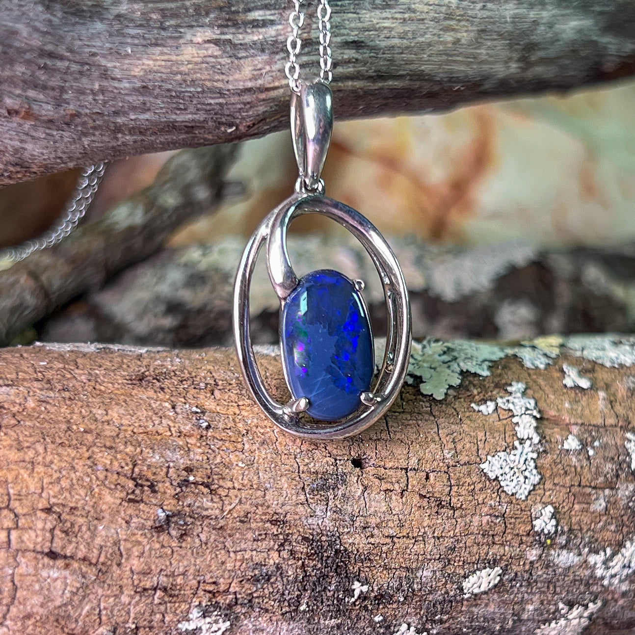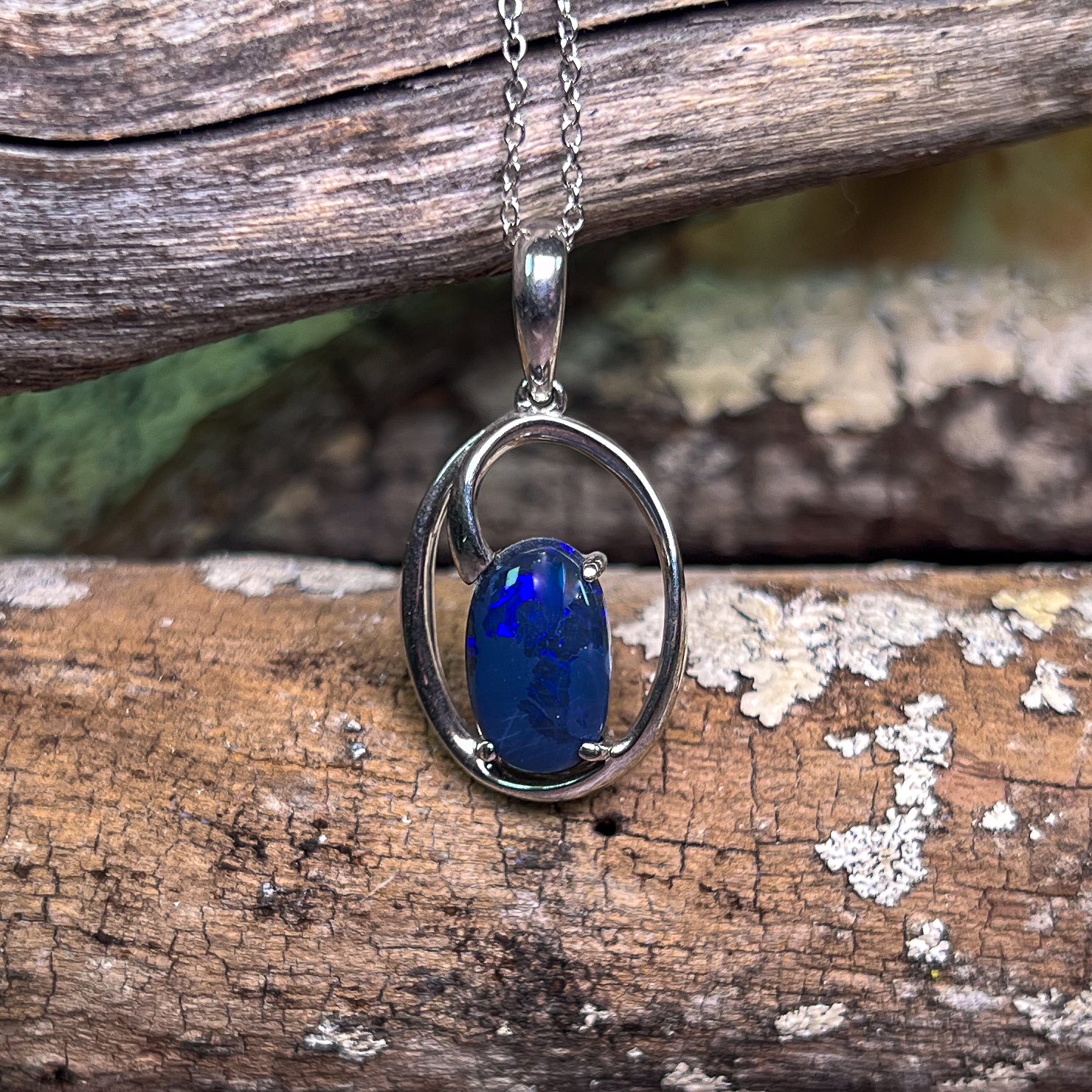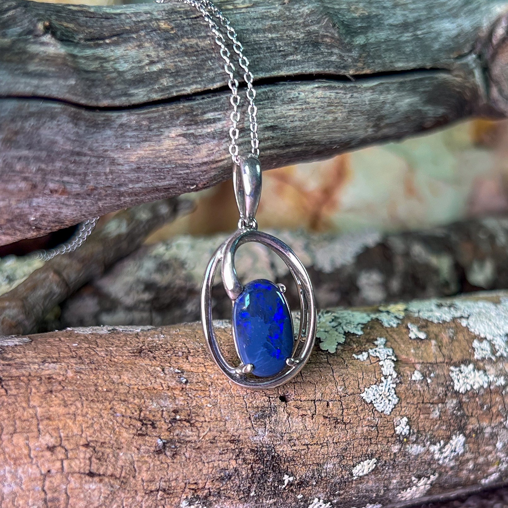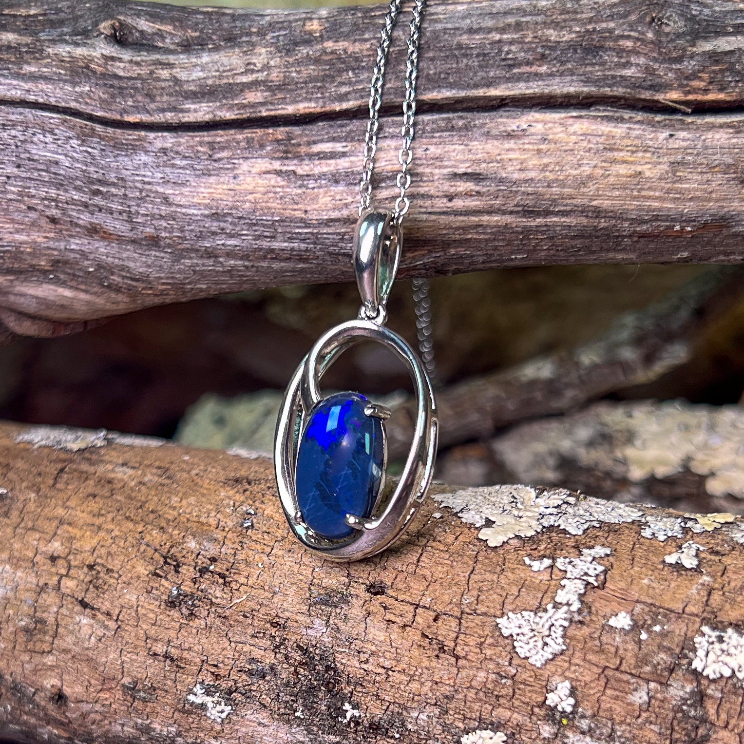 This Sterling Silver Oval Shape Black Opal pendant boasts a bold and sophisticated 15x8mm size, showcasing its exquisite Navy Blue hue. Expertly crafted and beautifully designed, this pendant offers both elegance and versatility, making it a must-have for any jewelry collection. Elevate your style with the stunning and timeless beauty of this opal pendant.