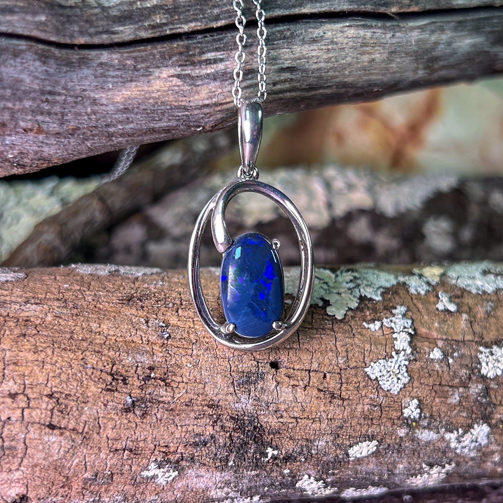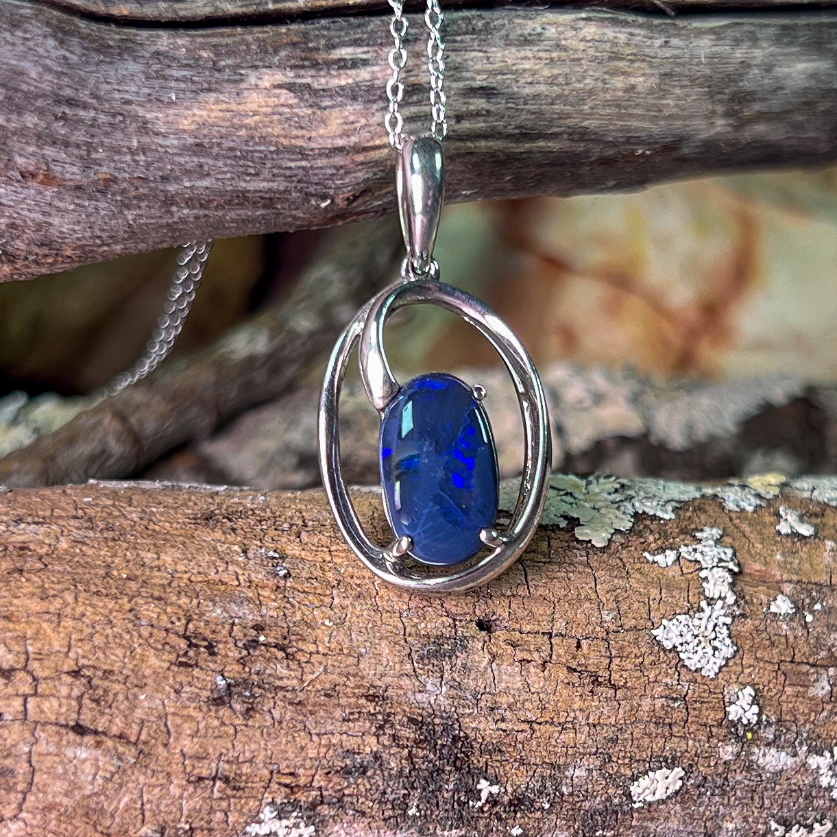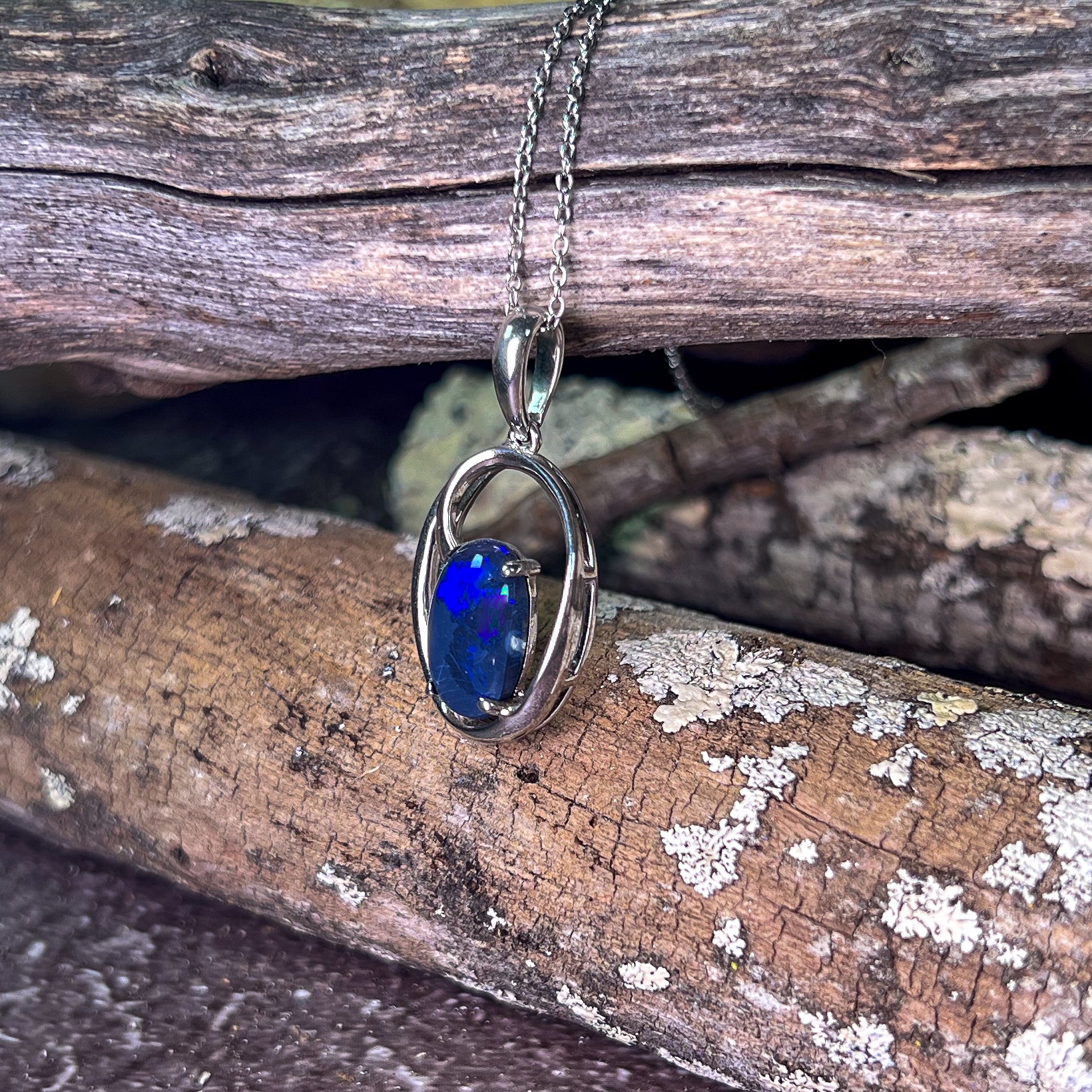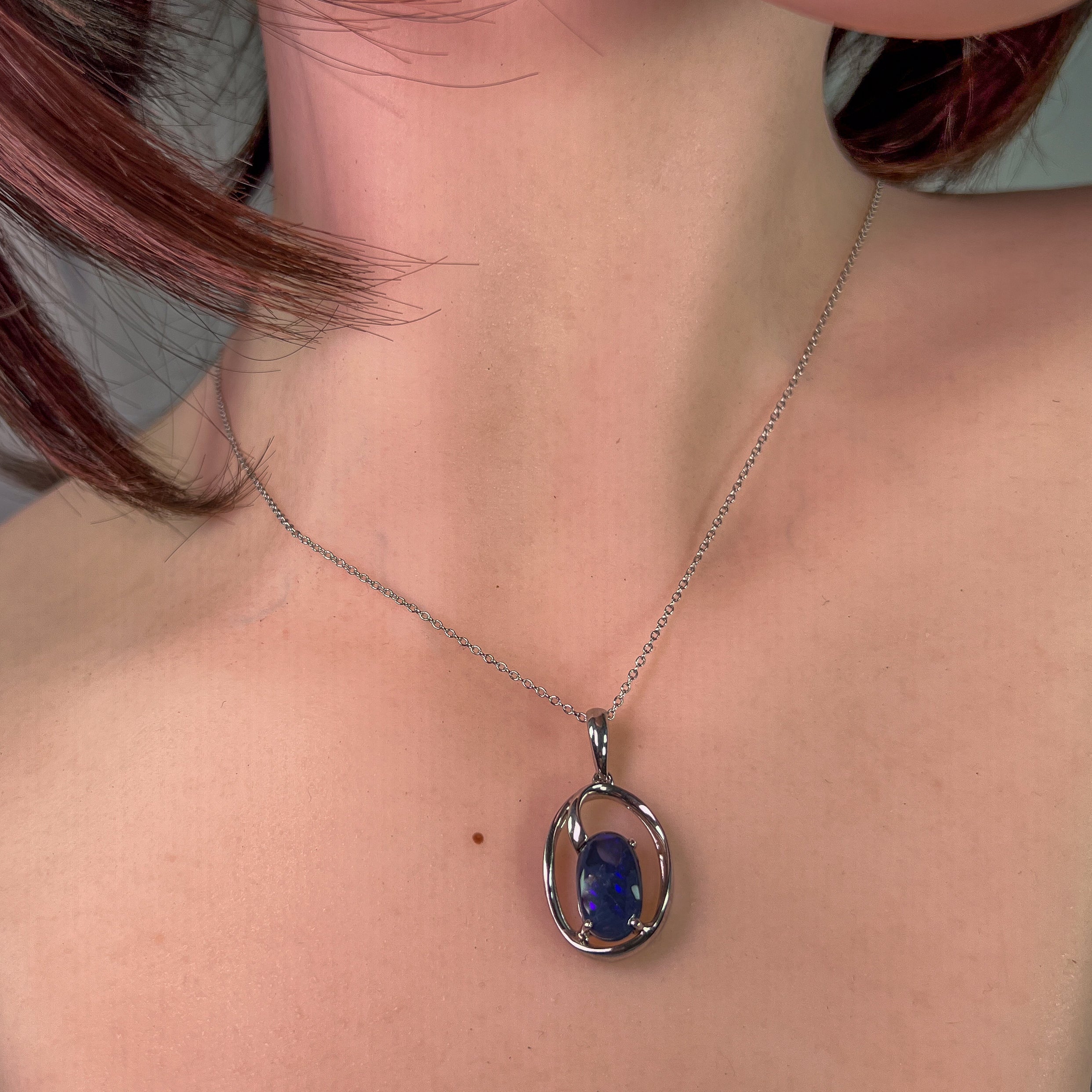 This Sterling Silver Oval Shape Black Opal pendant boasts a bold and sophisticated 15x8mm size, showcasing its exquisite Navy Blue hue. Expertly crafted and beautifully designed, this pendant offers both elegance and versatility, making it a must-have for any jewelry collection. Elevate your style with the stunning and timeless beauty of this opal pendant.