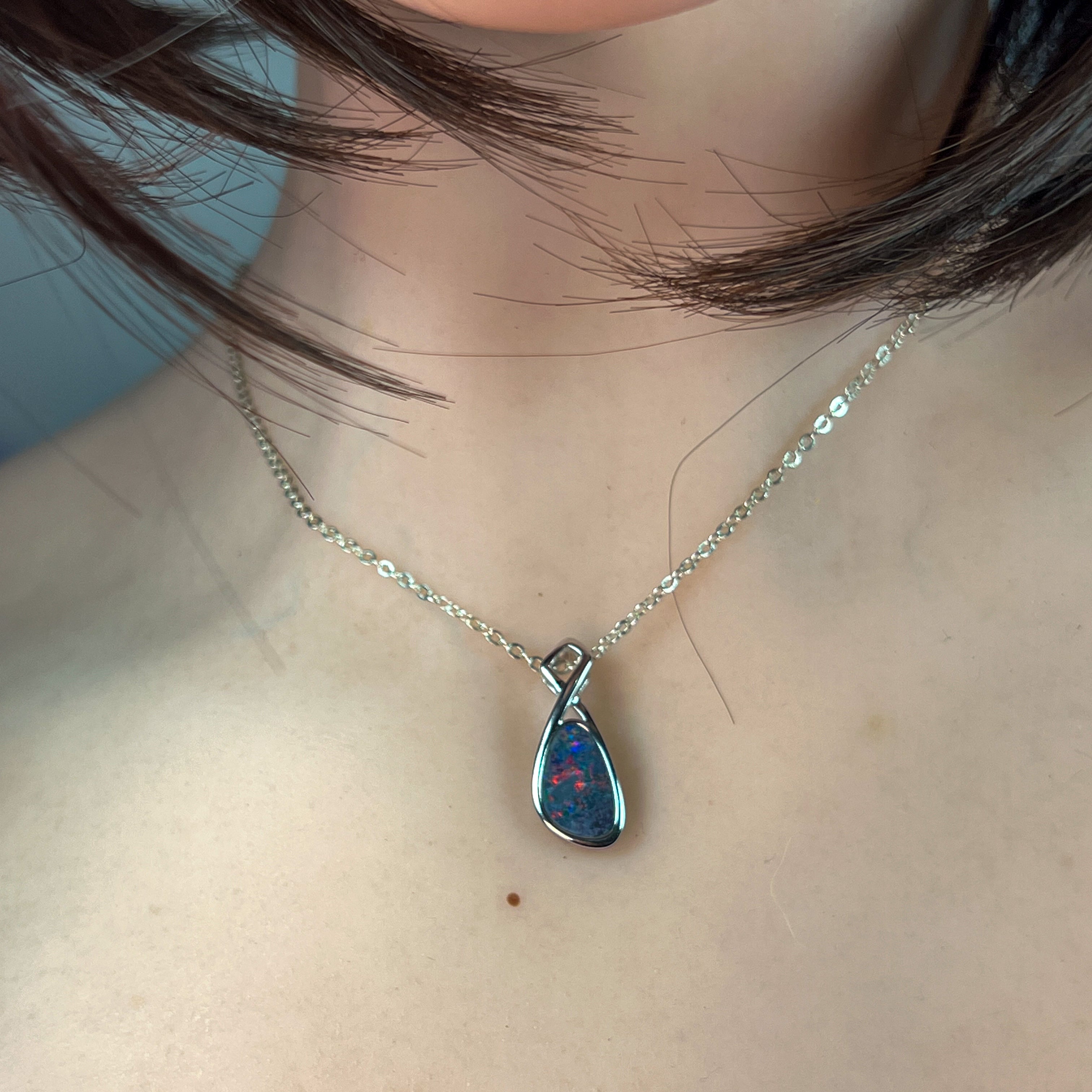 Captivate with the mesmerizing dance of colour in this sterling silver red flash opal doublet pendant. The vibrant red and orange hues burst through the stone's surface, creating a dynamic display that shifts with every movement. Crafted from genuine opal and expertly set in lustrous sterling silver, this piece combines natural beauty with timeless elegance. Perfect for those who appreciate bold, statement-making jewellery that celebrates the raw magic of Australian gemstones. A wearable work of art that transforms any outfit into something extraordinary.