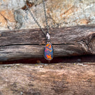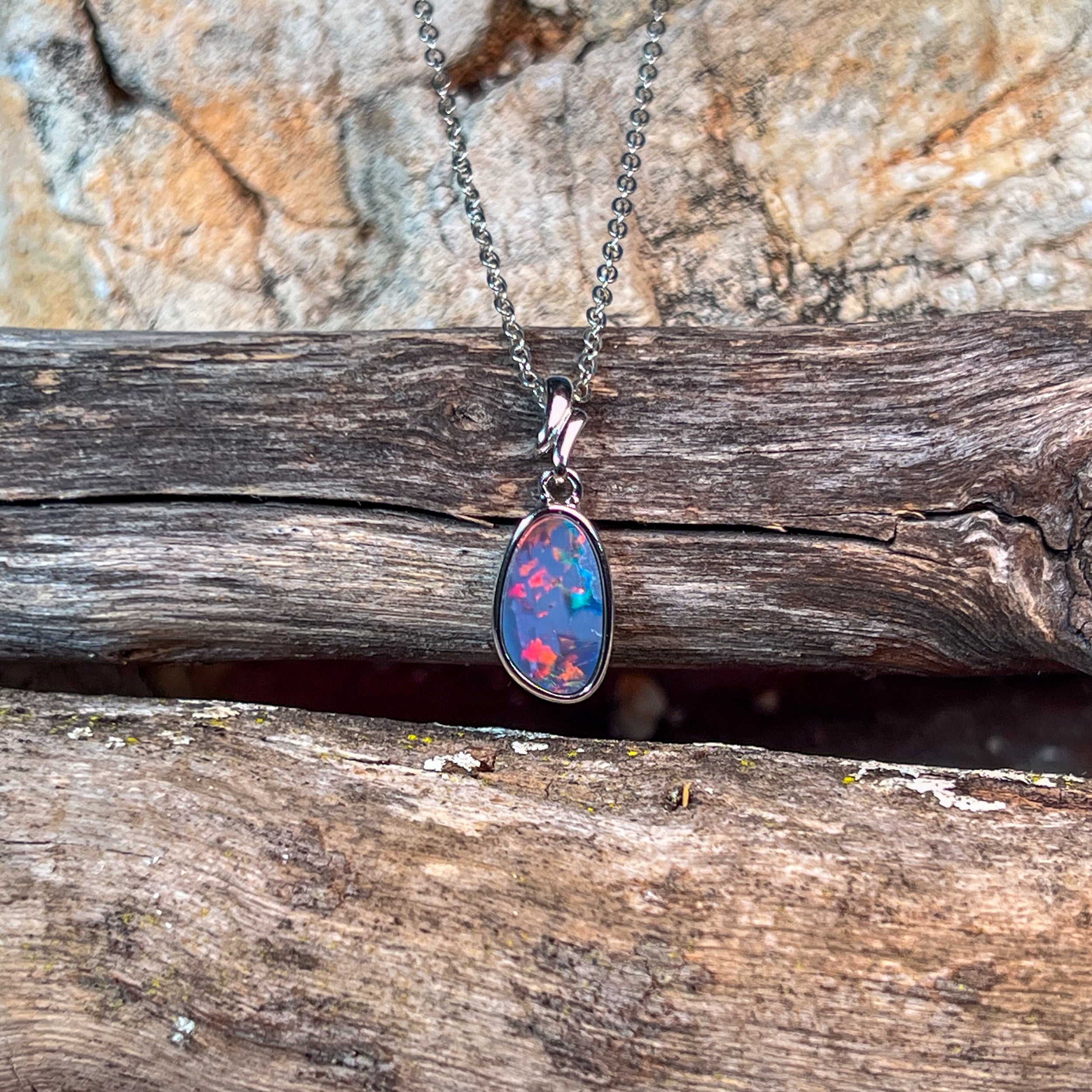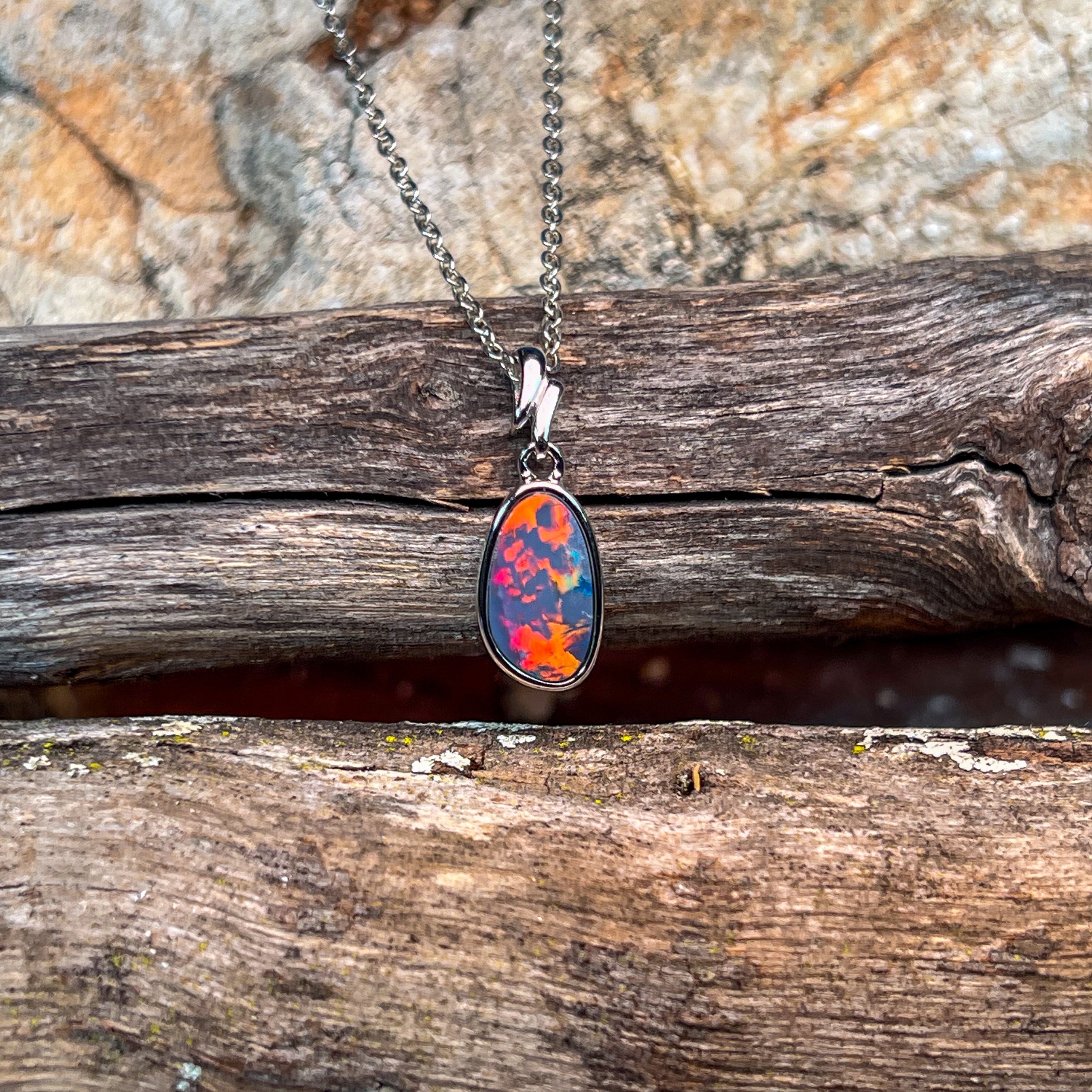 Witness the mesmerizing dance of colour in this stunning sterling silver opal doublet pendant. The vibrant red flash erupts across a rich purple base, creating a dynamic display that shifts and sparkles with every movement. Crafted from premium sterling silver, this piece combines durability with elegance, making it a captivating addition to any jewellery collection. Perfect for those who appreciate nature's most enchanting gemstones and desire a pendant that truly commands attention.