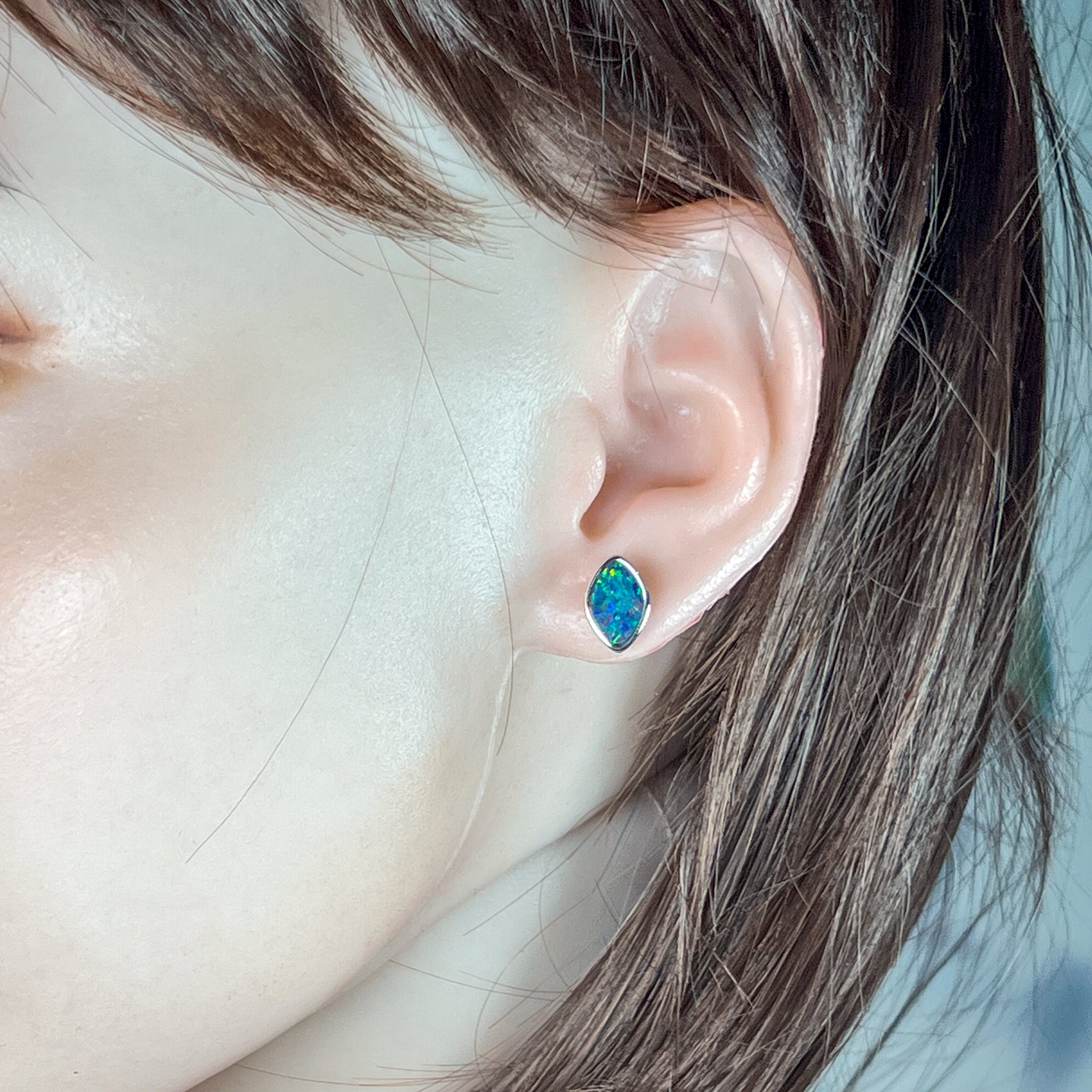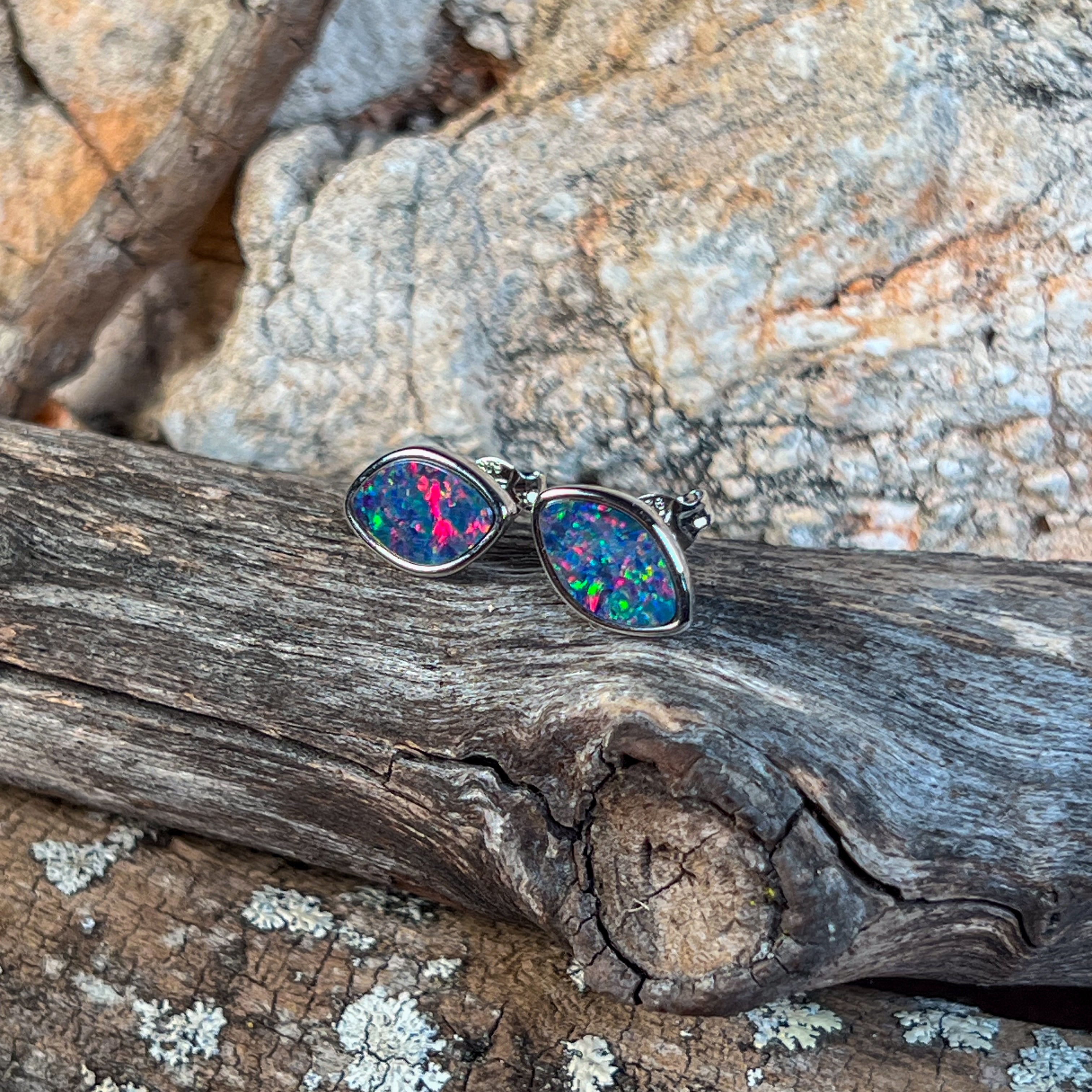 These stunning sterling silver stud earrings showcase vibrant opal doublets cut into elegant diamond shapes that catch the light beautifully. Each piece displays mesmerizing flashes of red, green, and blue—nature's most captivating colours dancing across the surface. Perfect for adding a pop of colour to any look, these versatile studs work equally well for everyday wear or special occasions. The secure sterling silver setting ensures your precious gems stay protected while you enjoy their radiant beauty. A timeless investment piece that brings joy every time you wear it.