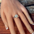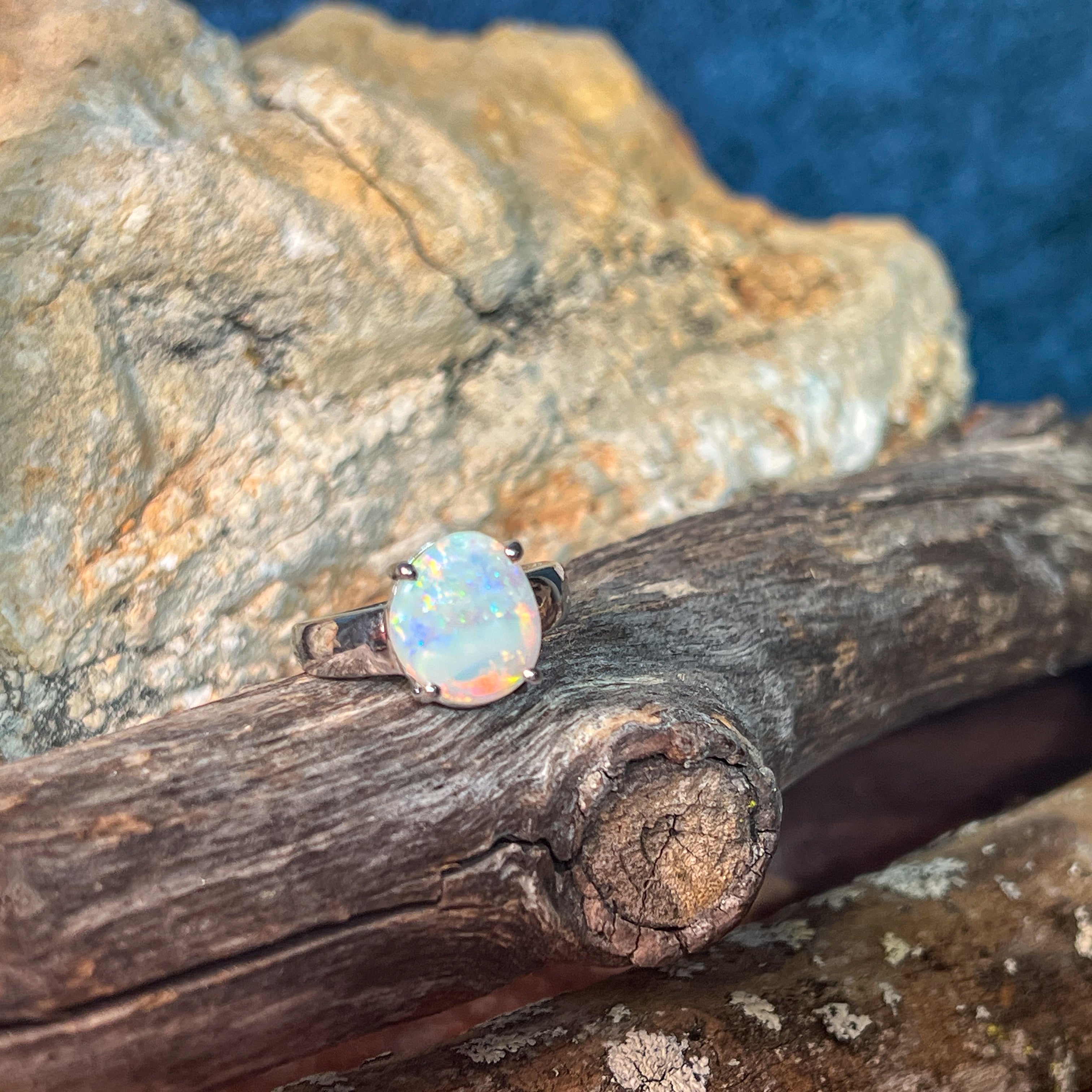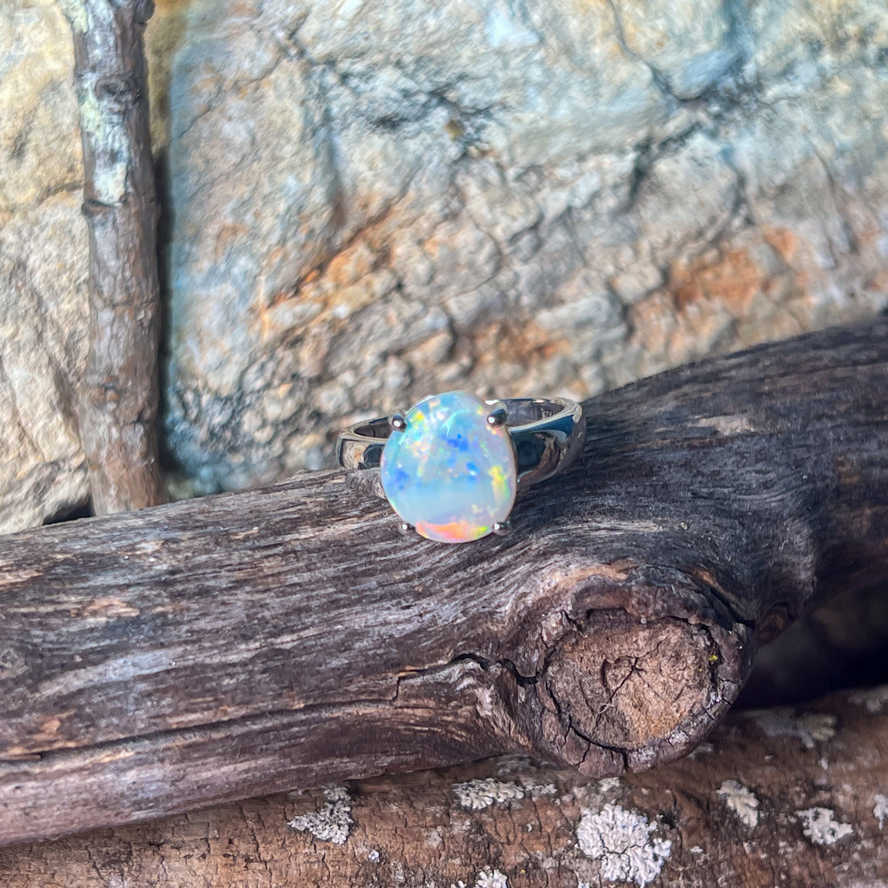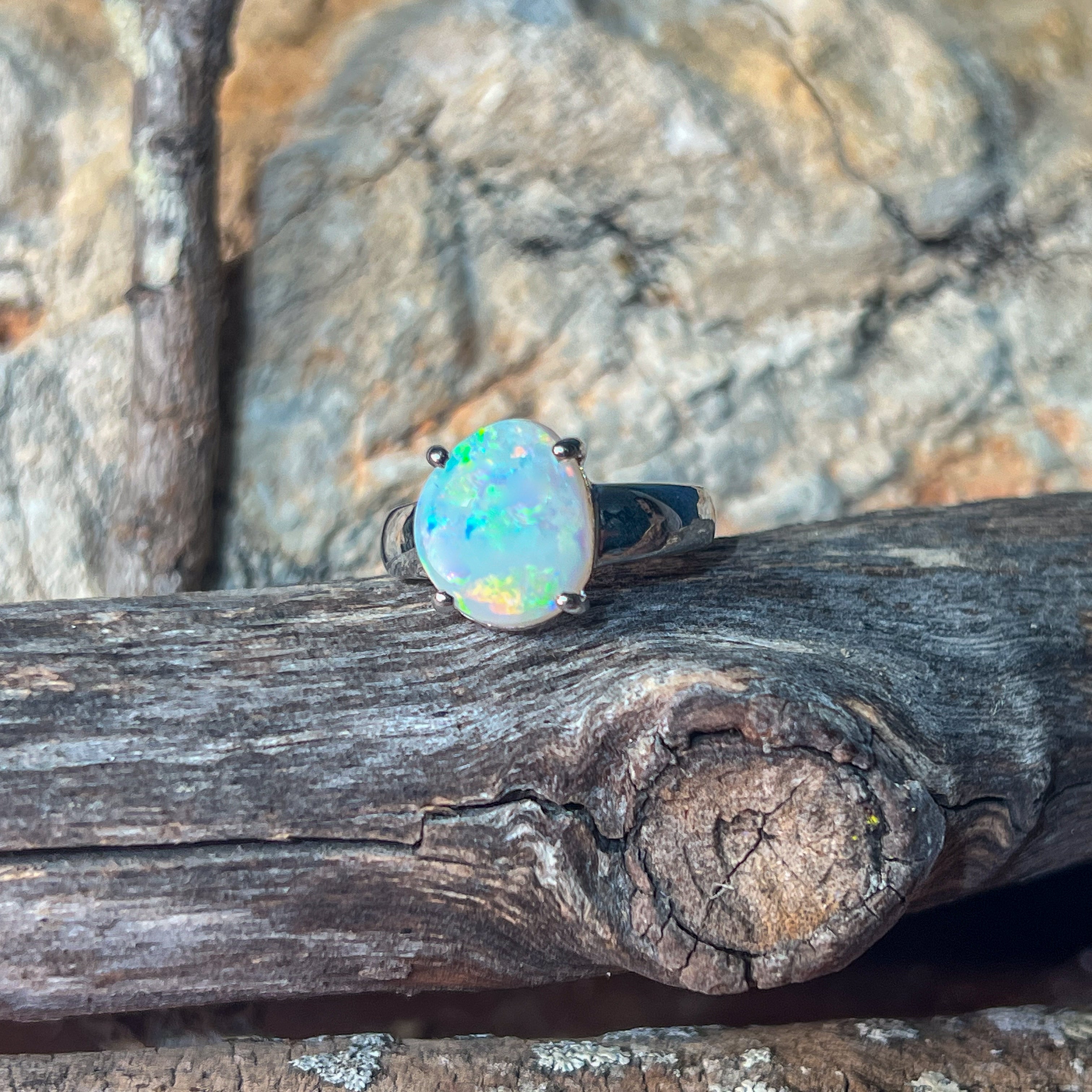 Elevate your style with this stunning sterling silver ring featuring a 2.24ct freeform white opal. Its unique shape and brilliant play of colors make it a captivating centerpiece, perfect for adding elegance and individuality to any outfit. Crafted for comfort and durability, this ring beautifully balances timeless sophistication with modern design.