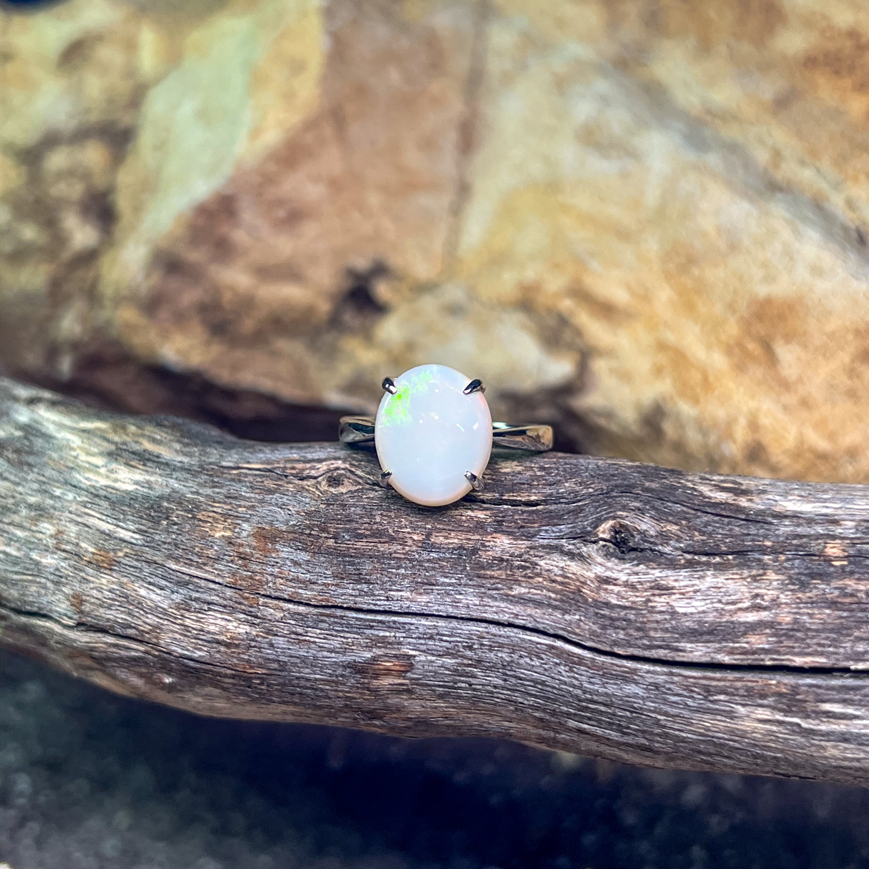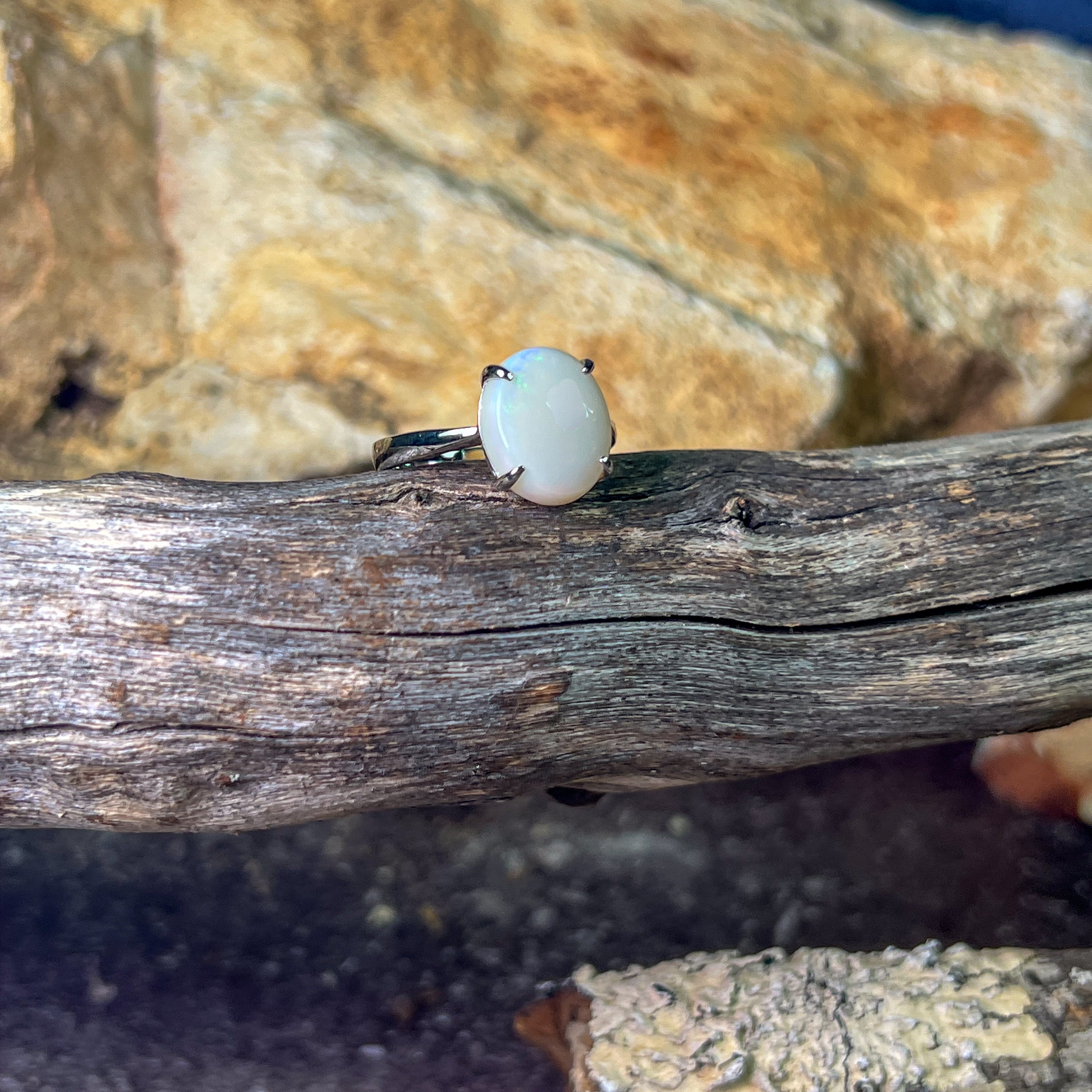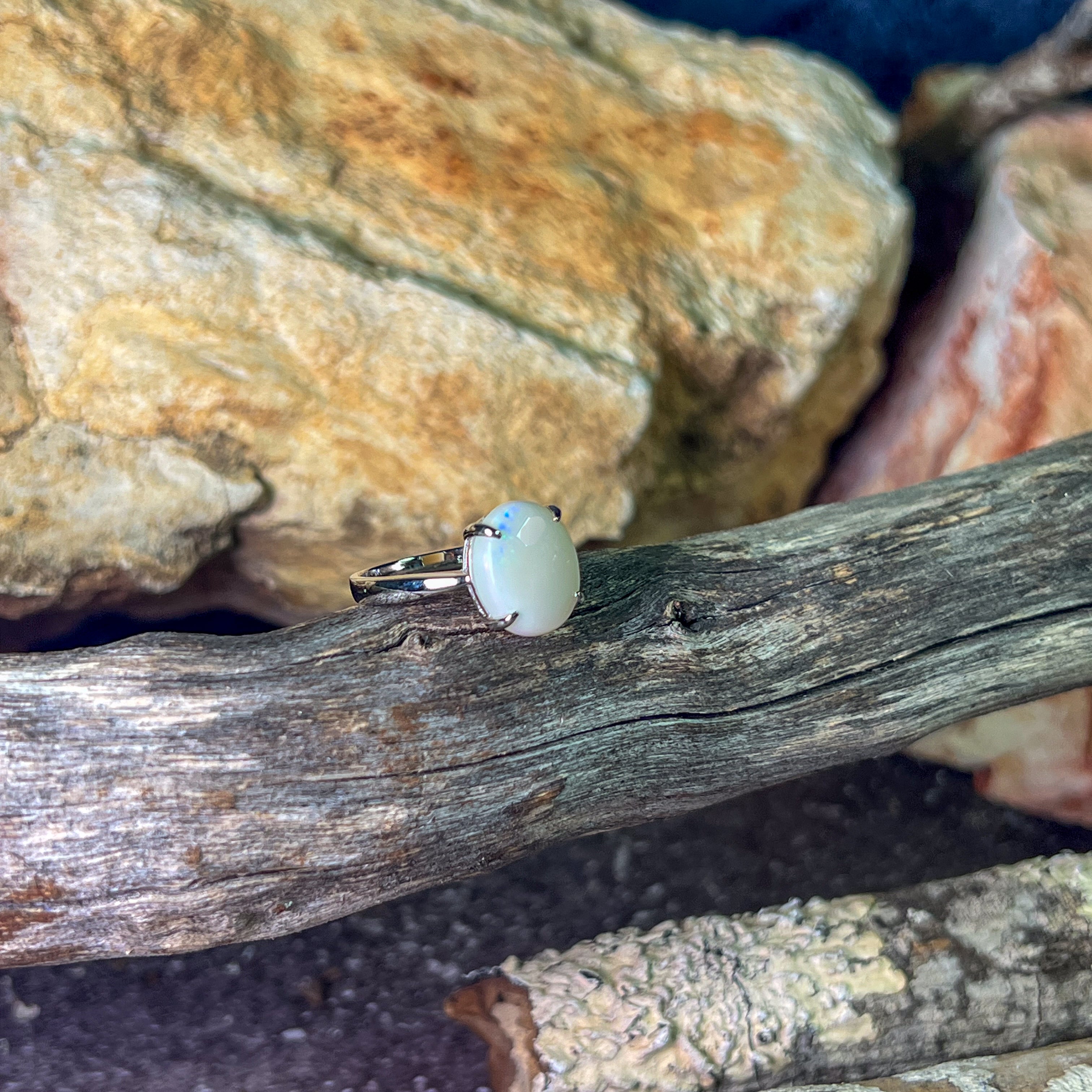 Elevate your style with our Sterling Silver solitaire White Opal ring! With a classic design and a stunning 12x10mm stone, this ring will add a touch of sophistication to any outfit. Express your unique style and make a statement with this beautiful piece.