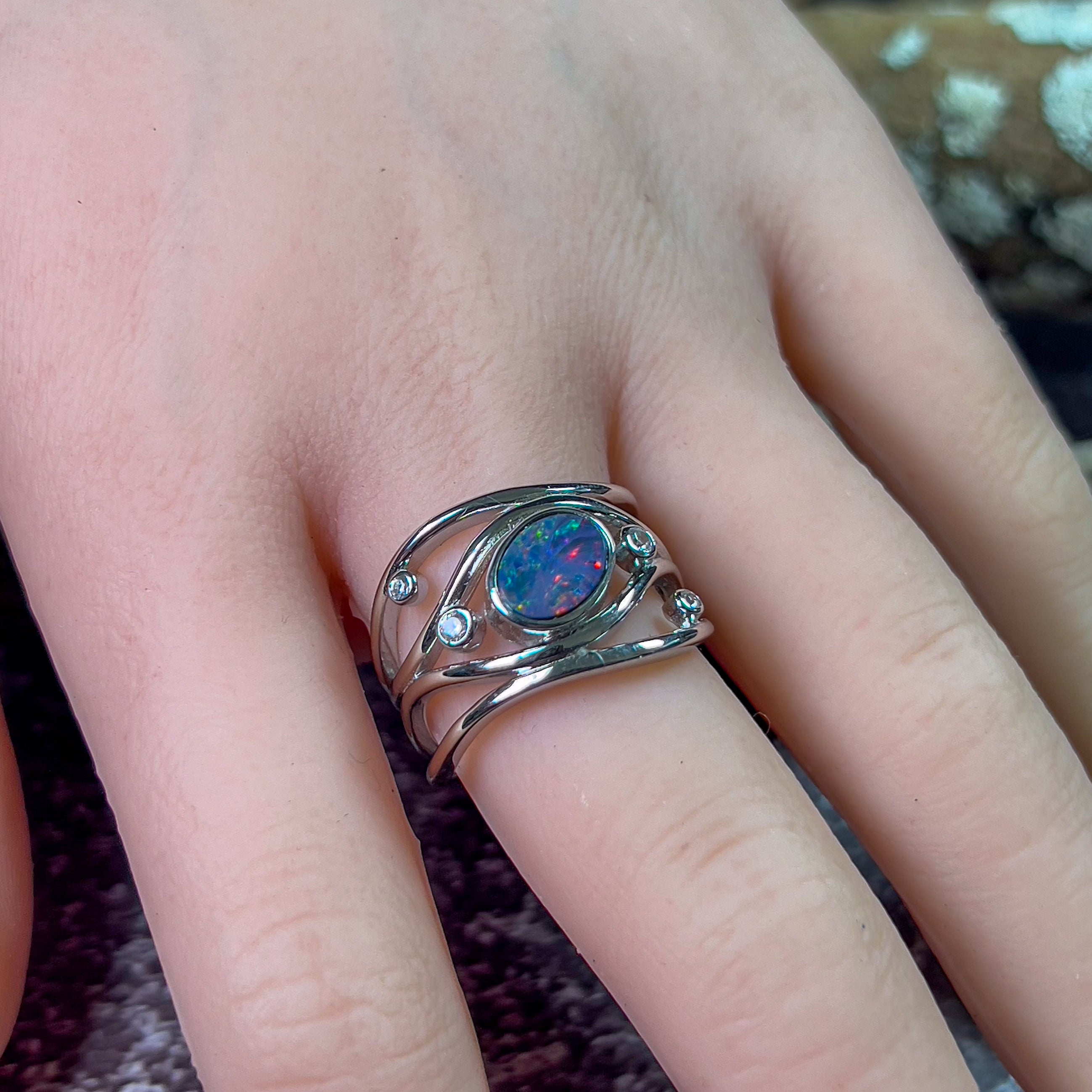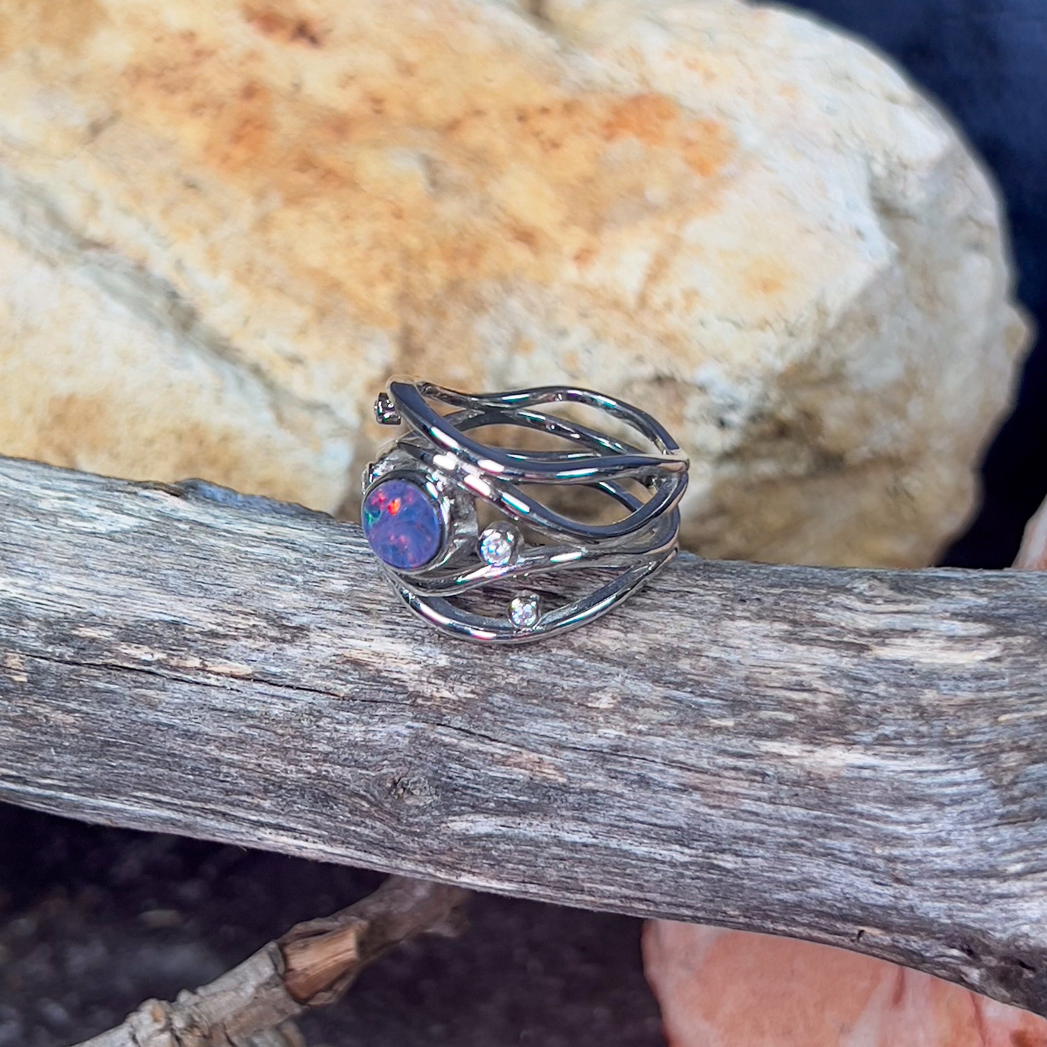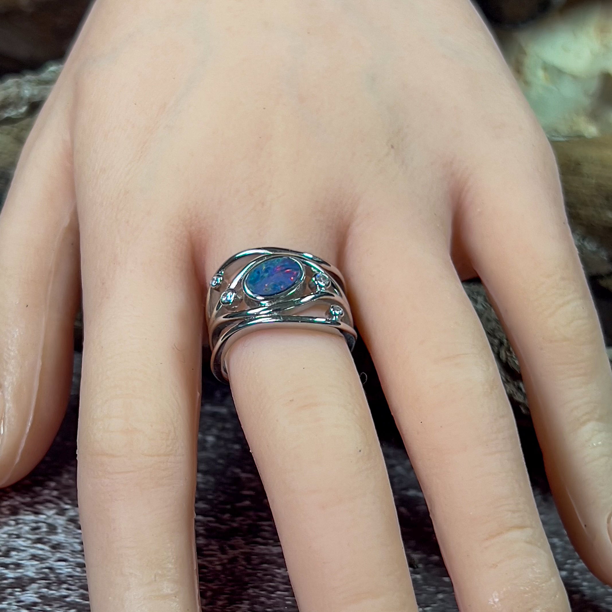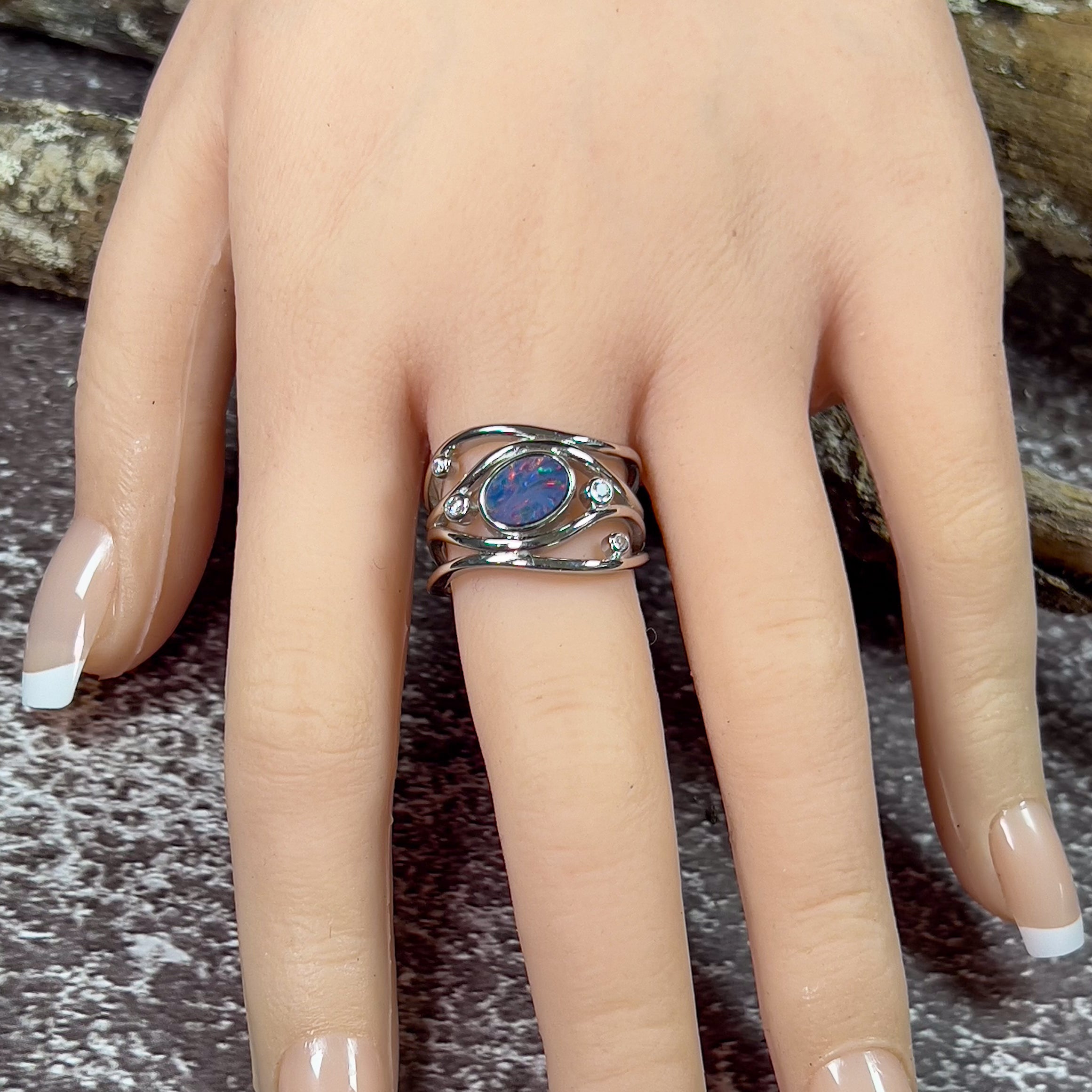 Elevate your style with our Sterling Silver Split Shank 3 Row Wide Band Opal Ring! The sleek, wide band is shaped with a stunning wave design, adding a unique touch to any outfit. Crafted with high-quality sterling silver, this ring is sure to make a statement and captivate attention.