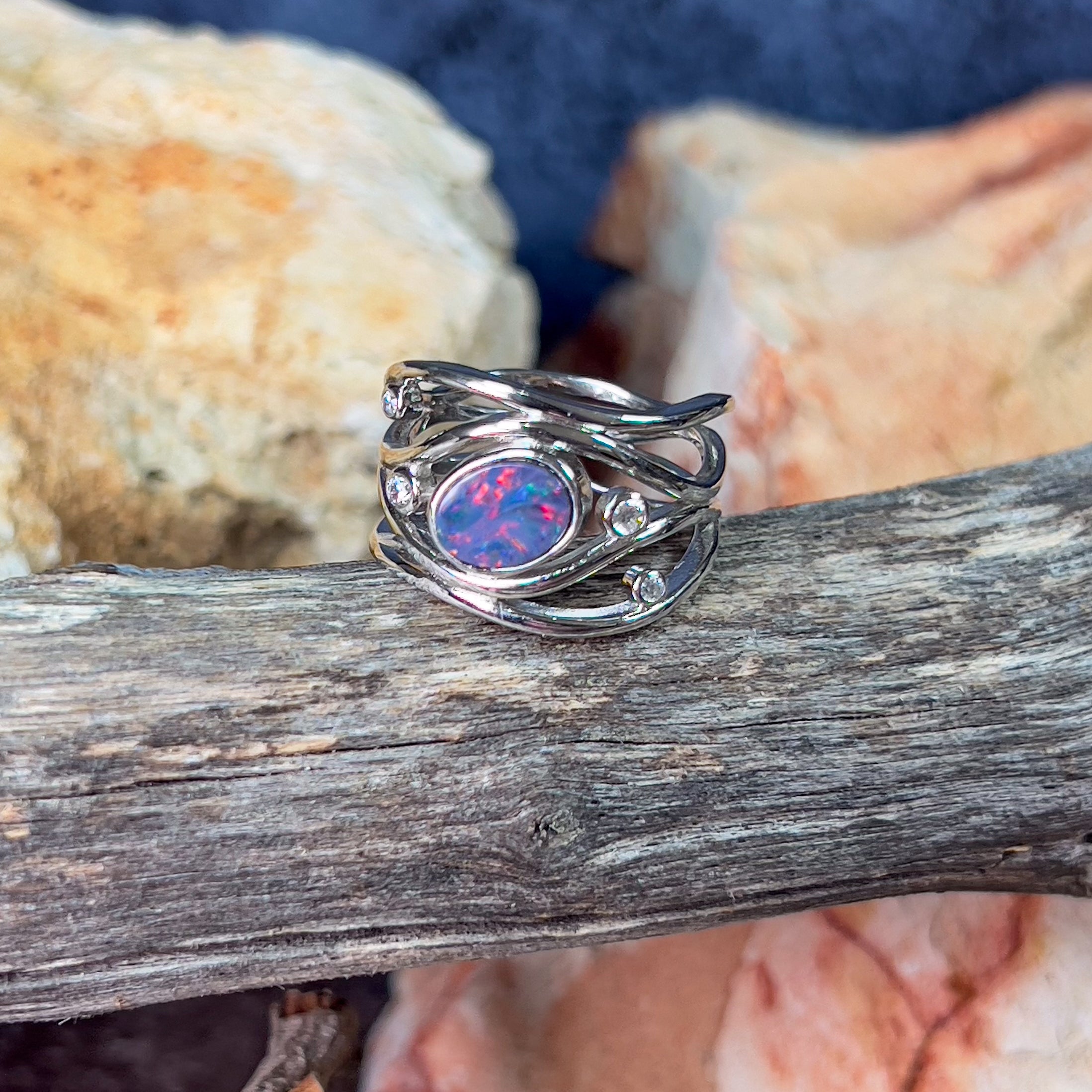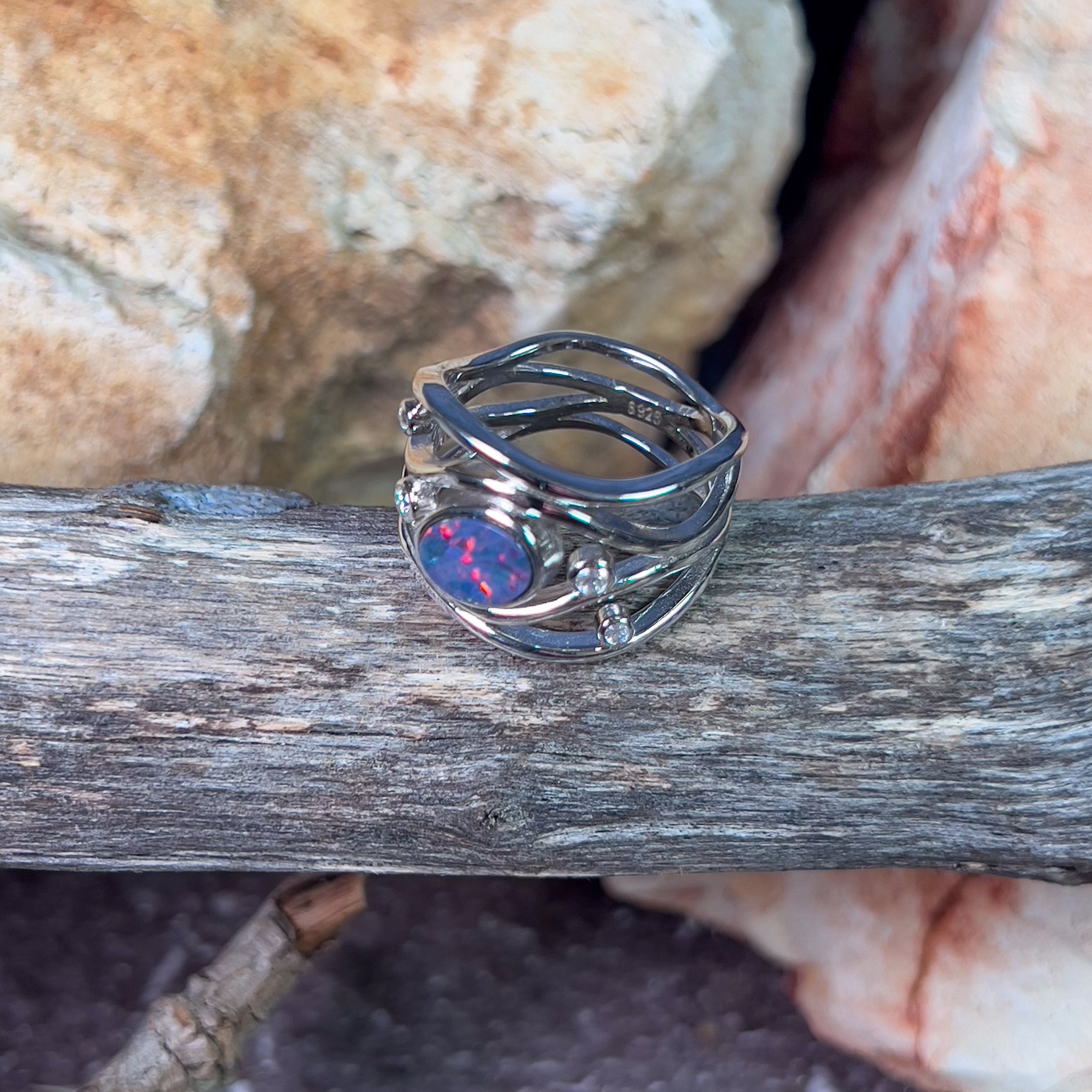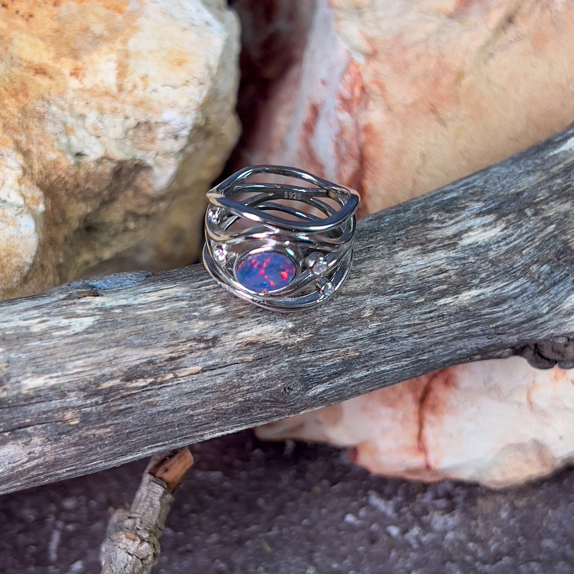 Elevate your style with our Sterling Silver Split Shank 3 Row Wide Band Opal Ring! The sleek, wide band is shaped with a stunning wave design, adding a unique touch to any outfit. Crafted with high-quality sterling silver, this ring is sure to make a statement and captivate attention.