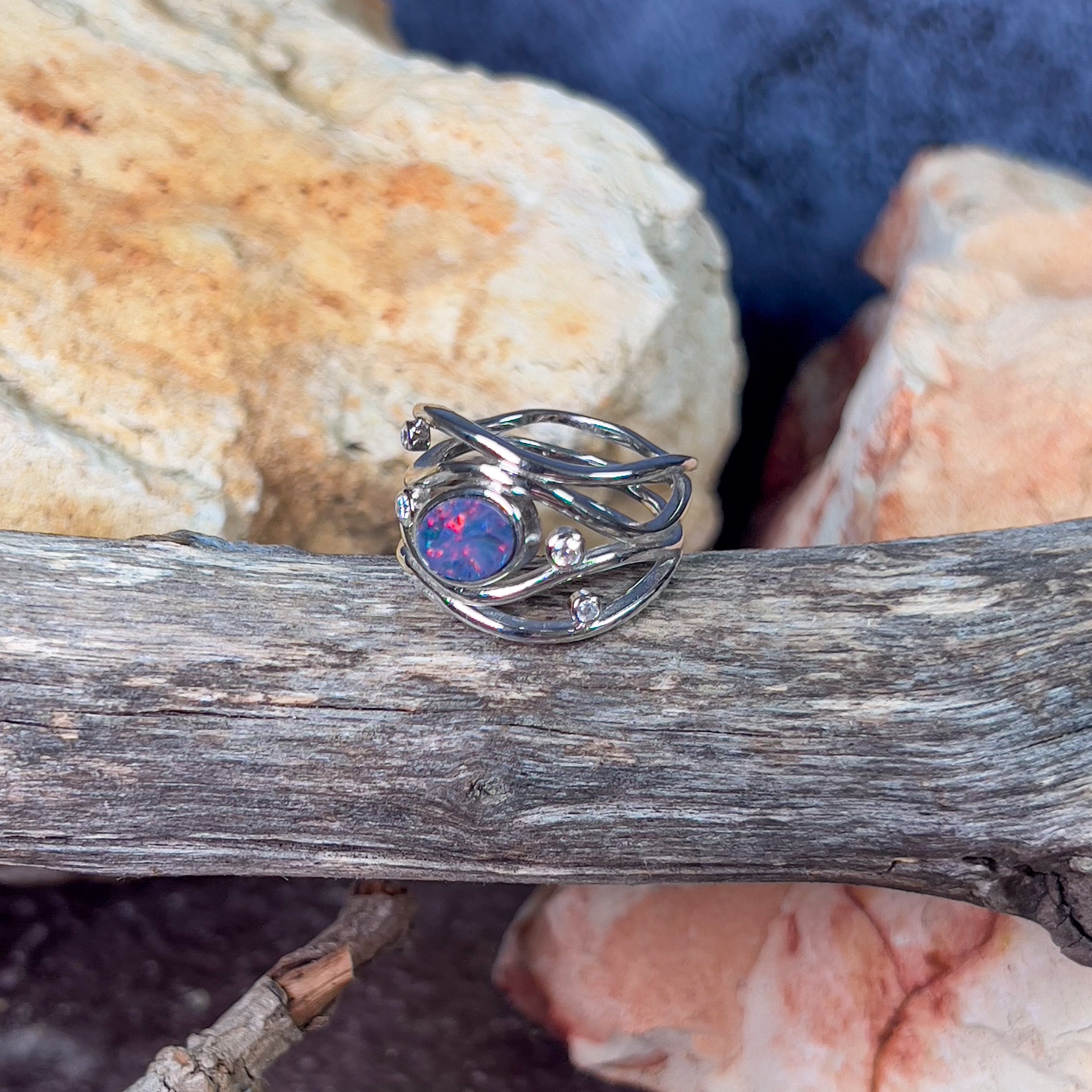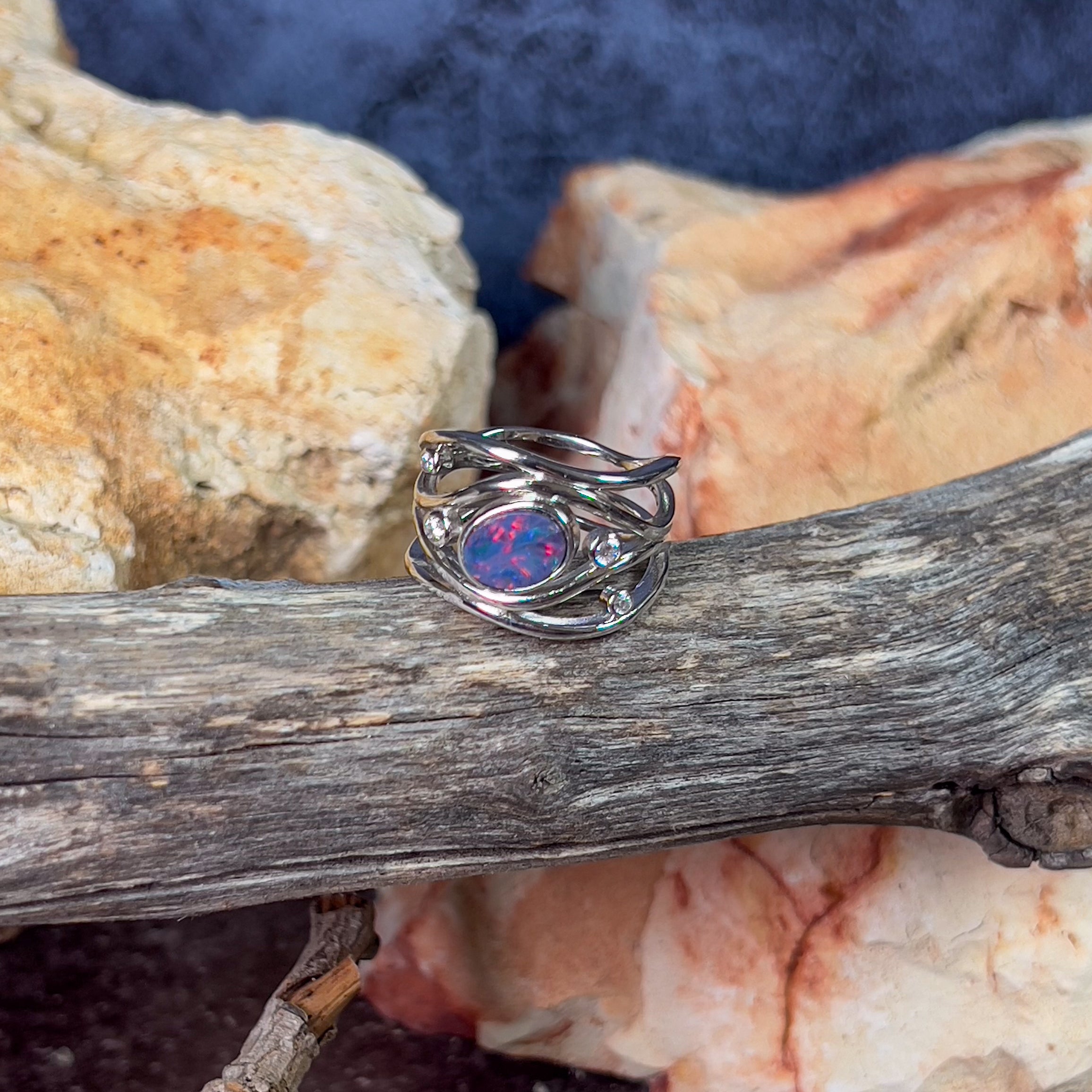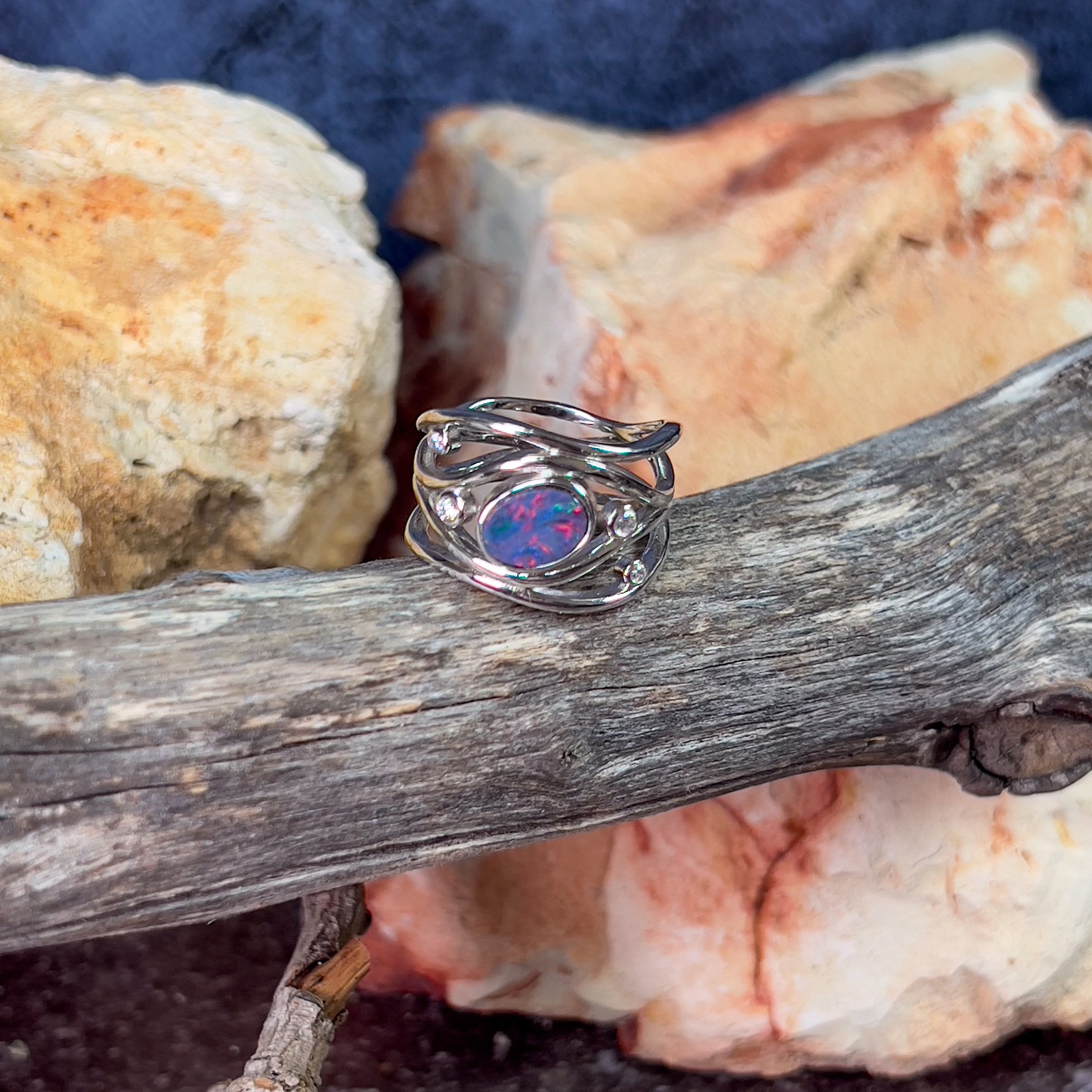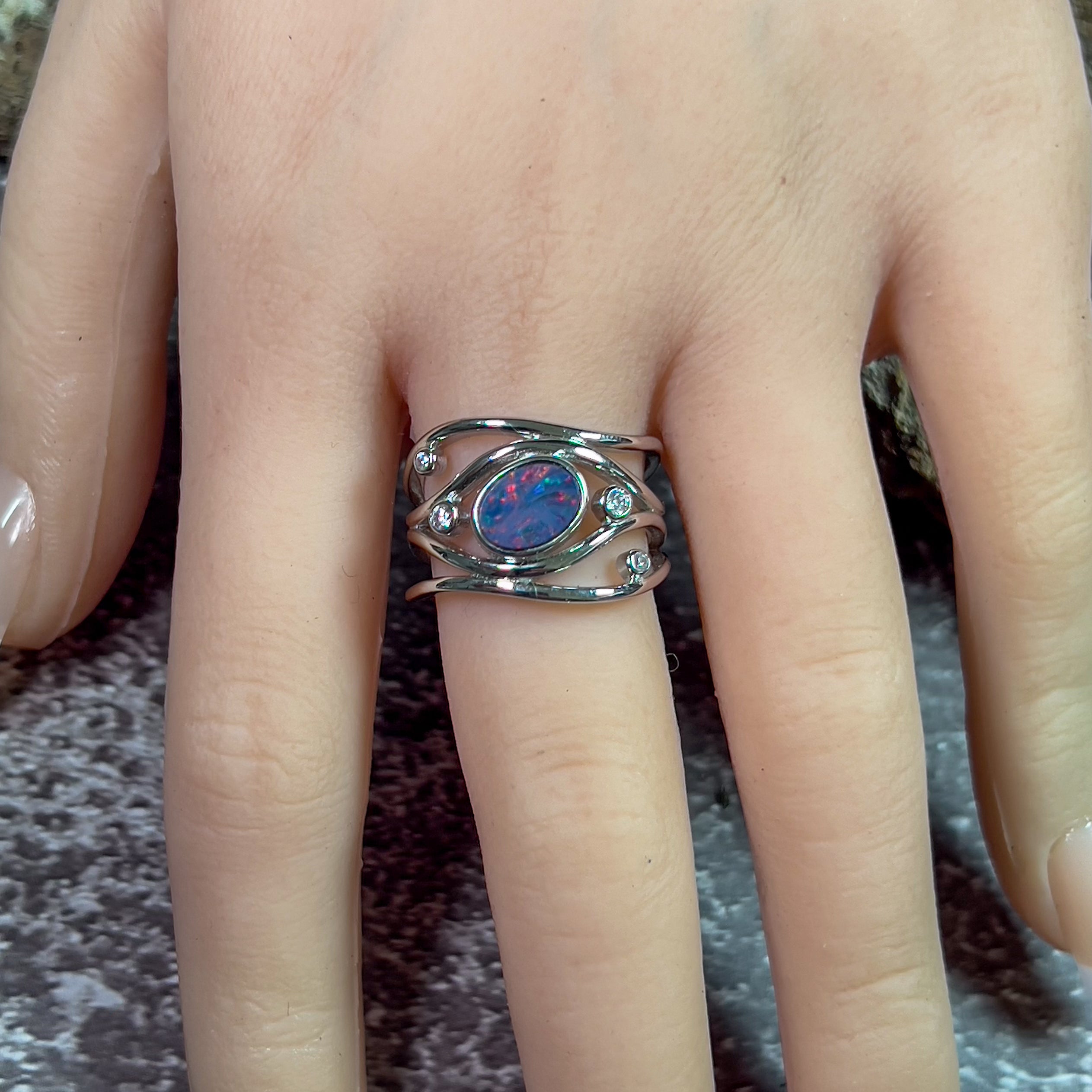 Elevate your style with our Sterling Silver Split Shank 3 Row Wide Band Opal Ring! The sleek, wide band is shaped with a stunning wave design, adding a unique touch to any outfit. Crafted with high-quality sterling silver, this ring is sure to make a statement and captivate attention.