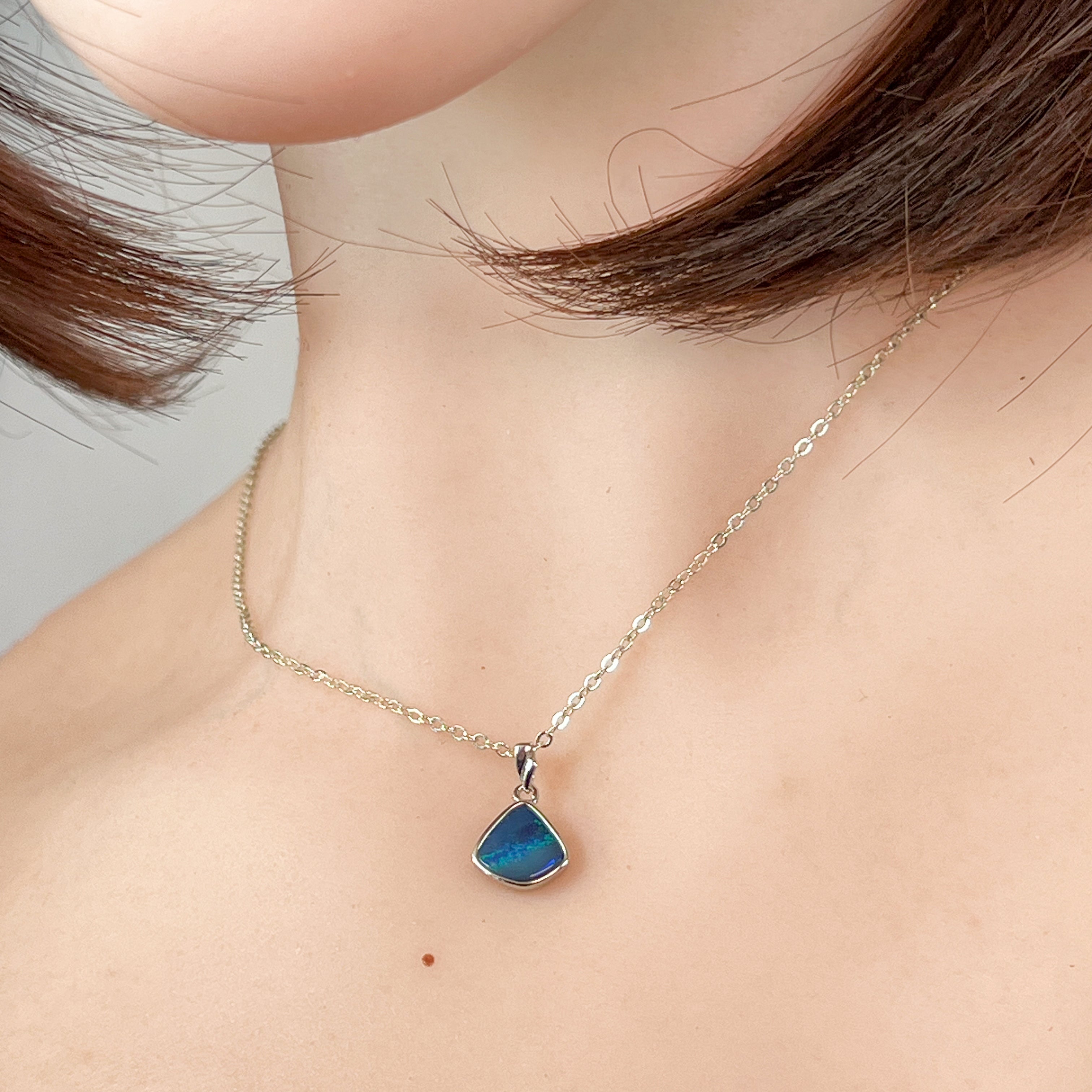 This sterling silver pendant features a striking triangle shape with a blue-green striped opal doublet, evoking the serene hues of the ocean. Its elegant design and vibrant colors make it a refined accessory that adds a touch of sophistication to any ensemble. Perfect for those who appreciate unique craftsmanship and timeless style.