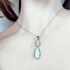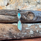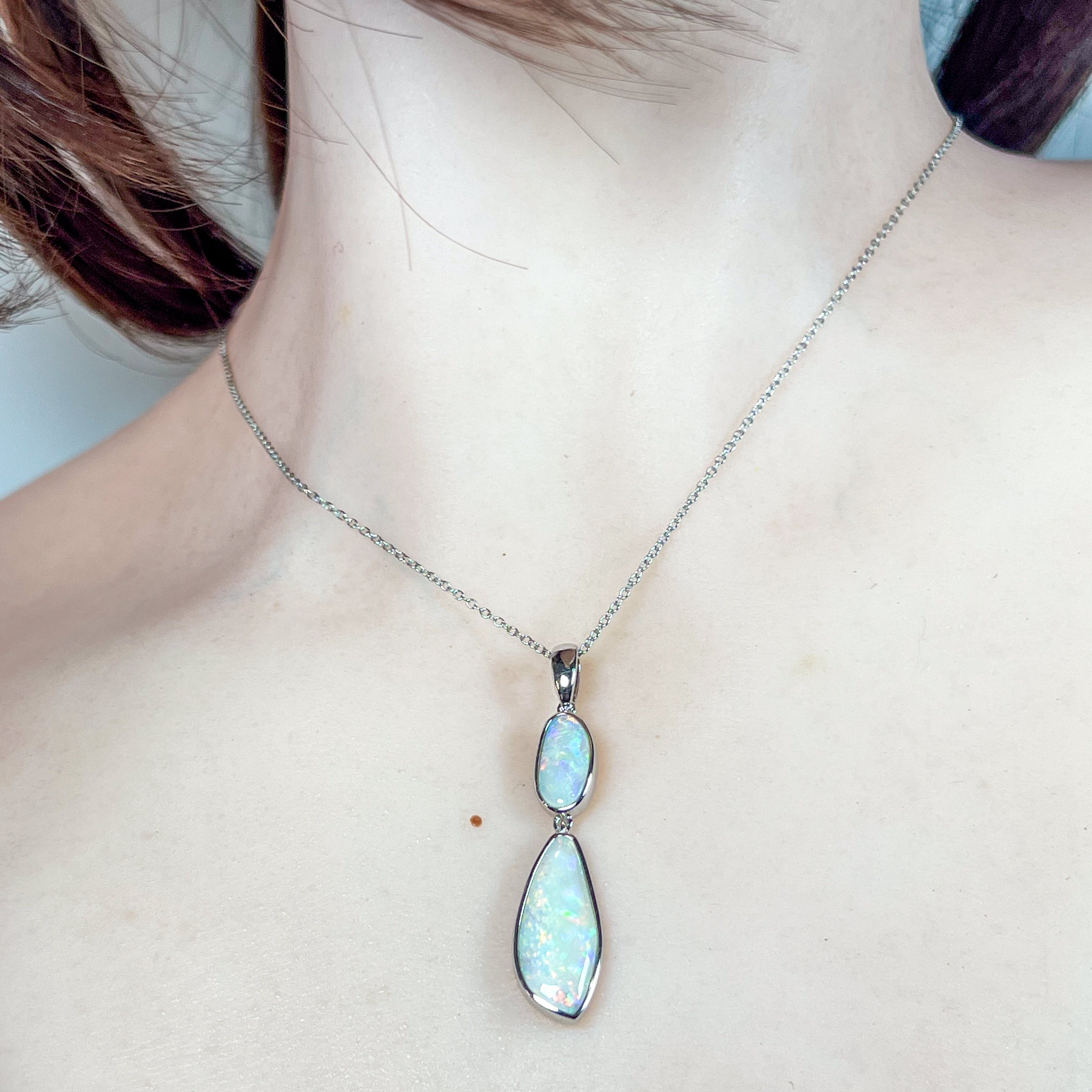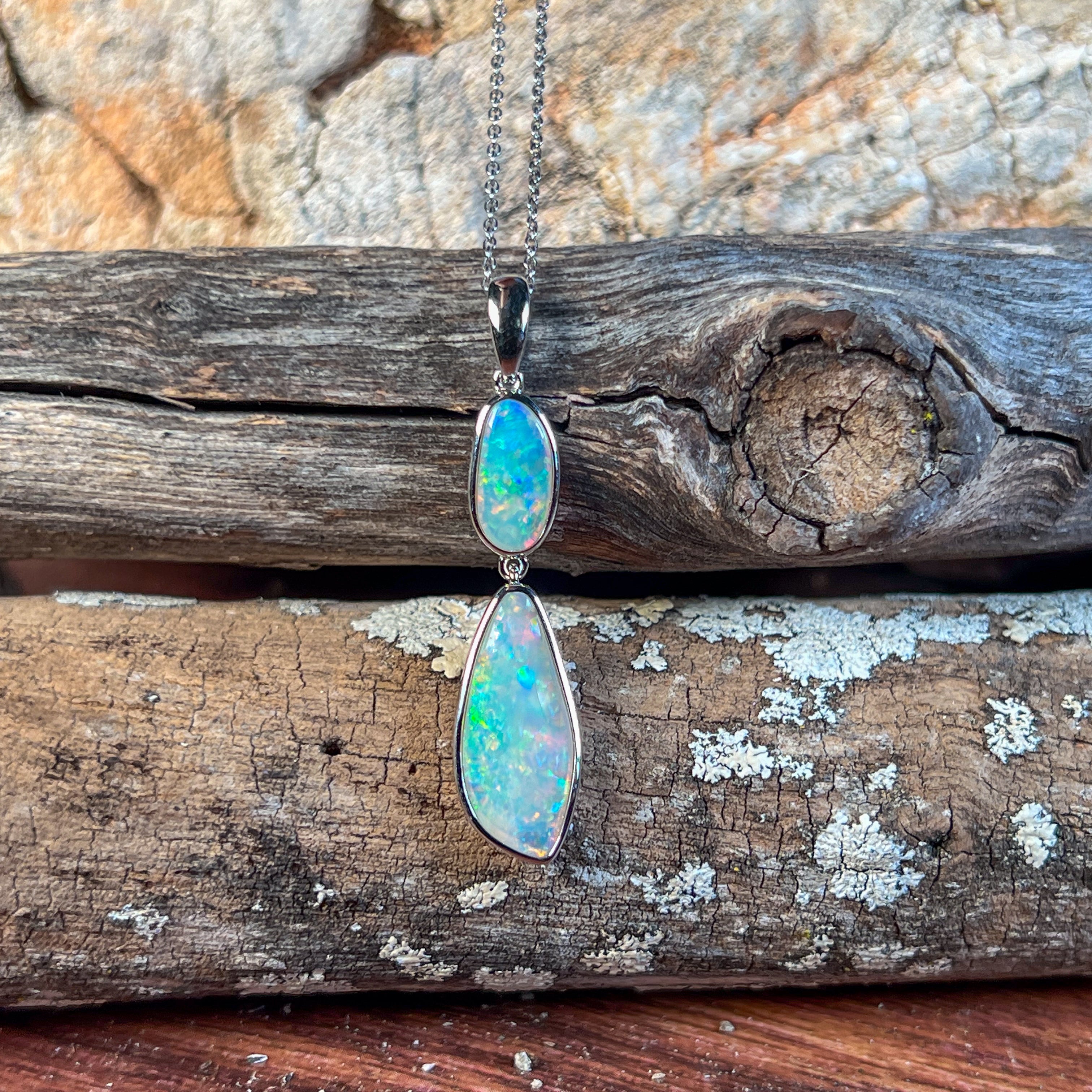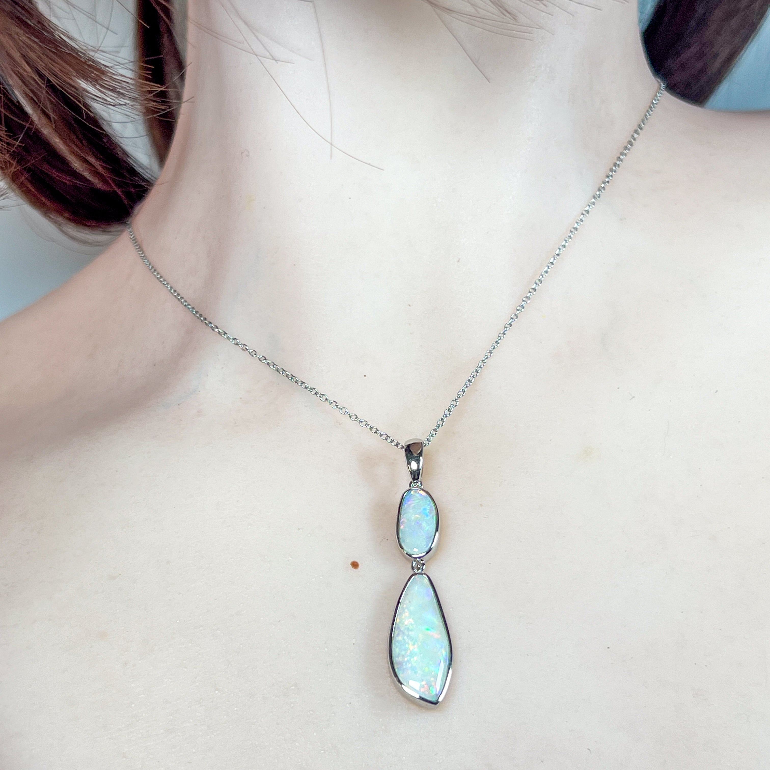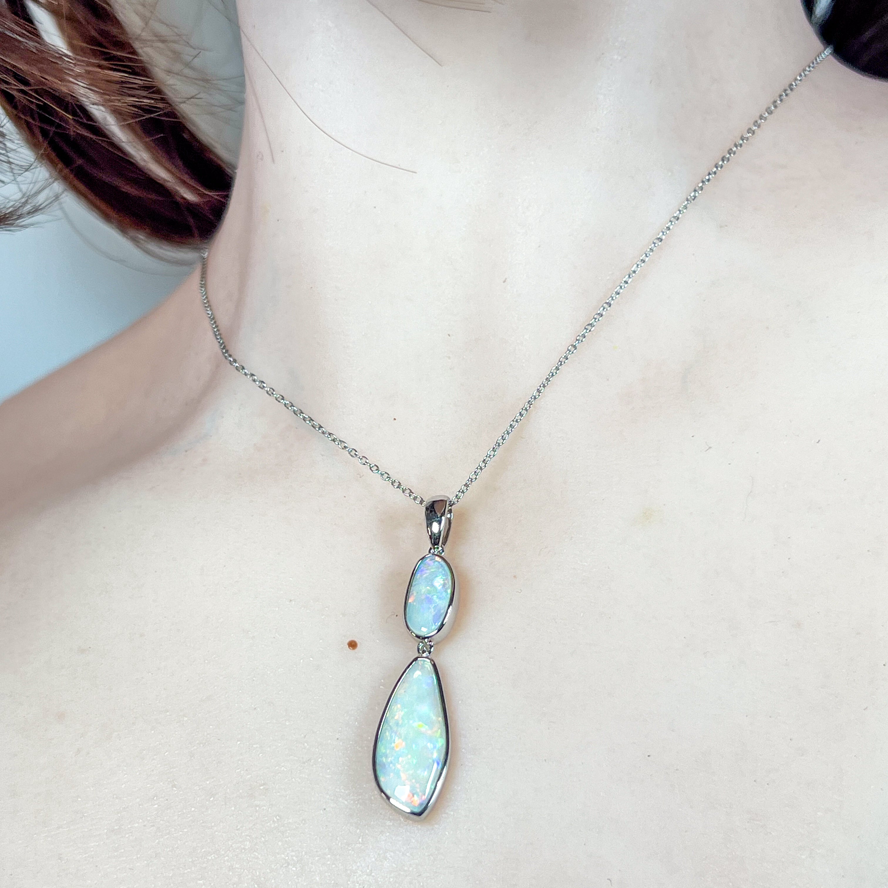 Elevate your jewellery collection with this stunning Sterling Silver pendant featuring two mesmerising freeform crystal opals. Each stone showcases nature's most captivating light play, displaying a breathtaking spectrum of colours that shift and dance with every movement. The organic freeform cuts celebrate the opals' natural beauty, while the lustrous sterling silver setting provides timeless elegance and durability. Perfect for those who appreciate unique gemstones and want a piece that truly stands out. A versatile treasure that transitions effortlessly from everyday wear to special occasions.