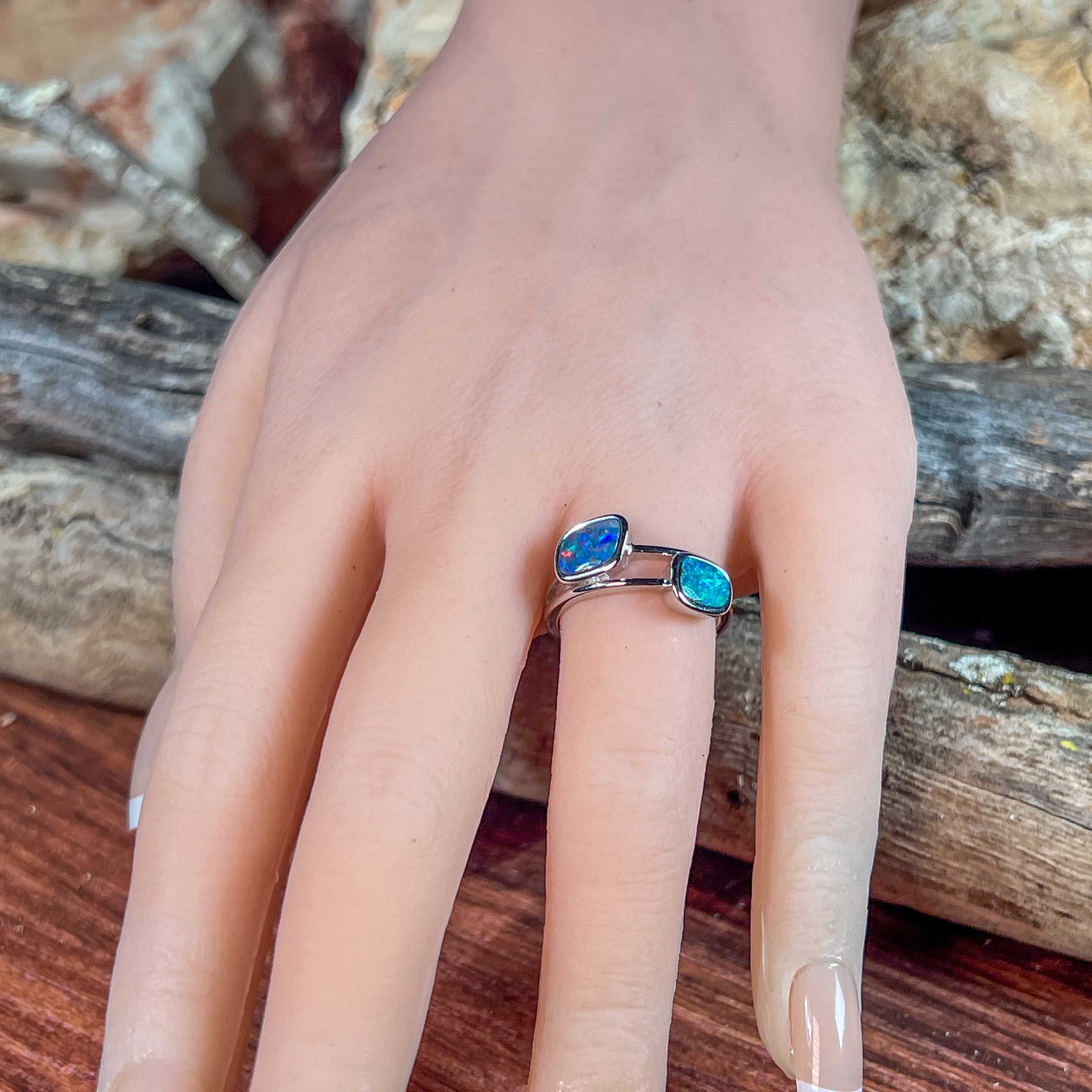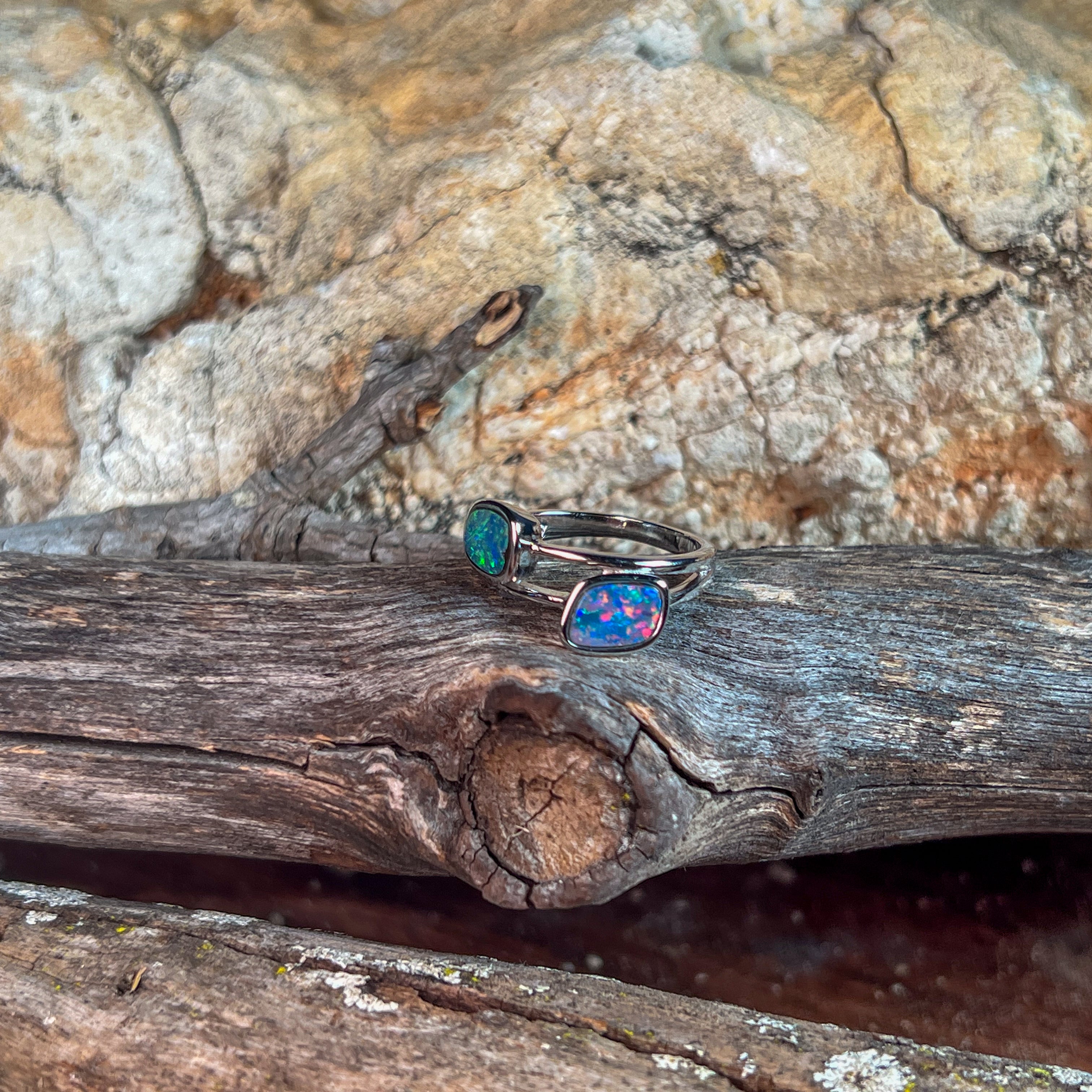 Elevate your accessory game with this Sterling Silver split ring featuring vibrant red and green opals. Its unique design blends modern elegance with bold color, making it perfect for adding a striking touch to any outfit. Durable and stylish, this ring offers lasting shine and effortless sophistication for everyday wear or special occasions.