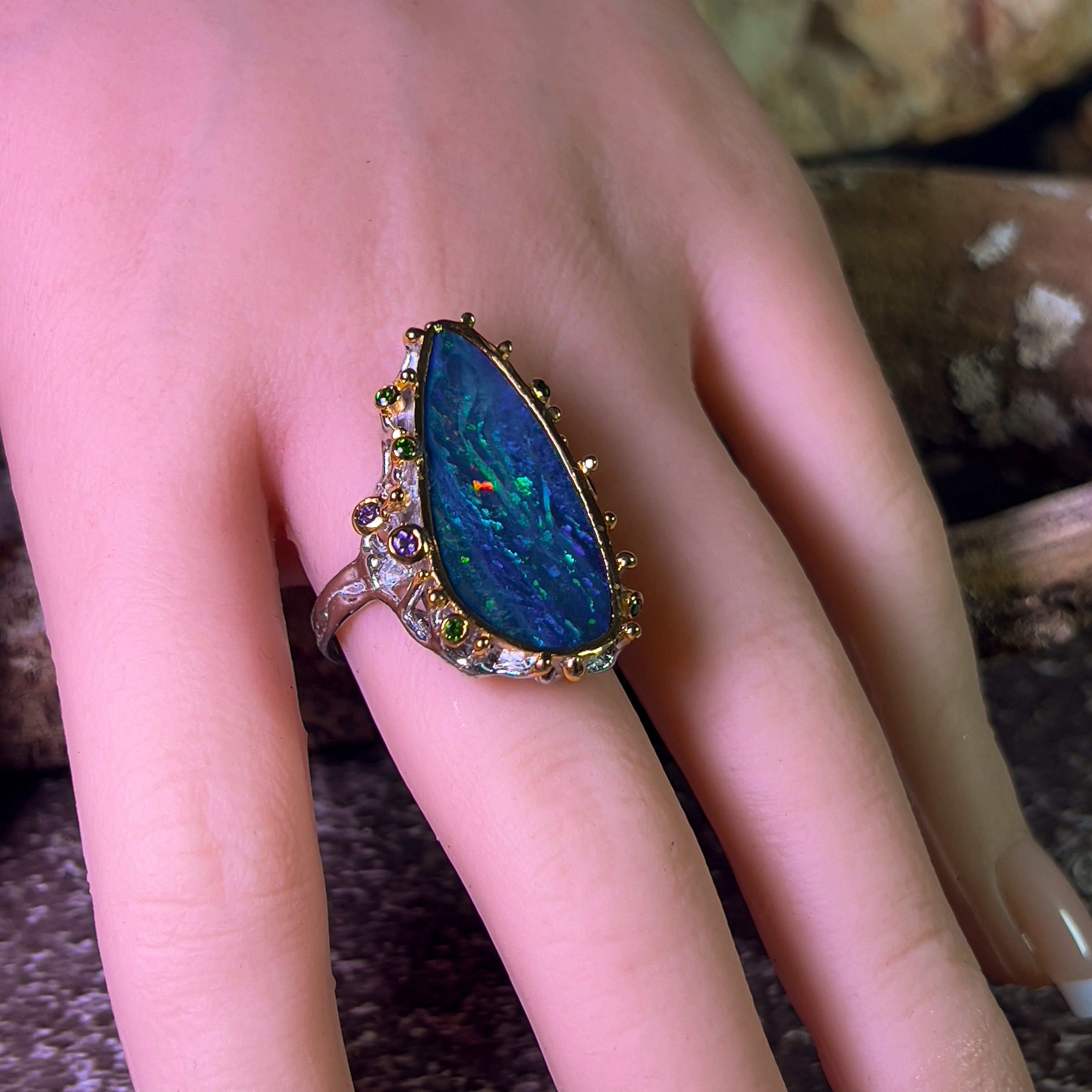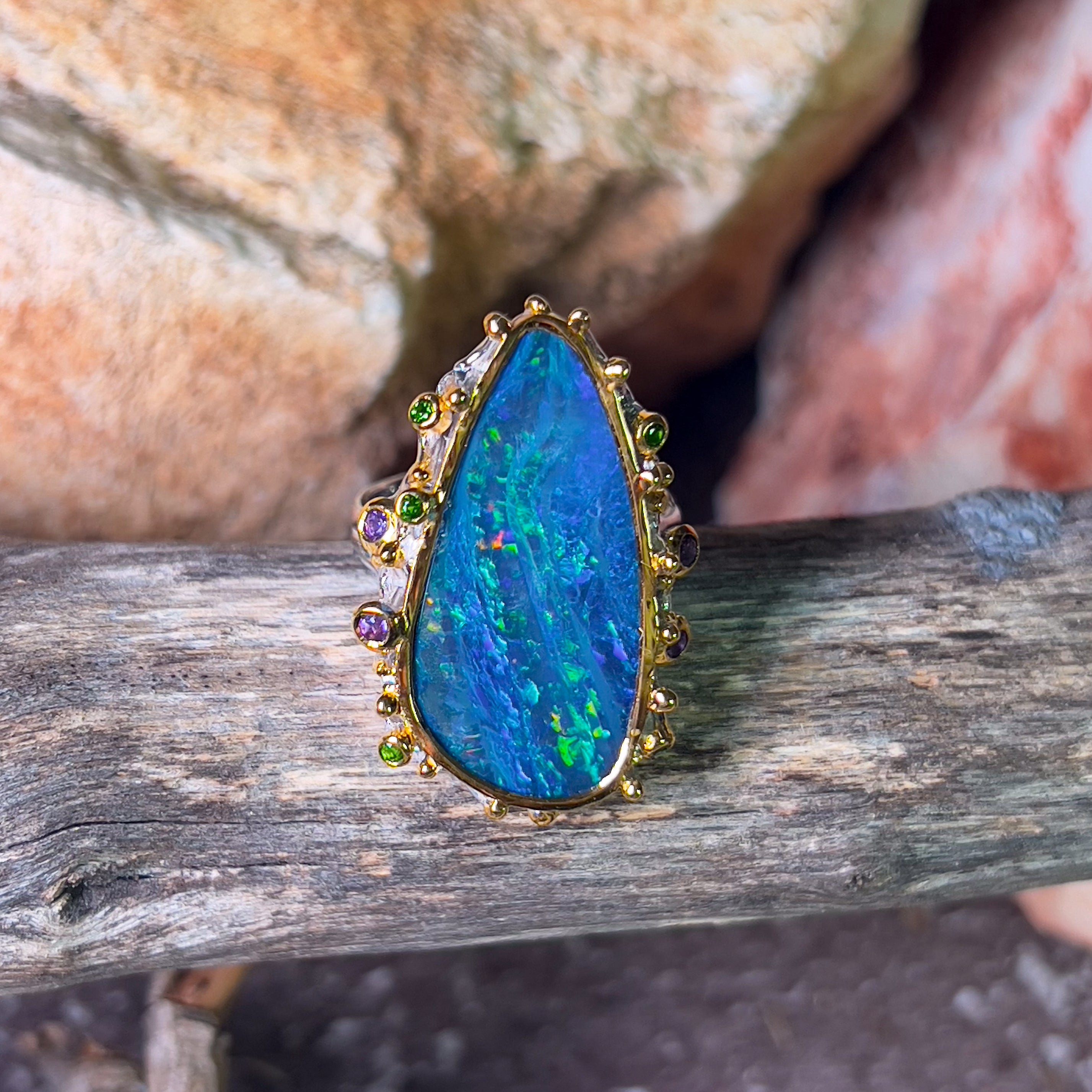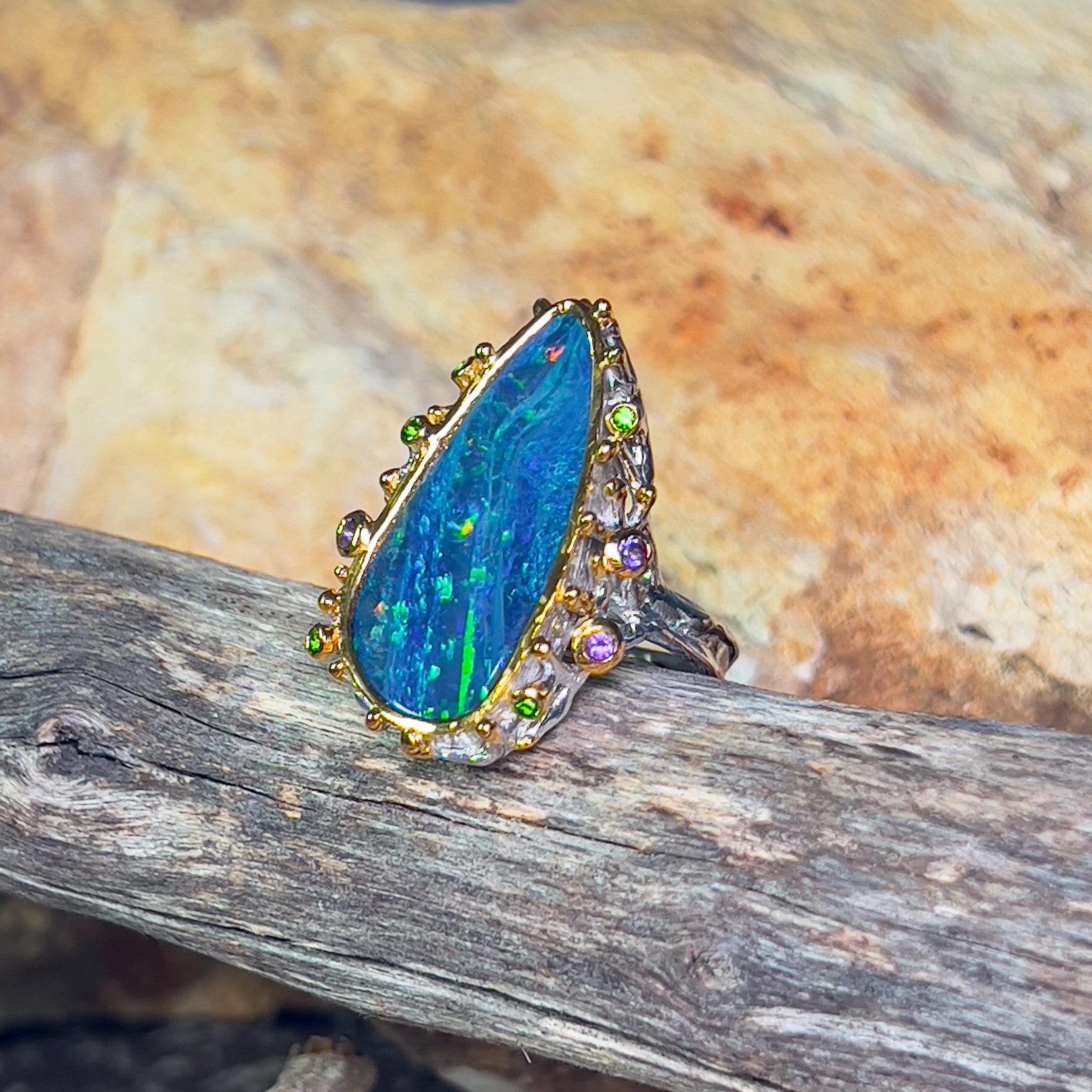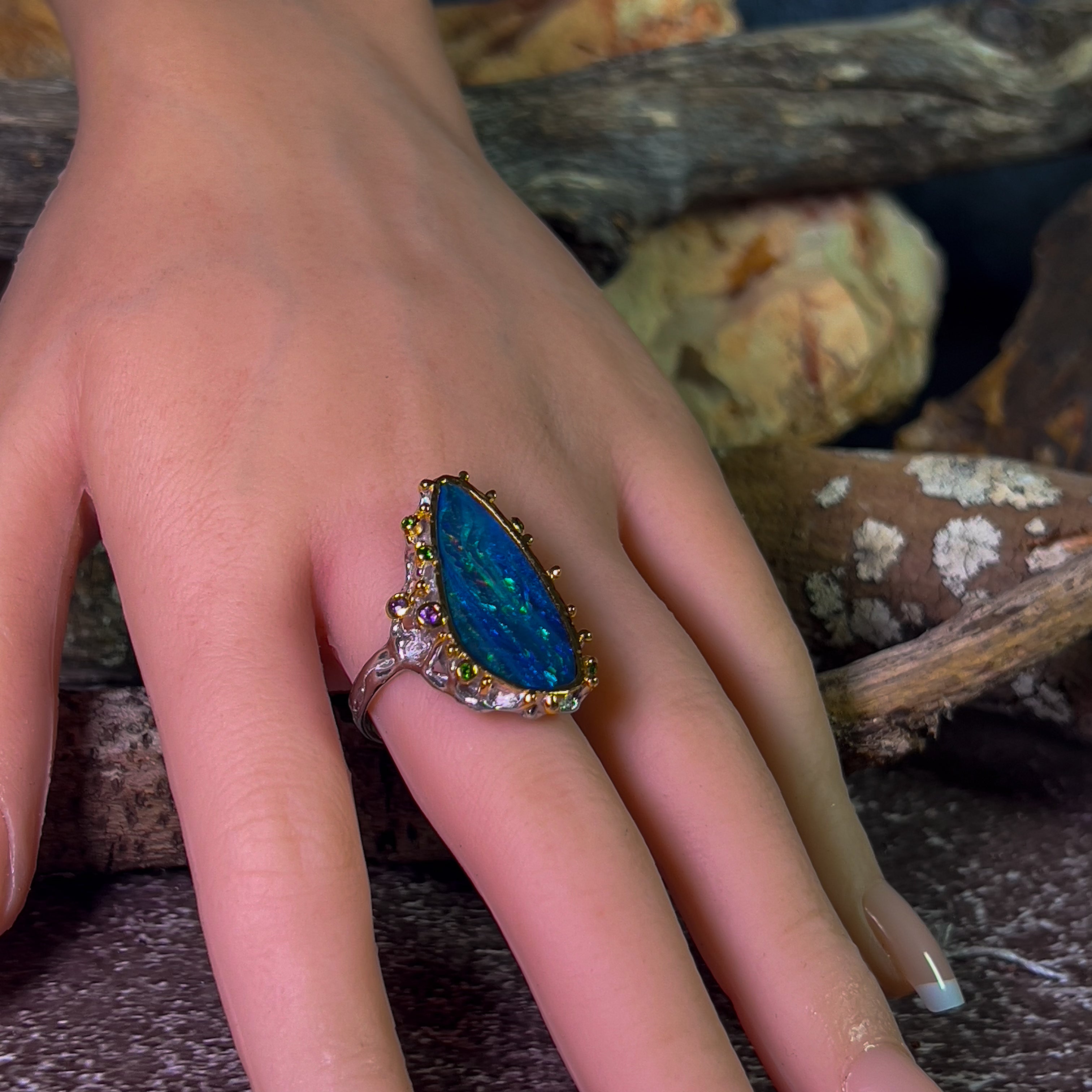 Sterling Silver Two Tone Opal doublet and multi colour Coral design ring