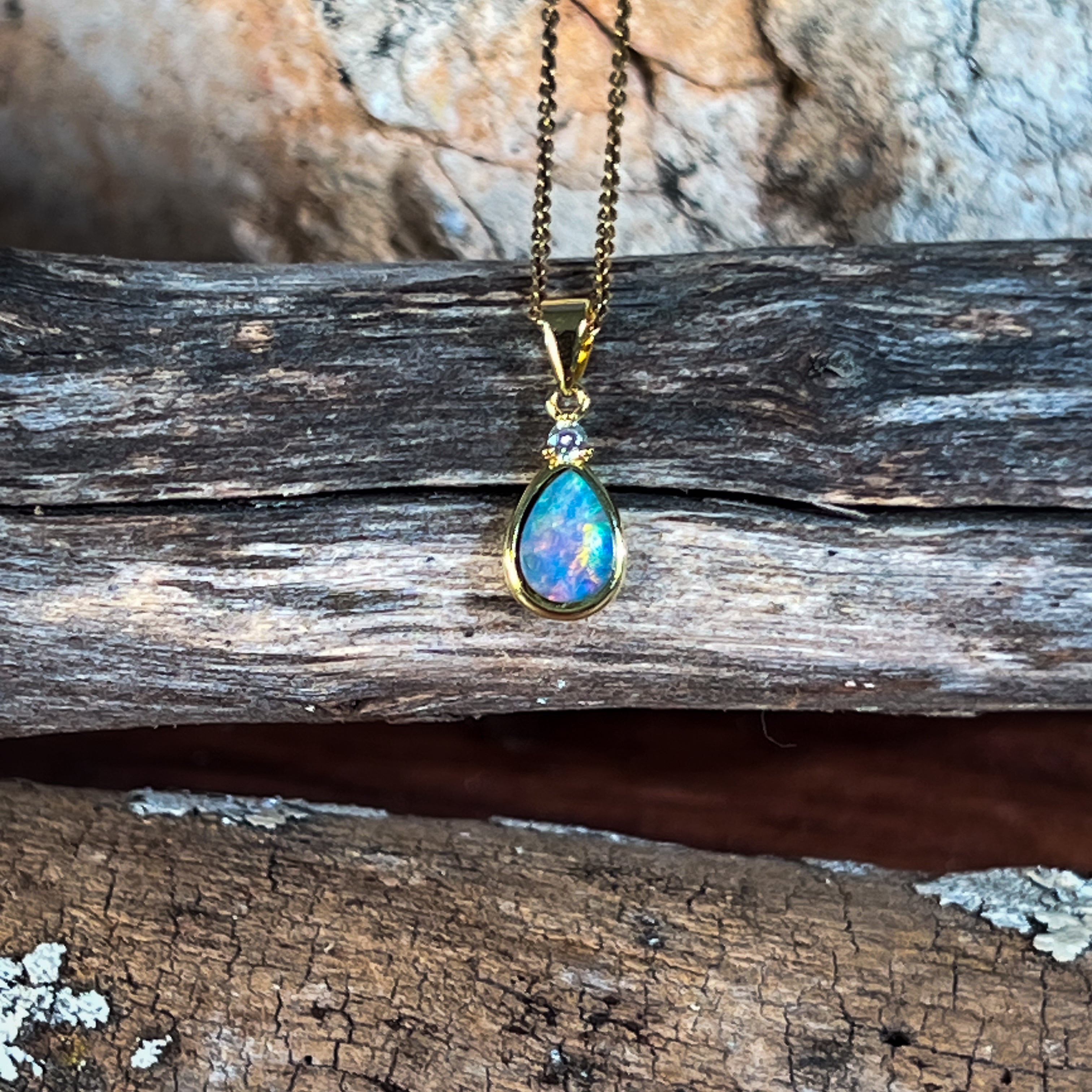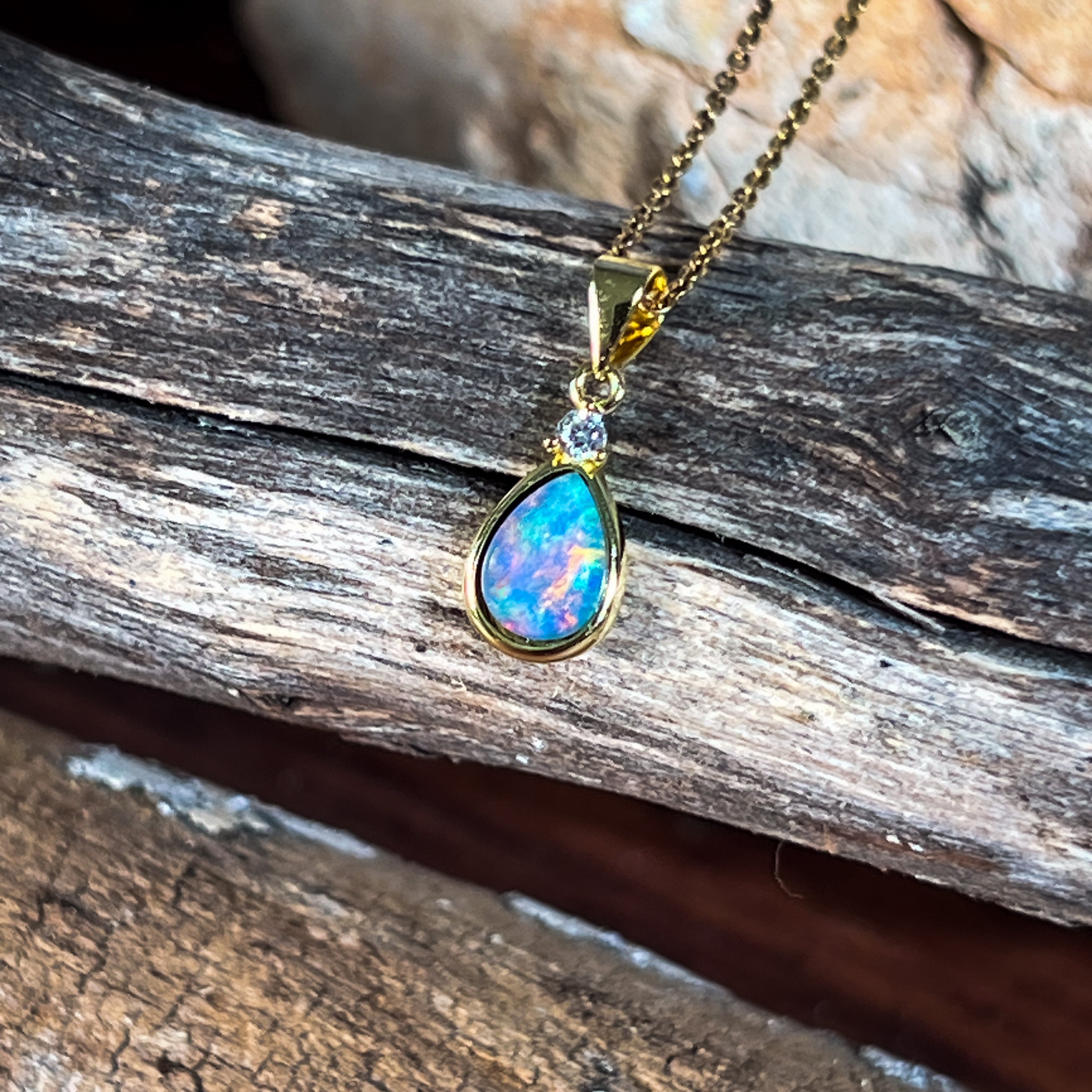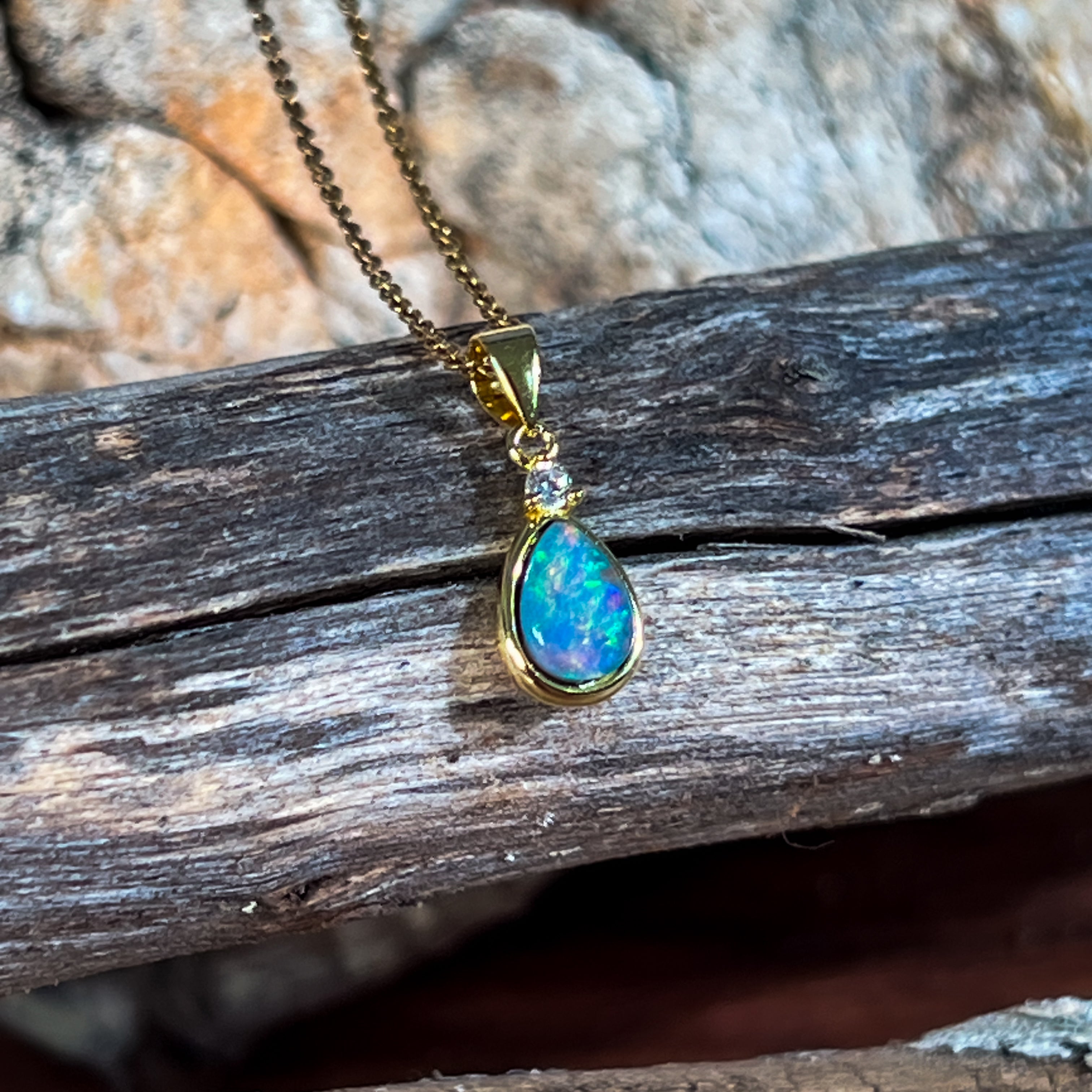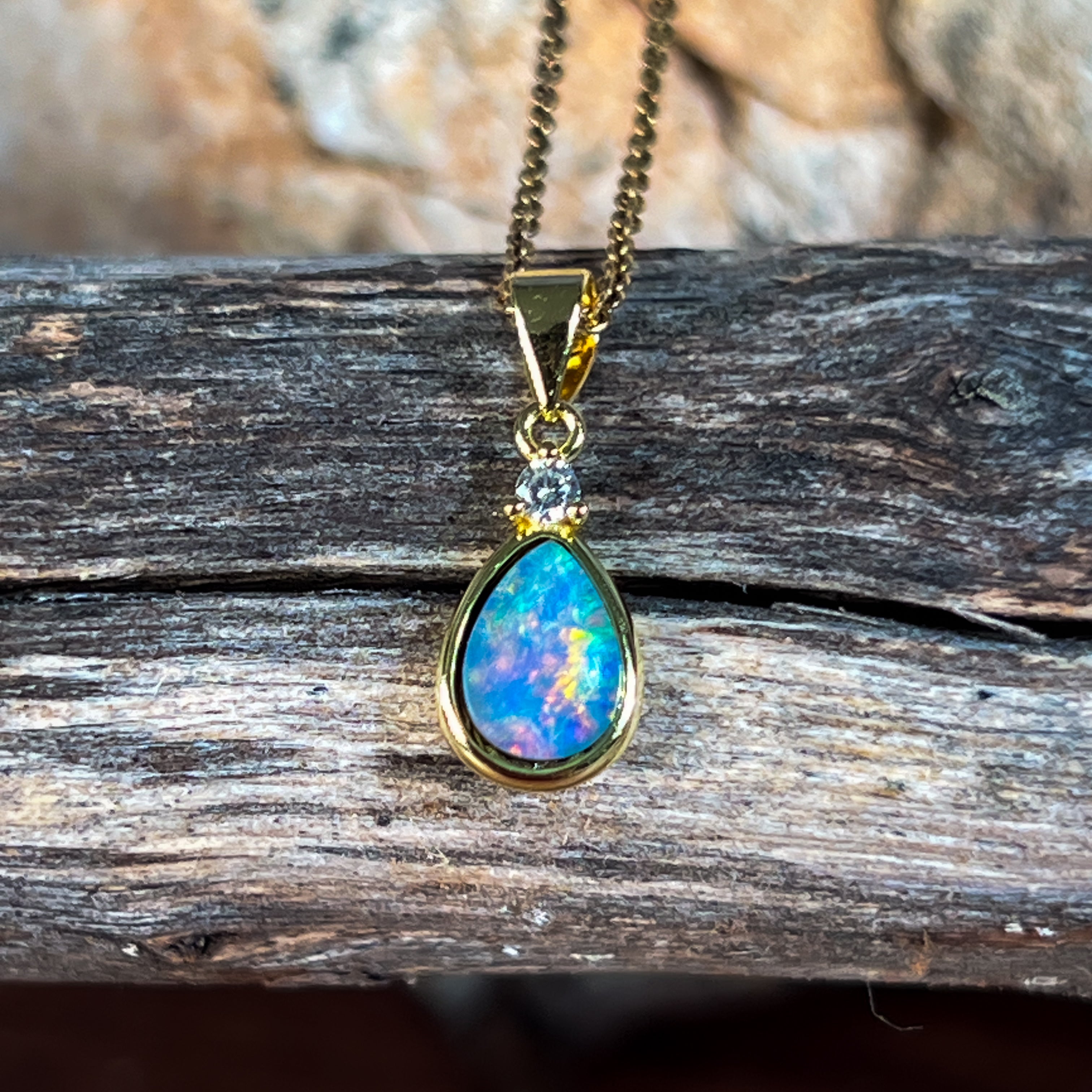 Yellow Gold plated silver pearshape bezel set opal triplet pendant
