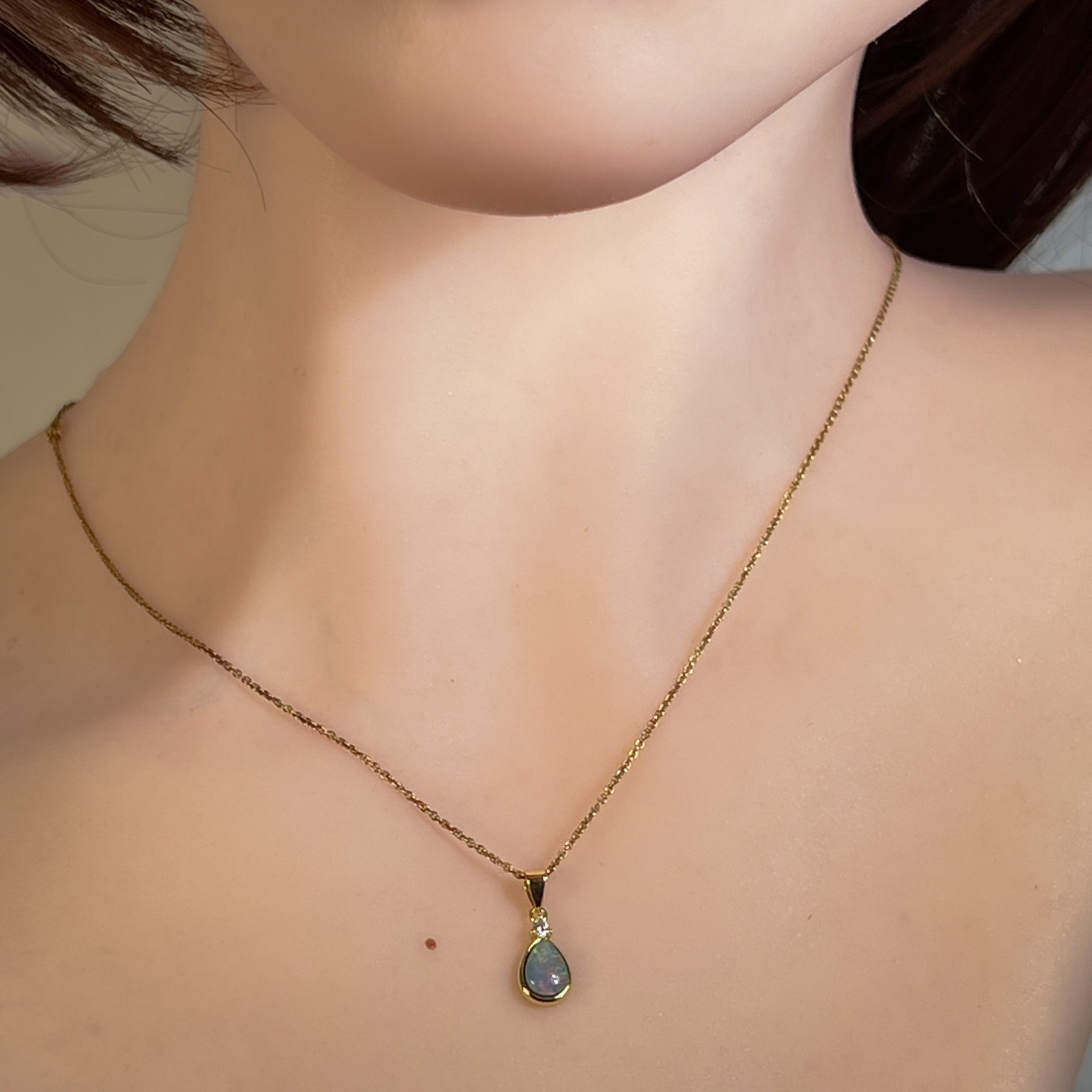 Elegantly showcase your style with our Yellow Gold plated silver pearshape bezel set opal triplet pendant. The dainty classic design adds a touch of sophistication to any outfit. Enhance your look with the beauty and charm of this pendant.