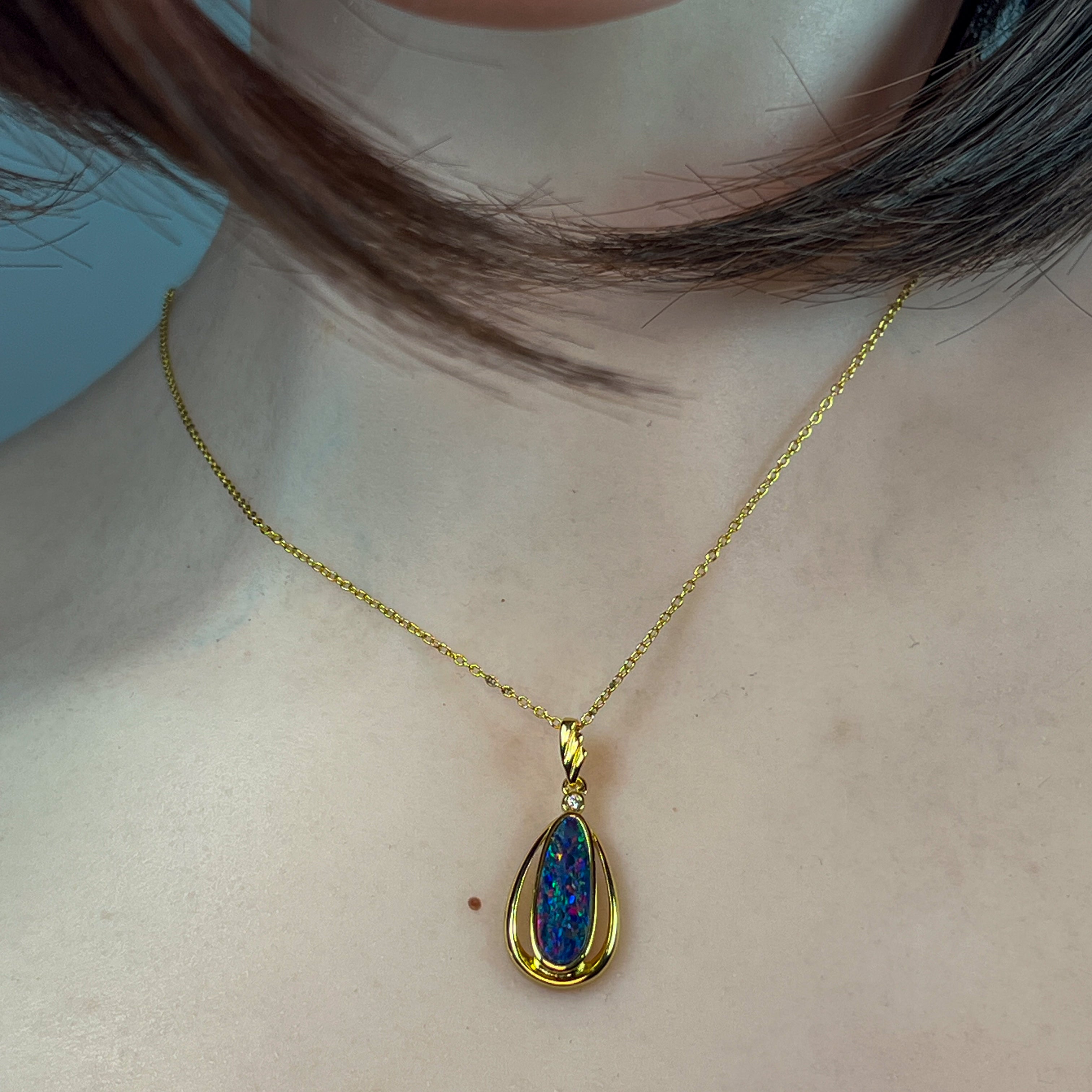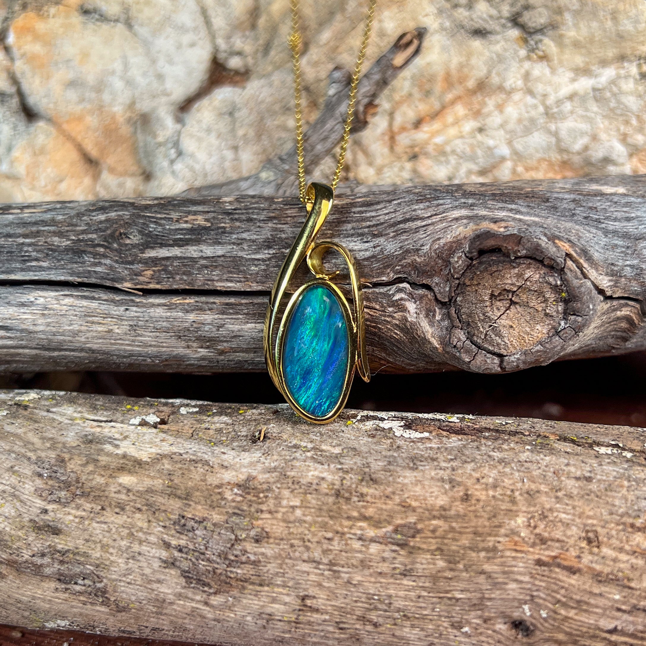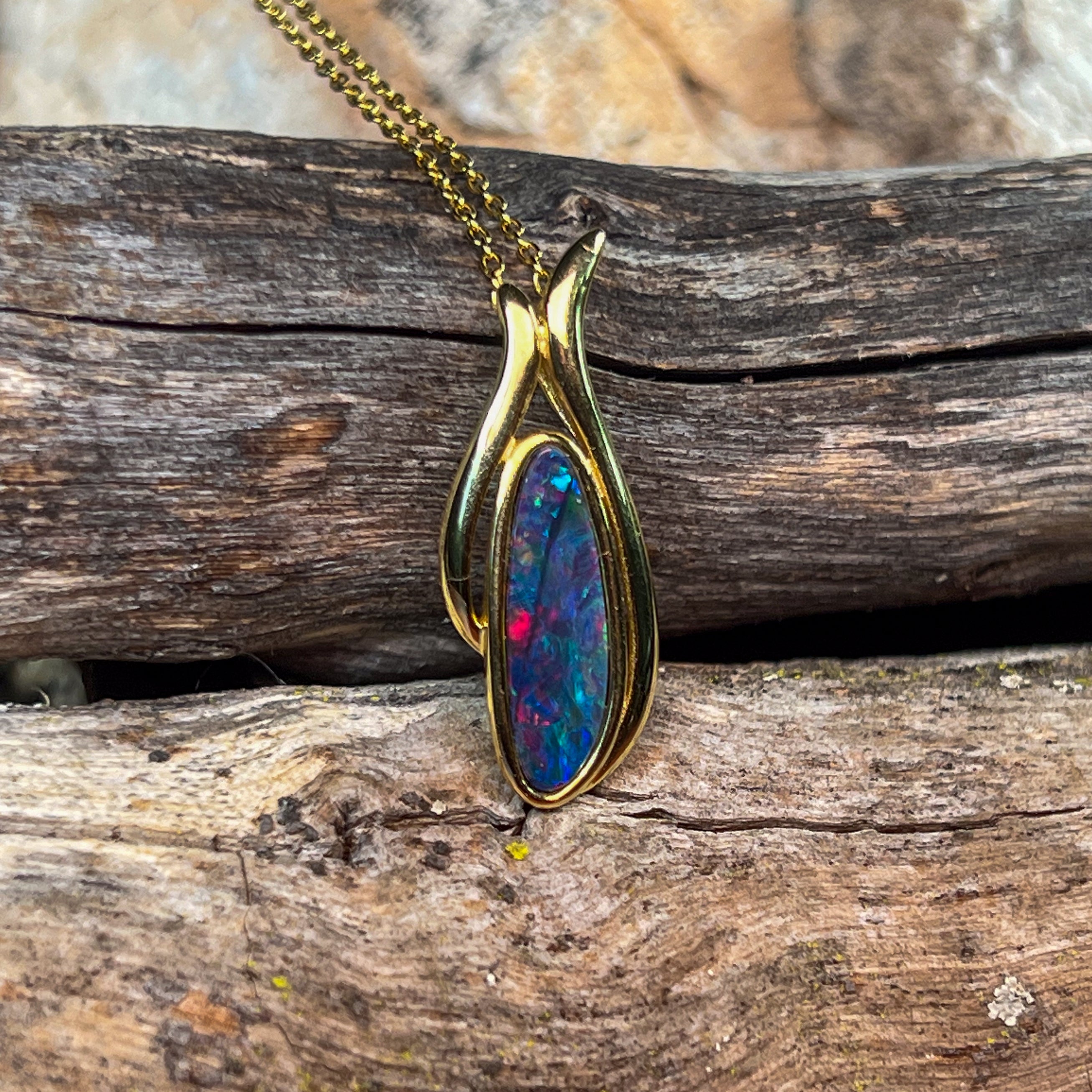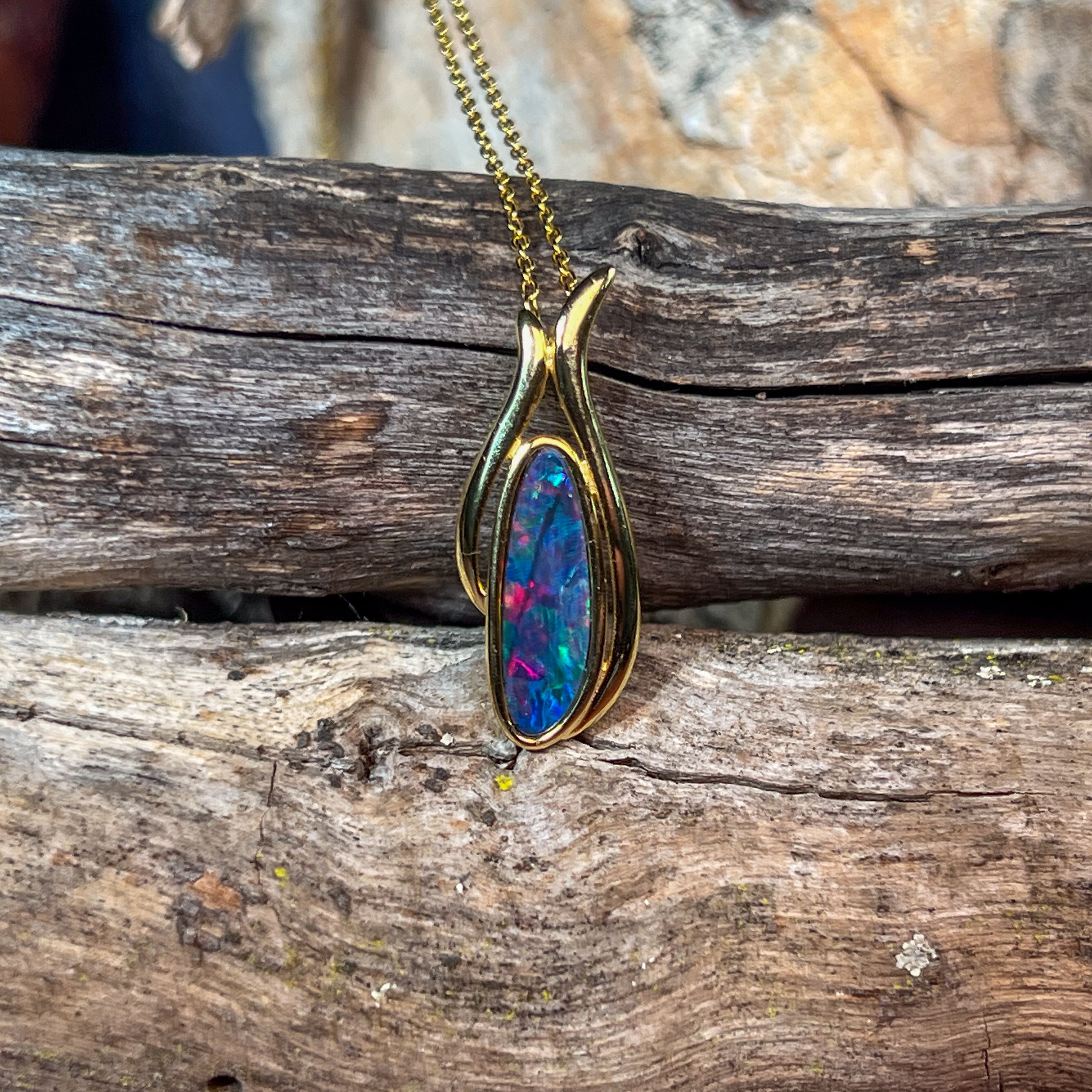Gold Plated Silver freeform long shaped Opal doublet pendant