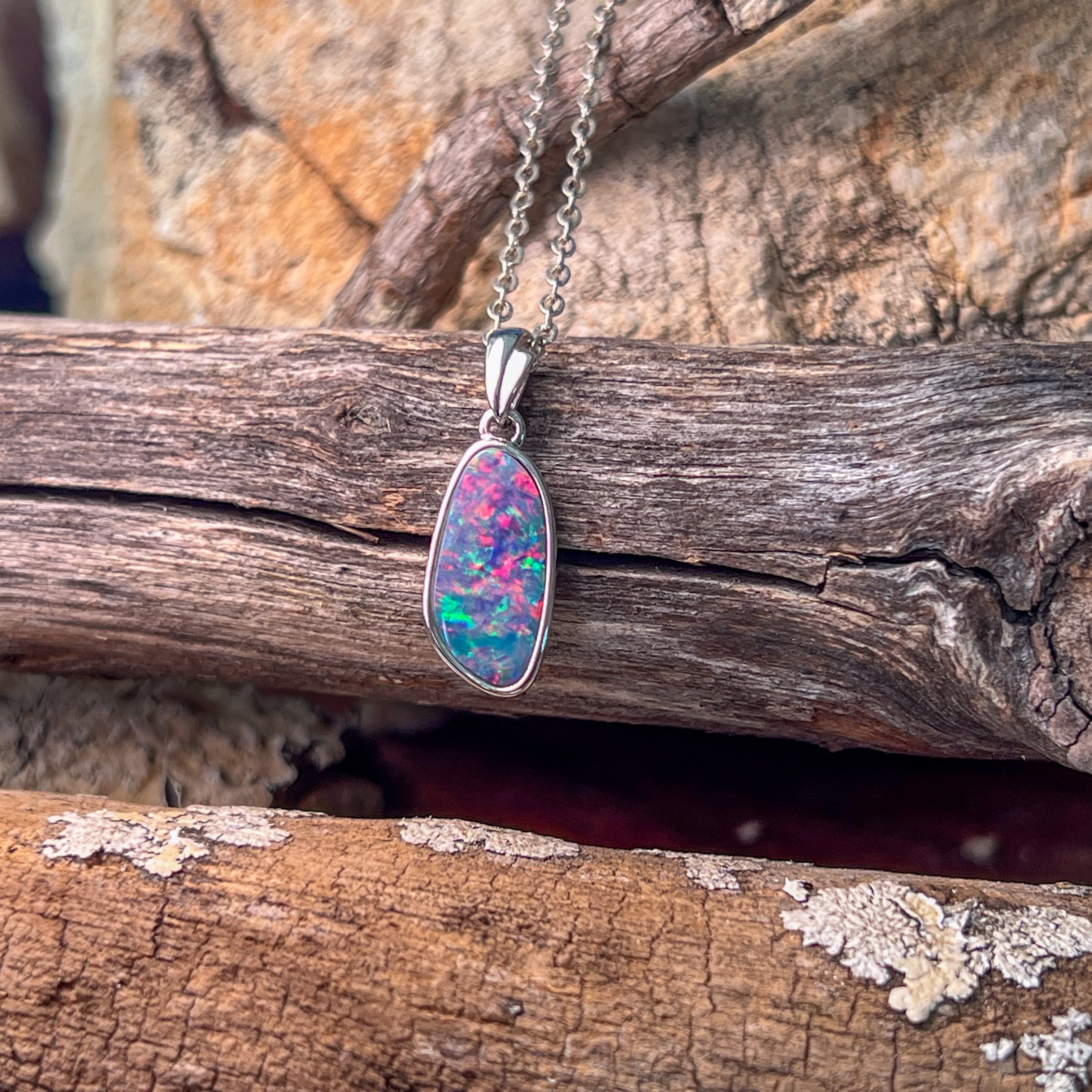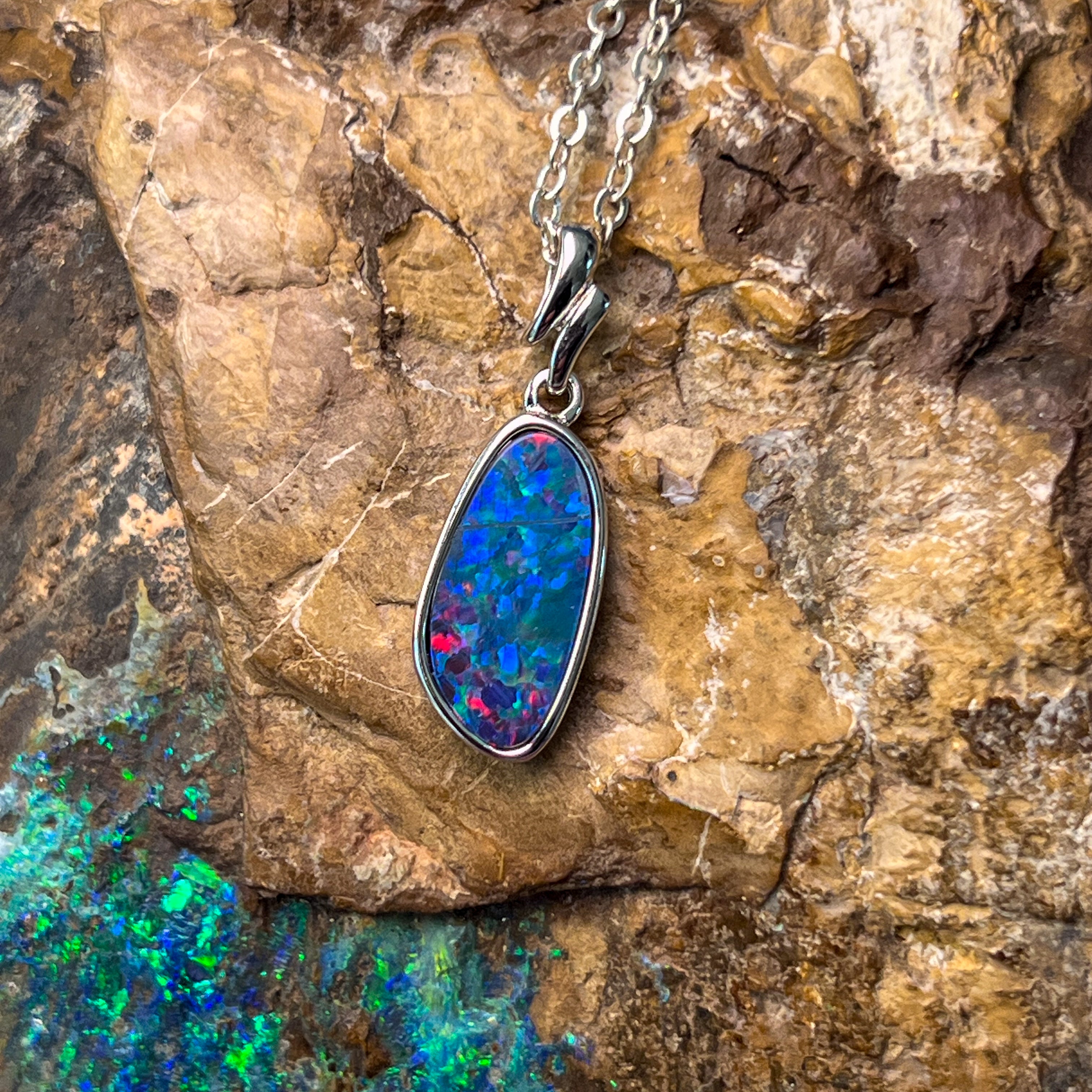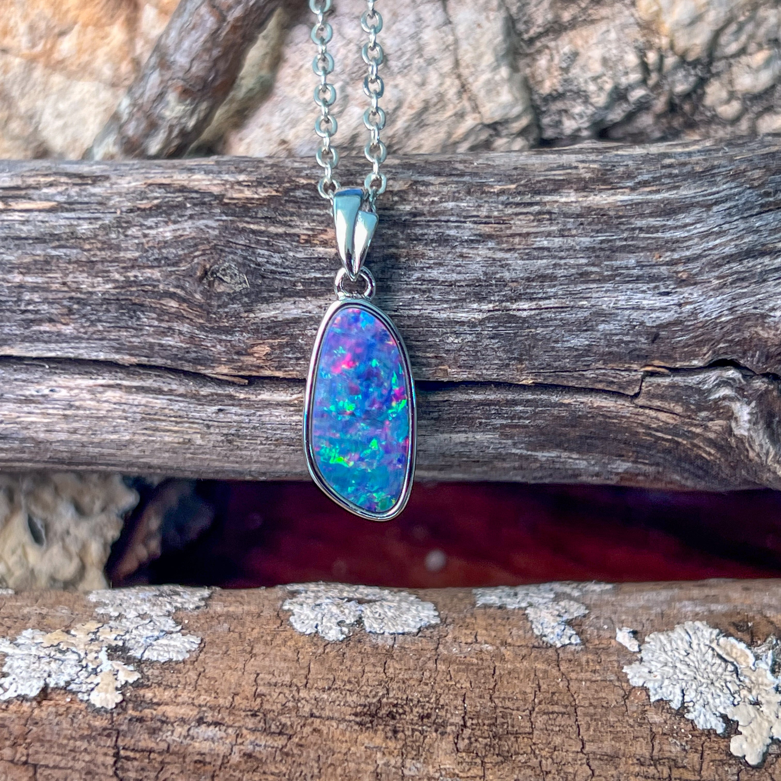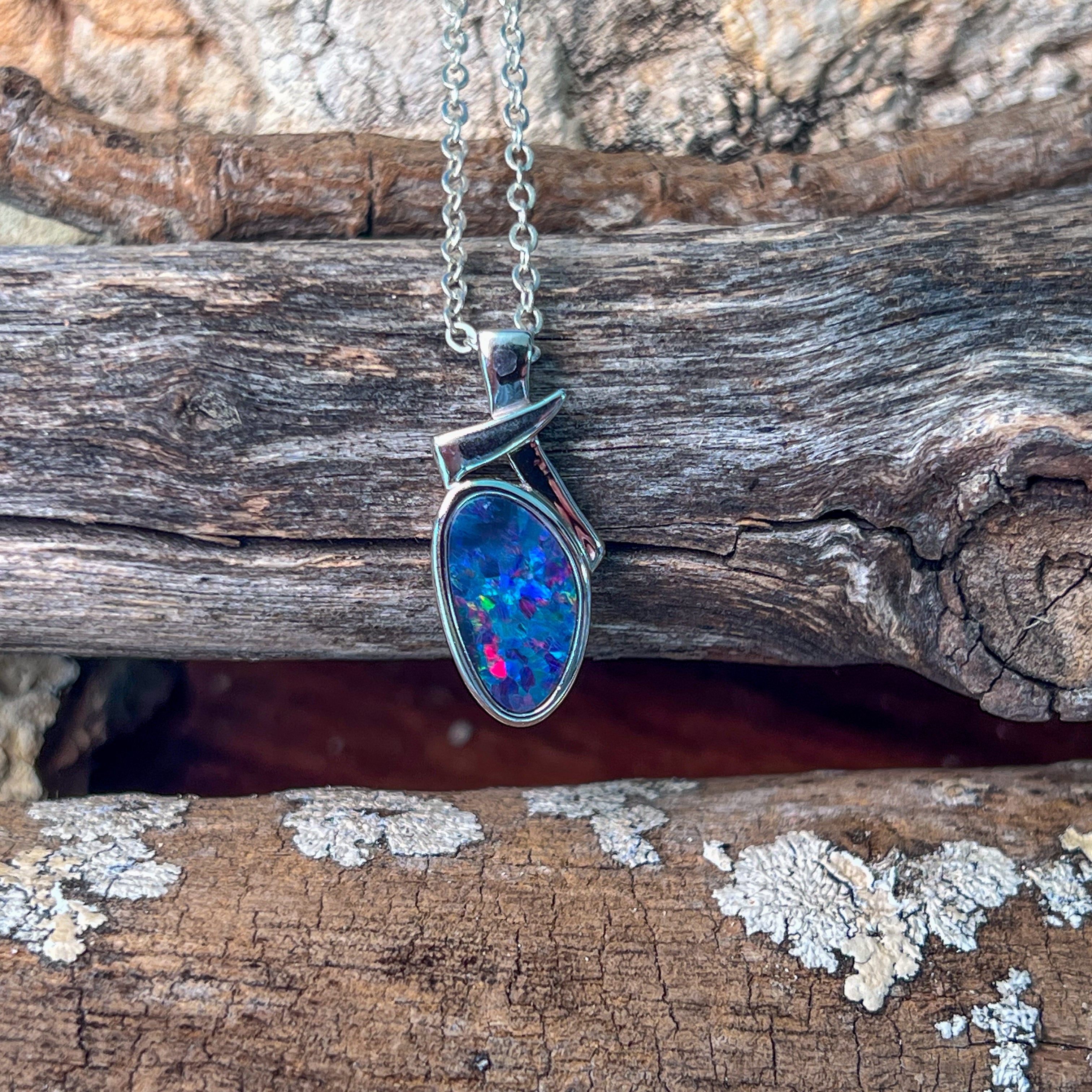 Sterling Silver long freeform Red Blue Fiery Opal doublet pendant