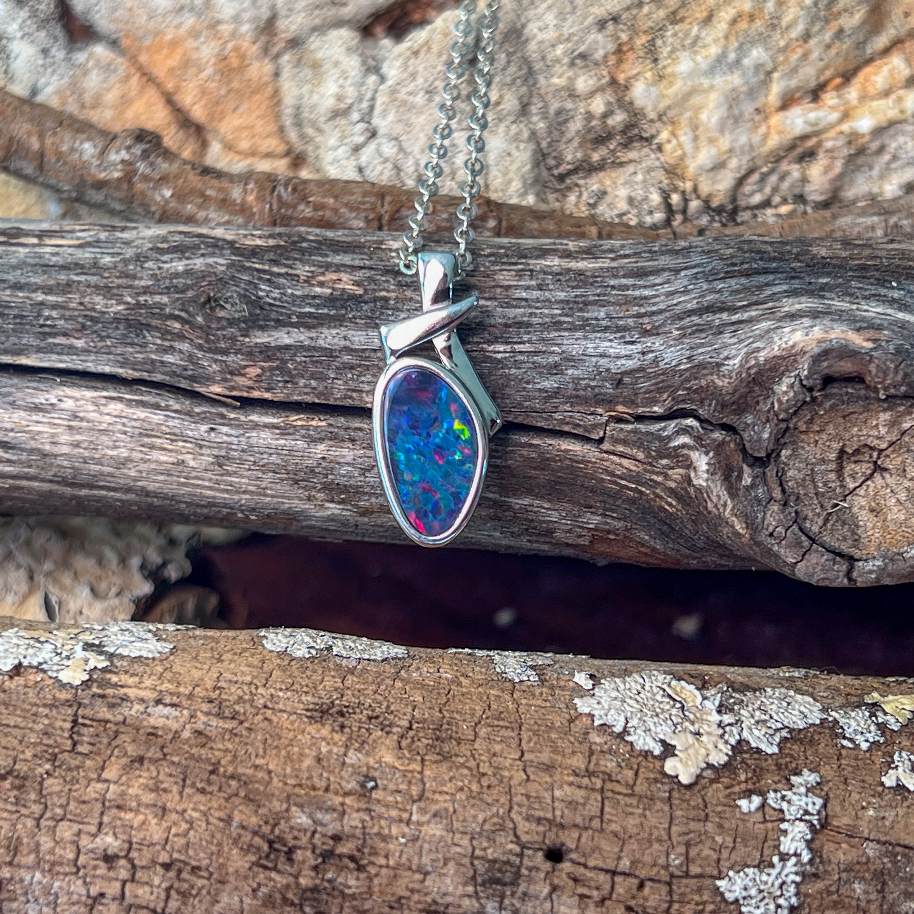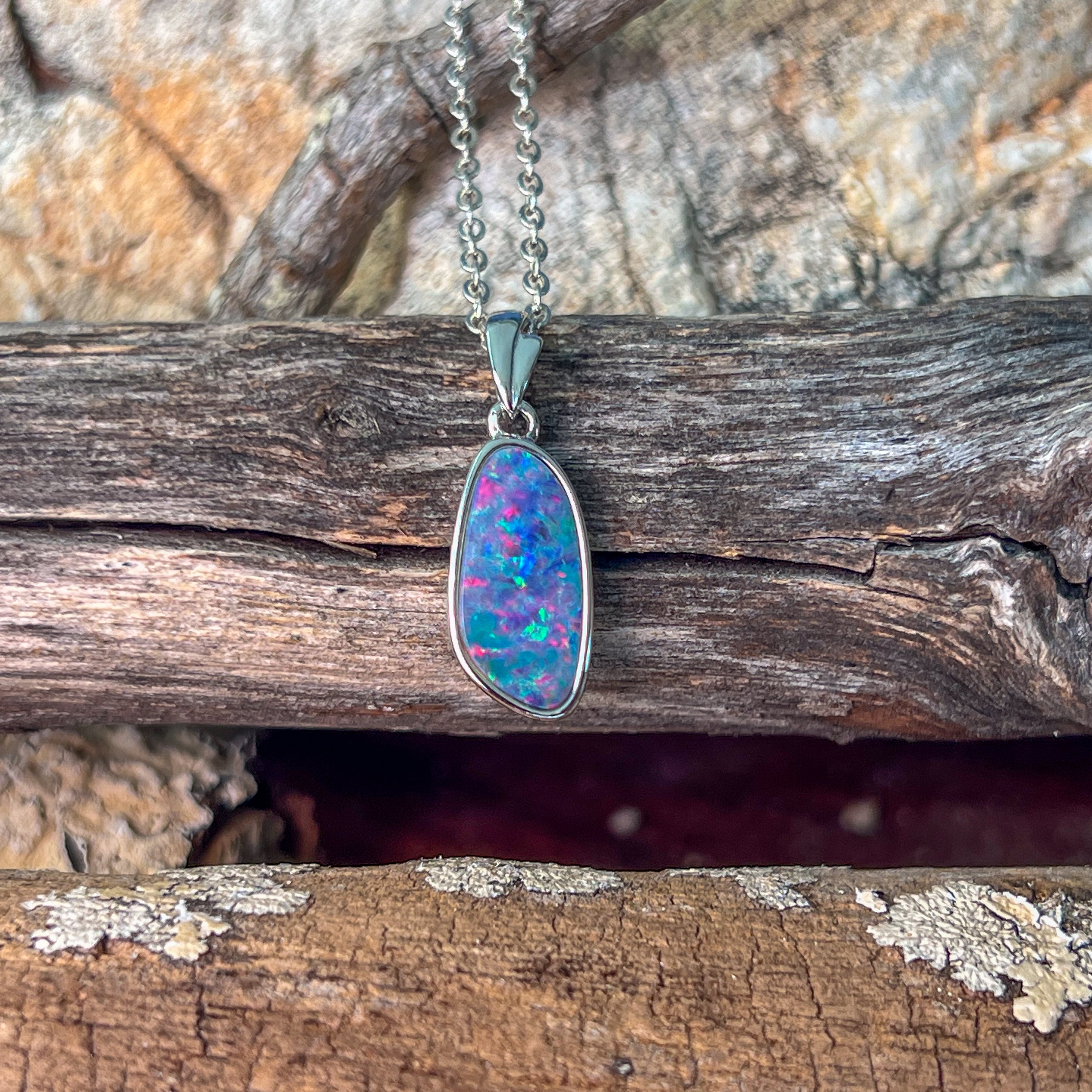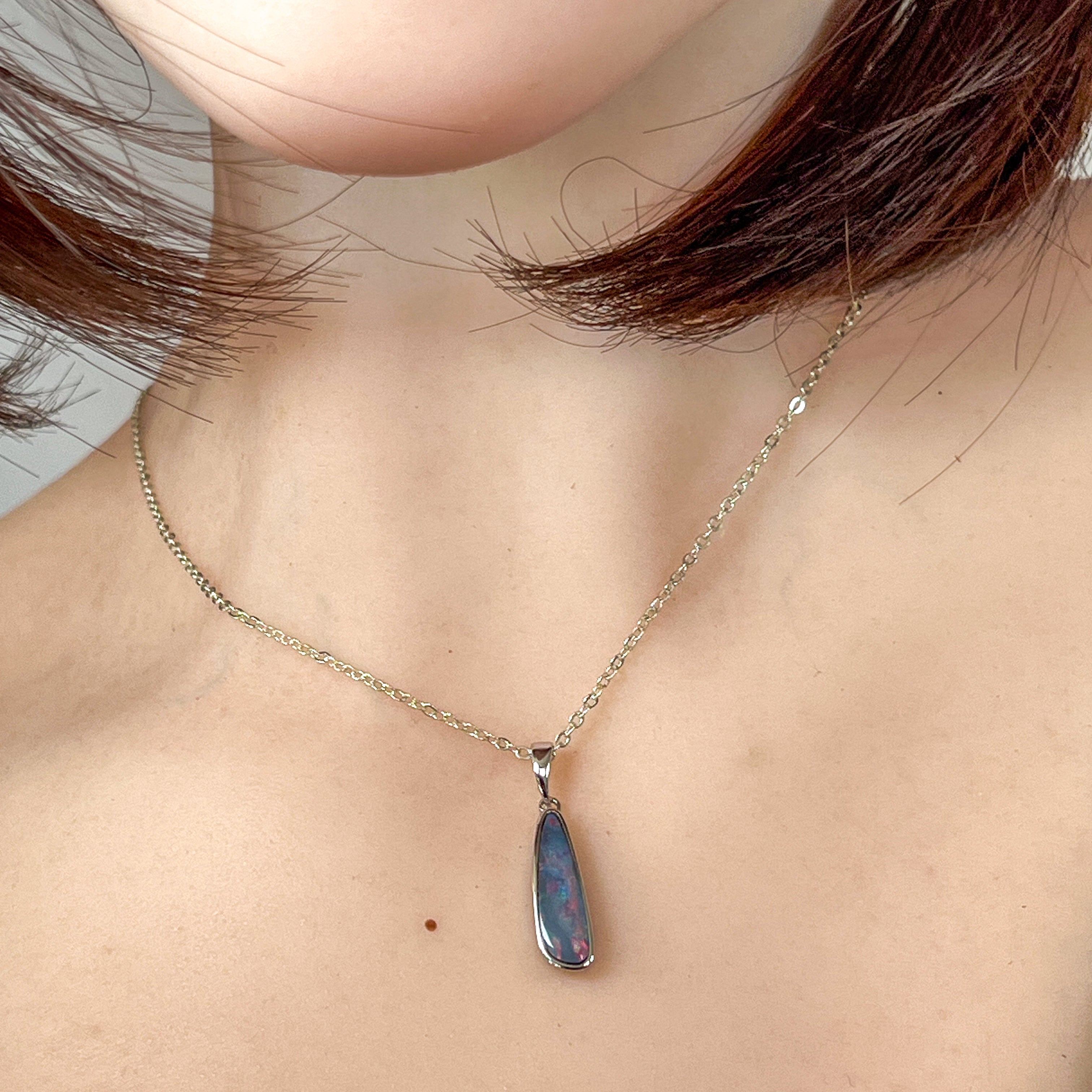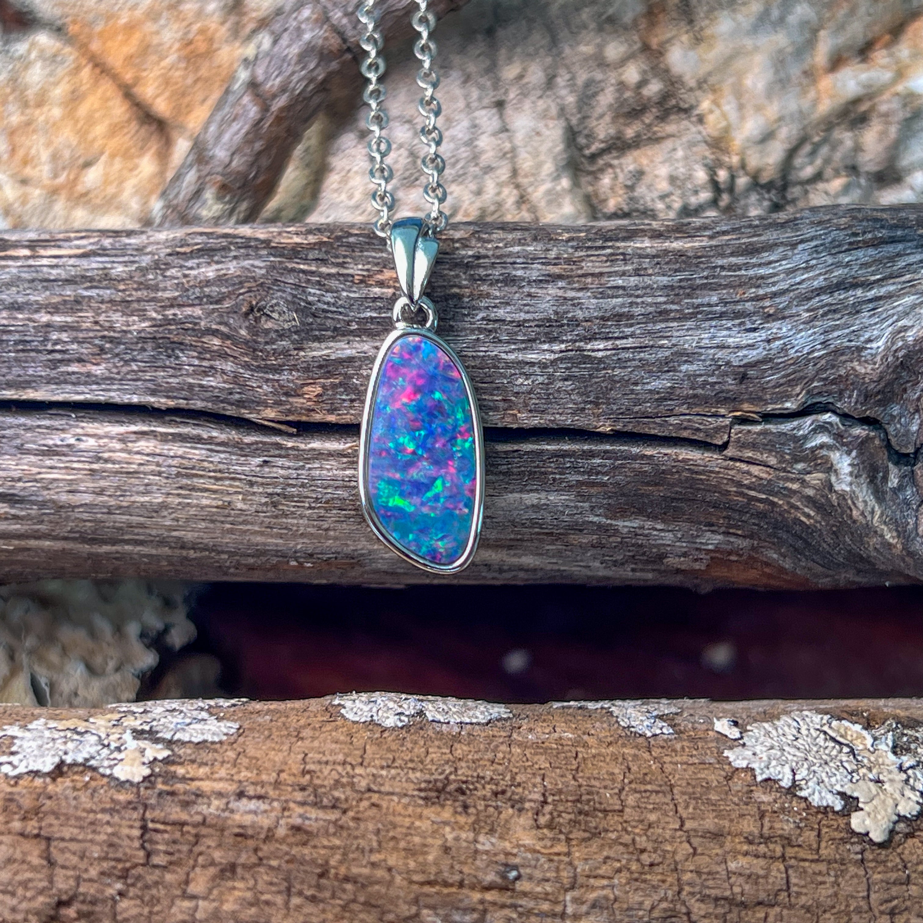 Sterling Silver long freeform Red Blue Fiery Opal doublet pendant