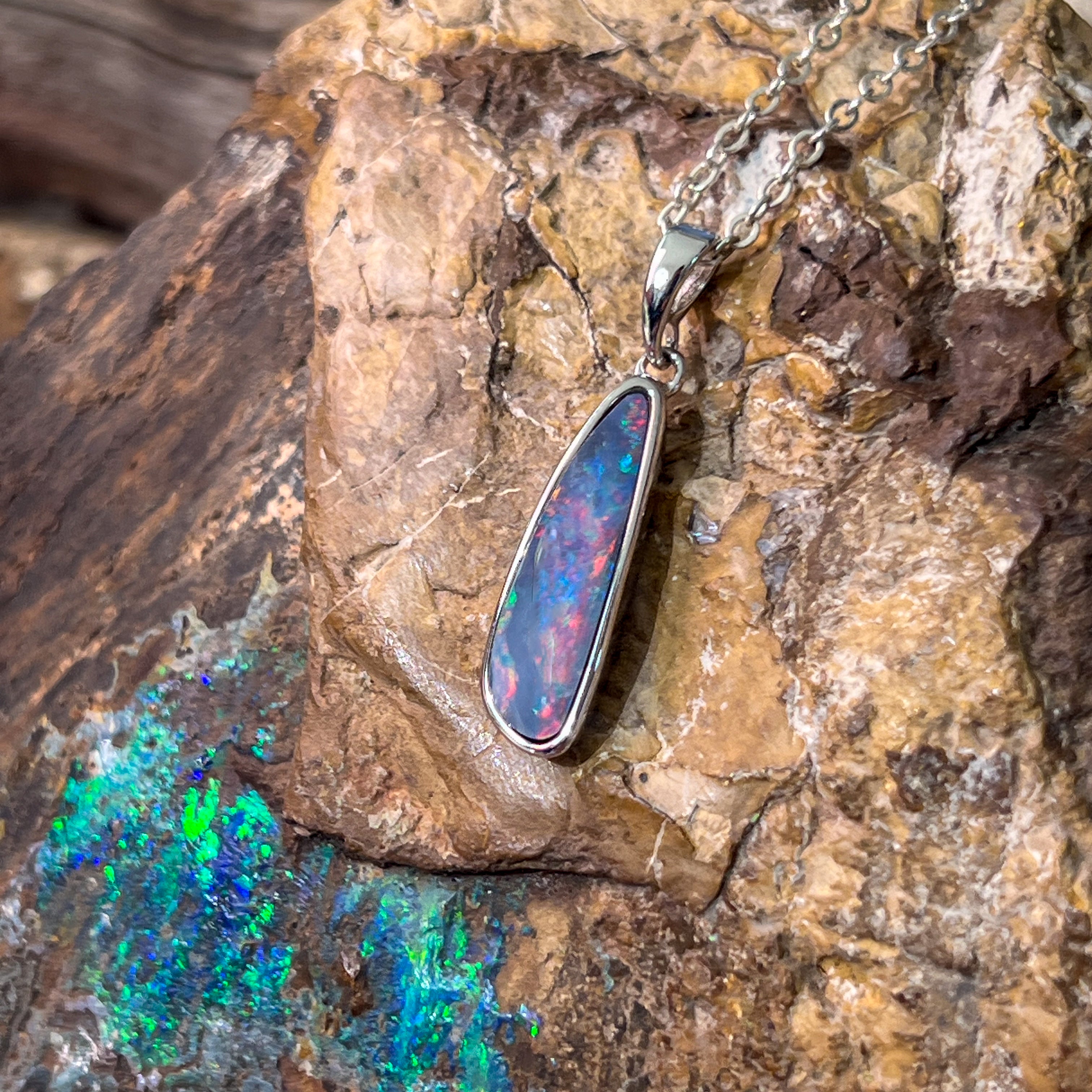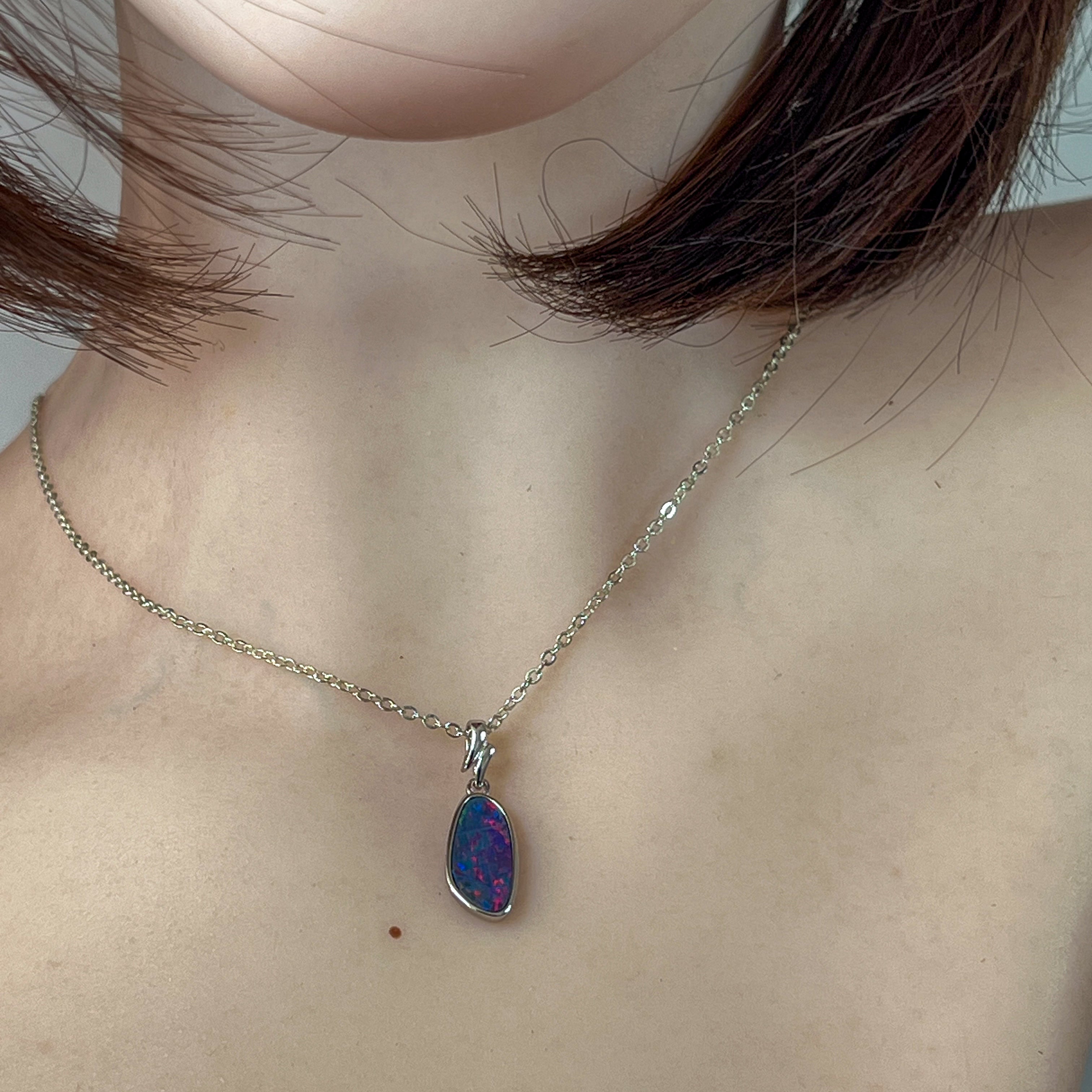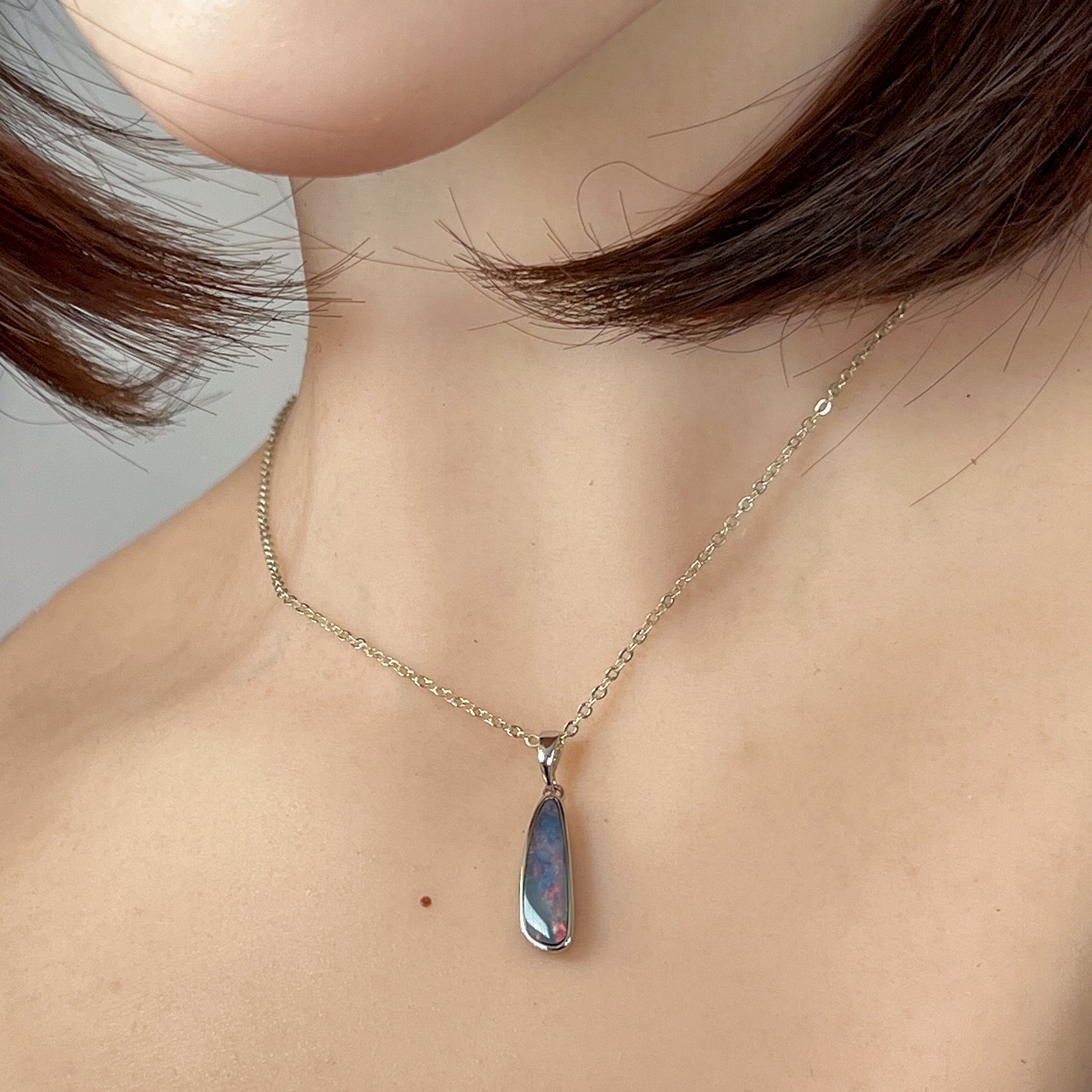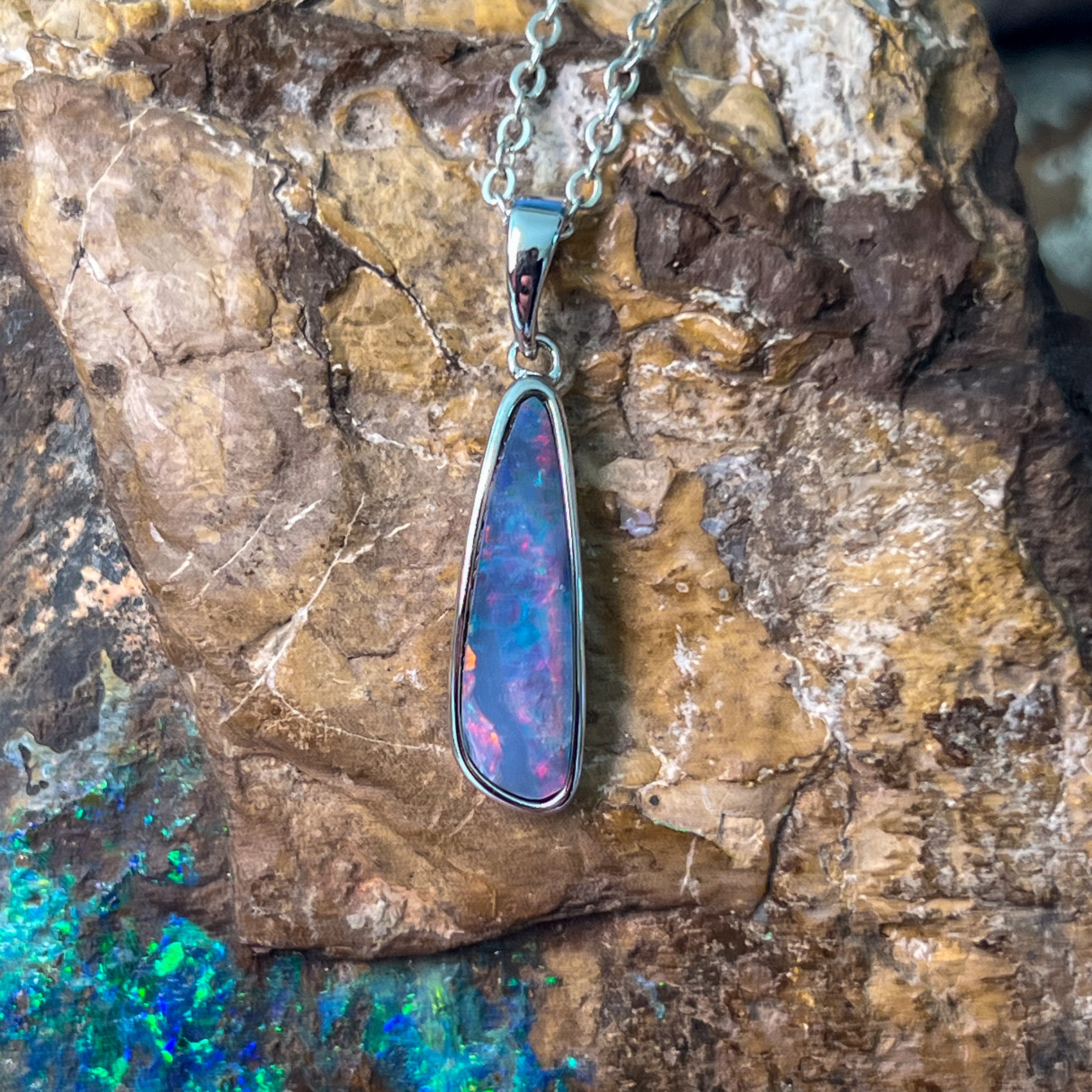 Sterling Silver long freeform Red Blue Fiery Opal doublet pendant