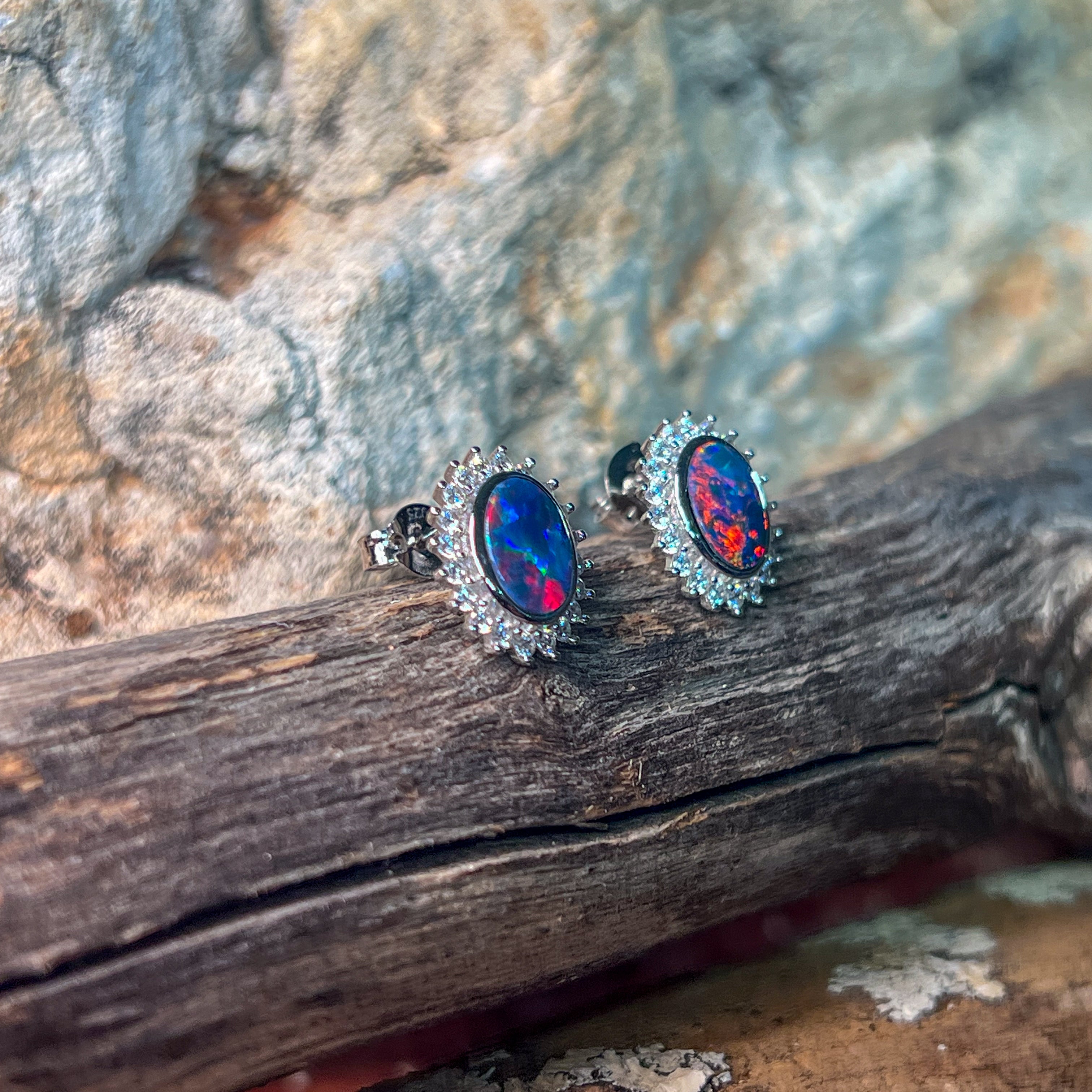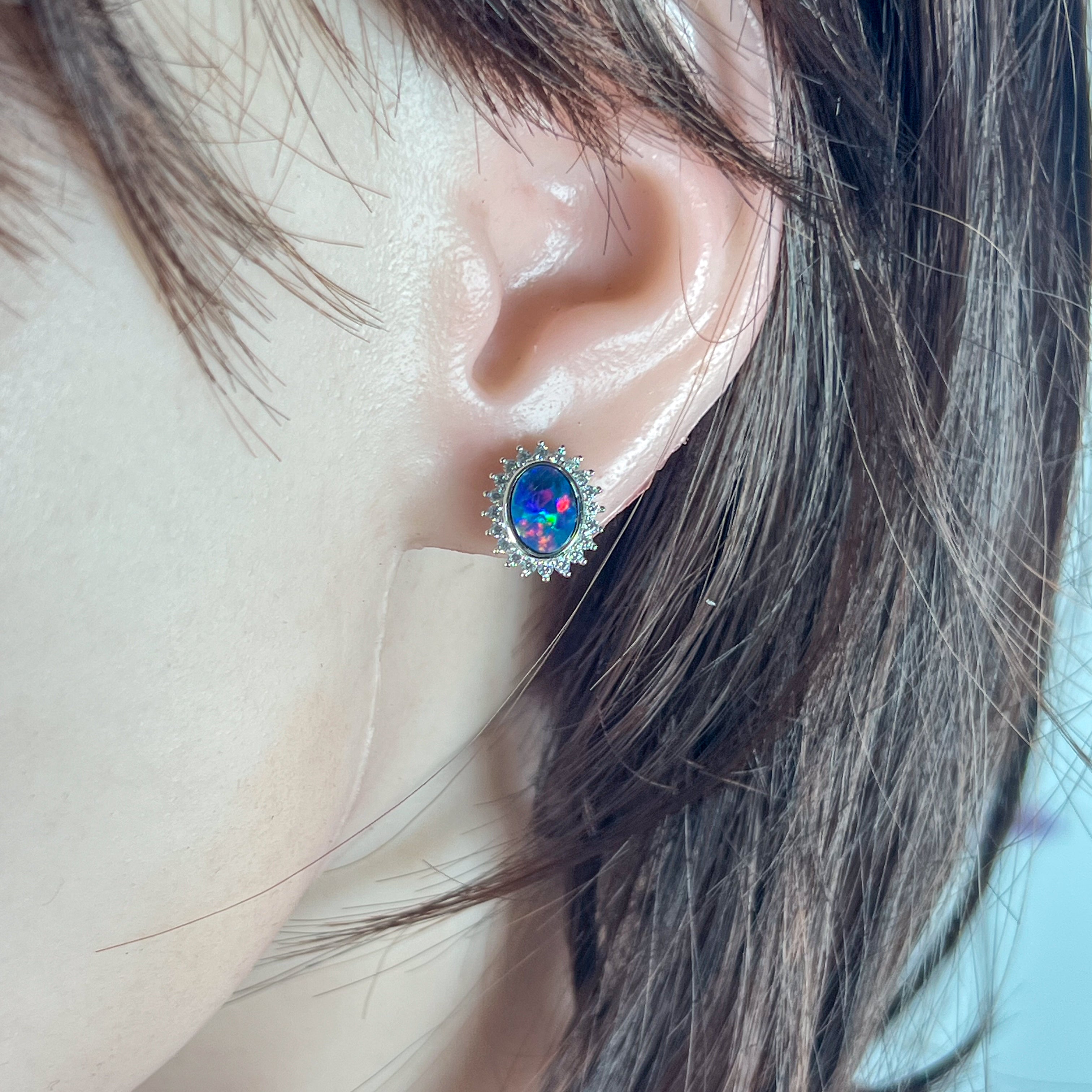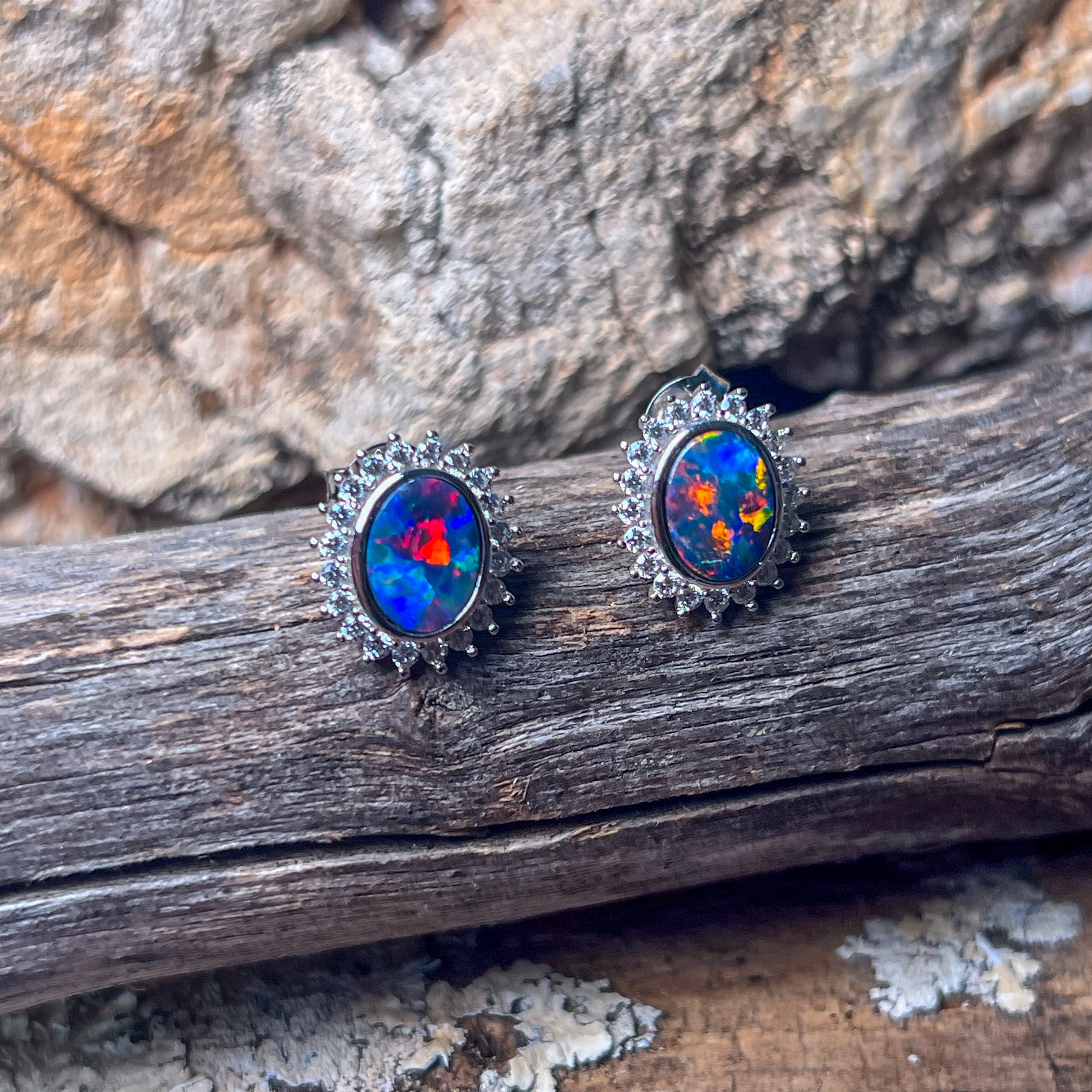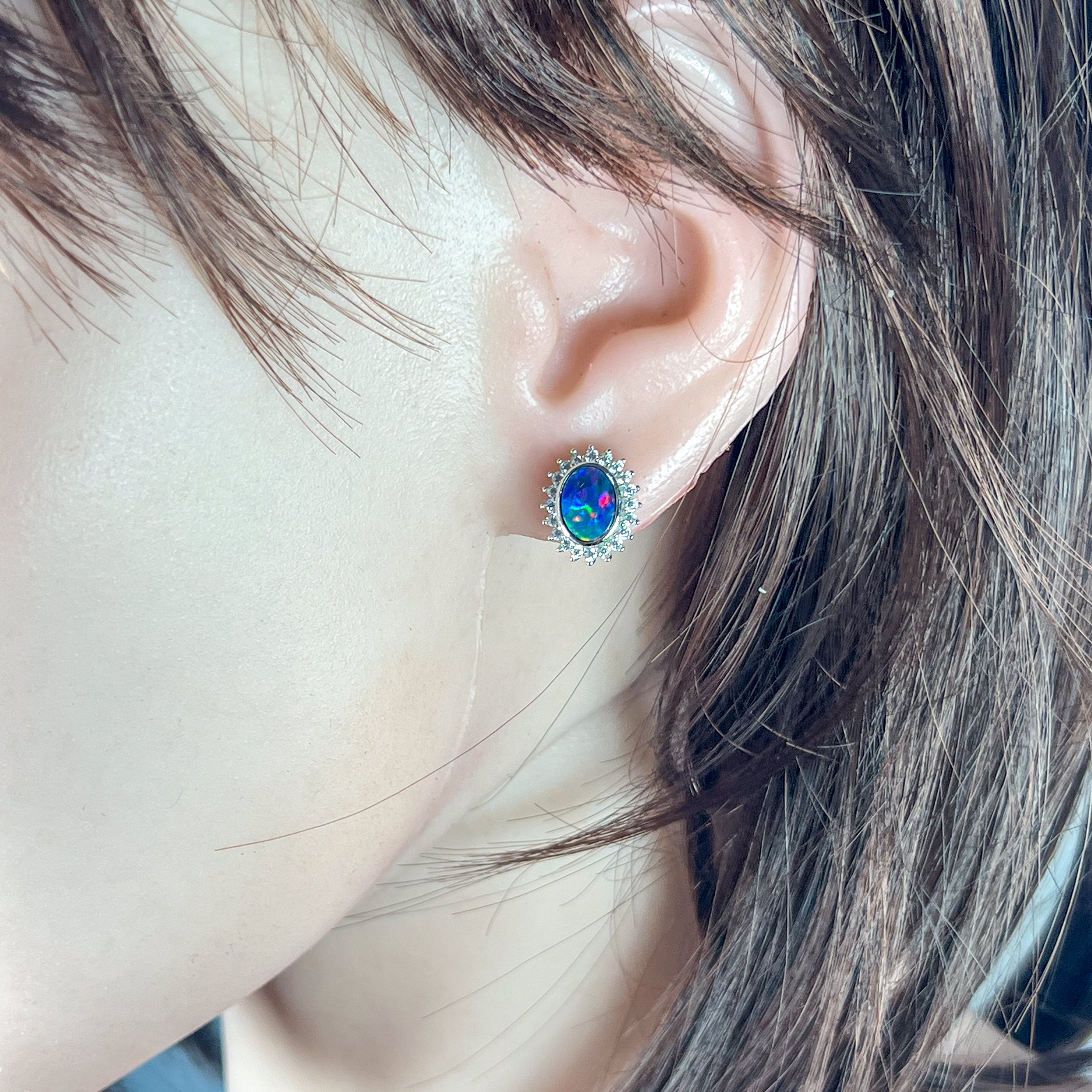 Sterling Silver Opal doublet oval cluster earrings