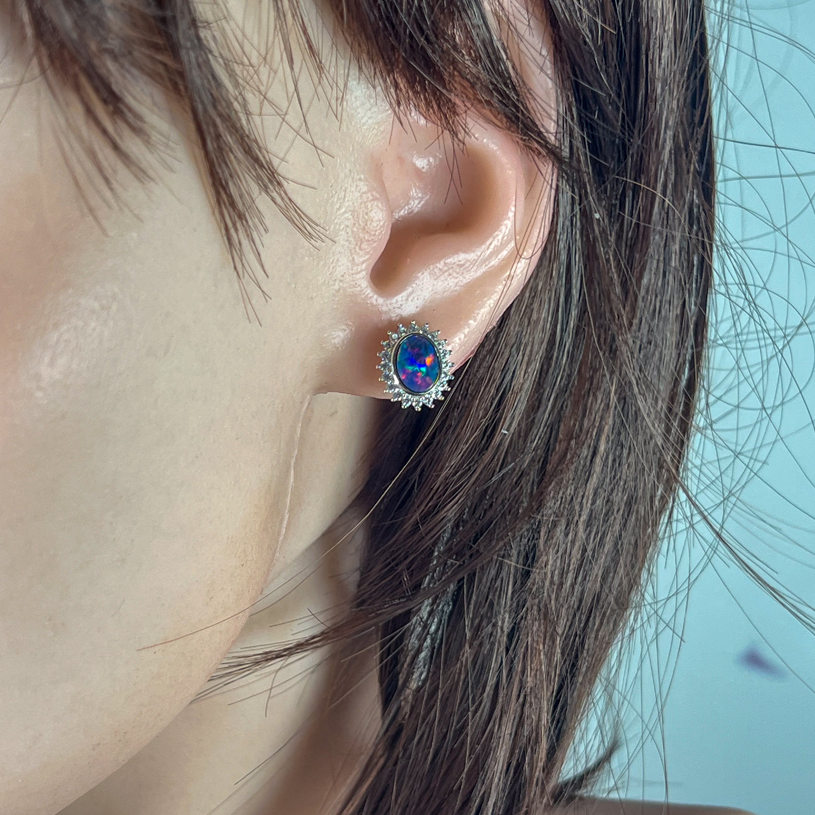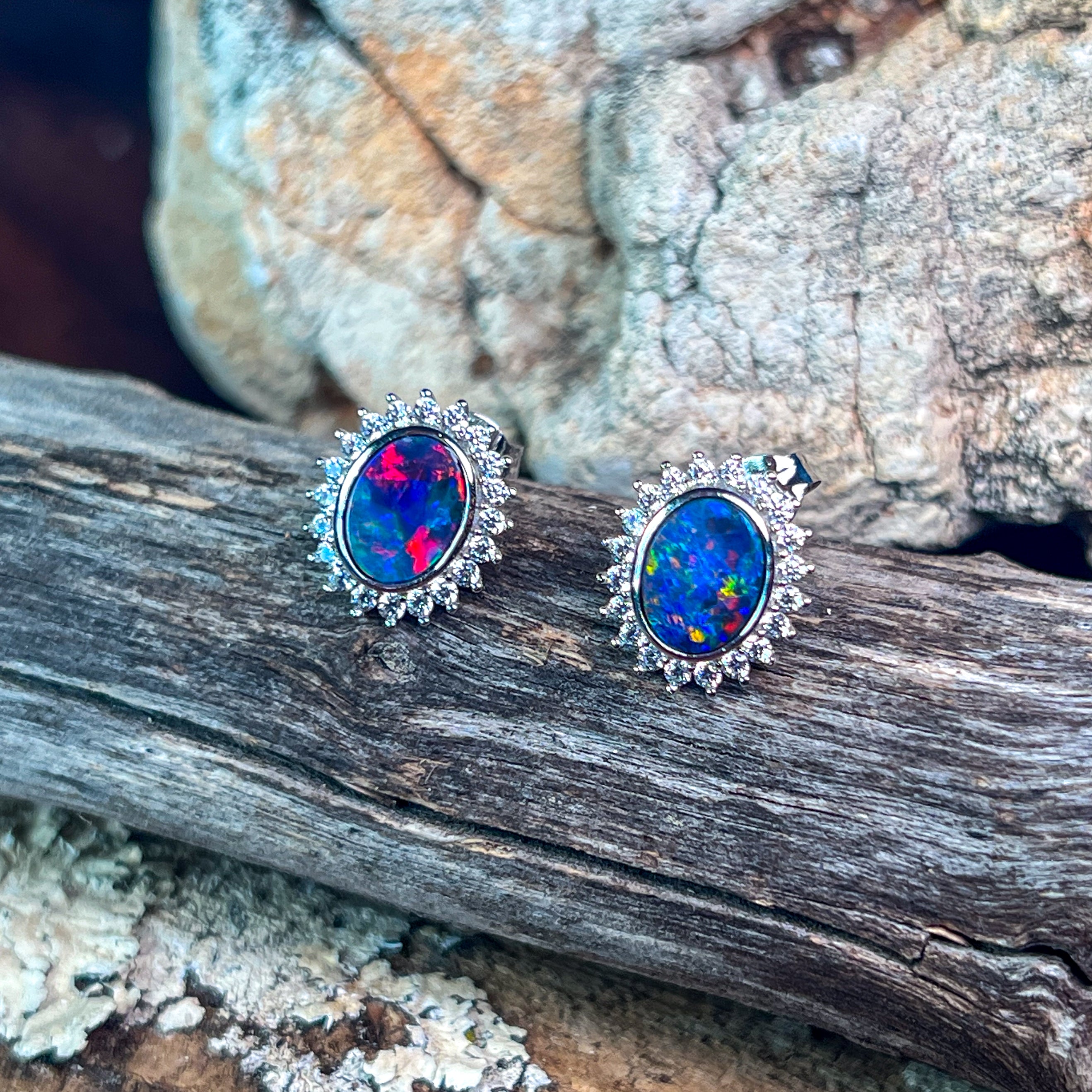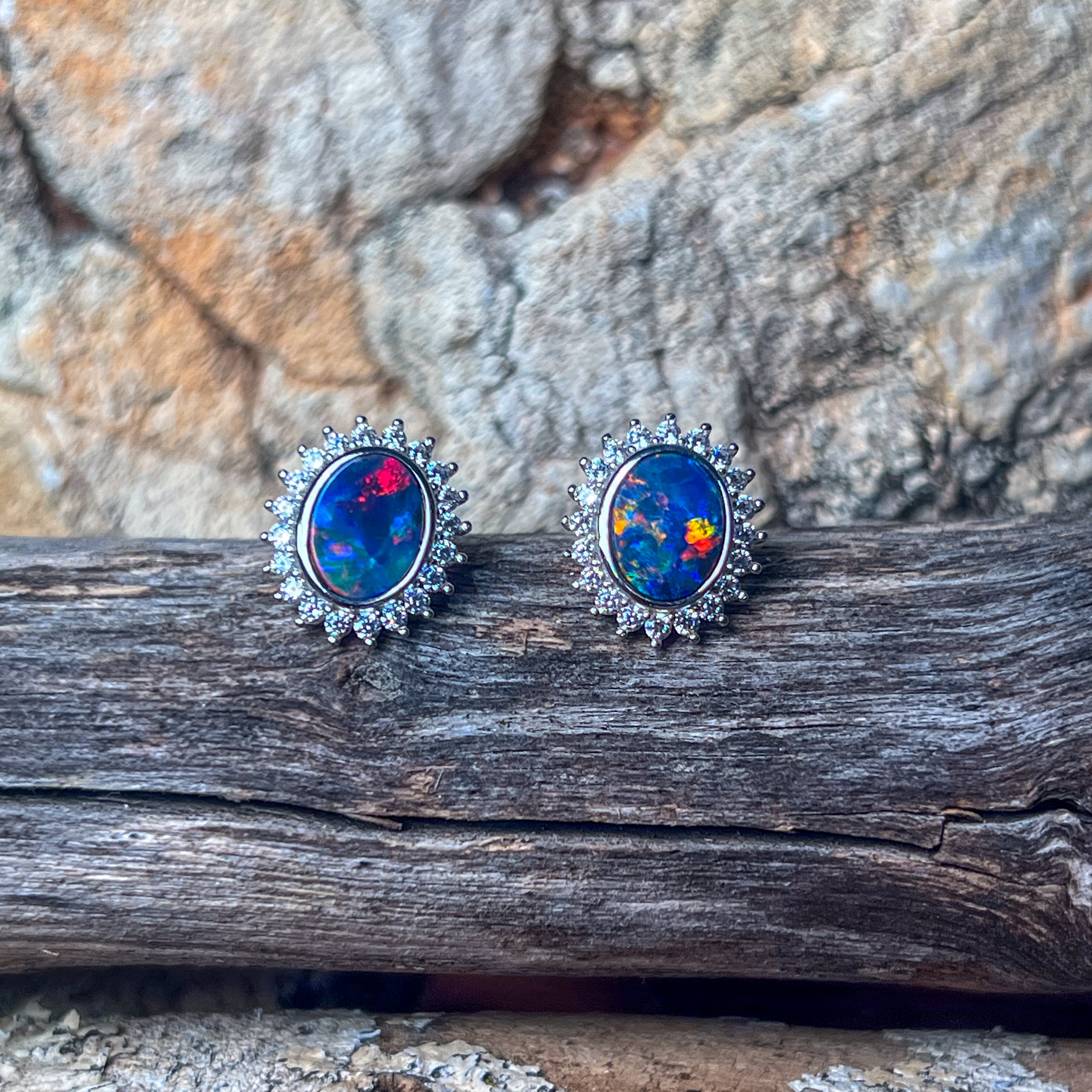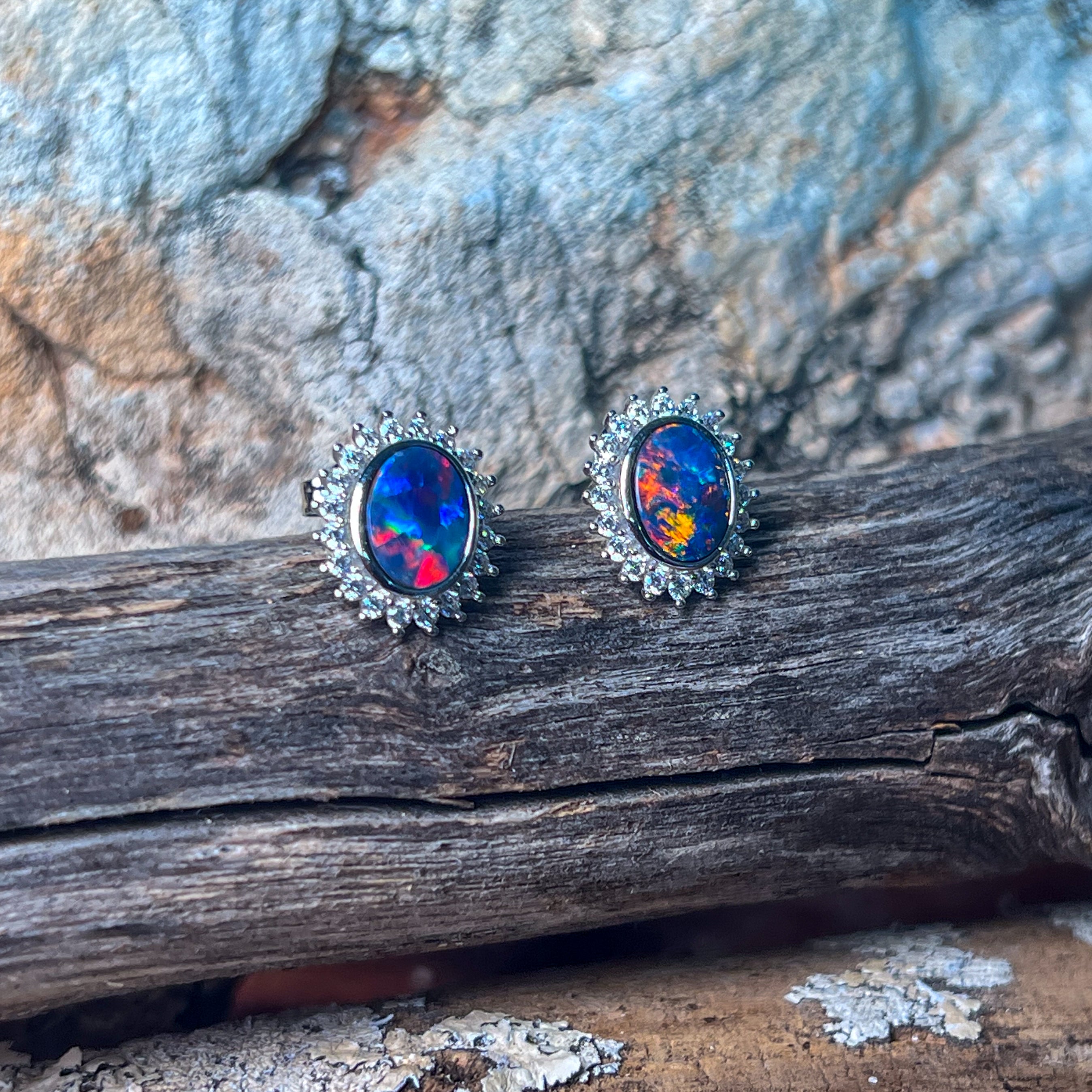 Sterling Silver Opal doublet oval cluster earrings