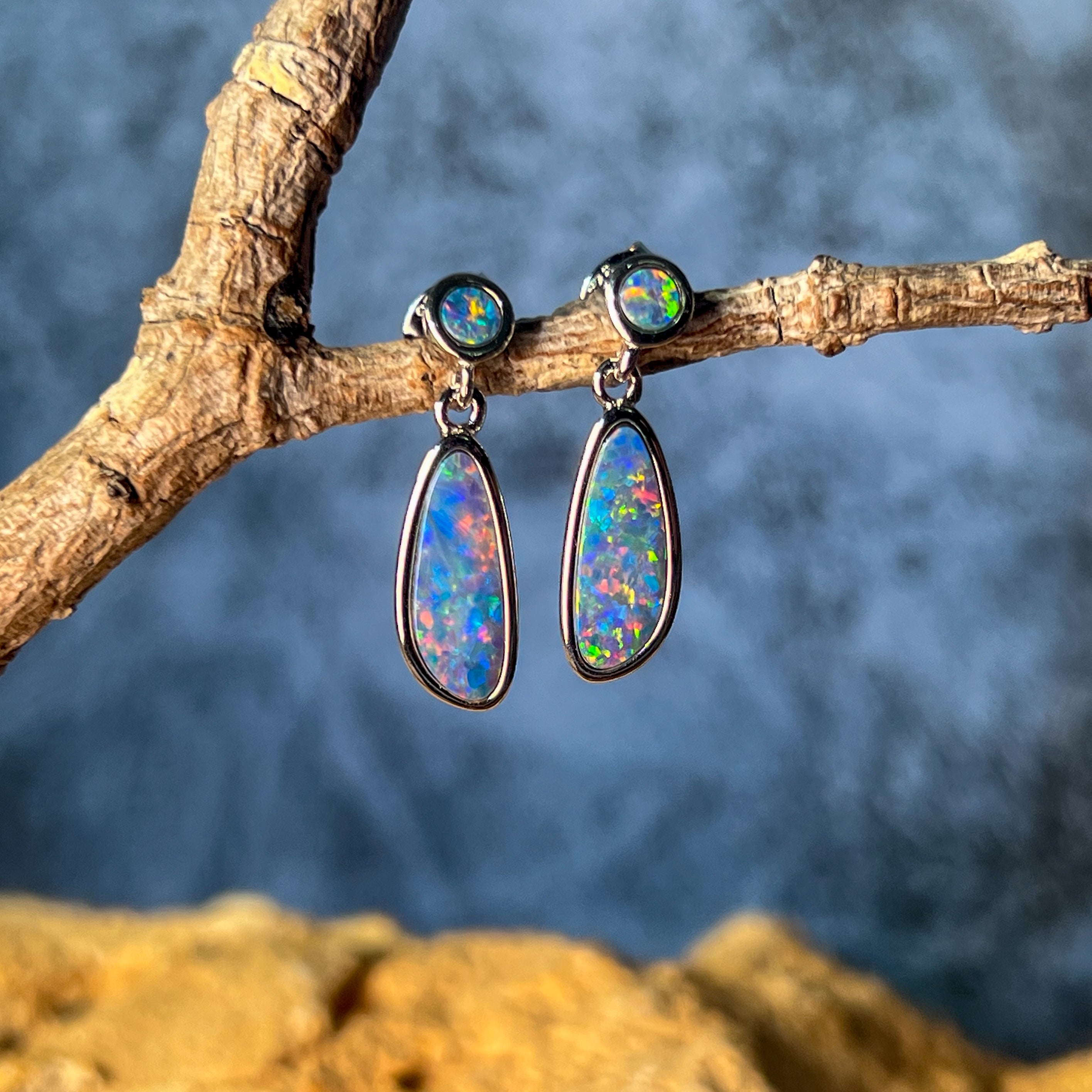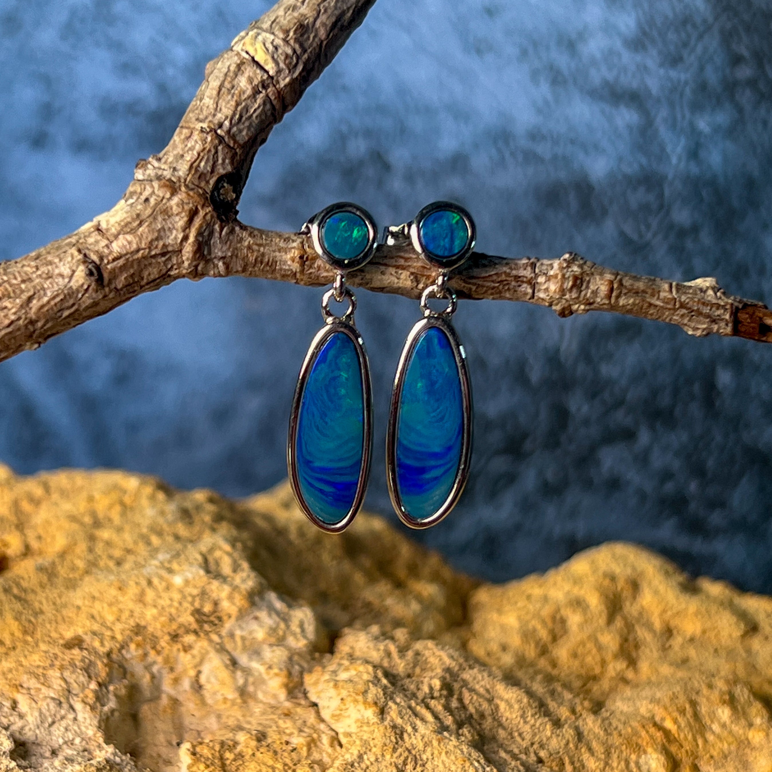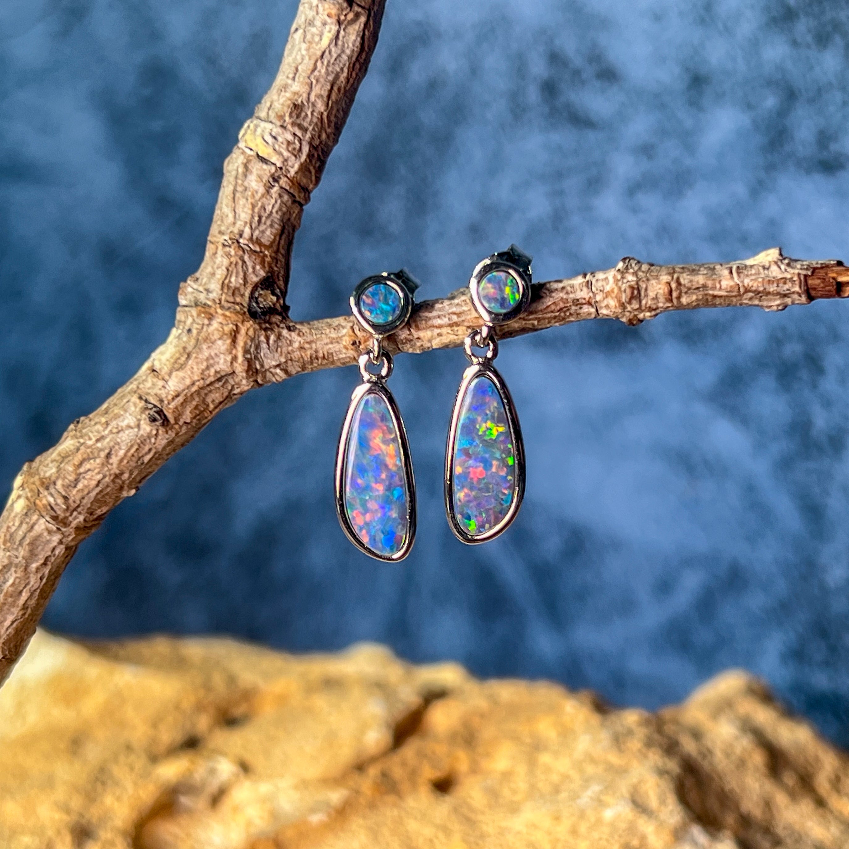 Sterling Silver freeform drop earrings Blue Red colour Opal doublets dangling
